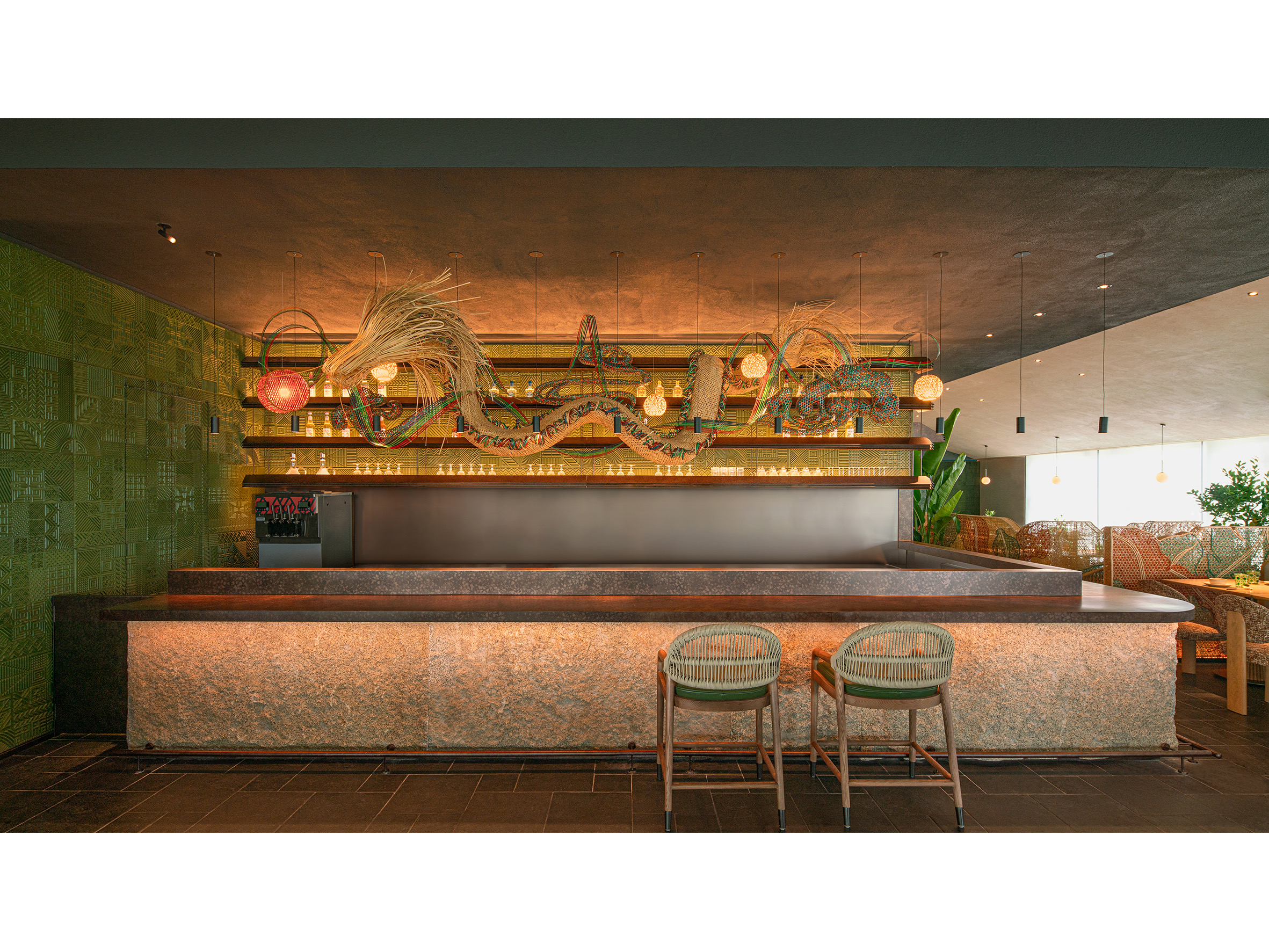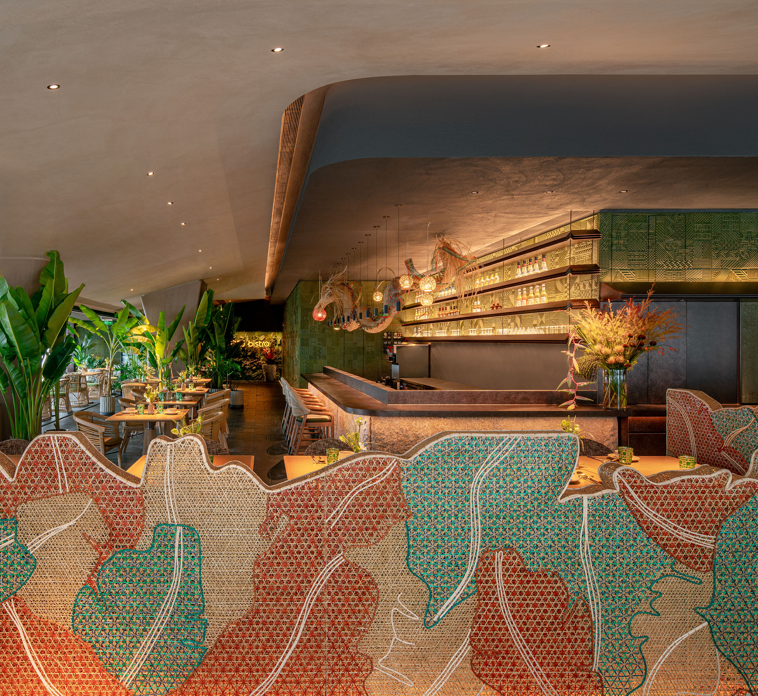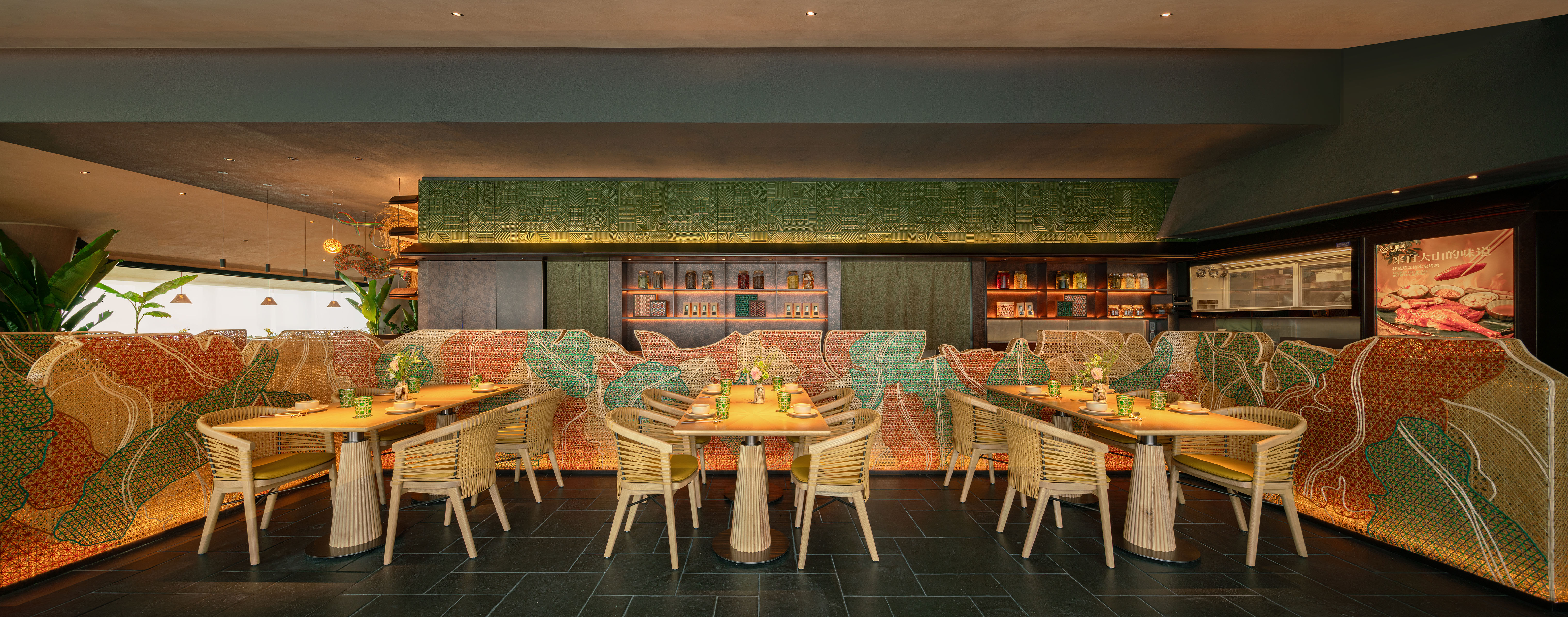 空间意境:入口LOGO墙上的艺术毯采用艺术家胡约华手工编织羊毛毡及多种材料仿生大自然植物及食材类呈现秀美广西。吧台上的 “炮龙”装置采用传统手工非遗竹编工艺,形成“游龙戏珠”的画面,与墙面图腾呼应:游龙在丰收画卷内自由翱翔。竹艺编织出的叠叠芭蕉林,不仅灵动生机,更承担着空间划分与情境营造的双重角色,通过材料、结构和空间的转译,营造一个兼具文化识别性的场所。