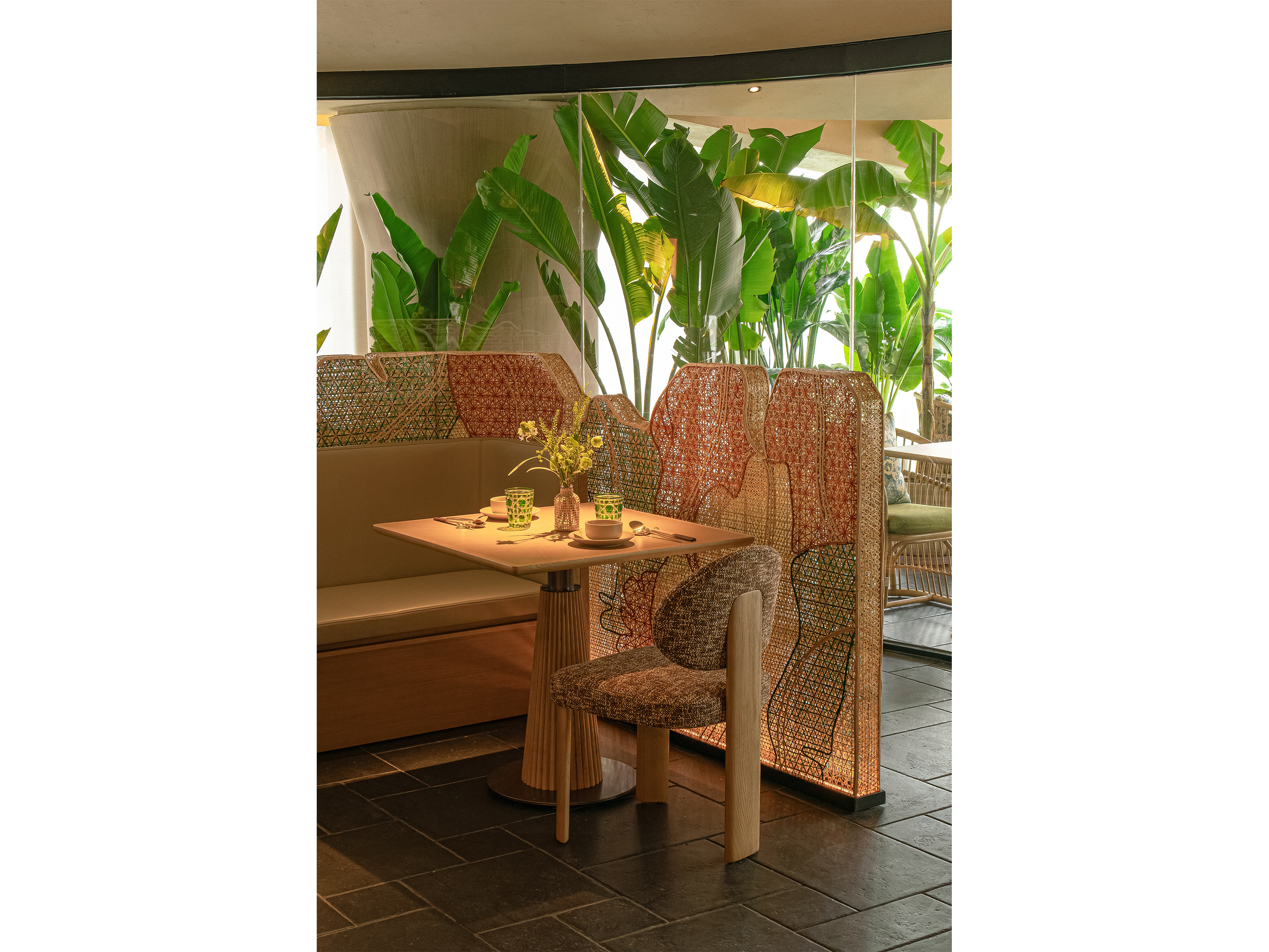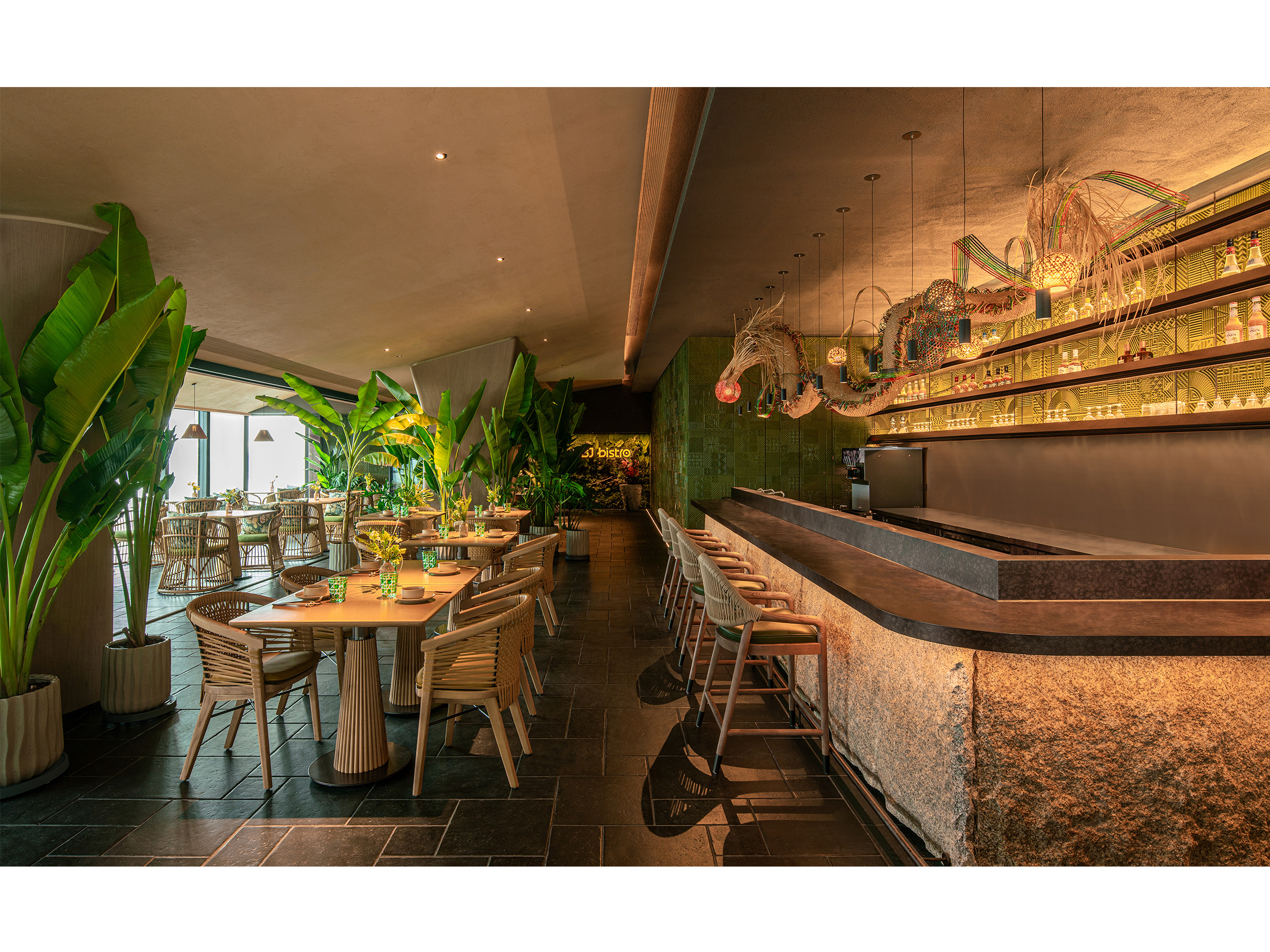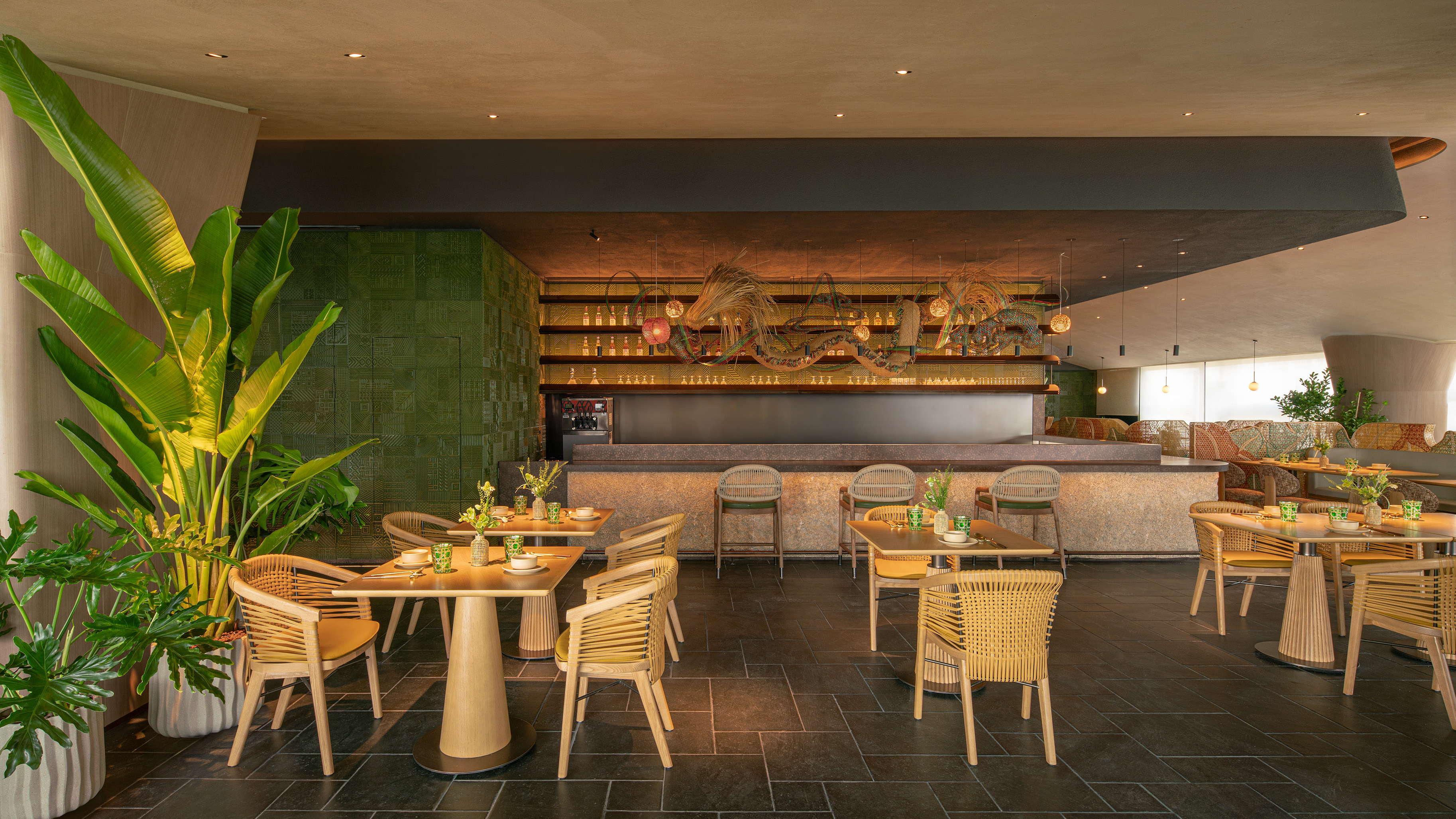 空间意境:入口LOGO墙上的艺术毯采用艺术家胡约华手工编织羊毛毡及多种材料仿生大自然植物及食材类呈现秀美广西。吧台上的 “炮龙”装置采用传统手工非遗竹编工艺,形成“游龙戏珠”的画面,与墙面图腾呼应:游龙在丰收画卷内自由翱翔。竹艺编织出的叠叠芭蕉林,不仅灵动生机,更承担着空间划分与情境营造的双重角色,通过材料、结构和空间的转译,营造一个兼具文化识别性的场所。