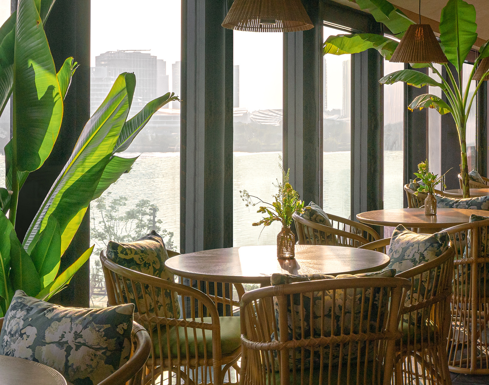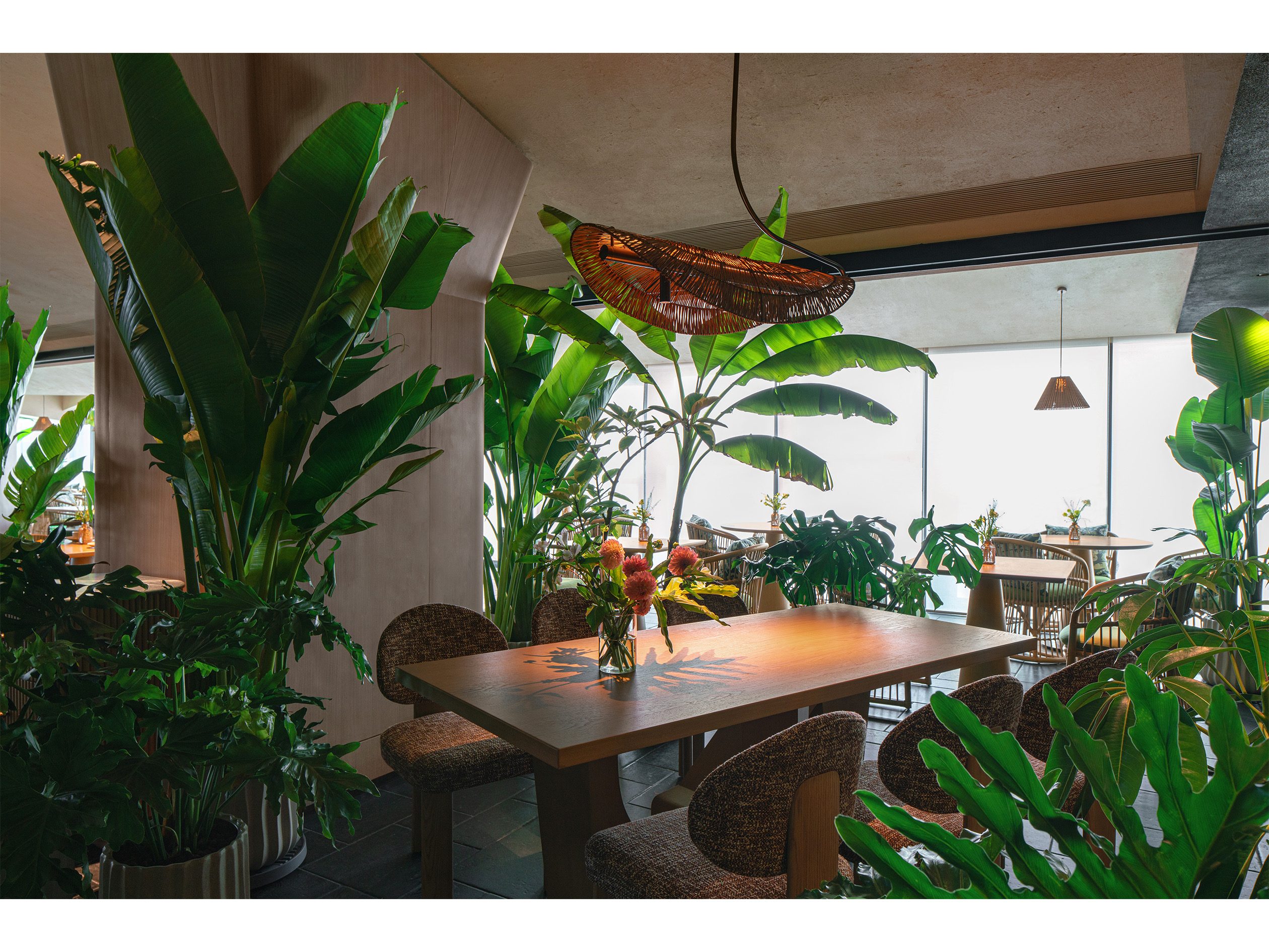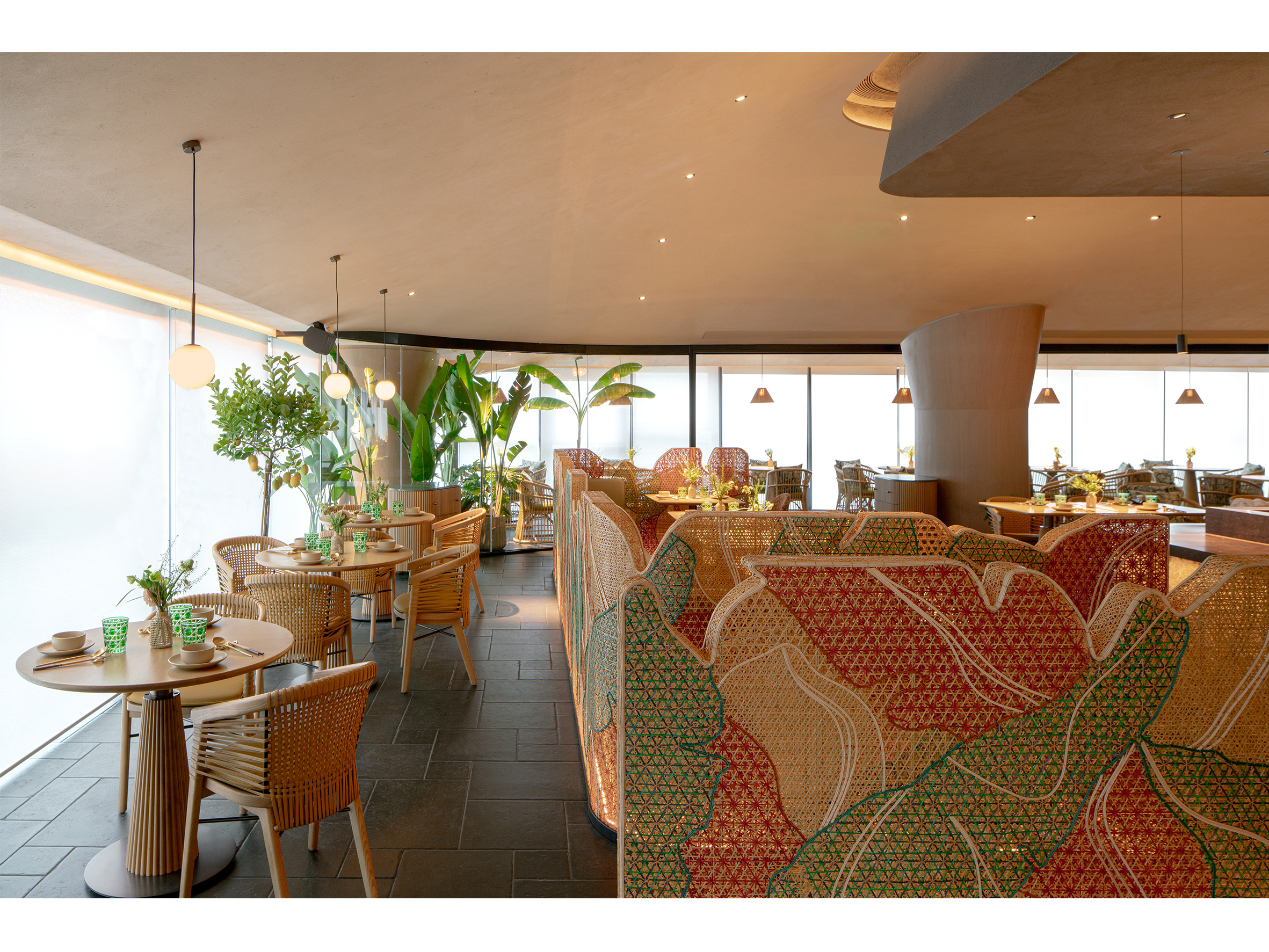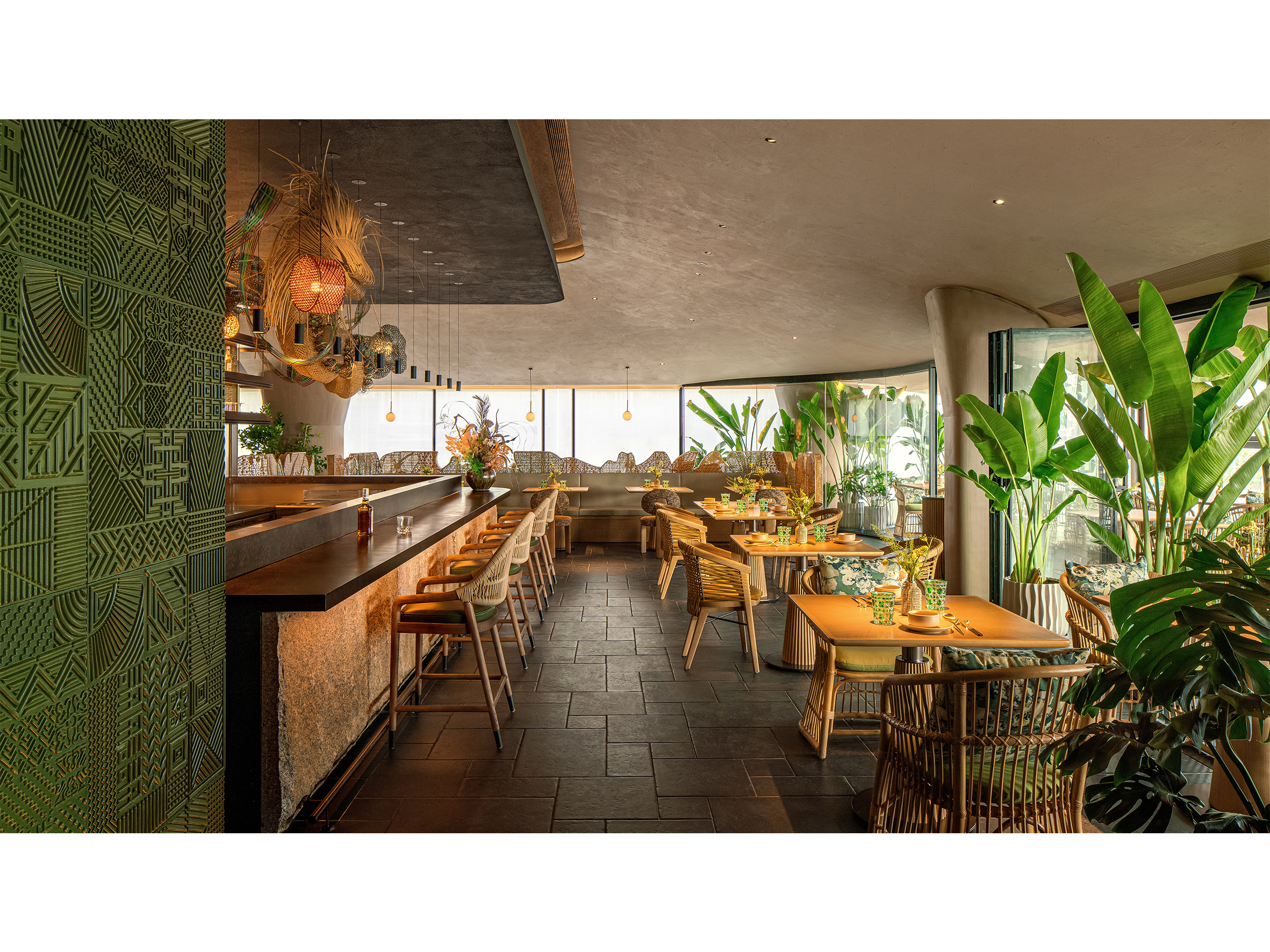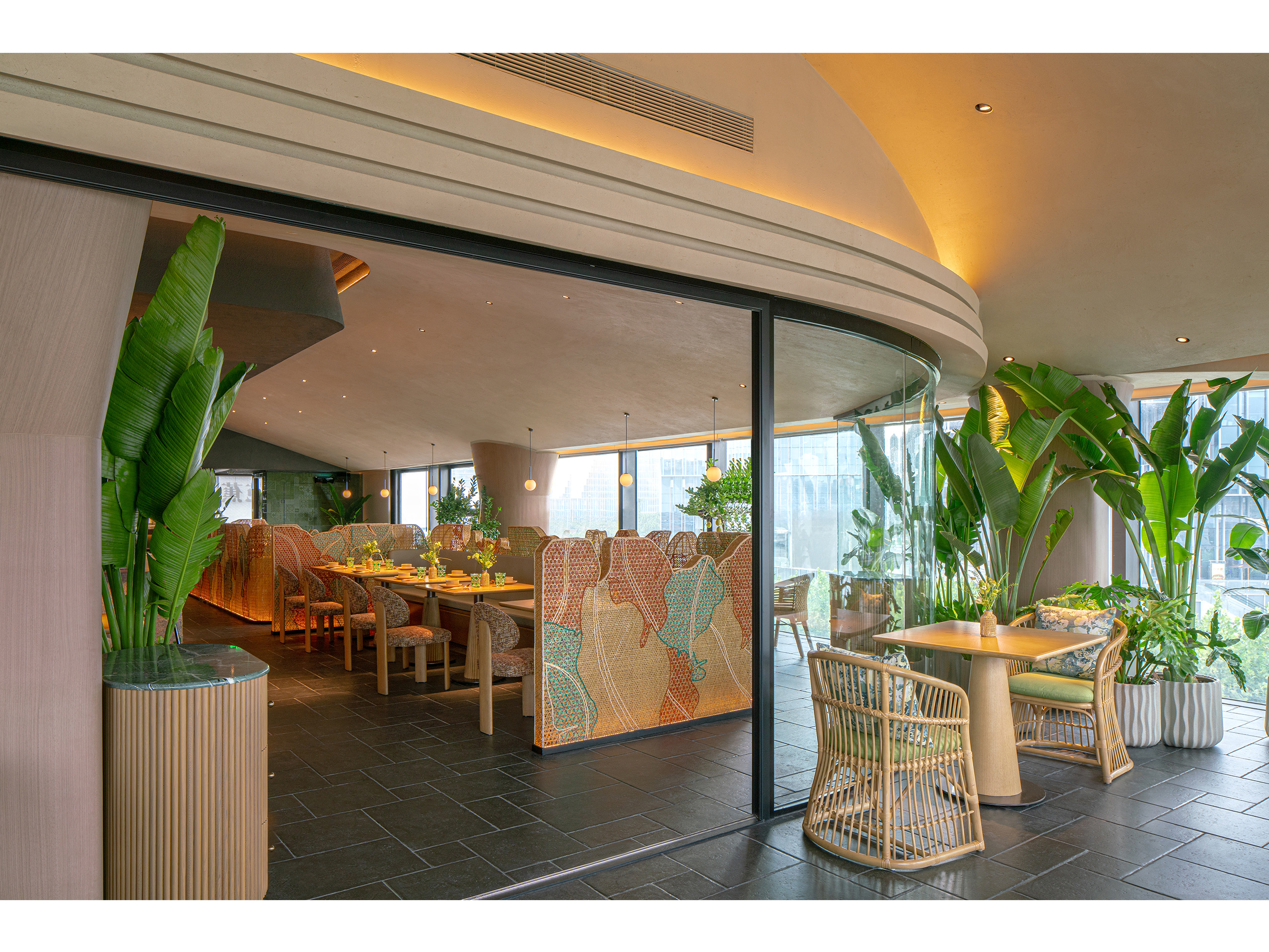 项目定位:“秀美广西,食在沪上,芭蕉林里,寻桂味。”桂芭蕉起源于广西特色文化,本案位于上海徐汇,黄浦江畔西岸梦中心的水泥厂筒仓之上,独特的工业遗产和绝佳的滨江景观透过全景落地窗全方位融入室内空间,以广西地域性文化作为整个空间设计的核心。