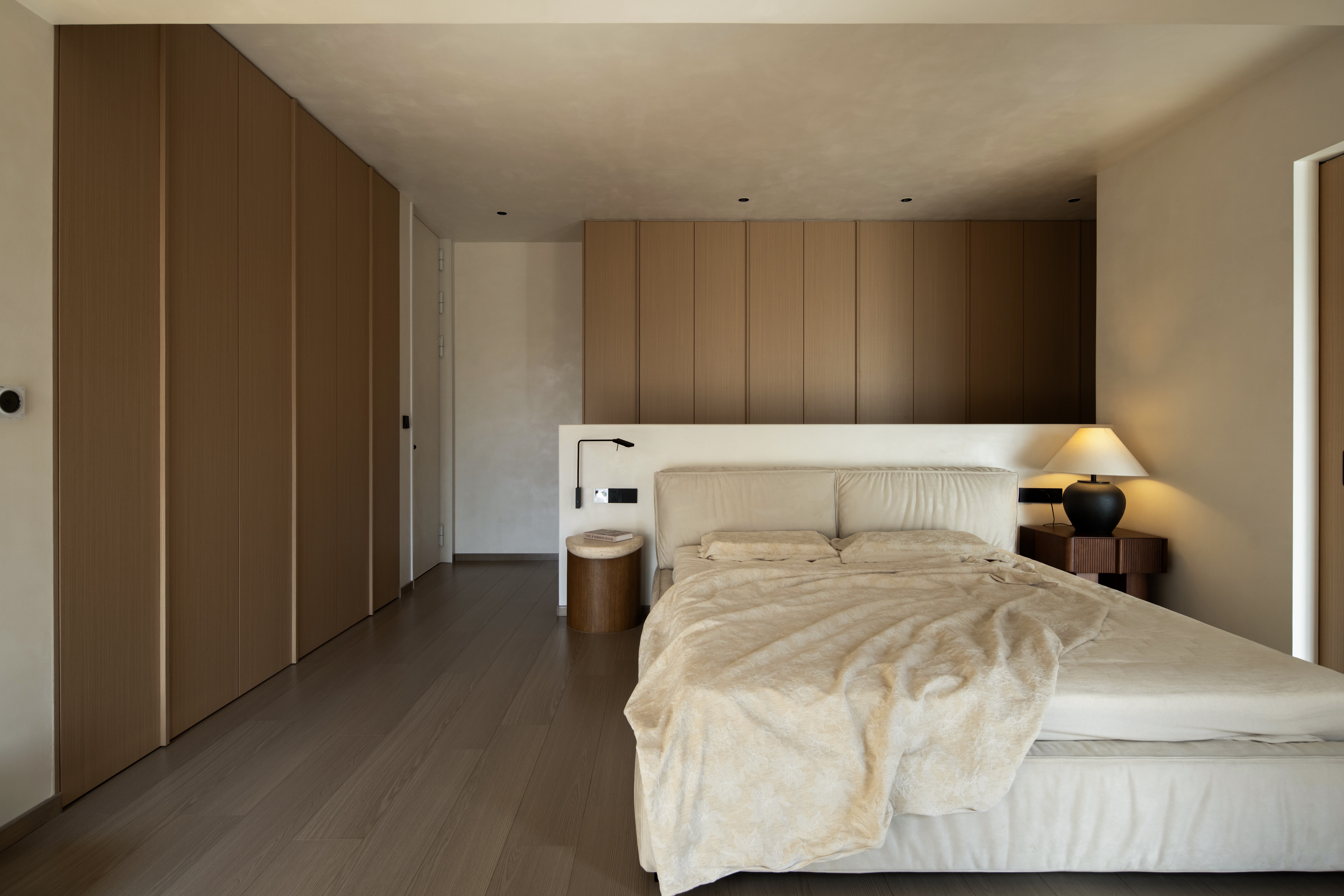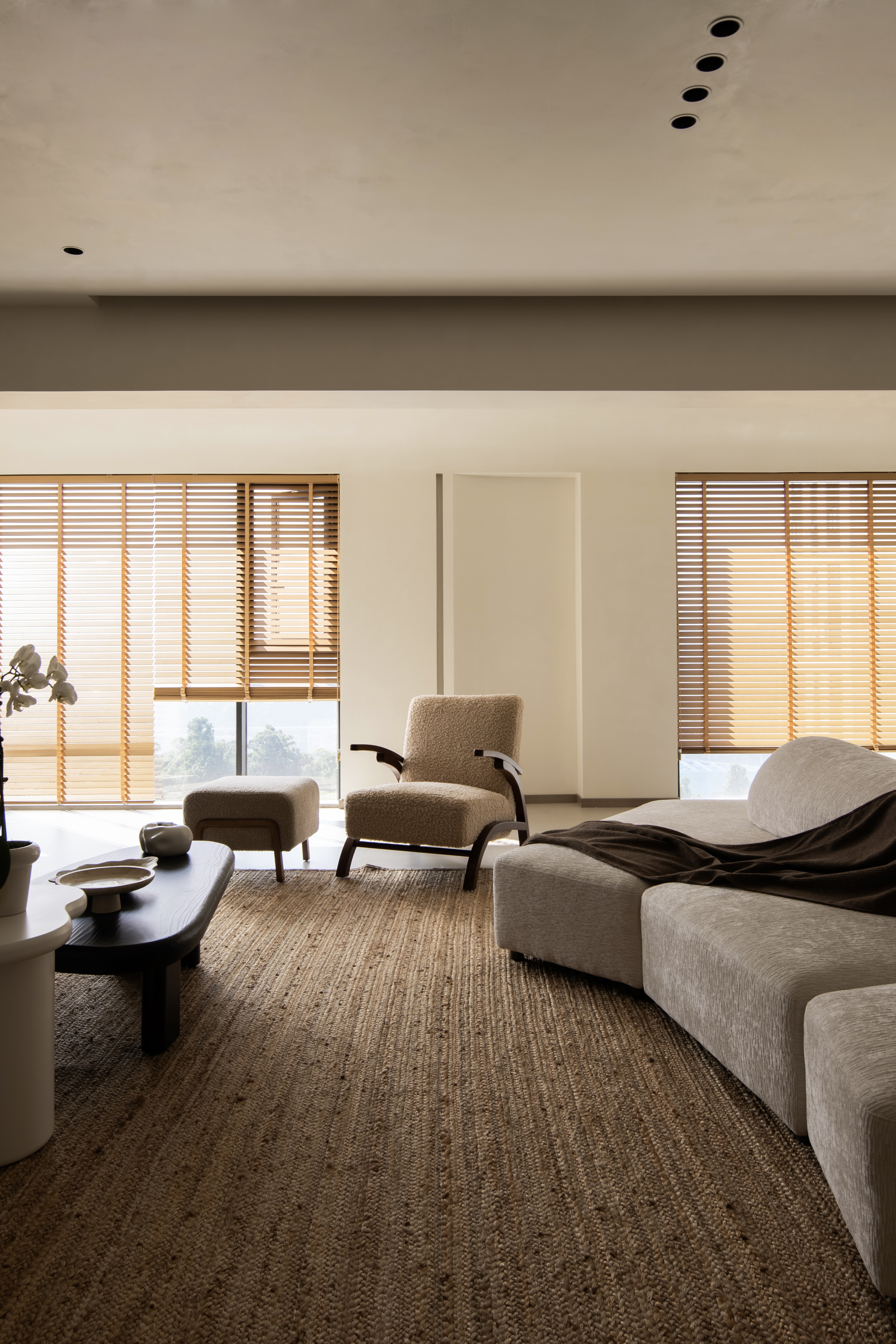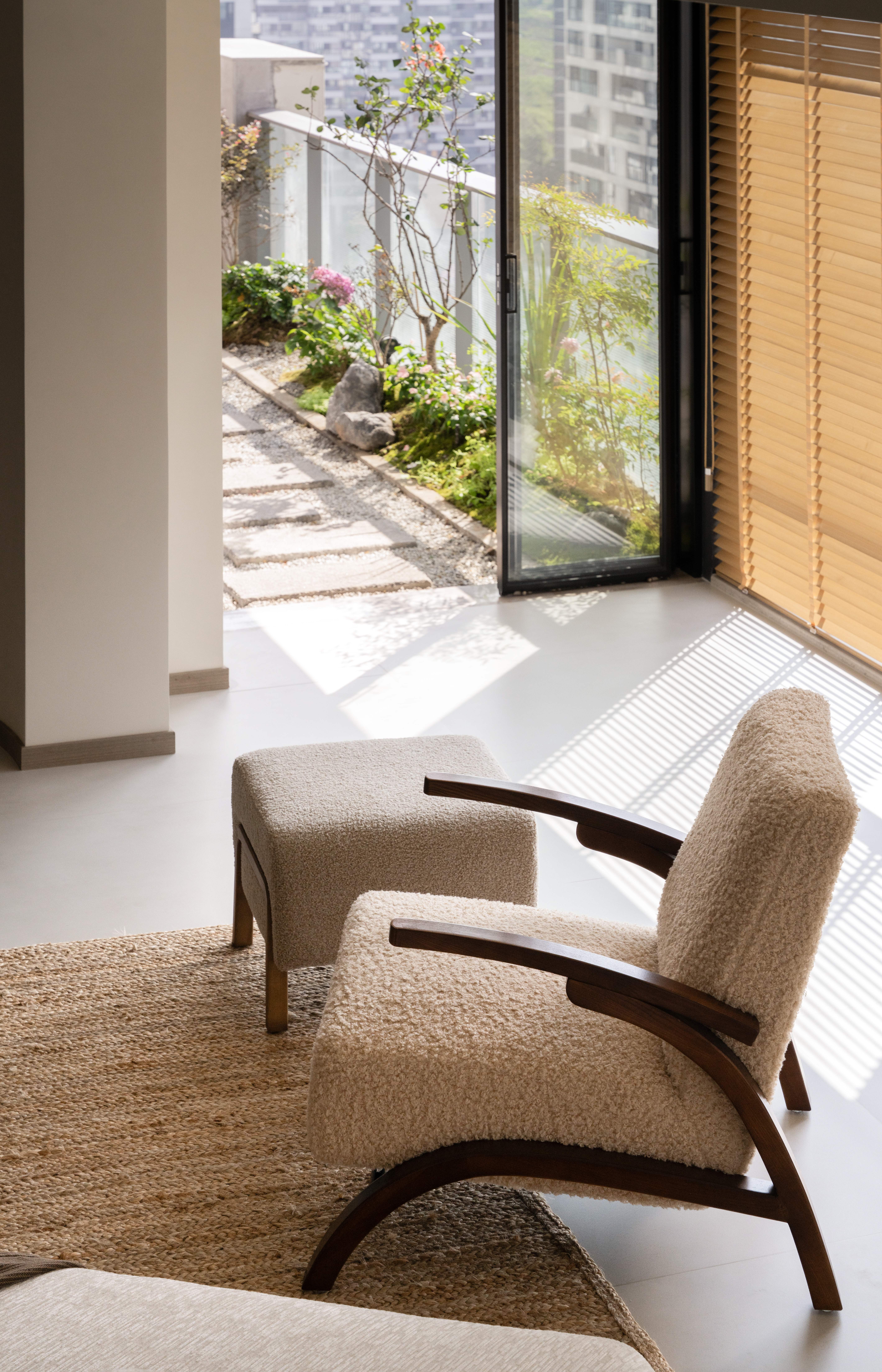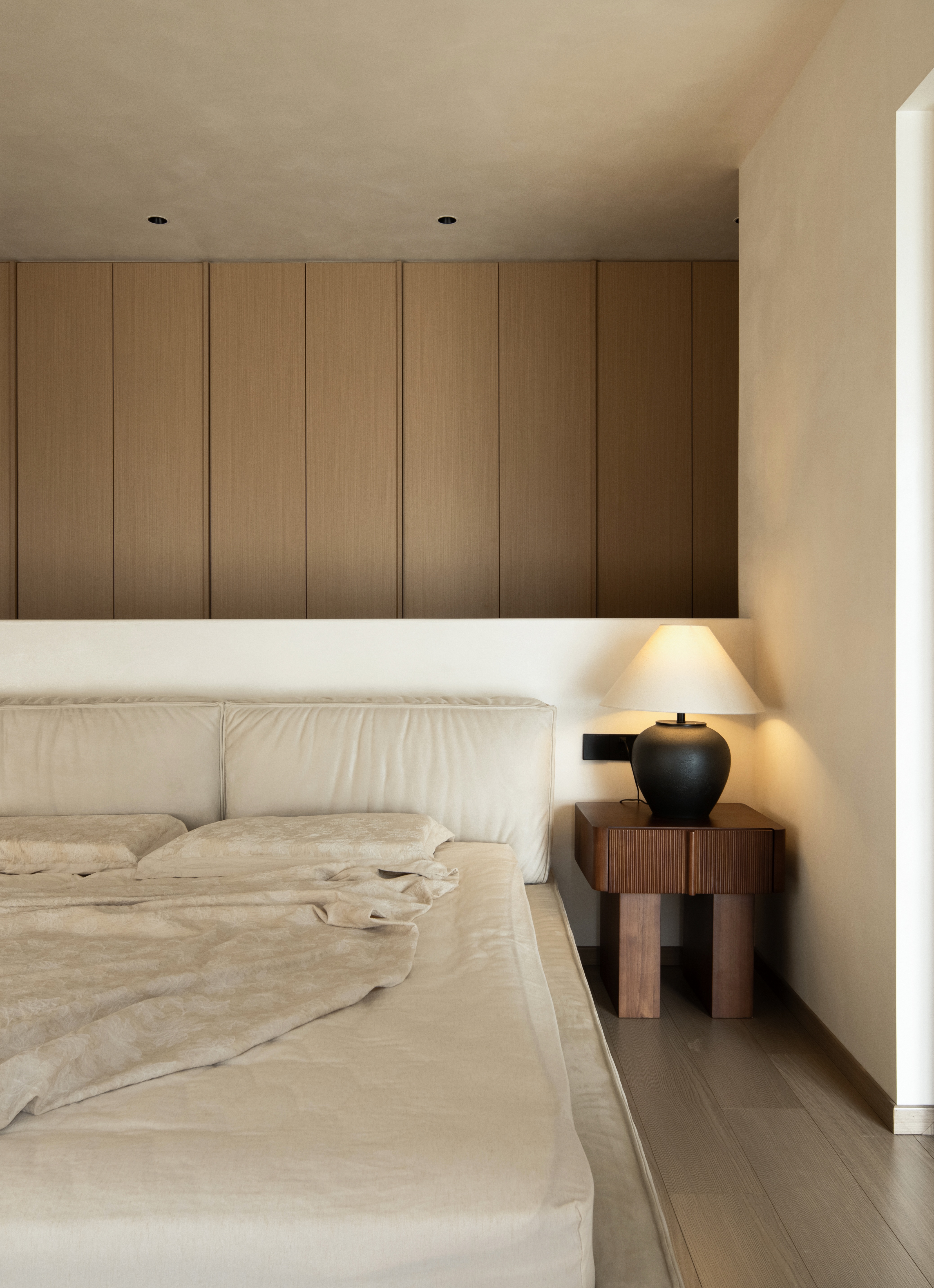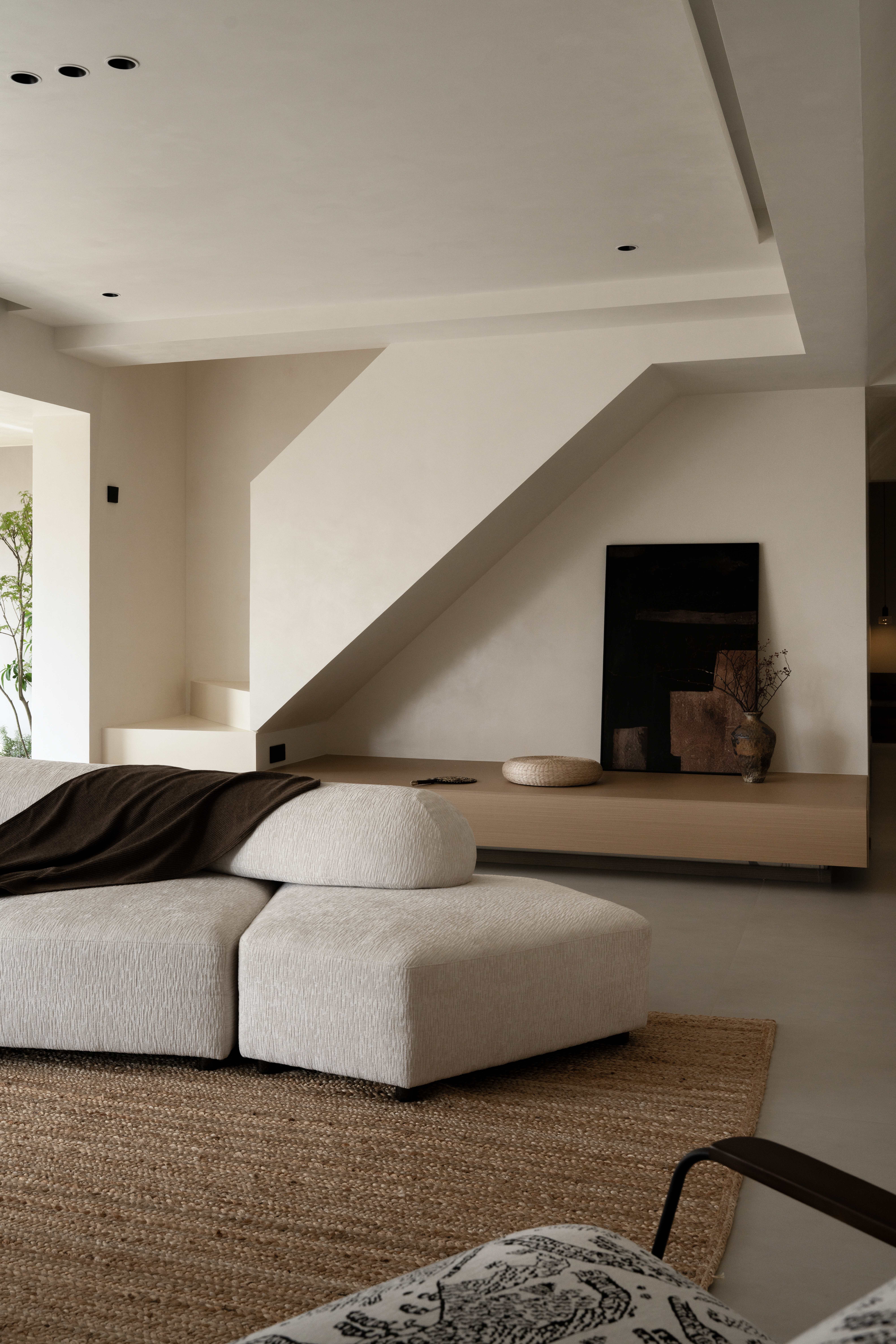 设计选材:温润的木质感与“月白”的柔暖形成材质互补,让空间更具整体感;搭配亚麻质地毯,增加脚感的舒适度。