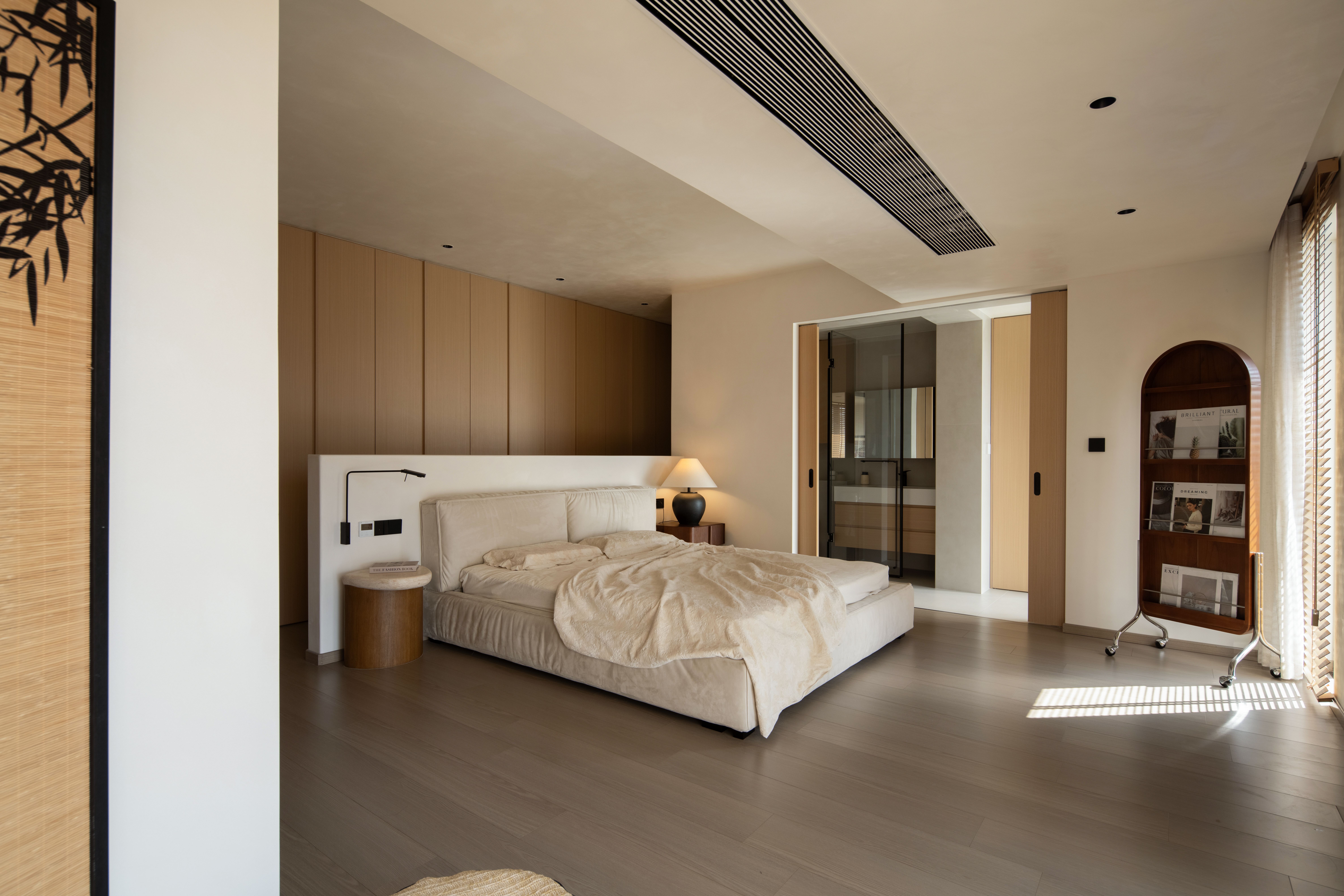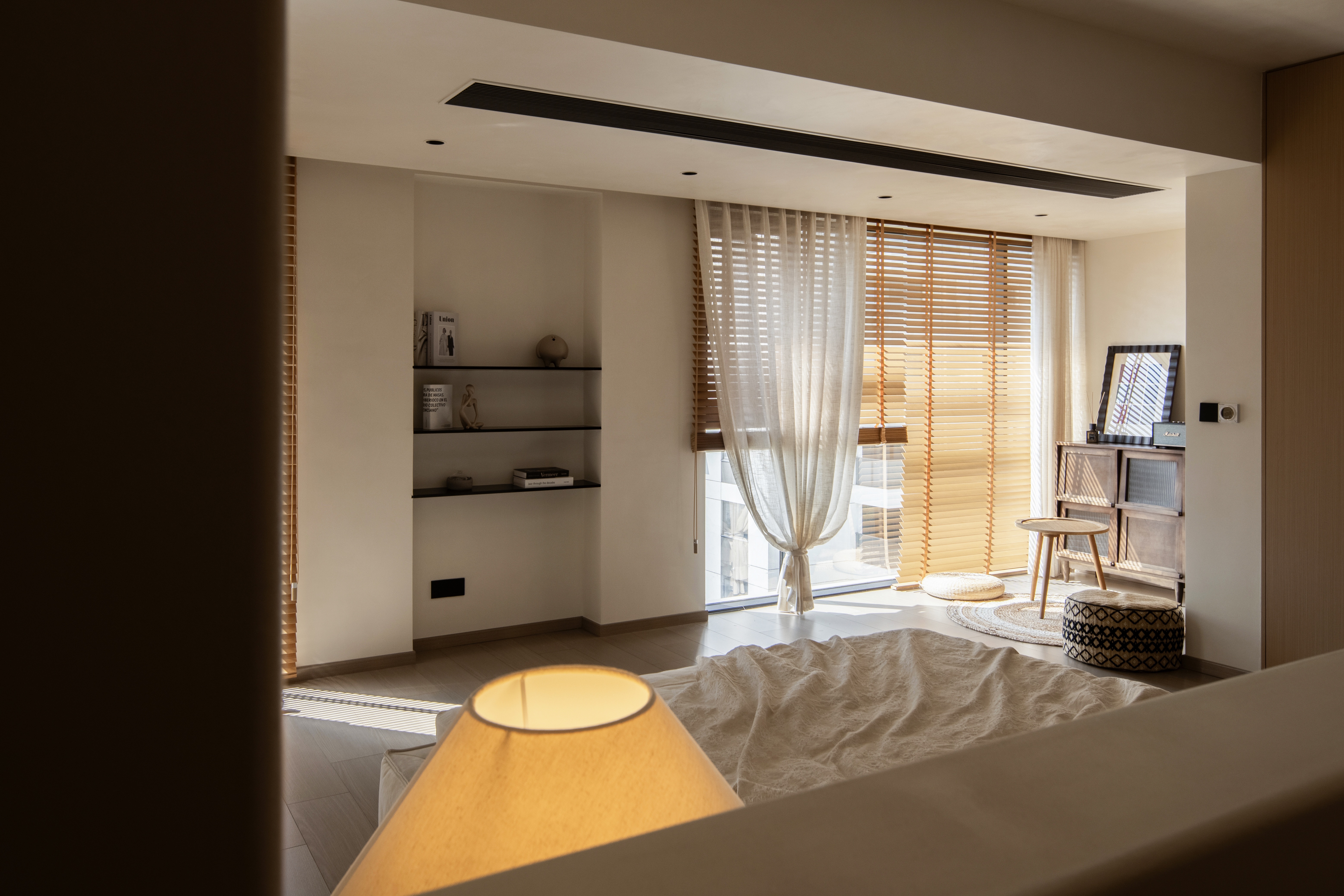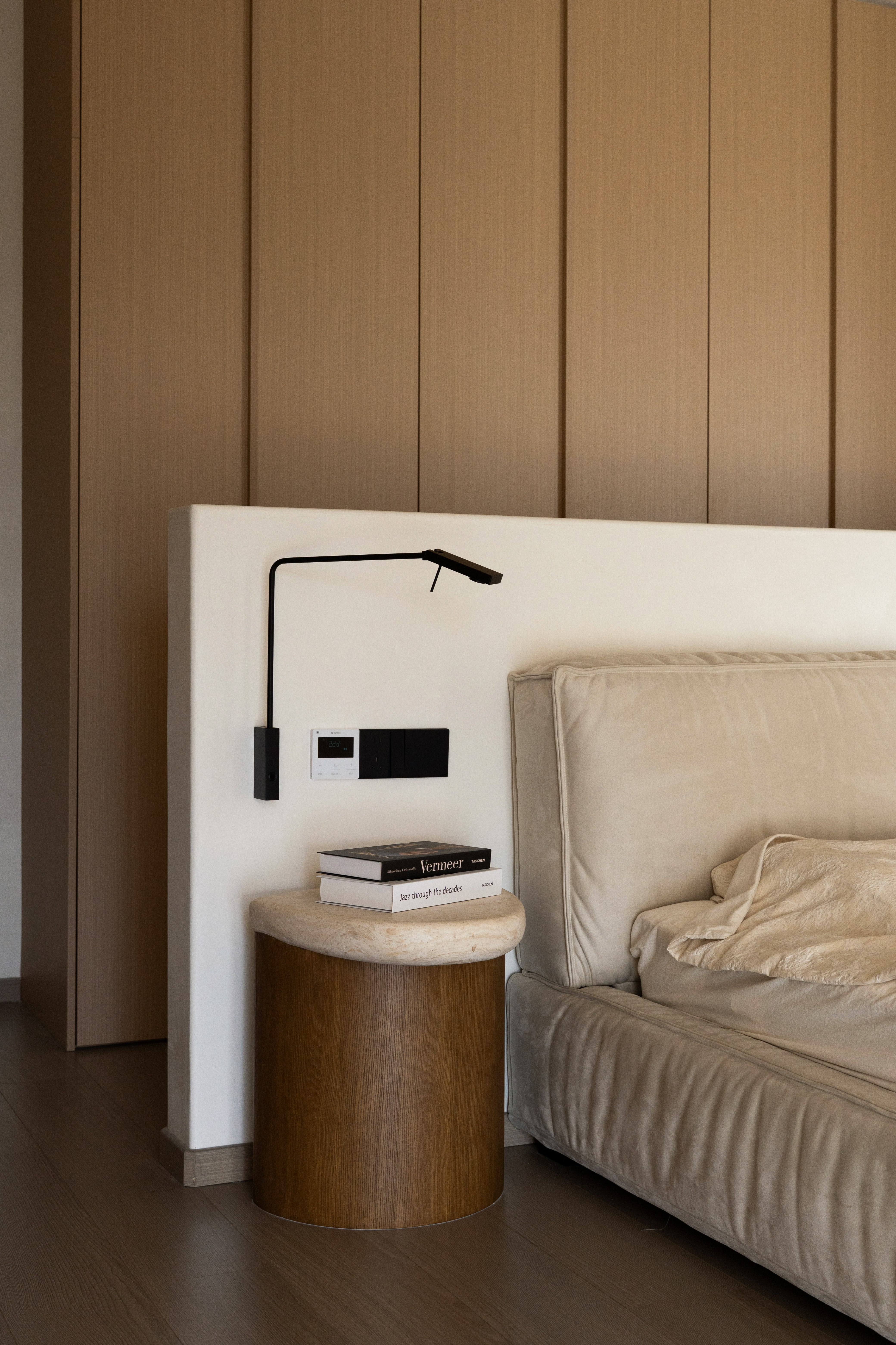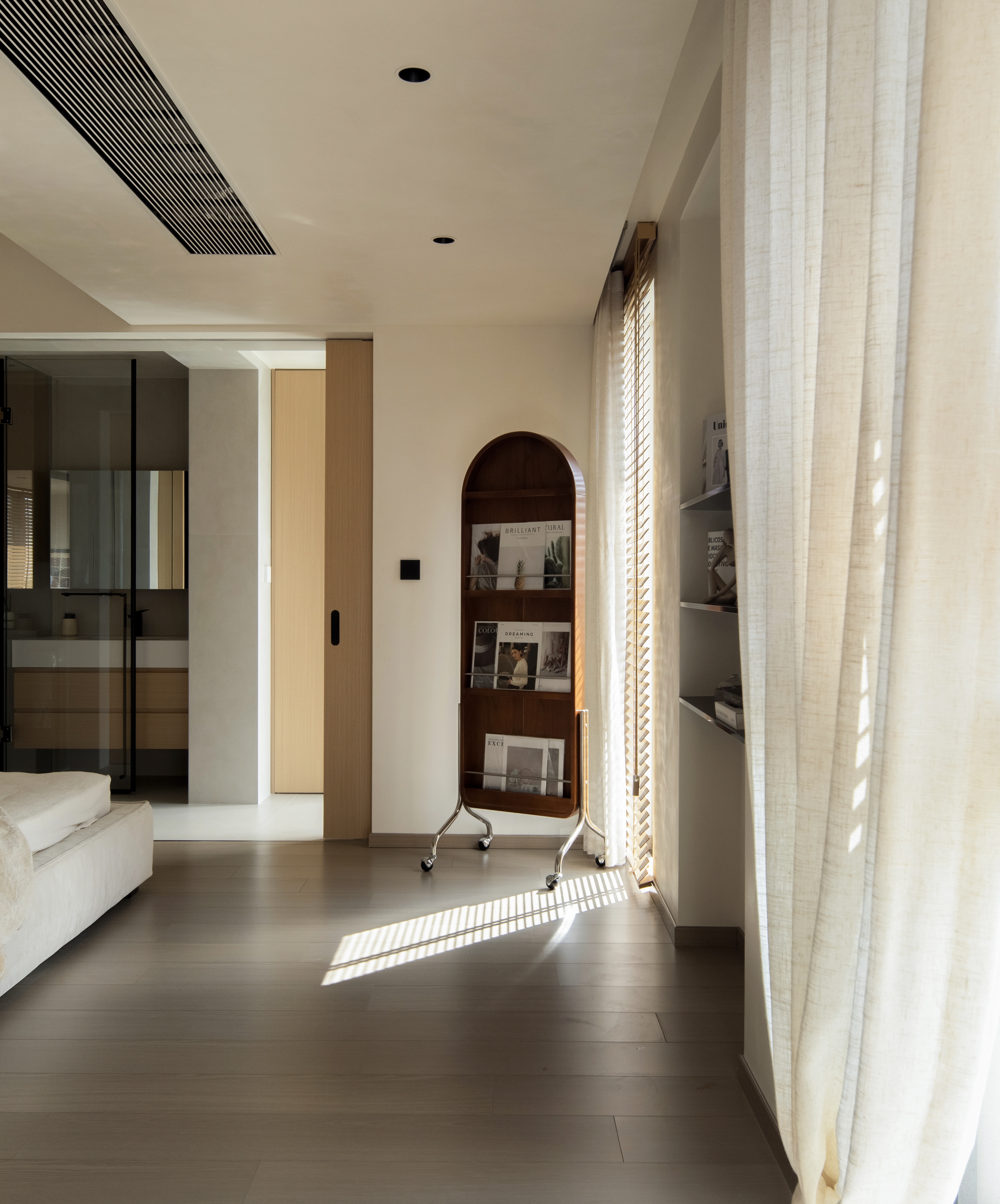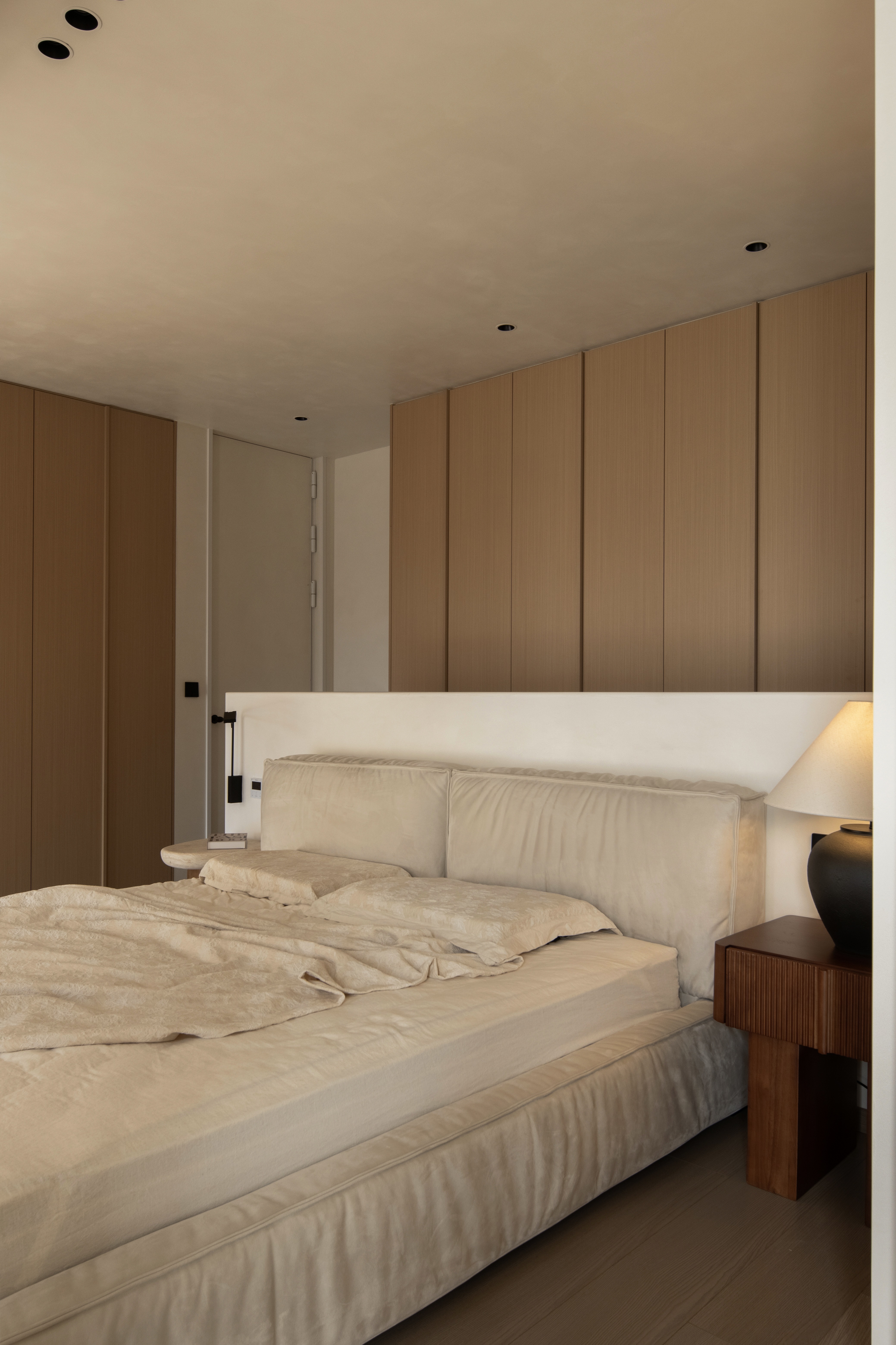 设计选材:温润的木质感与“月白”的柔暖形成材质互补,让空间更具整体感;搭配亚麻质地毯,增加脚感的舒适度。