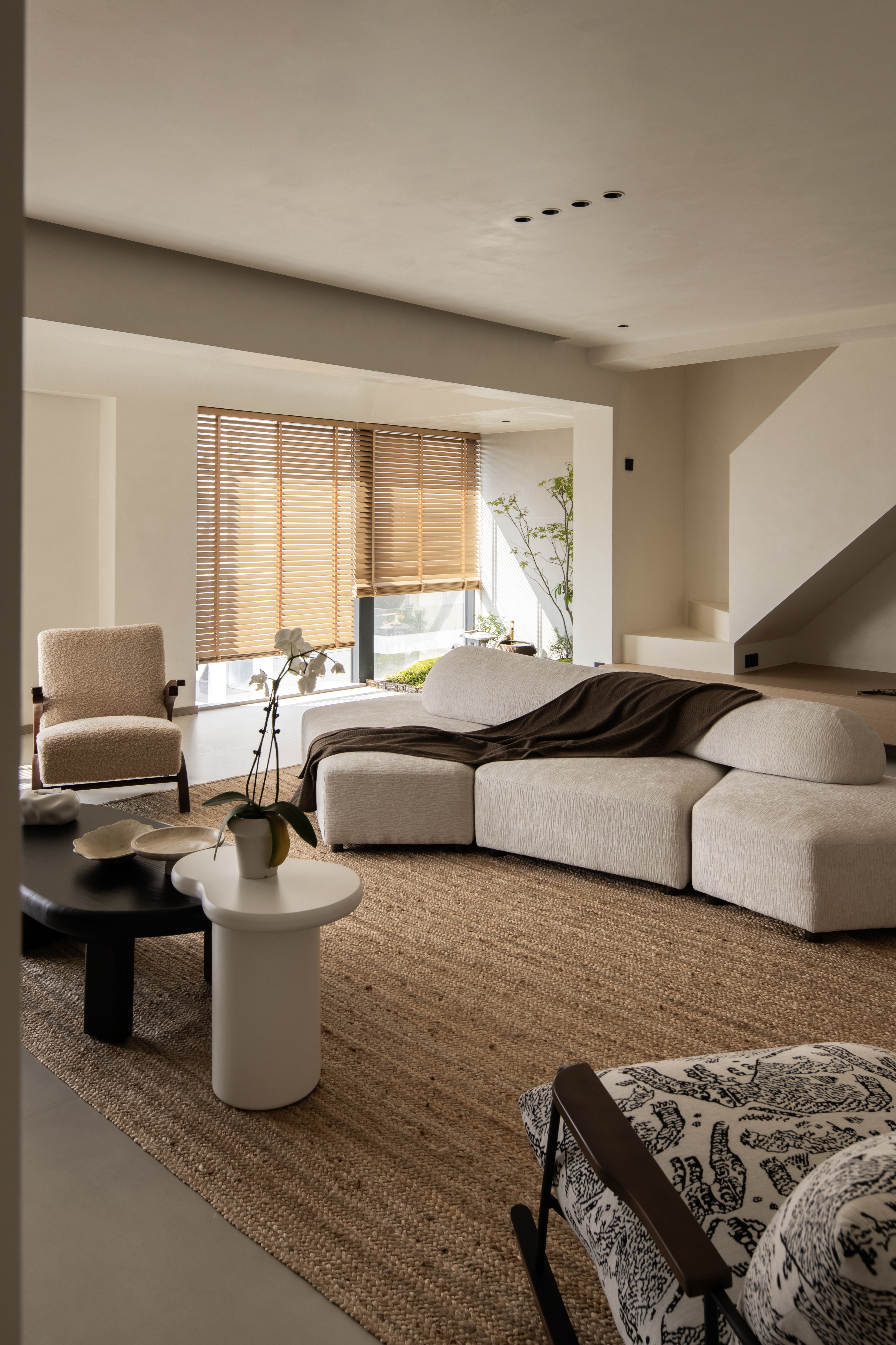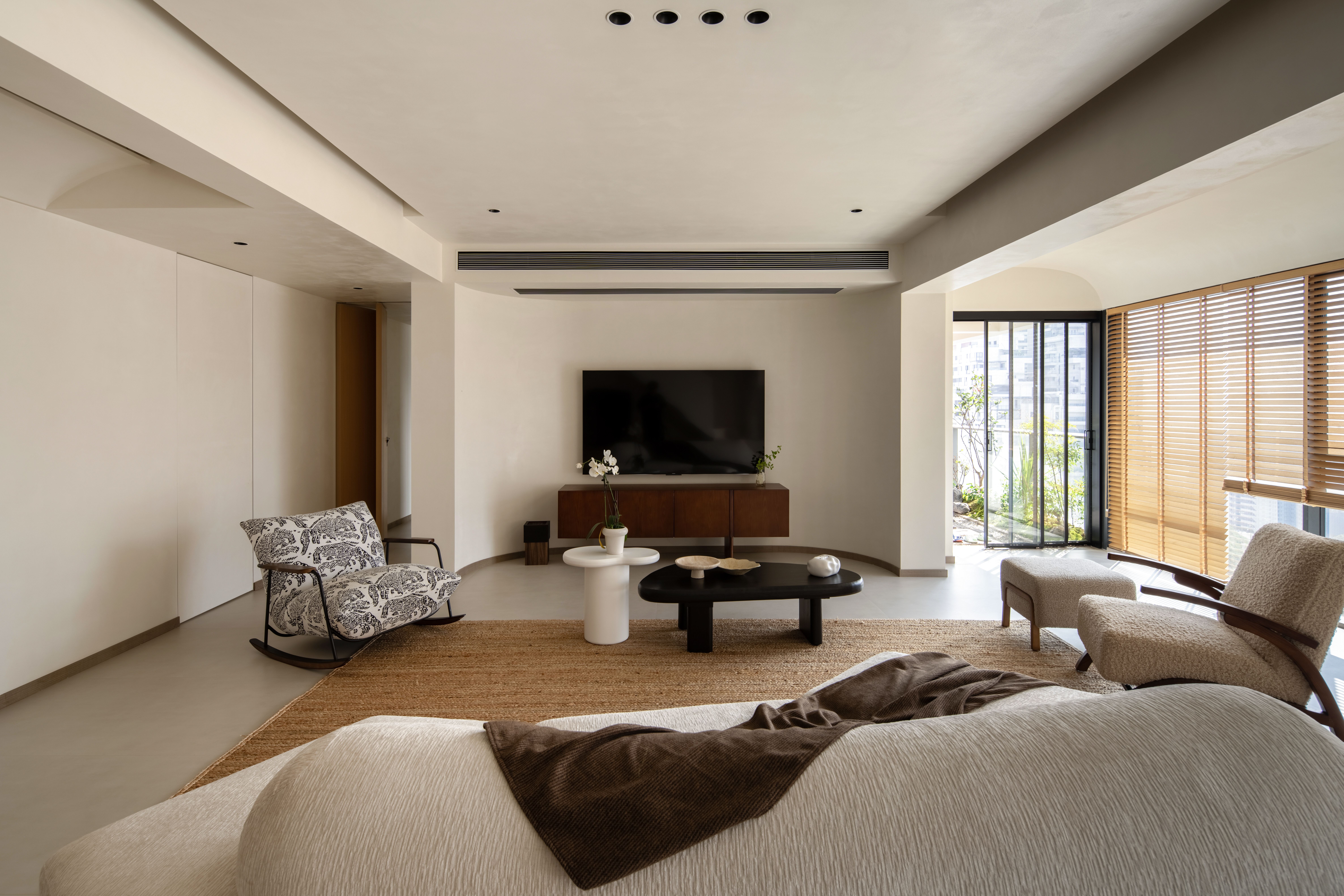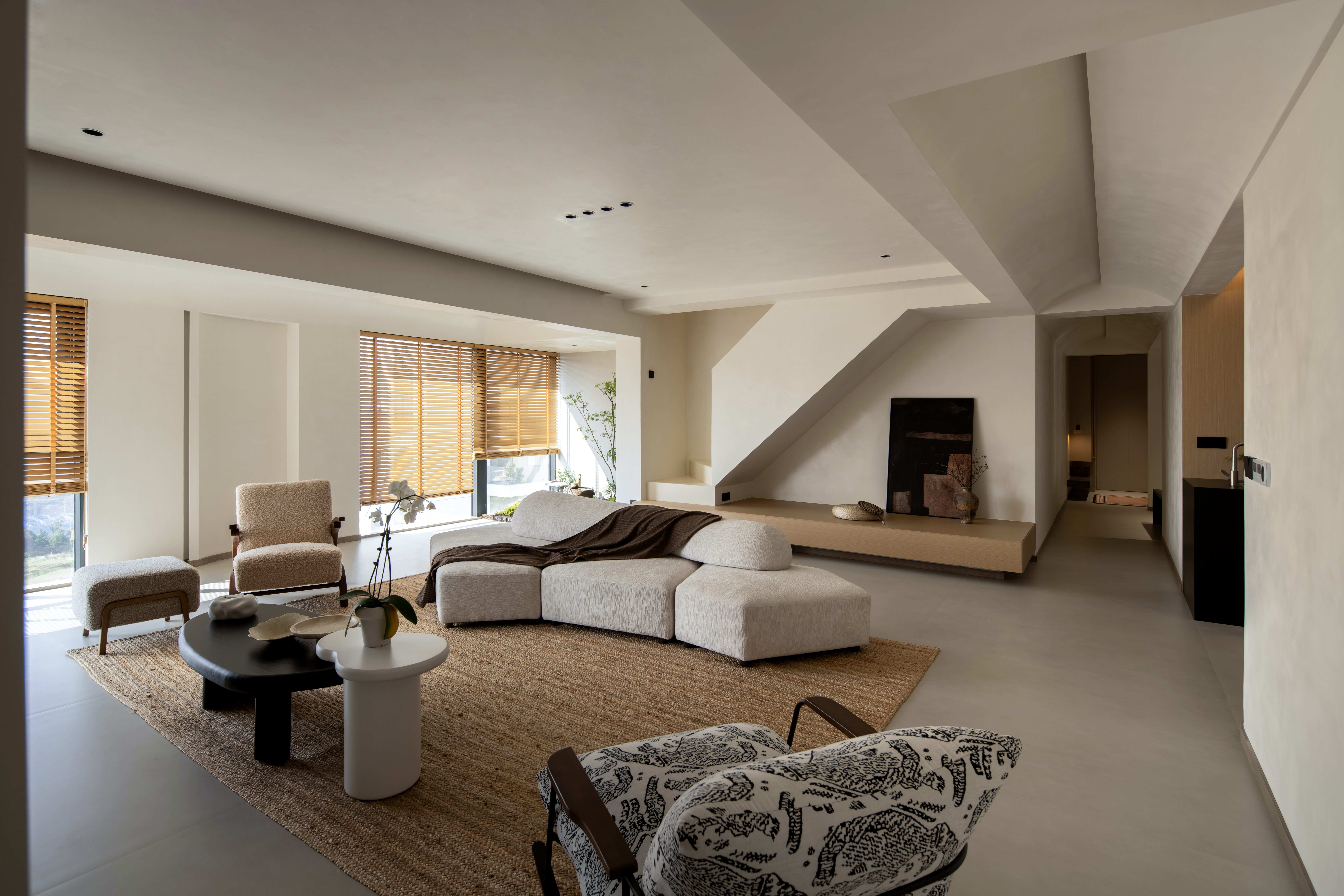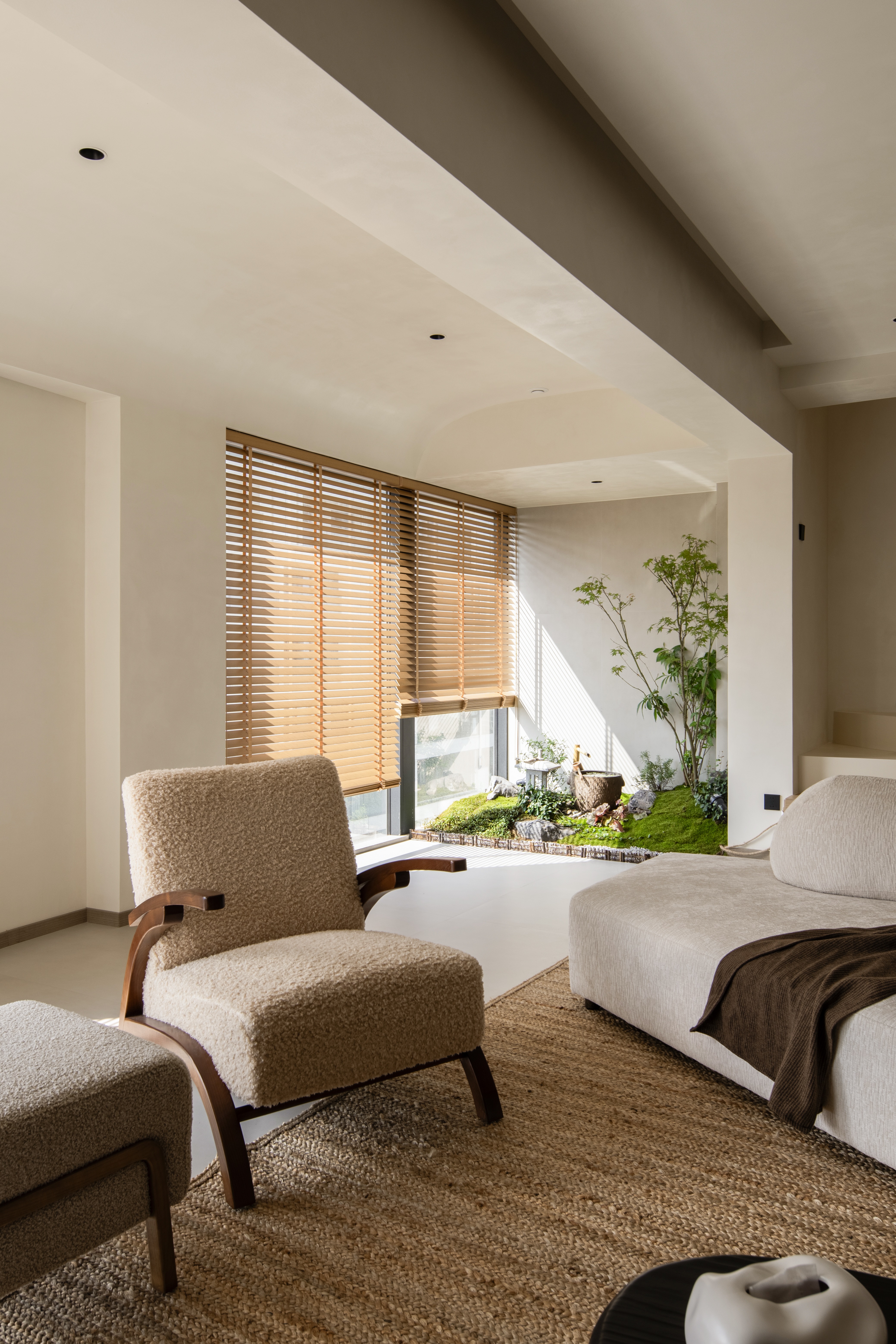设计选材:温润的木质感与“月白”的柔暖形成材质互补,让空间更具整体感;搭配亚麻质地毯,增加脚感的舒适度。