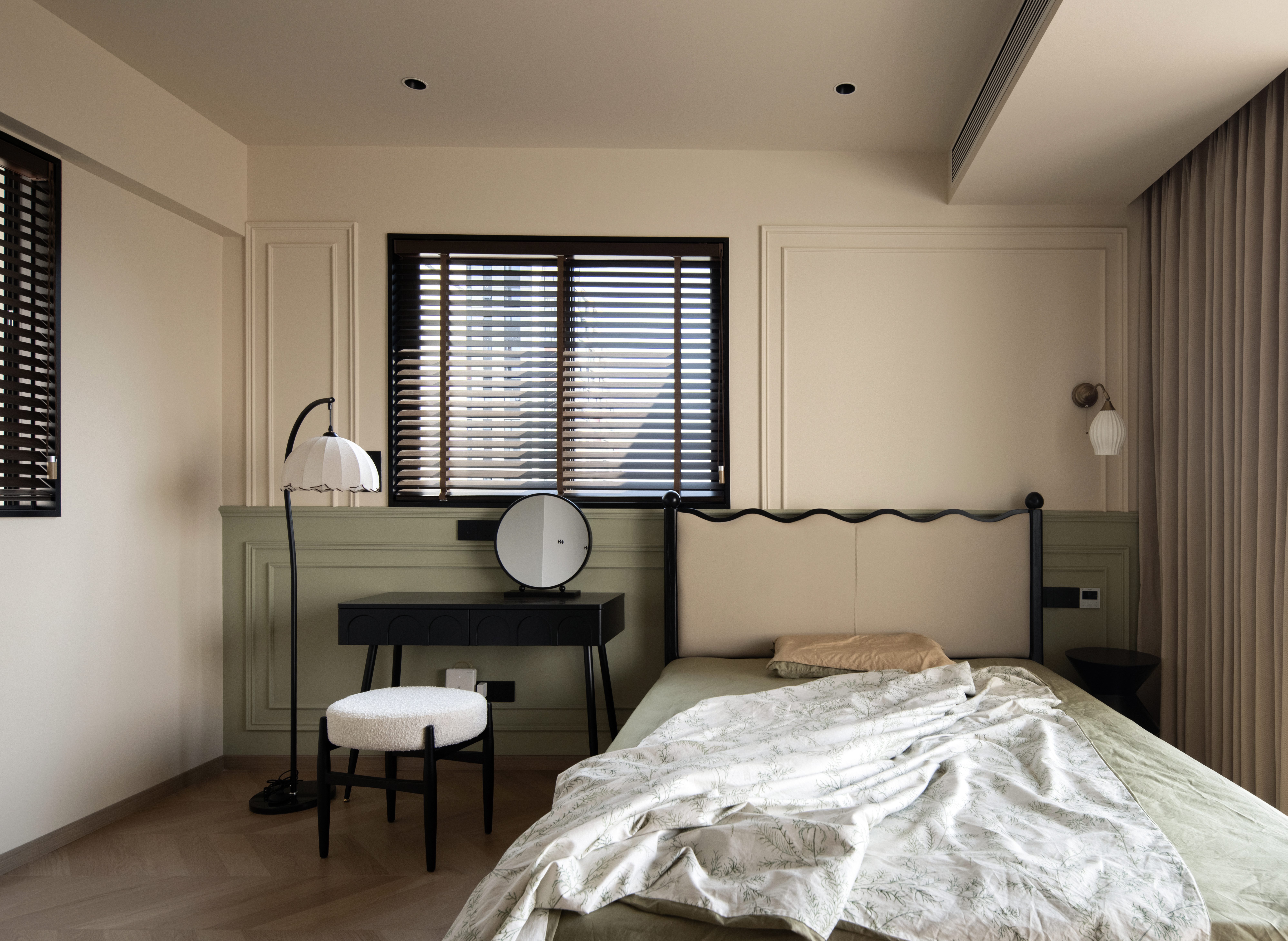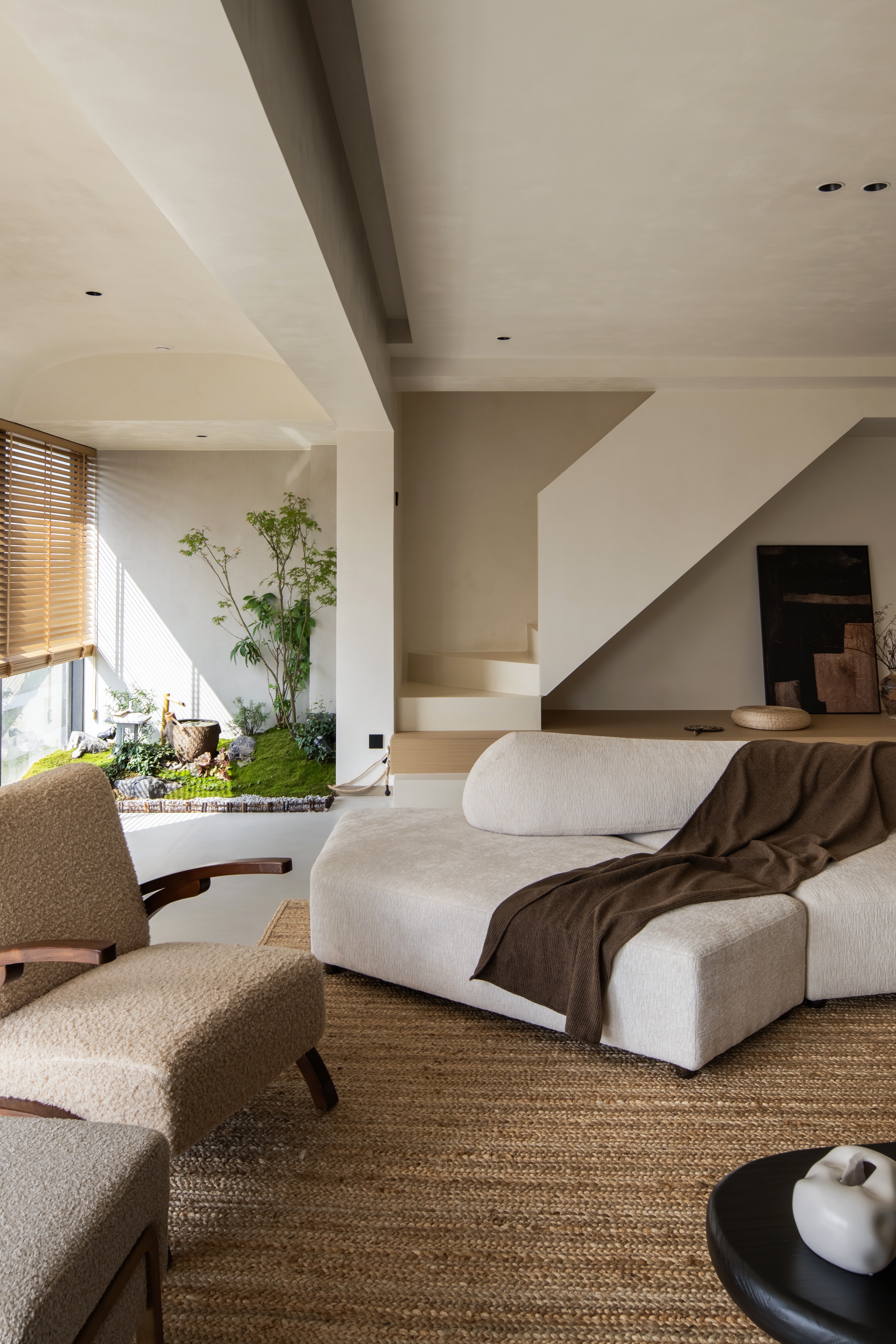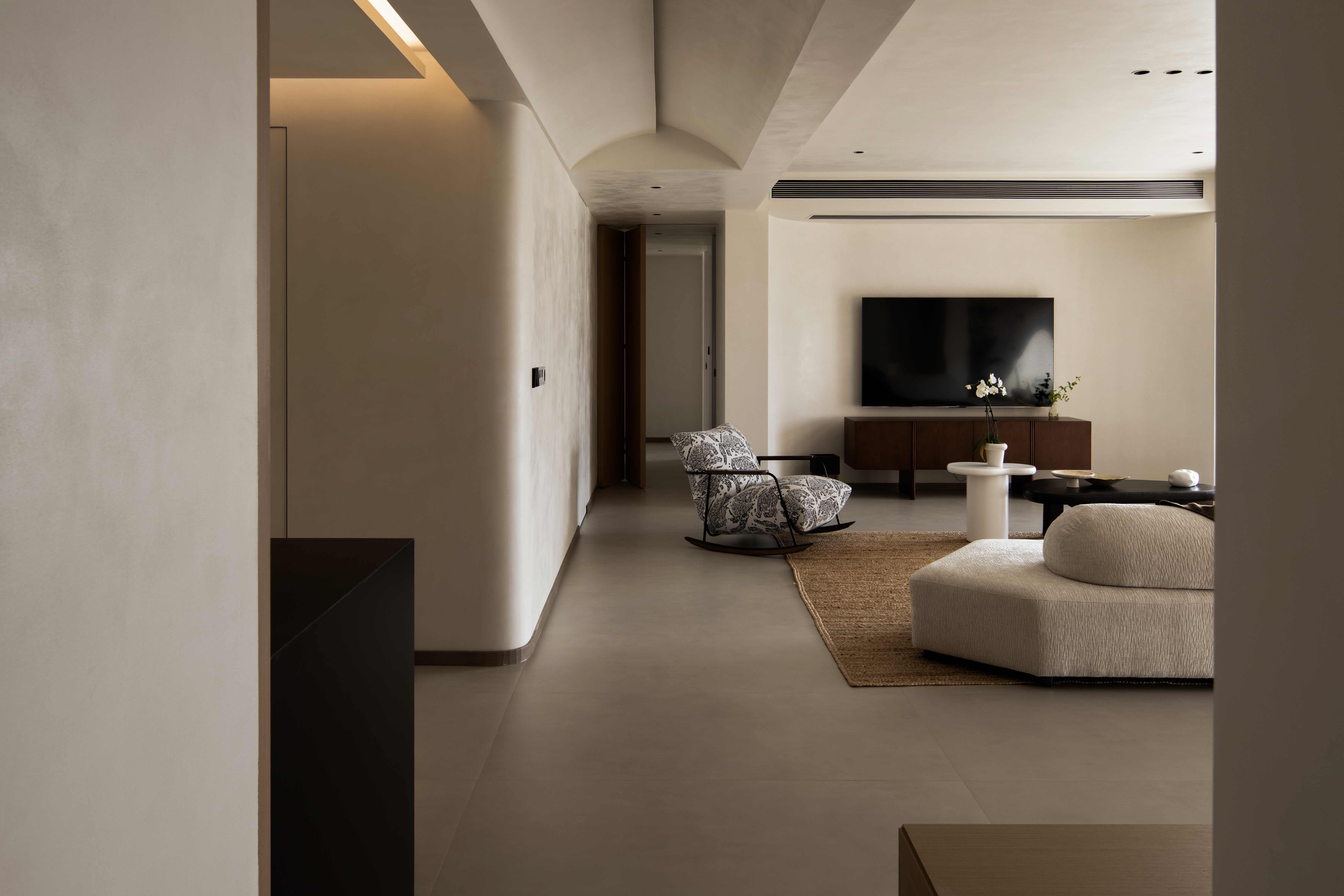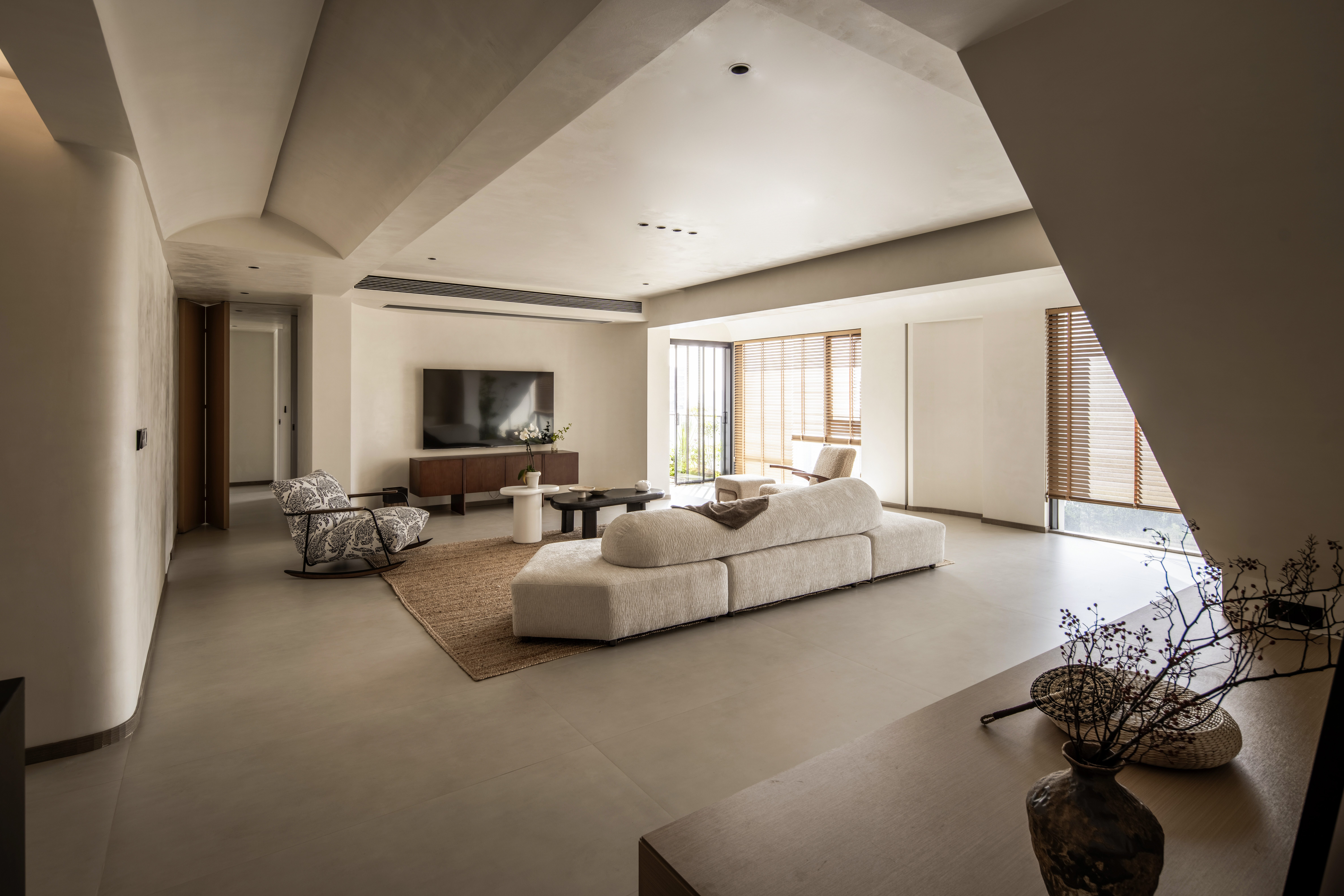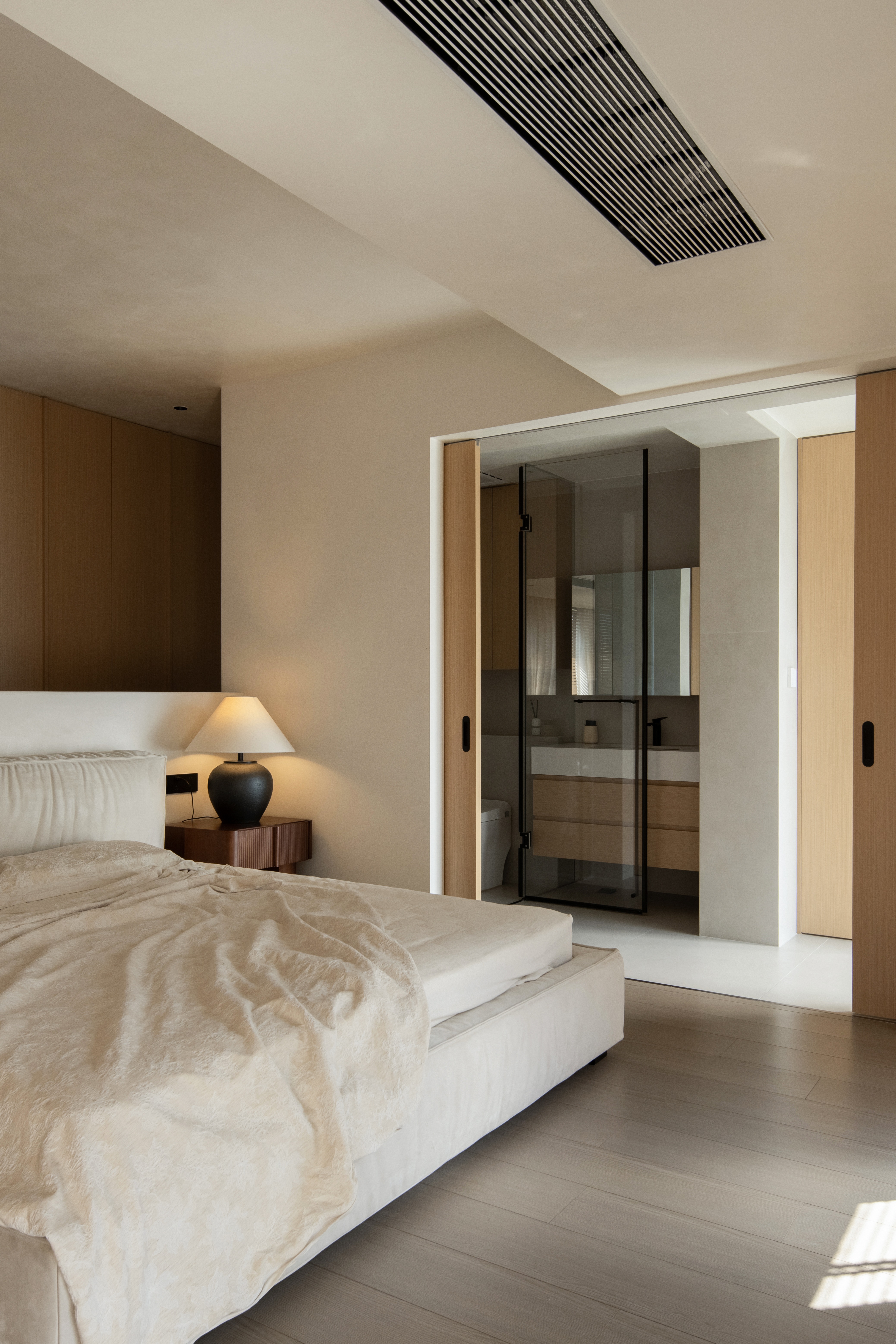 设计选材:温润的木质感与“月白”的柔暖形成材质互补,让空间更具整体感;搭配亚麻质地毯,增加脚感的舒适度。