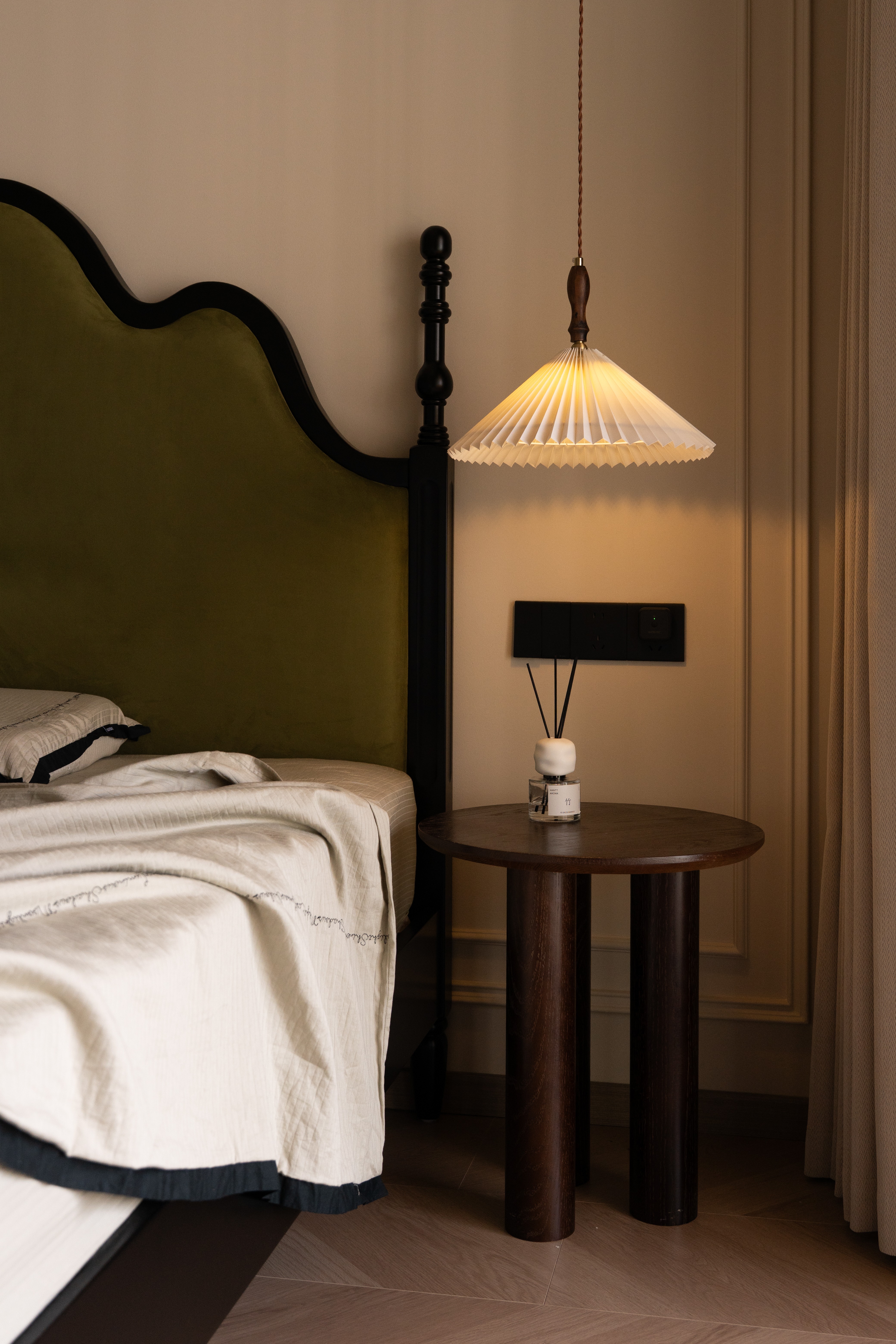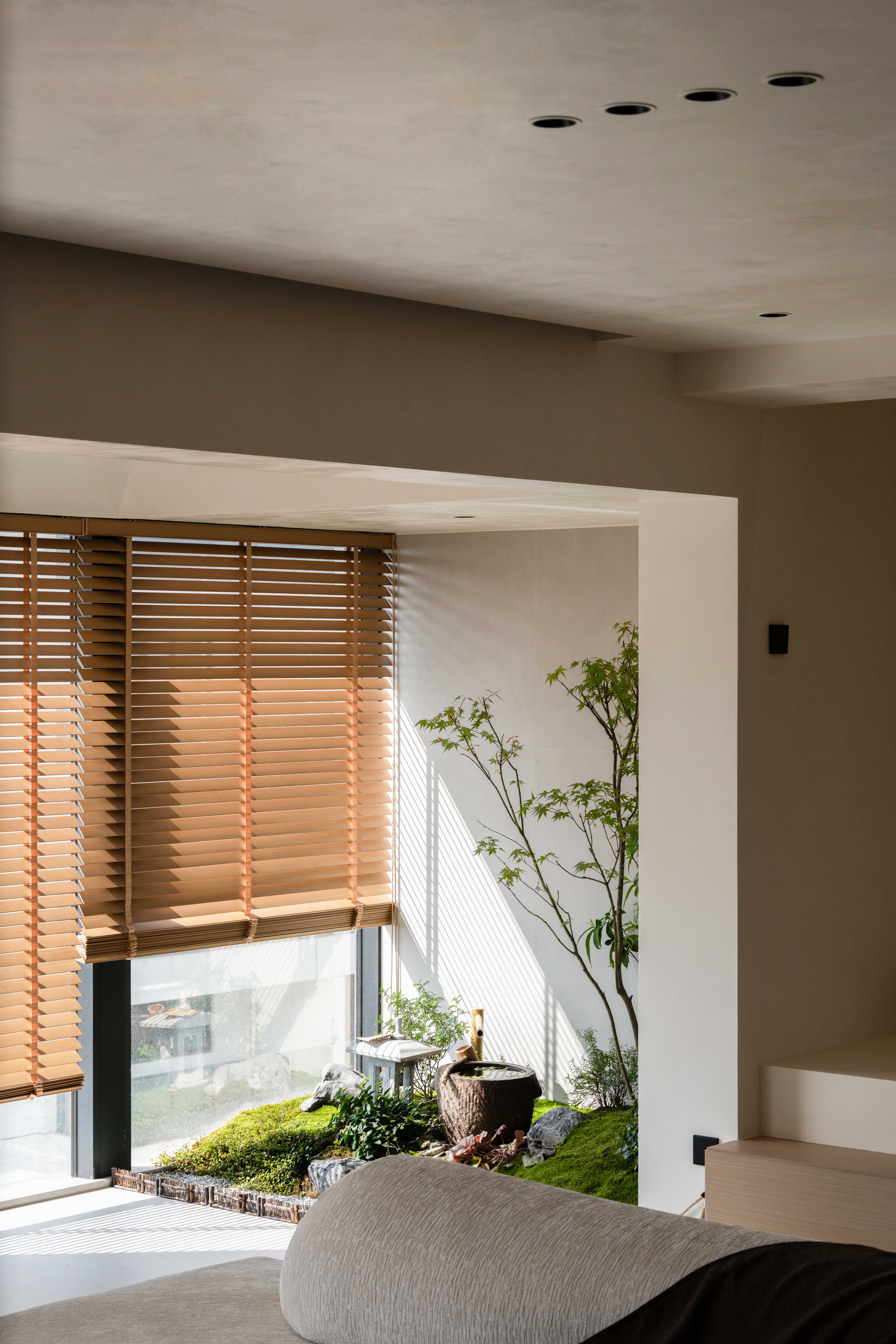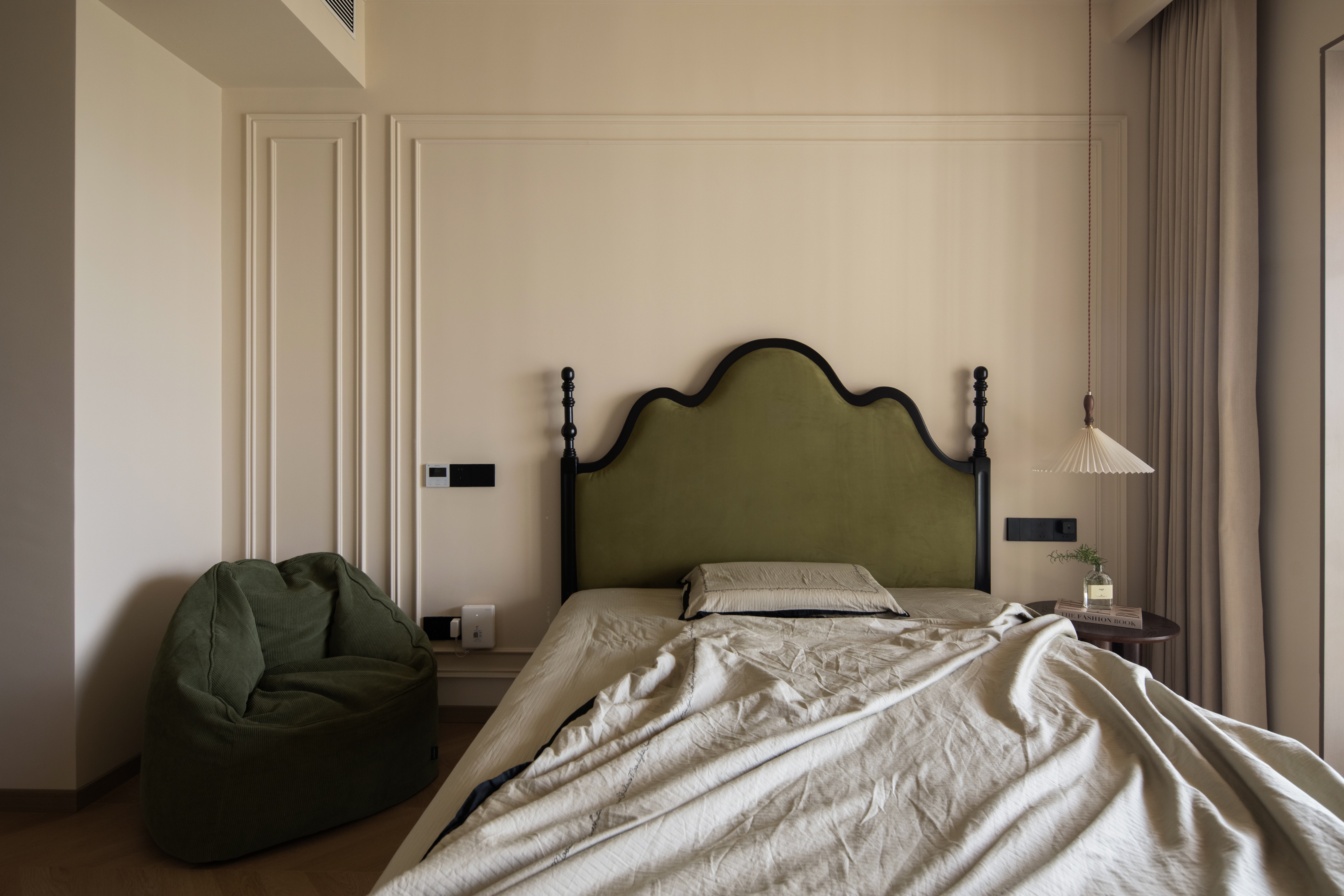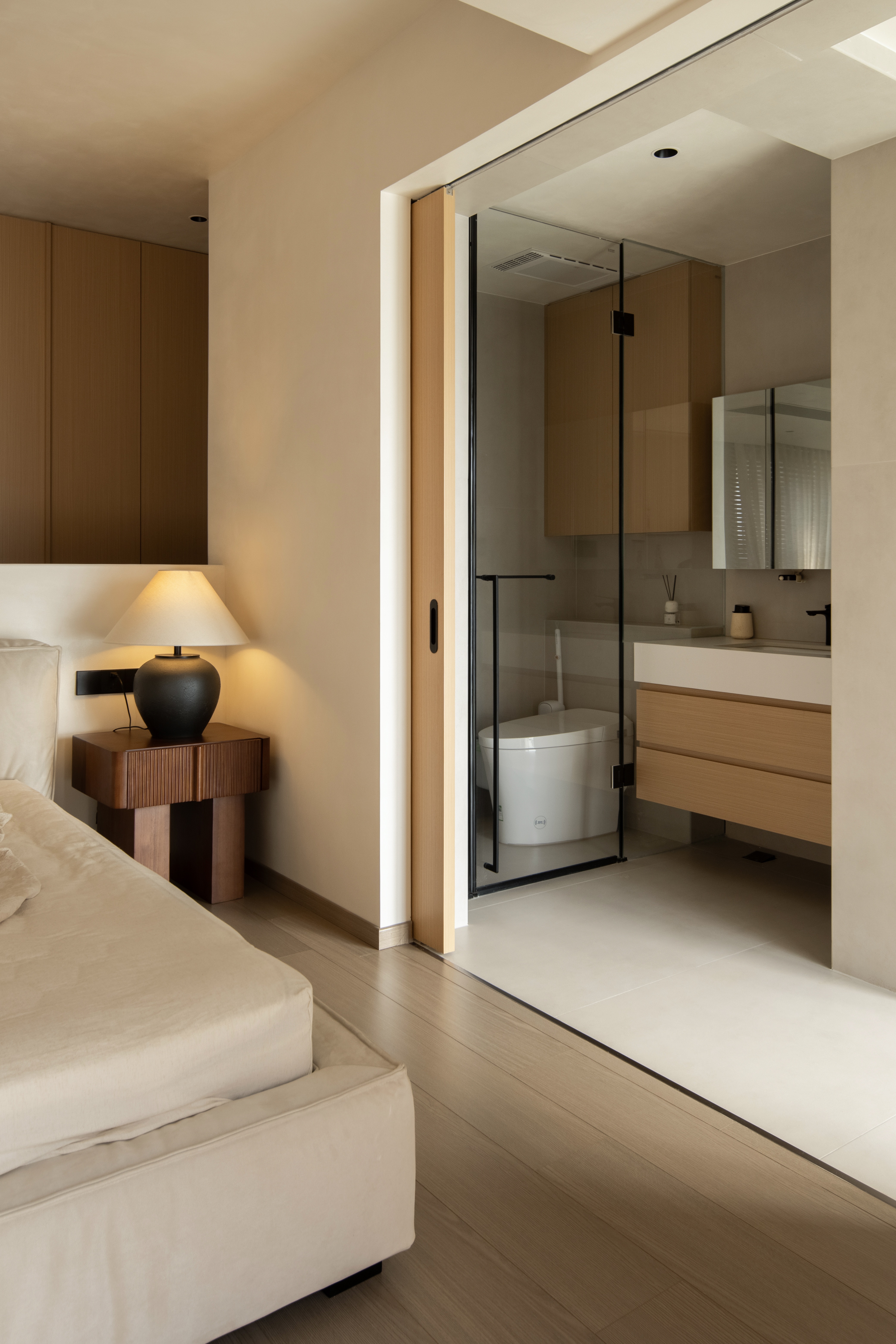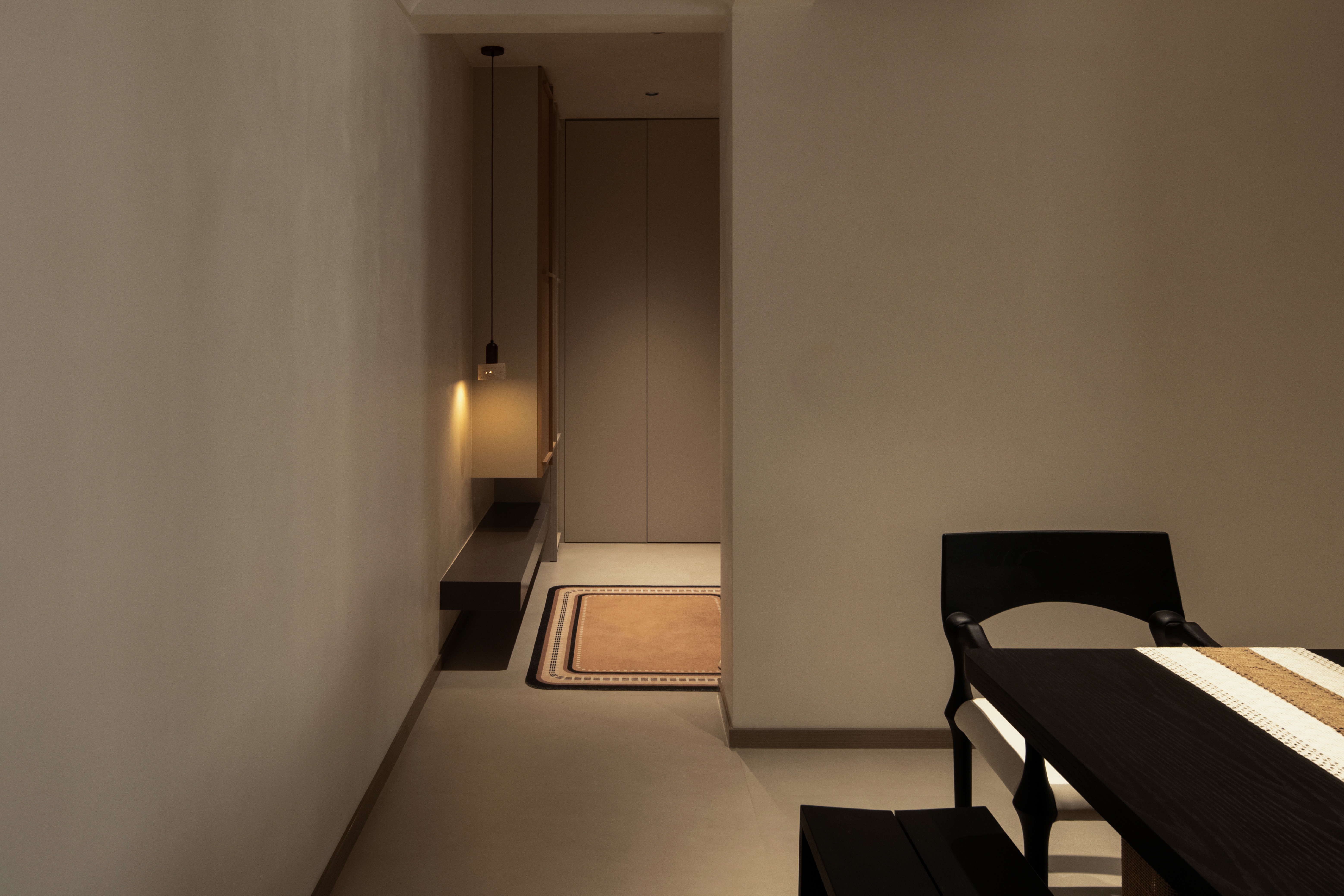 设计选材:温润的木质感与“月白”的柔暖形成材质互补,让空间更具整体感;搭配亚麻质地毯,增加脚感的舒适度。
