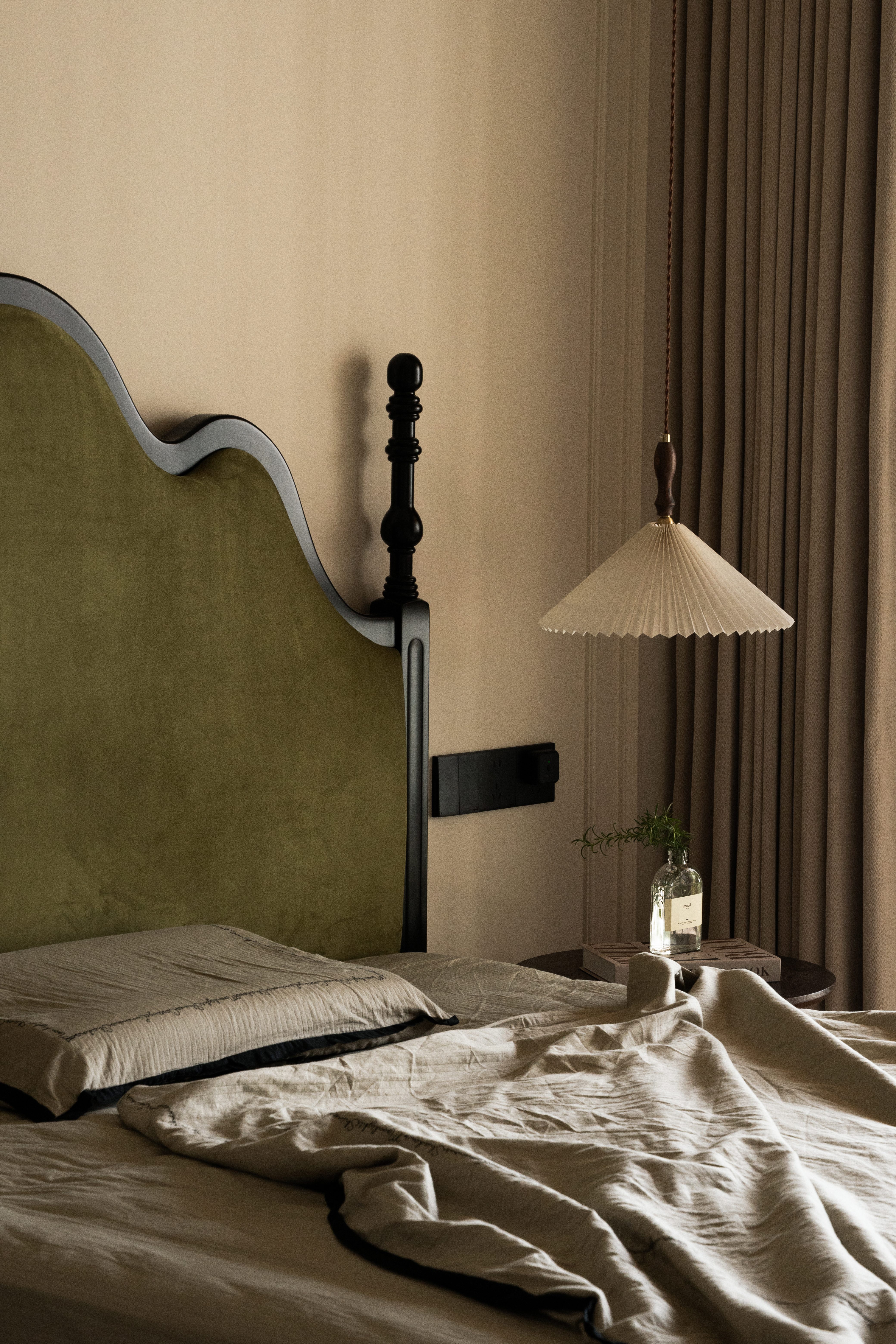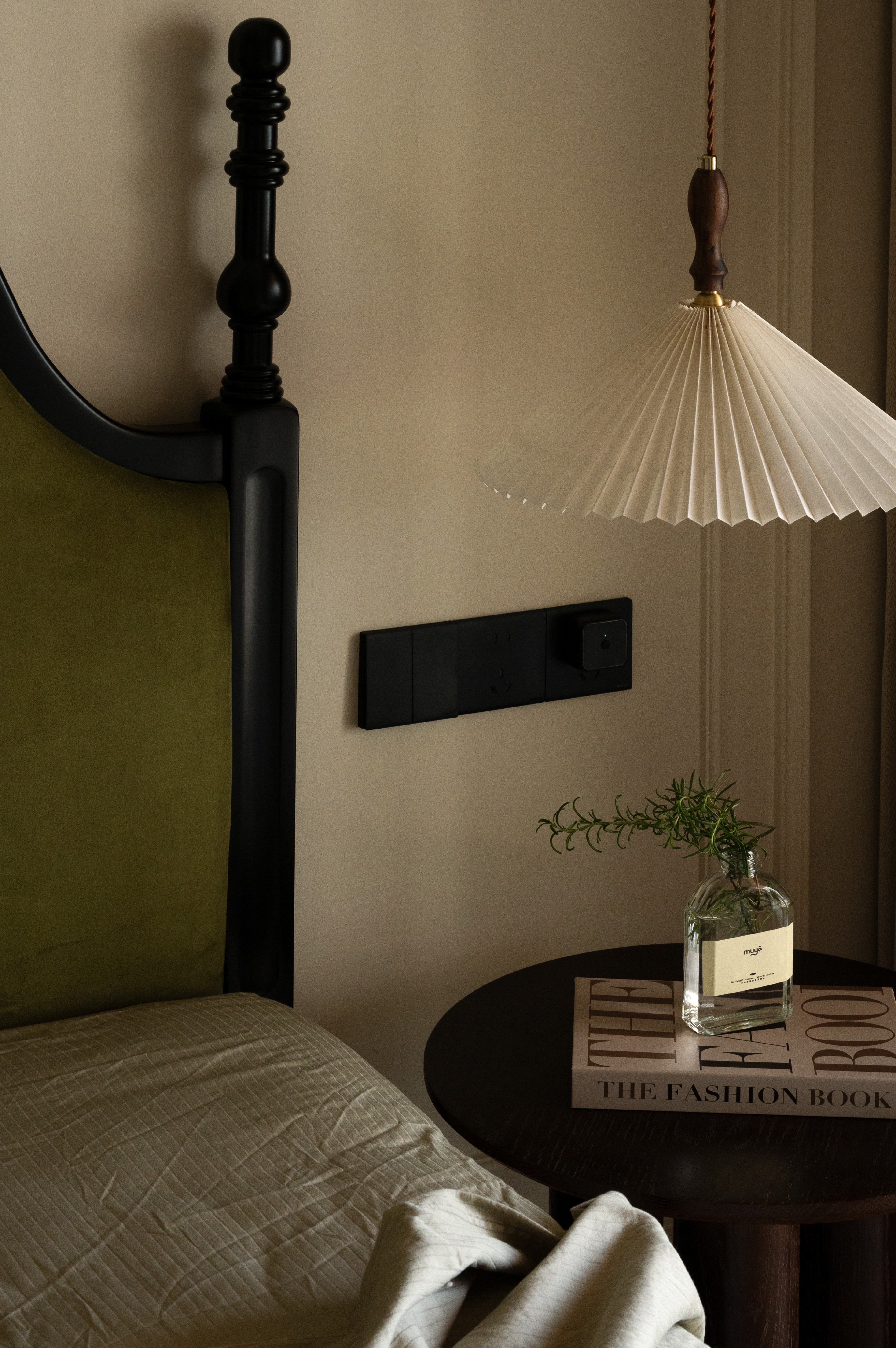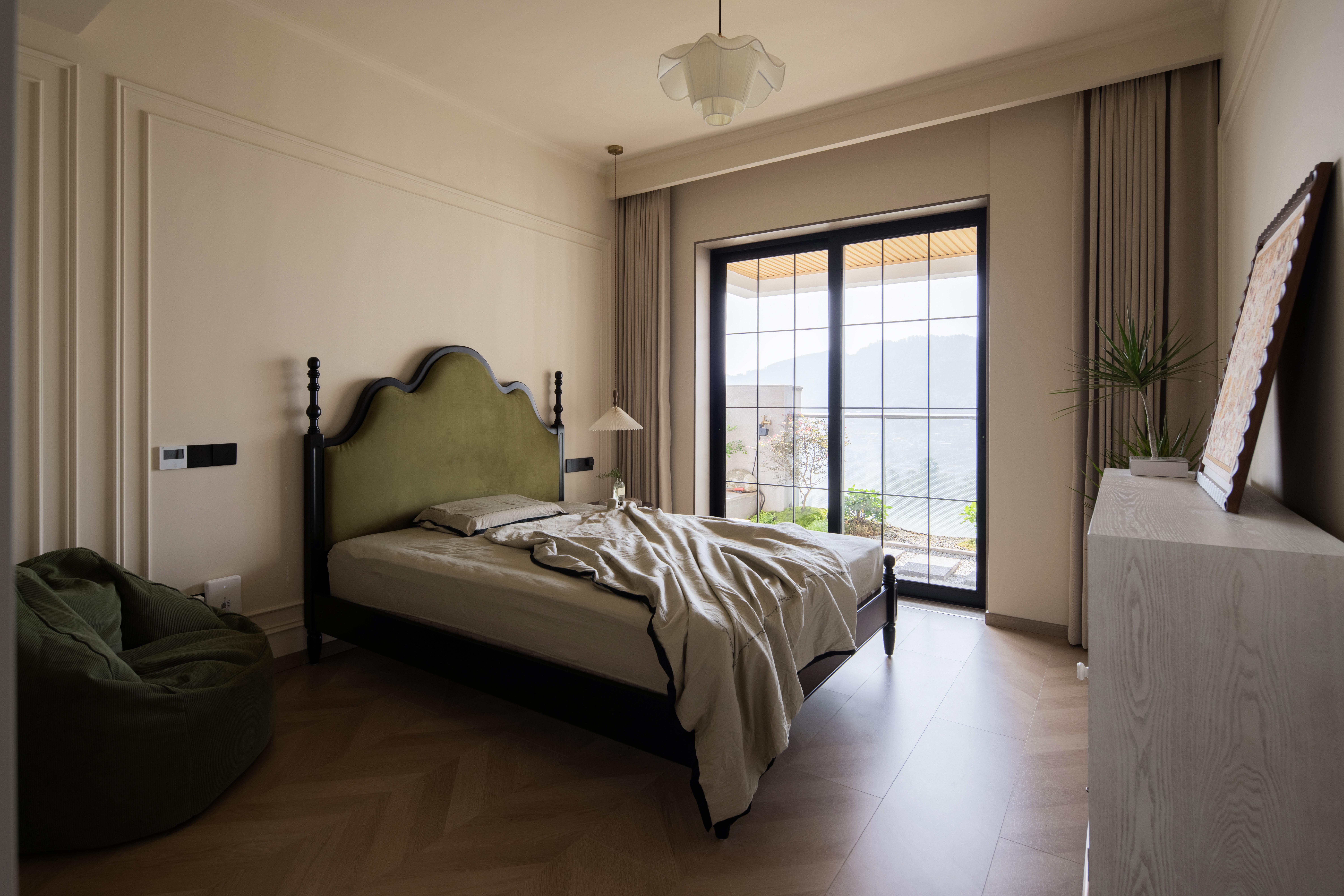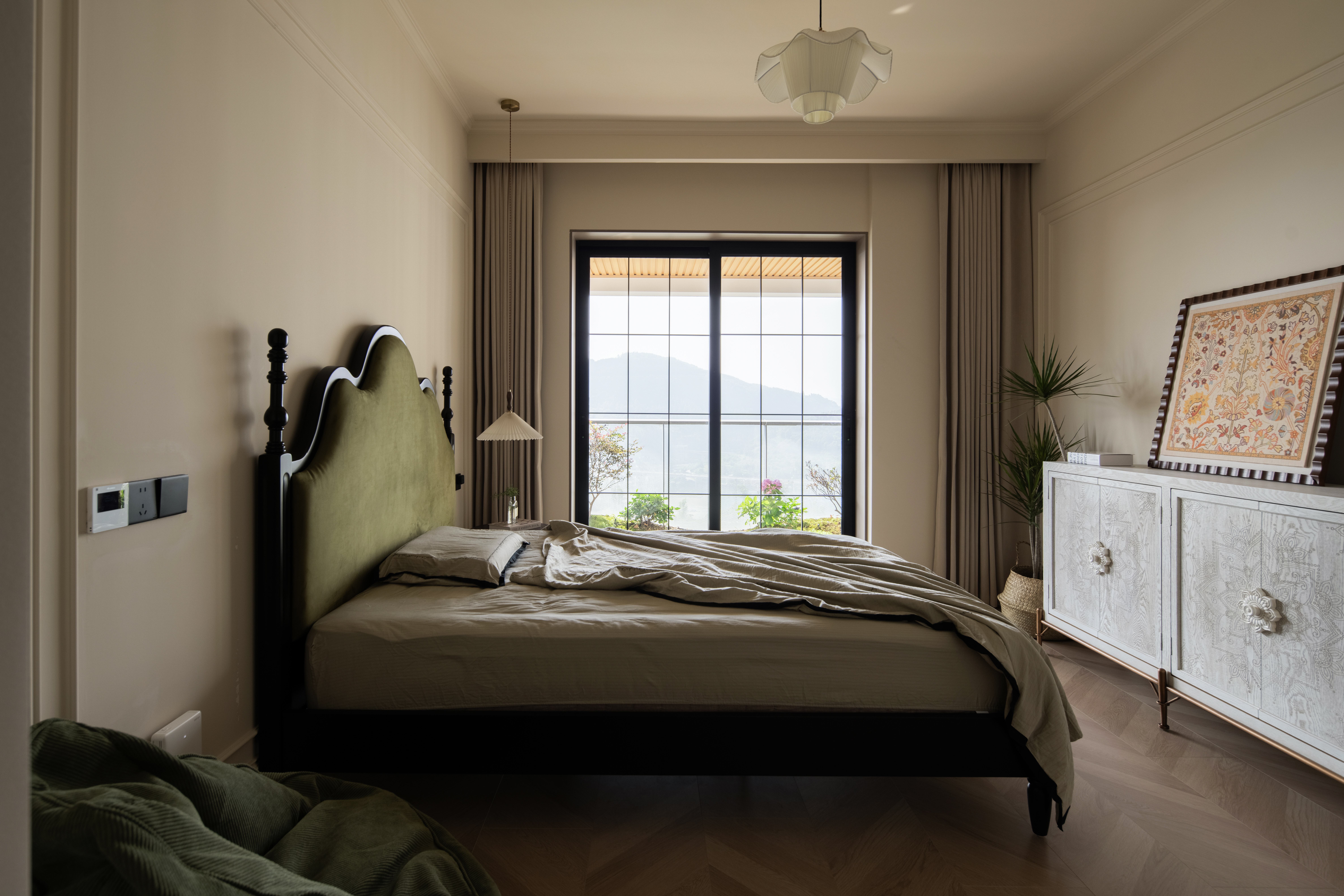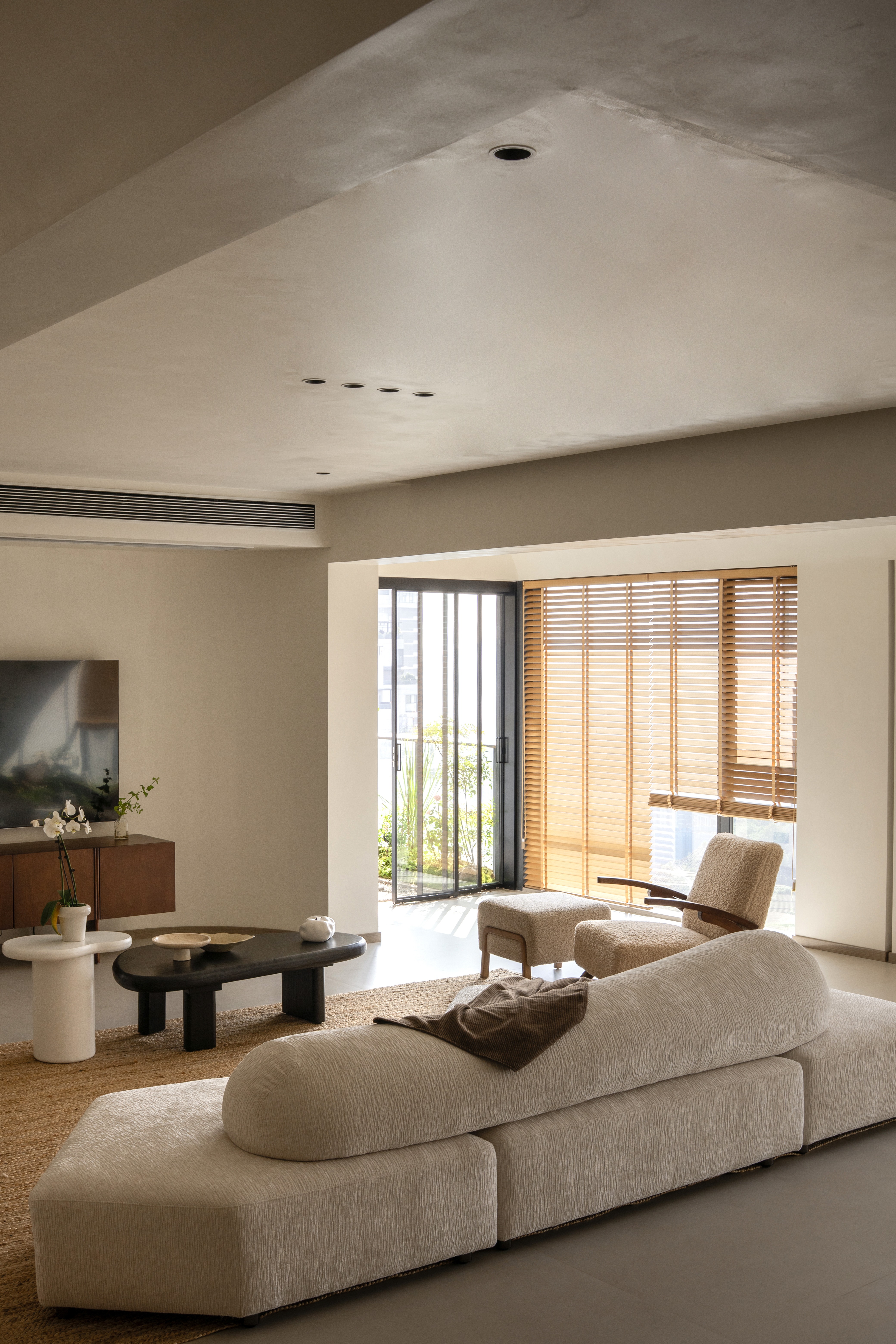 设计选材:温润的木质感与“月白”的柔暖形成材质互补,让空间更具整体感;搭配亚麻质地毯,增加脚感的舒适度。