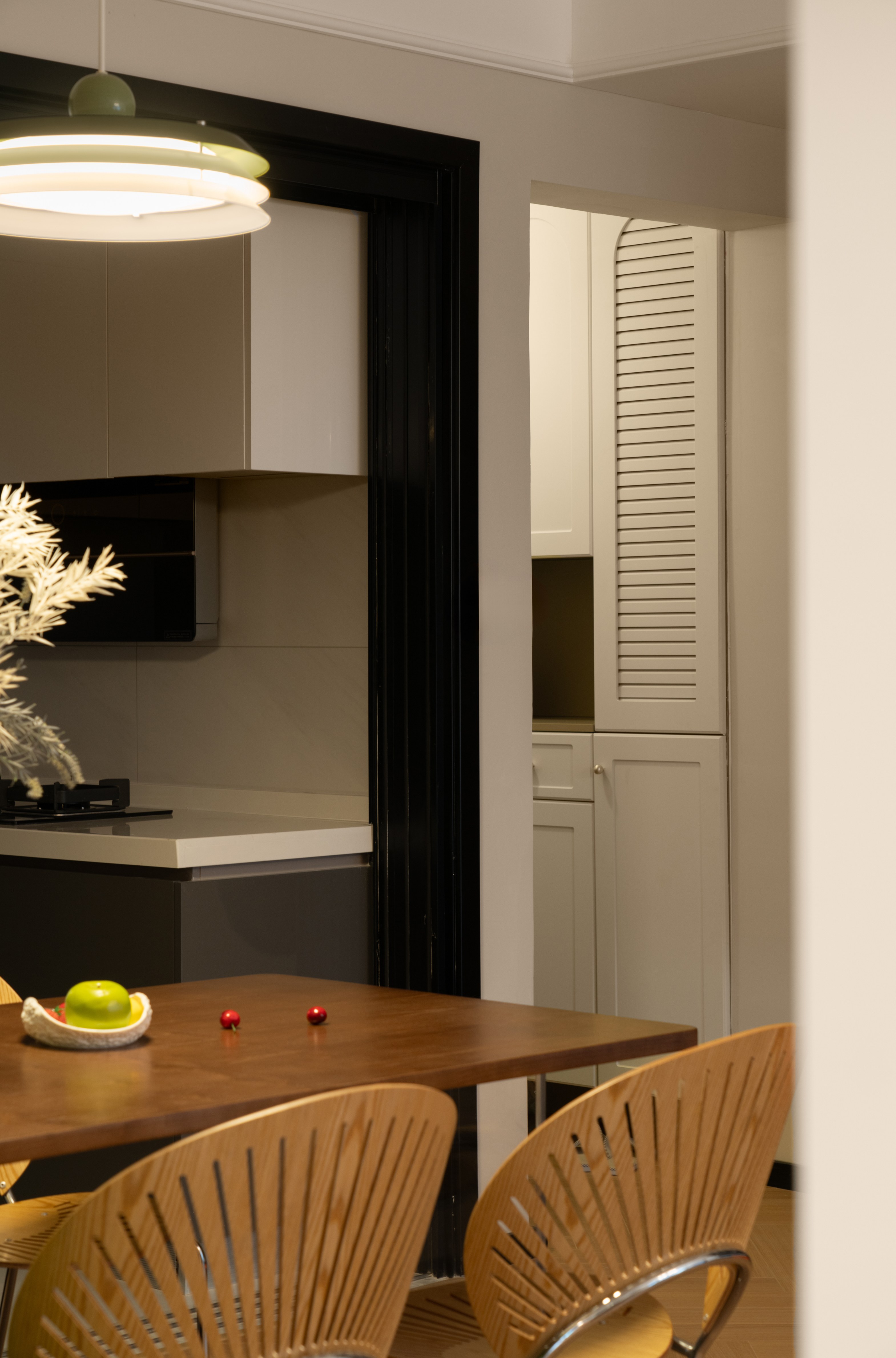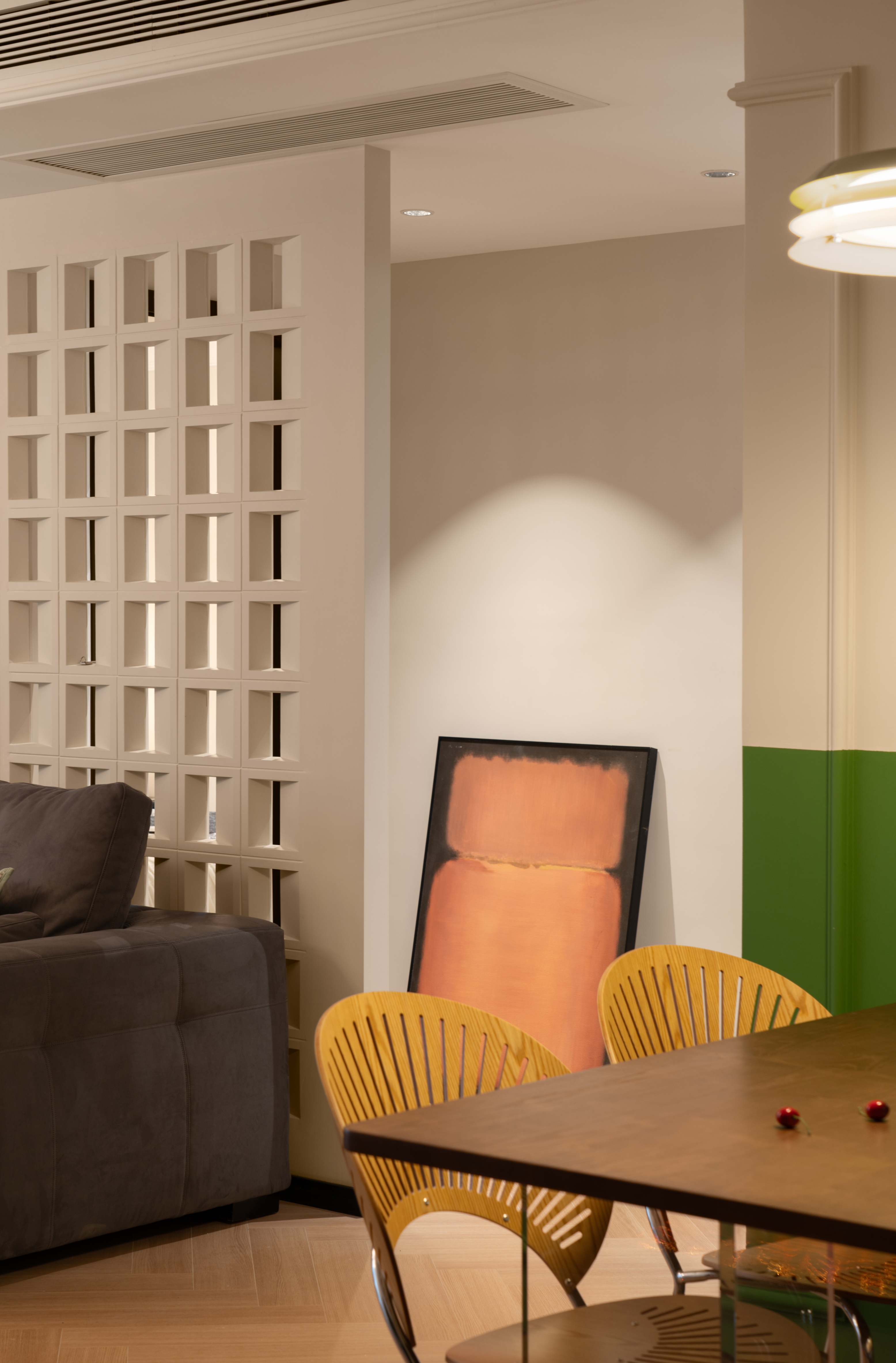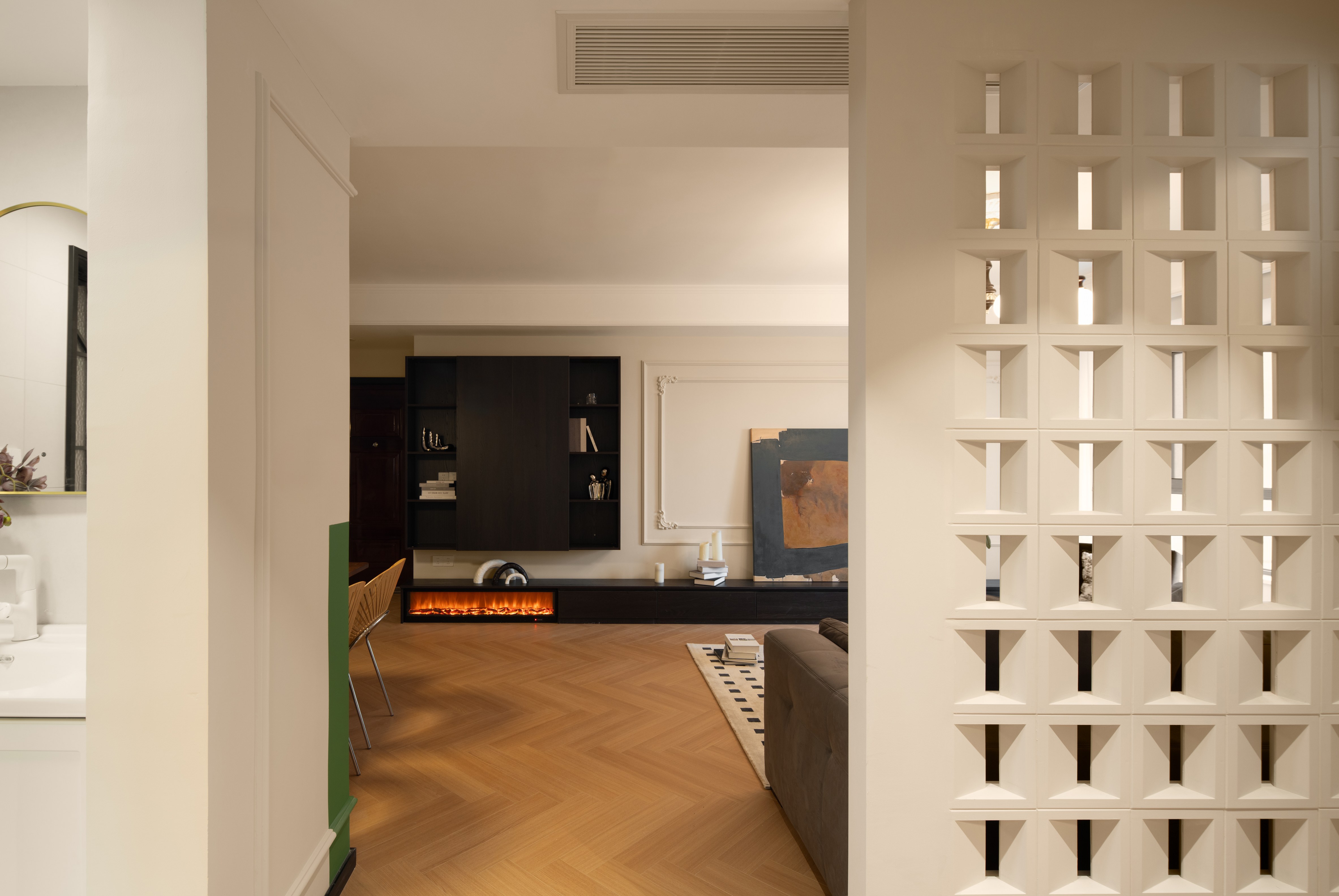 空间布局:将原有洗衣阳台和厨房融为一体,扩大厨房使用空间以及功能,让厨房光线更舒适,将厨房门做成3联动,让餐厅和厨房连通性更强,餐厅空间更大。将原有厨房往西移动,给门厅预留衣帽间增加门厅储物收纳。将沙发墙墙体拆除用PU镂空砖代替,让空间视野更开阔。