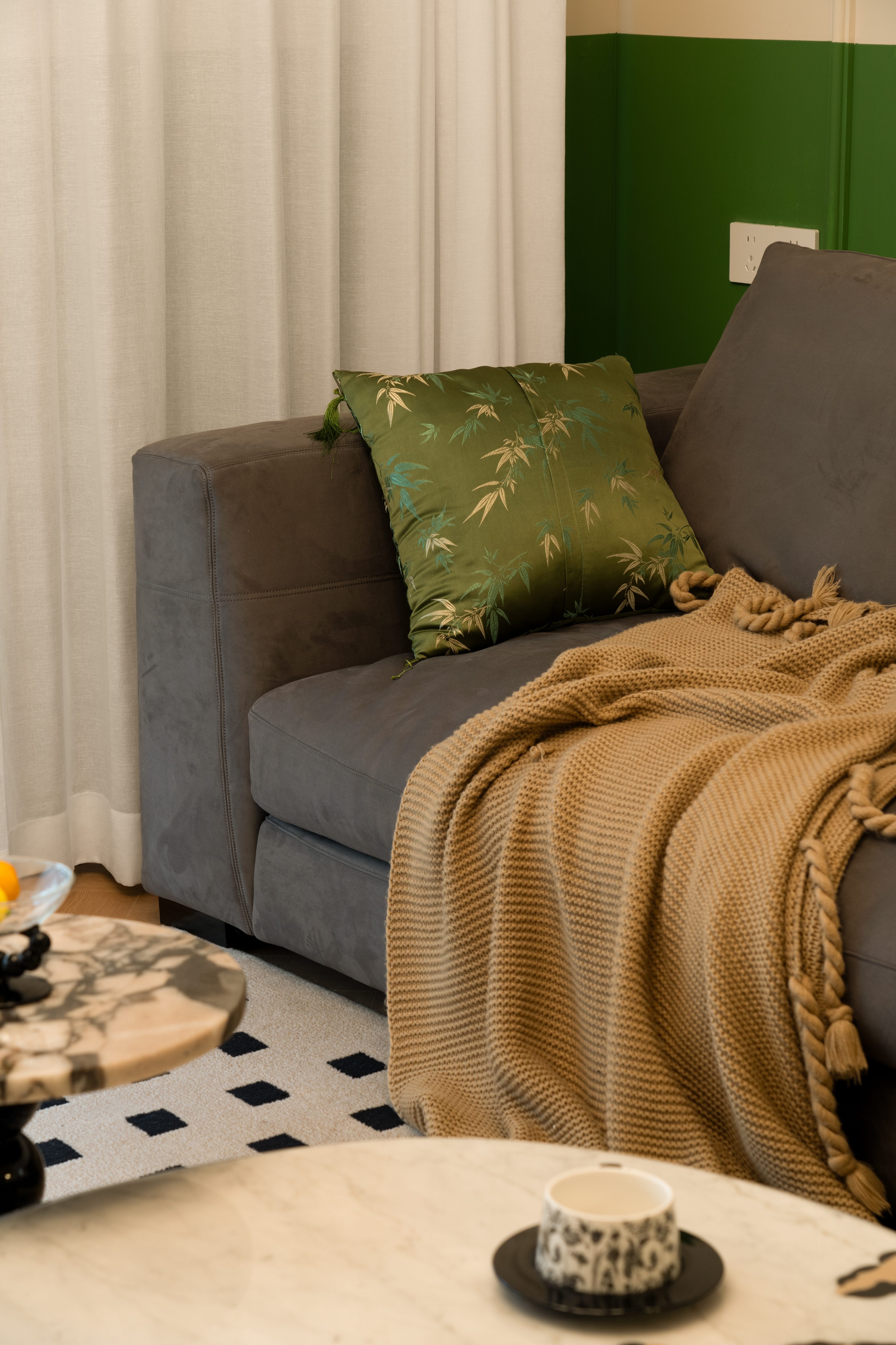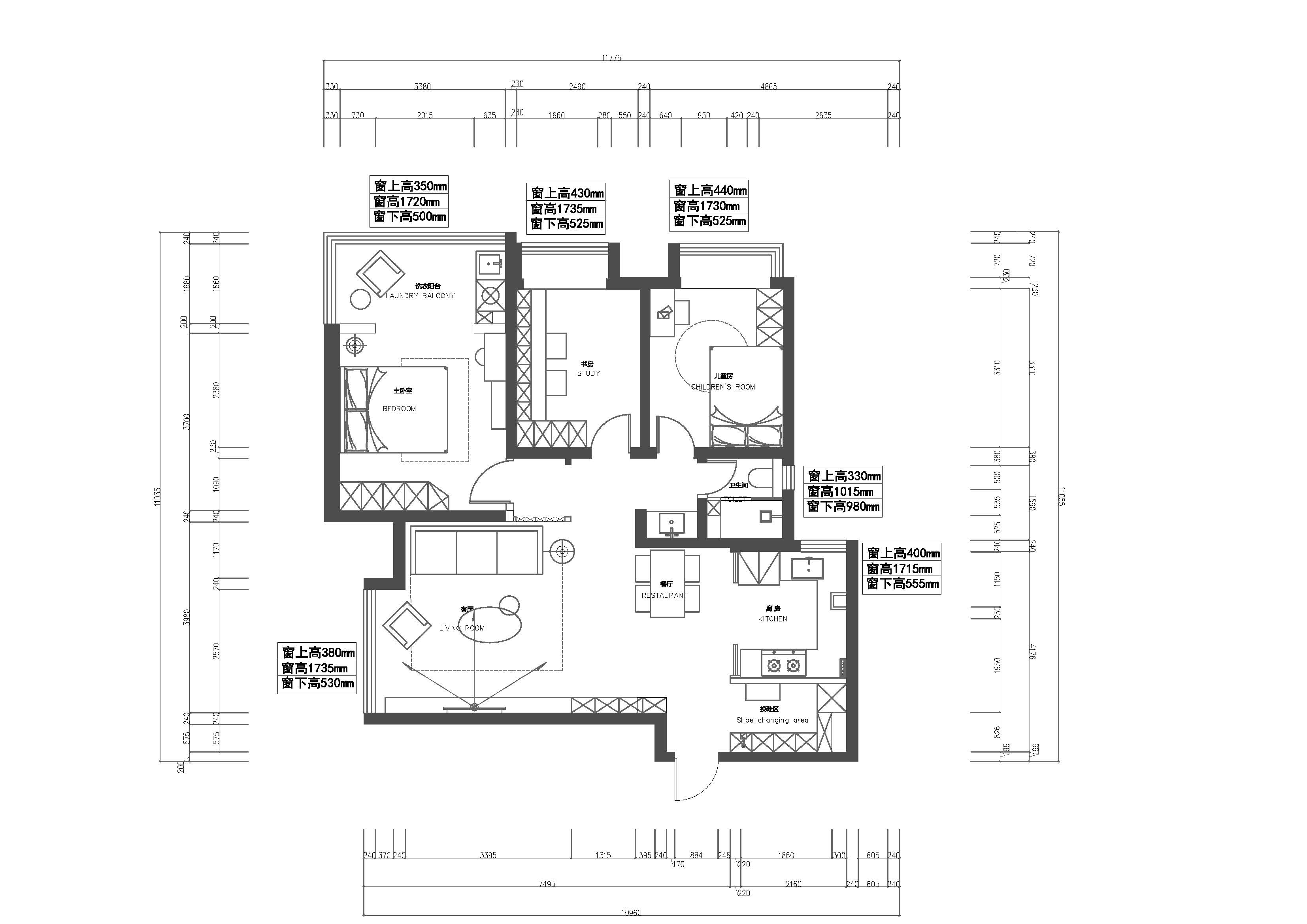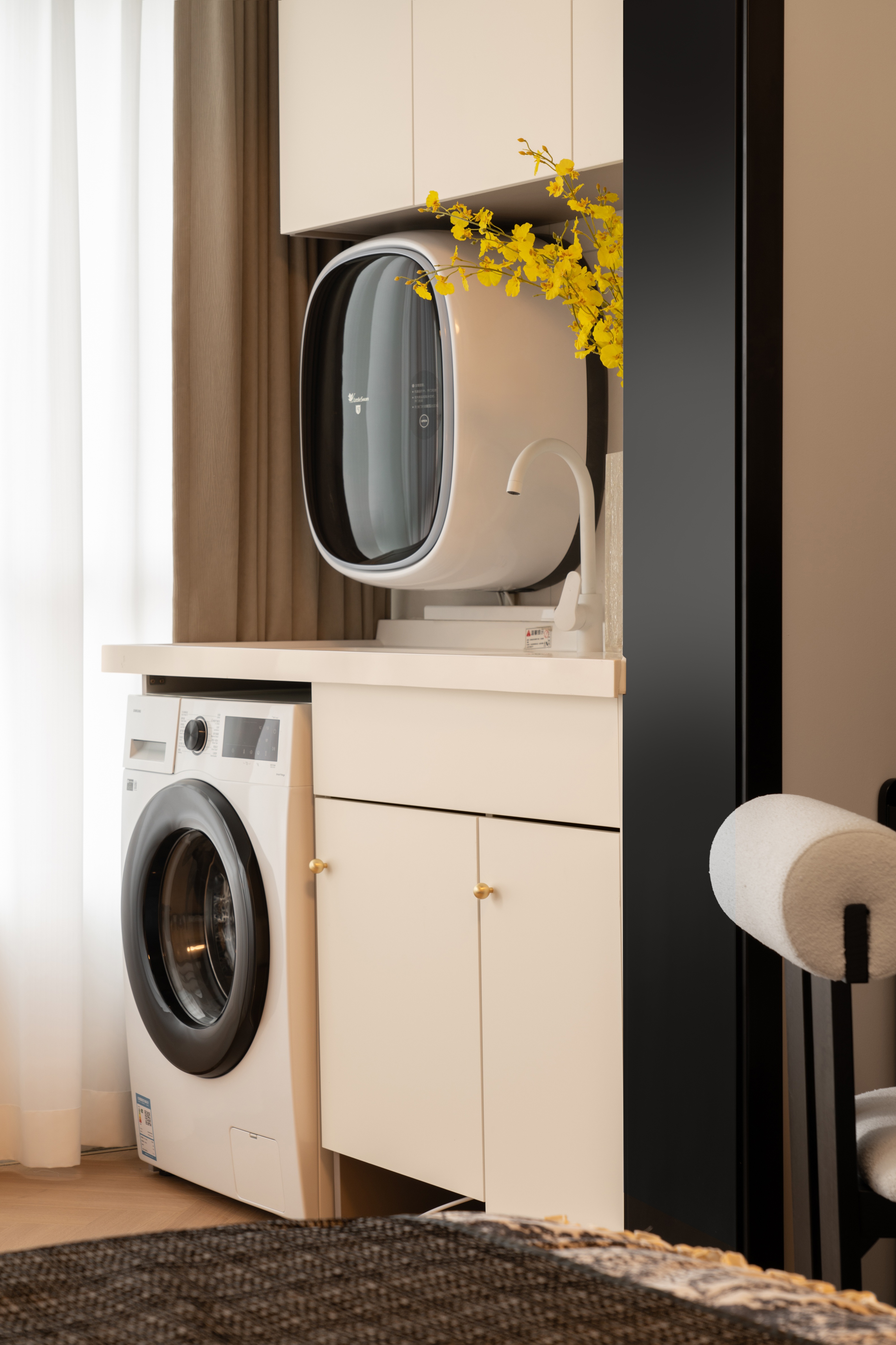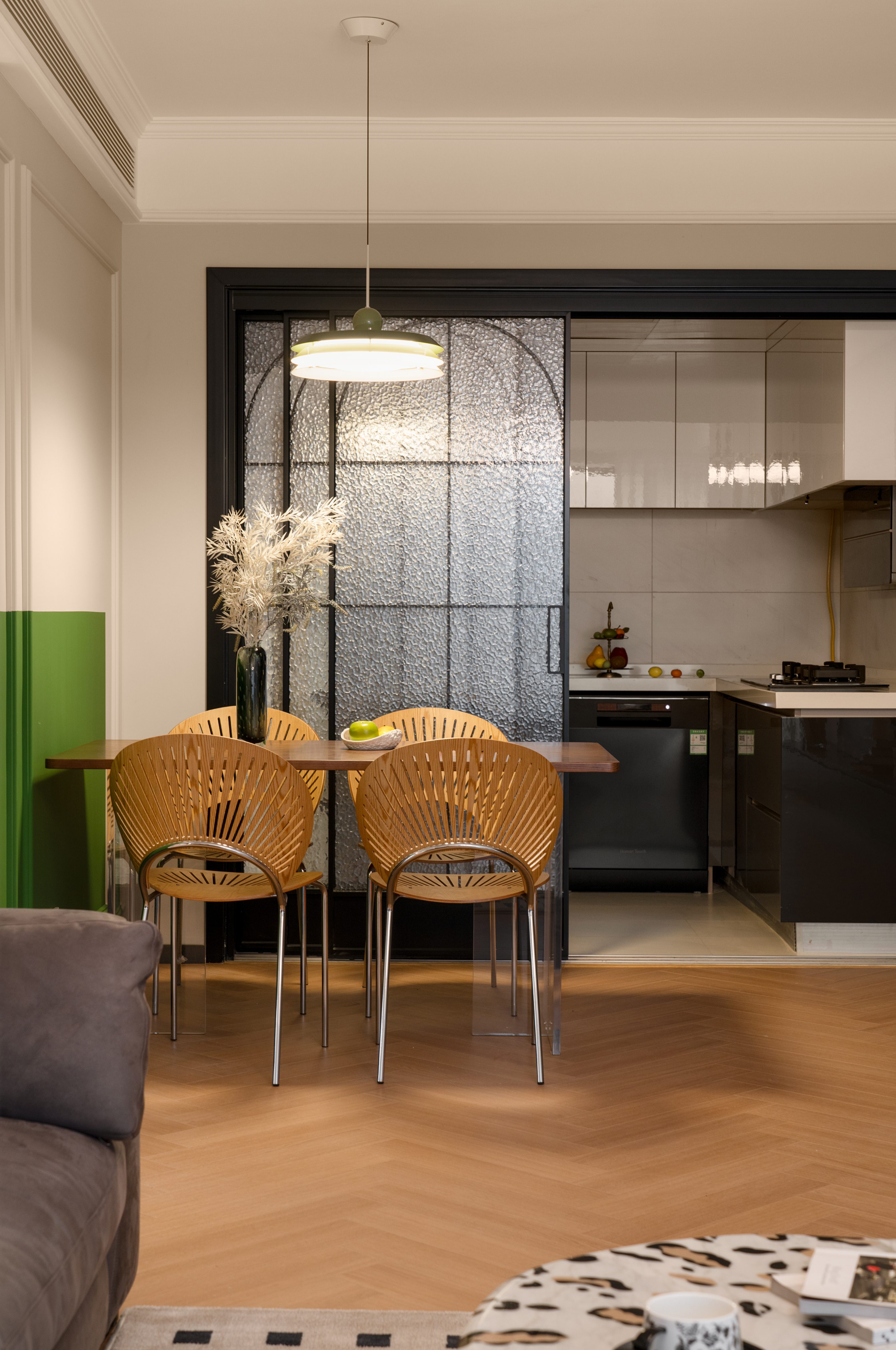 空间布局:将原有洗衣阳台和厨房融为一体,扩大厨房使用空间以及功能,让厨房光线更舒适,将厨房门做成3联动,让餐厅和厨房连通性更强,餐厅空间更大。将原有厨房往西移动,给门厅预留衣帽间增加门厅储物收纳。将沙发墙墙体拆除用PU镂空砖代替,让空间视野更开阔。