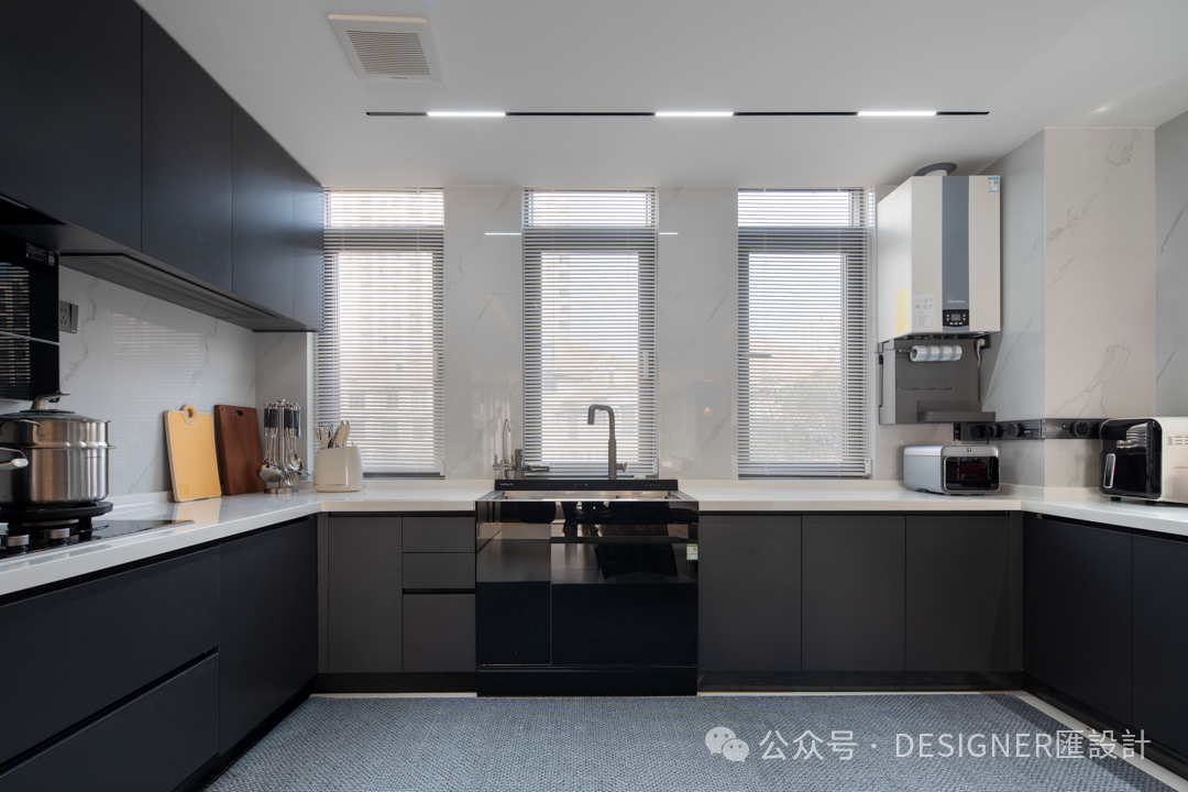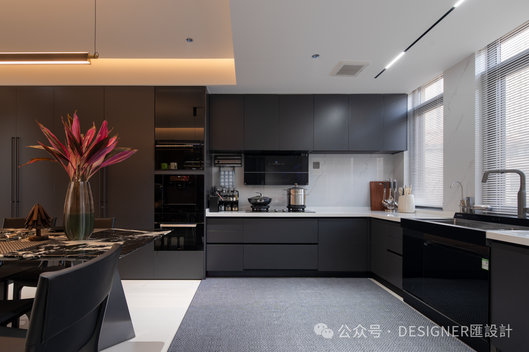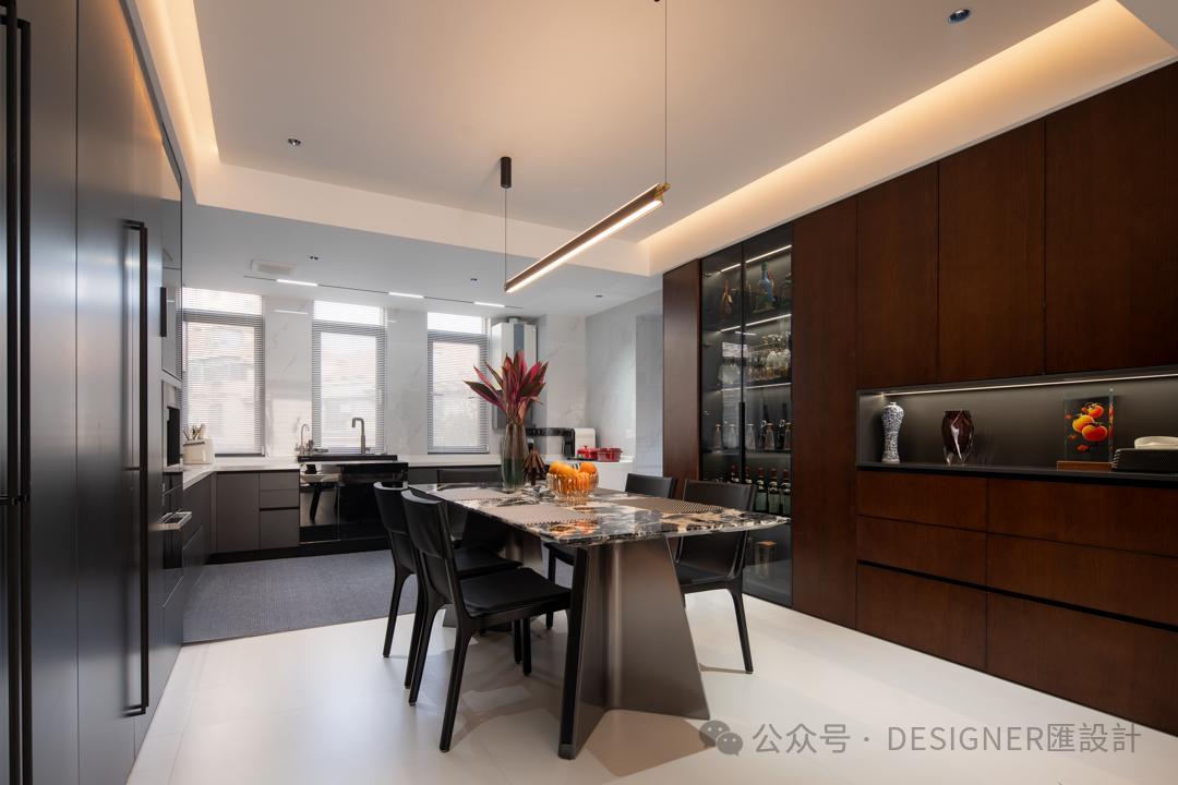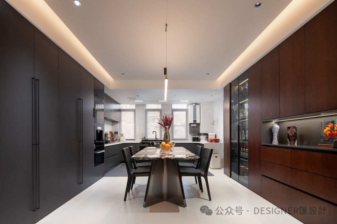 2.步入餐厨,便能发现设计师的许多小巧思。拆除原有厨房与餐厅之间的墙体,原本相对独立的空间豁然贯通,空间也更加通透。深棕与雅黑的柜体,沉稳大气,搭配简洁流畅的线条以及螺旋把手,尽显现代质感。