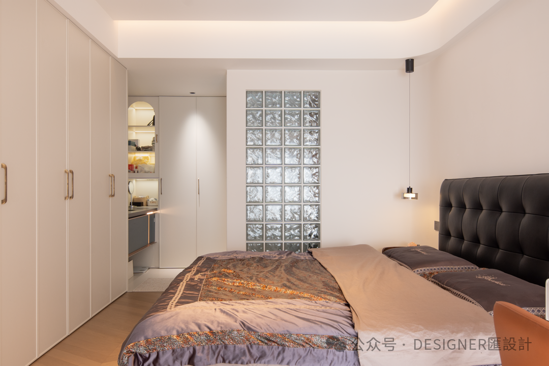 3.区别于全屋整体基调,女儿房则独树一帜,满溢着粉嫩软糯的甜美氛围。设计师深入洞悉女儿的喜好与习惯,精心雕琢,为她量身定制专属套房。原本女儿房的卫浴间是暗卫,光线昏暗。设计师巧妙运用玻璃砖这一创意元素,成功将自然光线引入,让原本阴暗的卫浴间瞬间变得通透明亮,不仅提升了使用的舒适度,还增添了空间的独特美感。 -