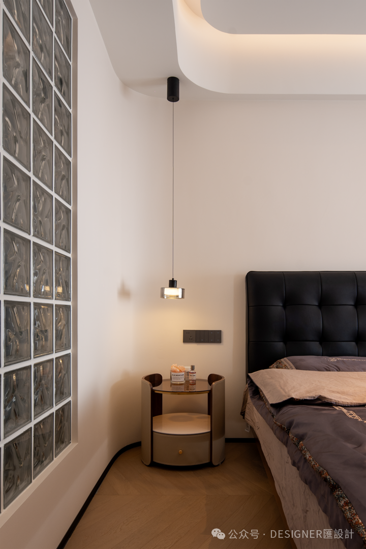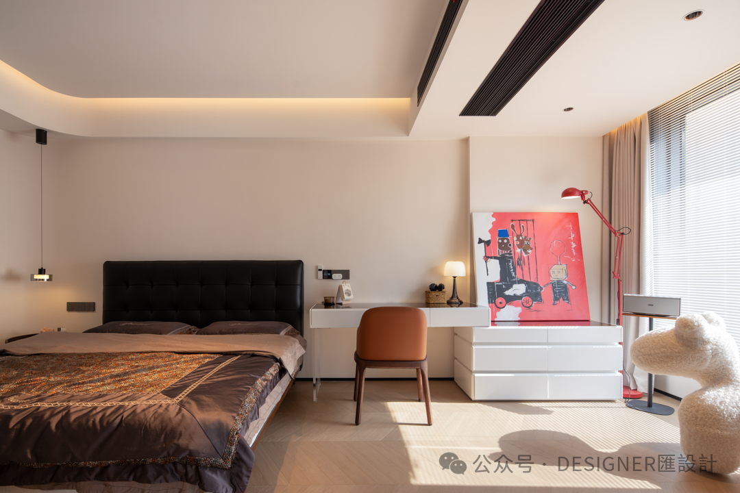 2.主卧之中,设计师以细腻巧思为业主定制诸多专属贴心设计。例如抽烟时可快速净化空气的设备,室内清新常伴;床头安置直饮机,随时畅饮无需起身;柔和小夜灯,照亮夜间每一步;投影仪则轻松打造私人观影空间,惬意生活于此尽显。