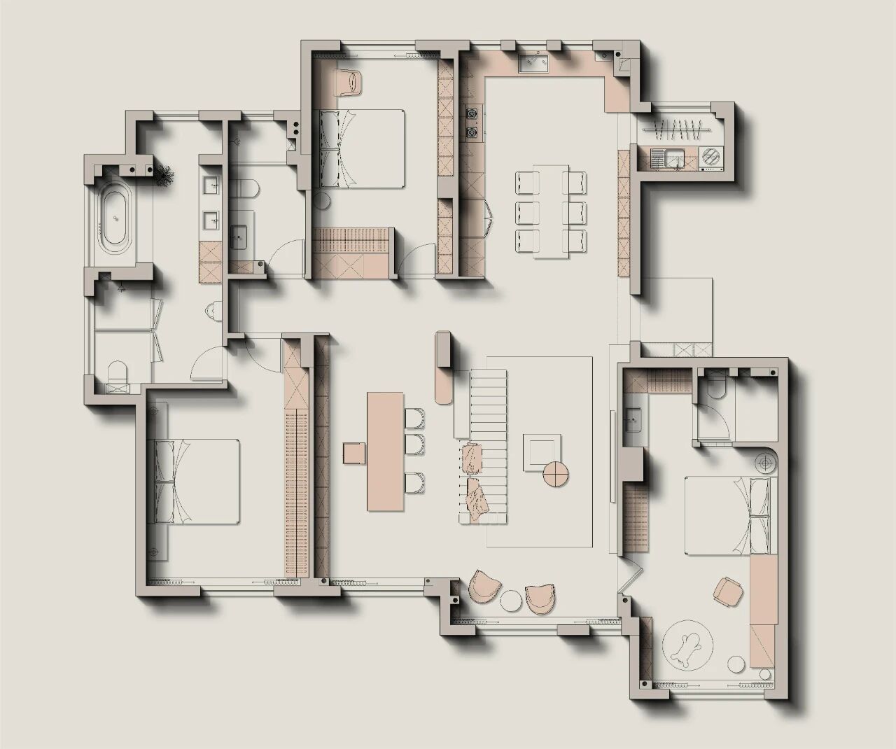 空间布局:1.设计师将原有一间次卧改成茶室,瞬间拓宽空间纵深感。客厅、阳台、餐厅与厨房巧妙融合,一体化设计将空间的束缚全然打破,视线毫无阻碍地穿梭其中,尽显大气与从容。