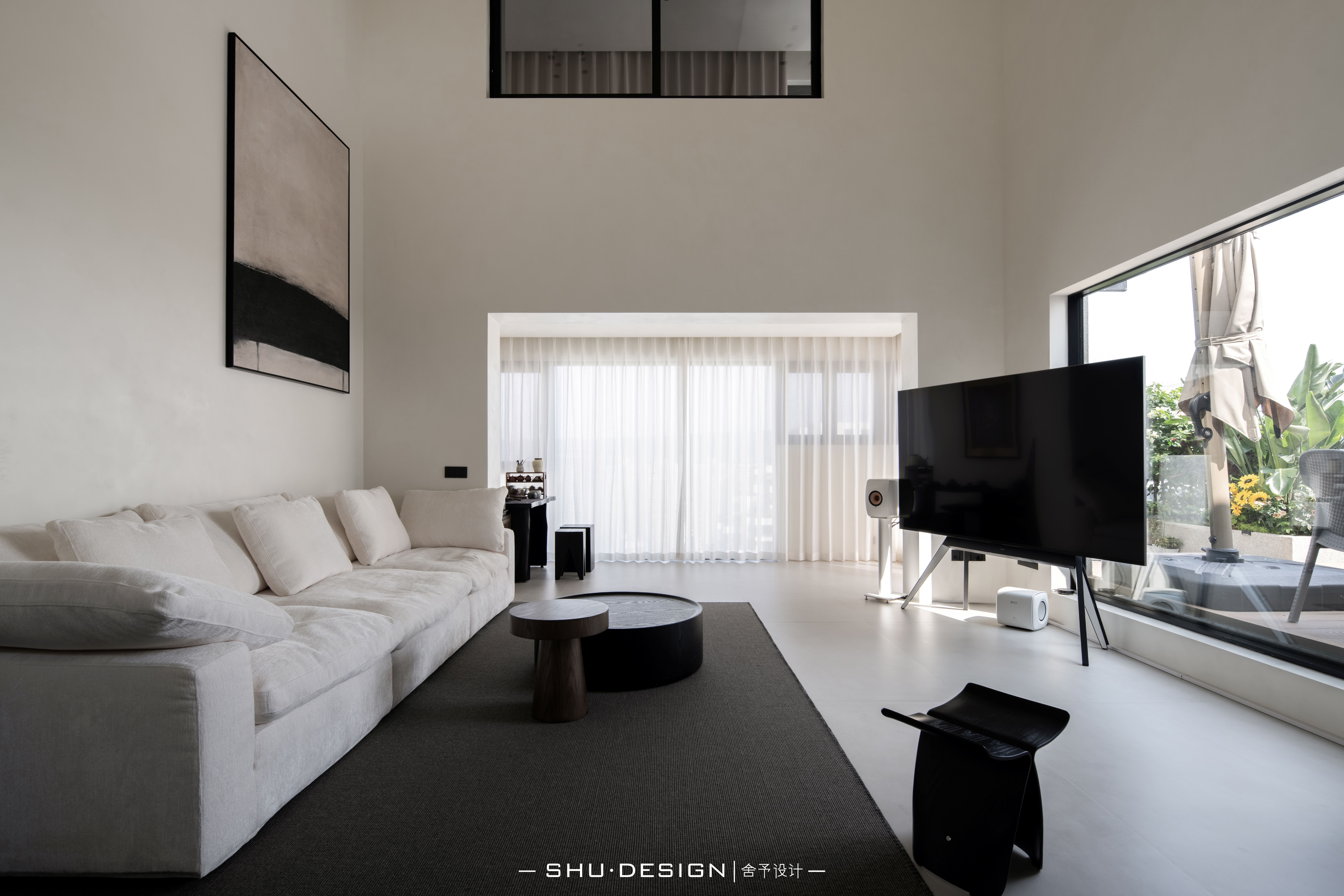 空间意境:以挑高格局与大面积落地窗营造通透感,搭配低饱和度的软质沙发与简约茶台,开放式布局打破空间边界,线性布局弱化装饰性元素,简约休闲椅搭配绿植造景。