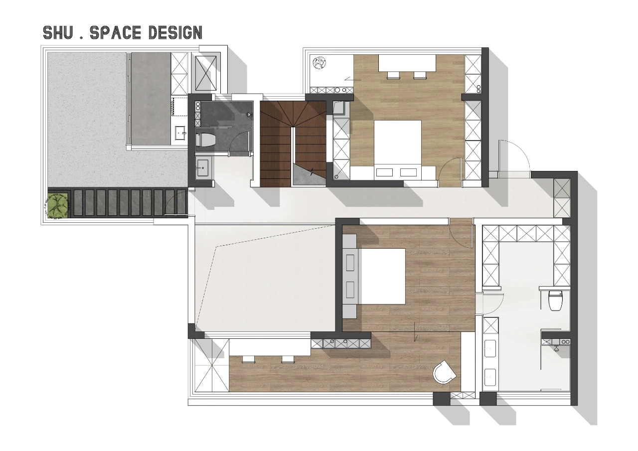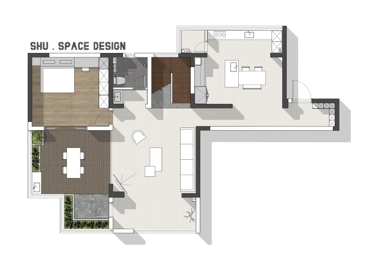 设计选材:客厅、餐厨区域选用哑光微水泥,质感细腻且色彩统一,弱化地面的视觉存在感;楼梯与卧室地面采用深色实木,温润的木纹为静谧空间增添自然肌理。局部以深色木饰面点缀,形成冷暖平衡。