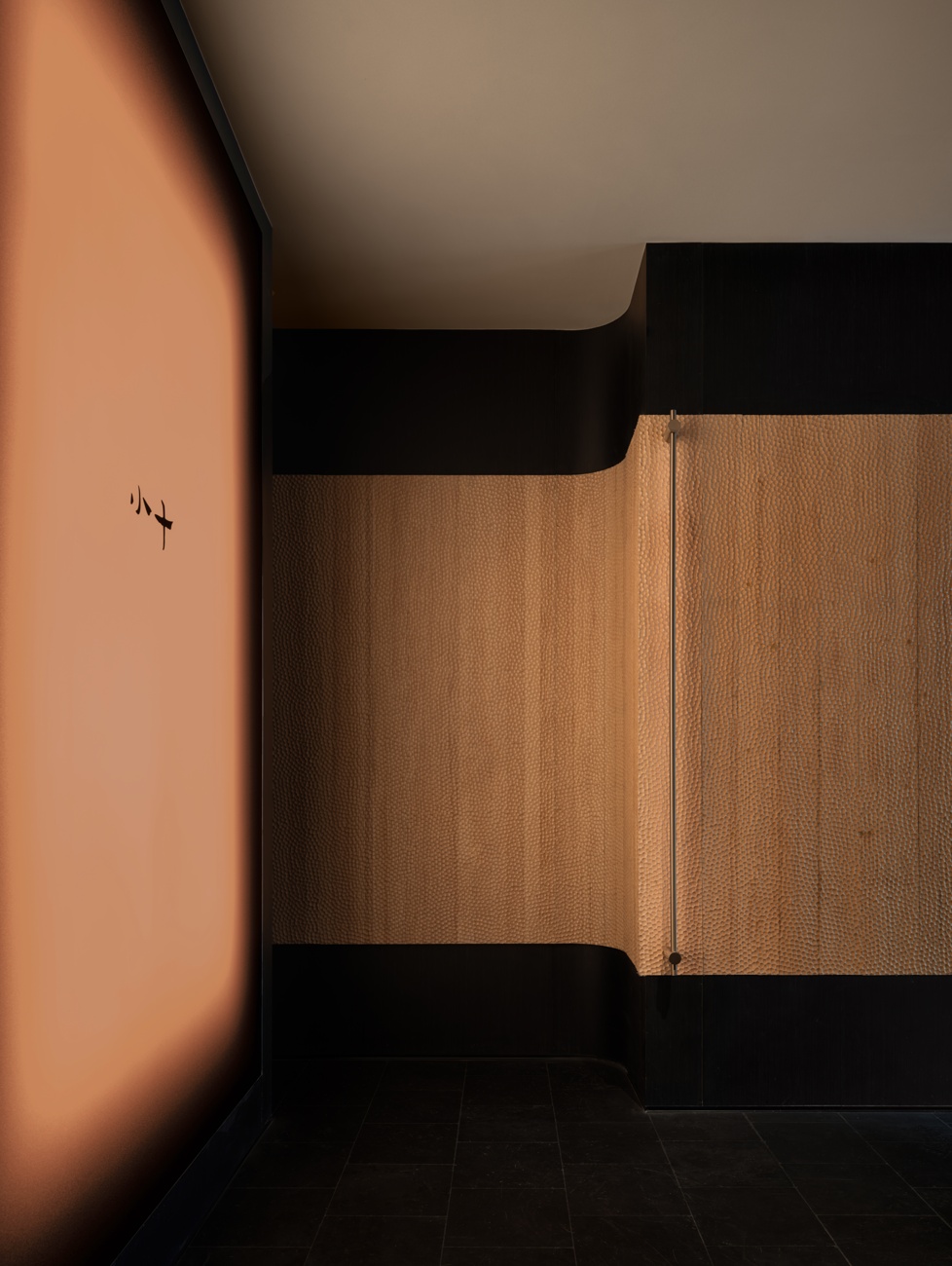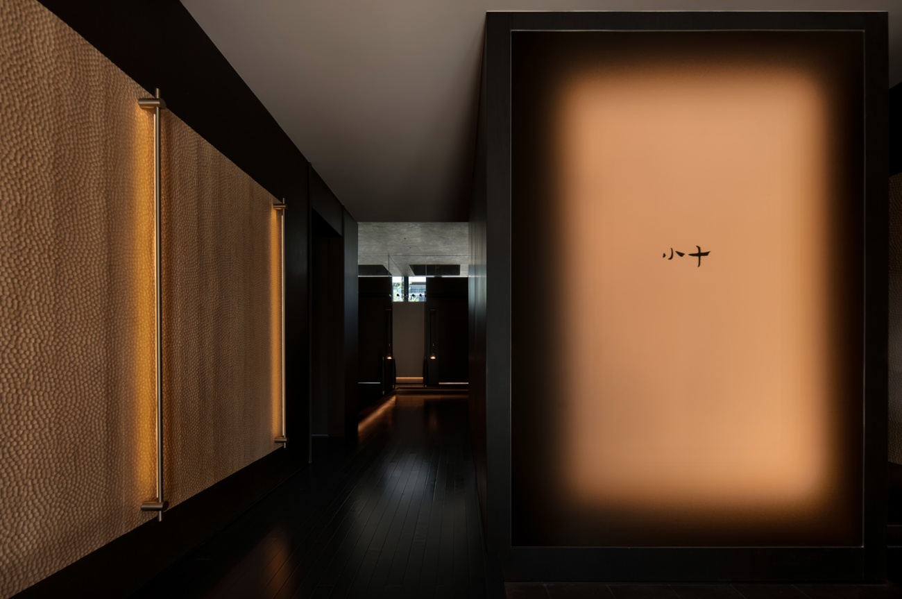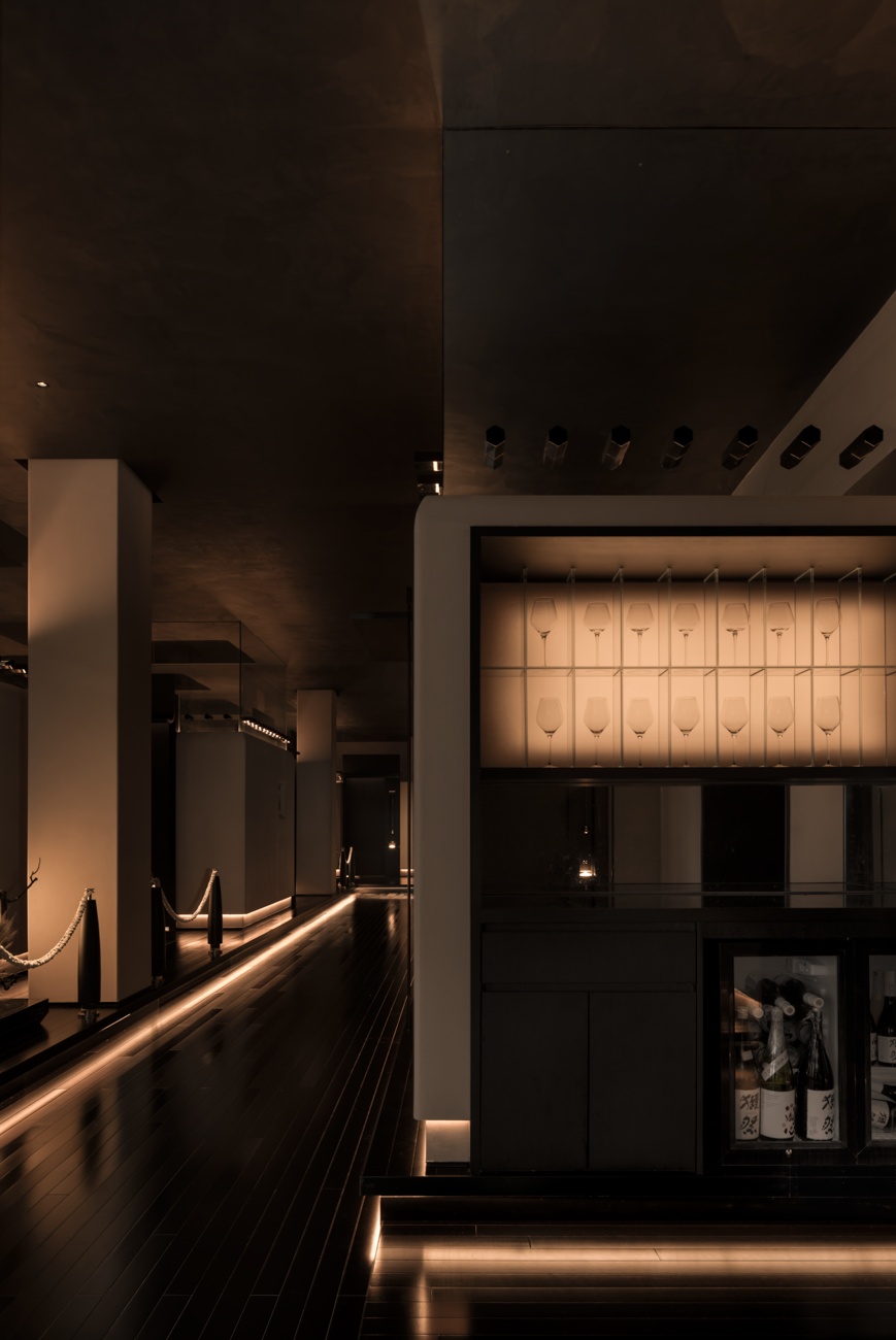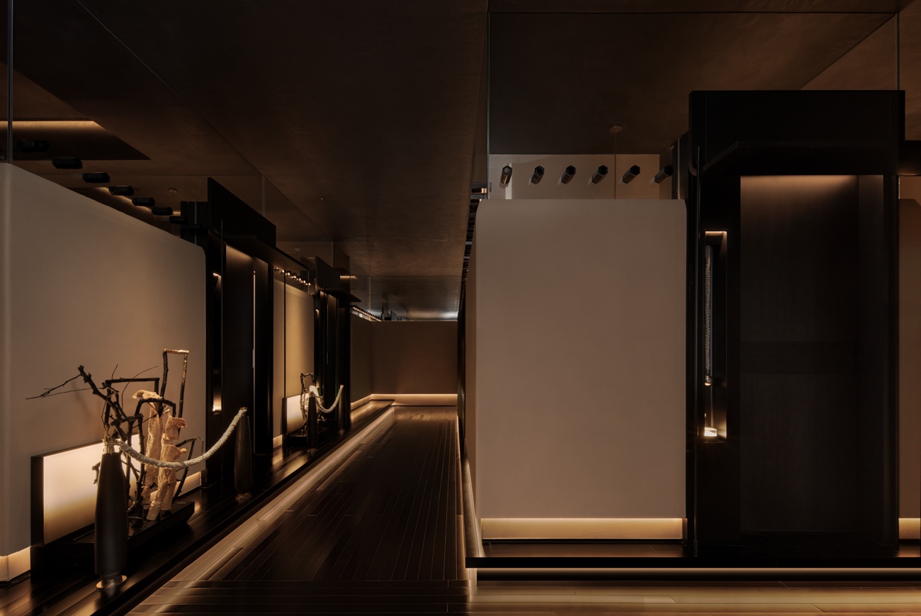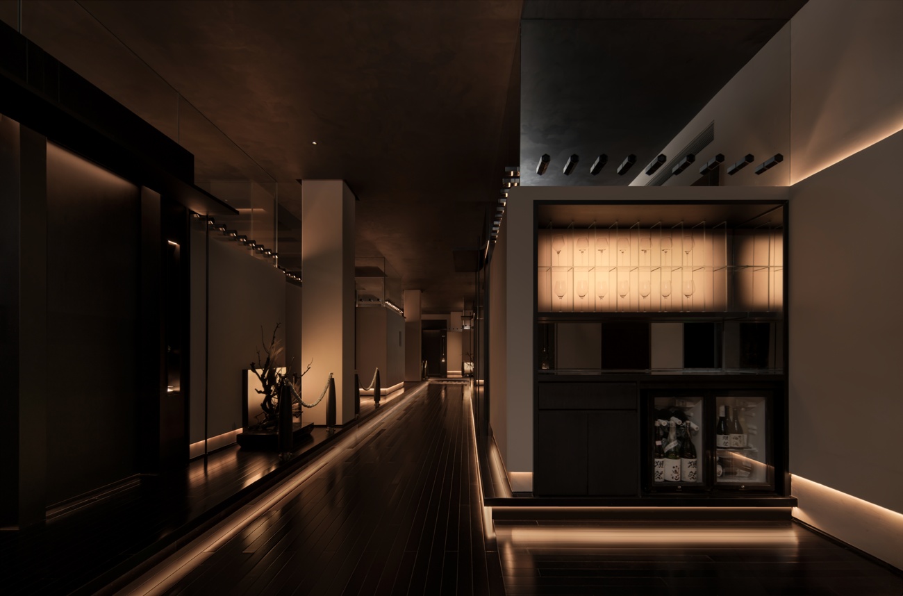 空间布局:入口长廊在波光粼粼,宛如夕照下金光跳跃出接待区,不同于以往的开放式日料空间设计,此项目希望呈现极致的私密属性,摒弃了公共用餐区,采用全包厢制设计。于是设计师将传统中式庭院民居的空间哲学引入布局,包厢不再仅仅是独立房间,而是演变为掩映在“游廊”与“庭院”意象中的静谧单元。客人循着游园般的路径深入,空间序列如徐徐展开的画轴,富有探索意趣的同时,营造出“庭院深深深几许”的东方含蓄韵味。厨房被设置于空间的核心区域,所有包厢围绕其外缘布局,形成最高效的辐射状服务动线。这不仅源于商业运营对效率的精算,更确保每一道餐食料理能以最新鲜的状态,第一时间呈于食客面前,无声提升着用餐的仪式感与价值感。