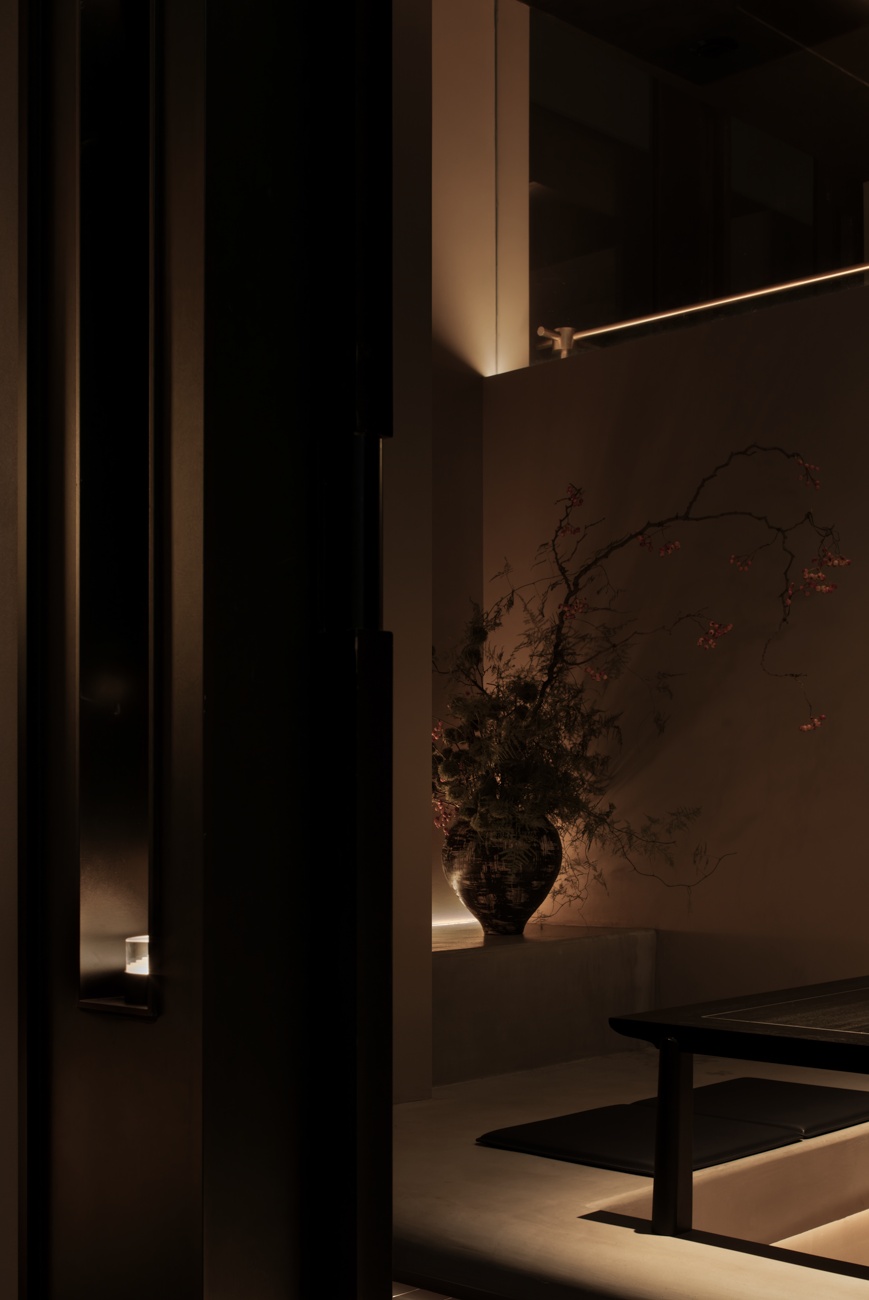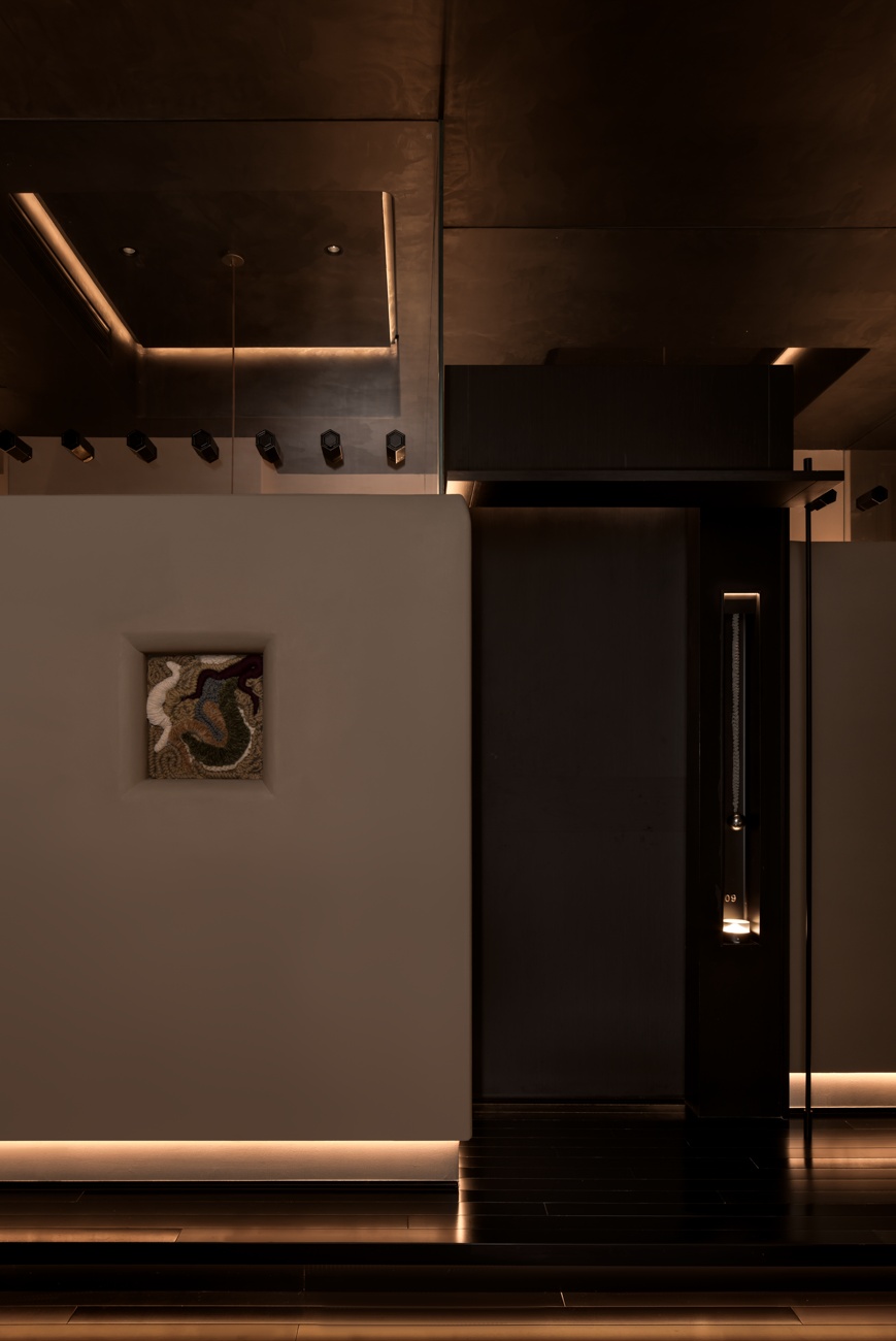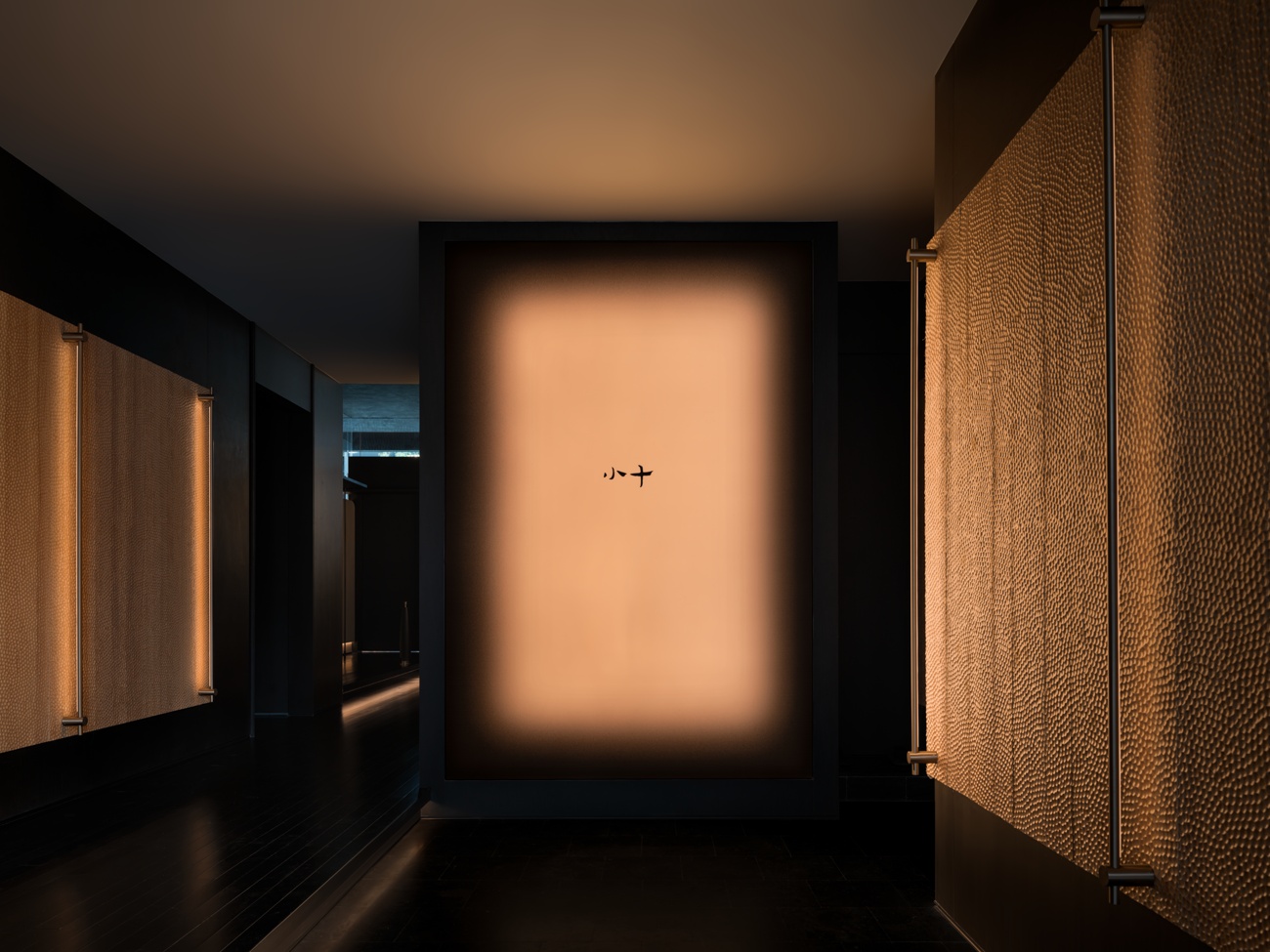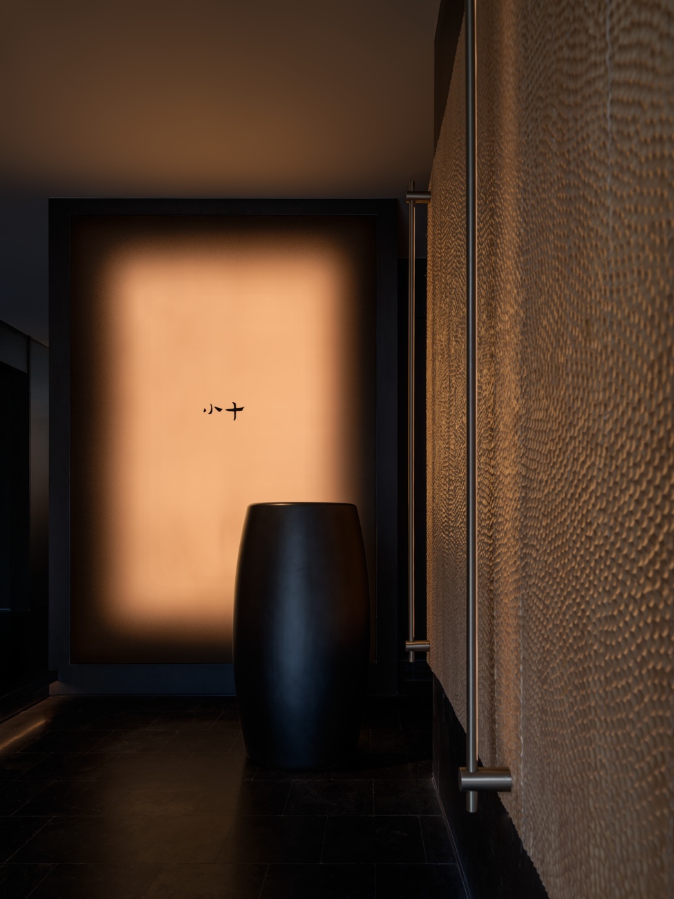 空间布局:入口长廊在波光粼粼,宛如夕照下金光跳跃出接待区,不同于以往的开放式日料空间设计,此项目希望呈现极致的私密属性,摒弃了公共用餐区,采用全包厢制设计。于是设计师将传统中式庭院民居的空间哲学引入布局,包厢不再仅仅是独立房间,而是演变为掩映在“游廊”与“庭院”意象中的静谧单元。客人循着游园般的路径深入,空间序列如徐徐展开的画轴,富有探索意趣的同时,营造出“庭院深深深几许”的东方含蓄韵味。厨房被设置于空间的核心区域,所有包厢围绕其外缘布局,形成最高效的辐射状服务动线。这不仅源于商业运营对效率的精算,更确保每一道餐食料理能以最新鲜的状态,第一时间呈于食客面前,无声提升着用餐的仪式感与价值感。
