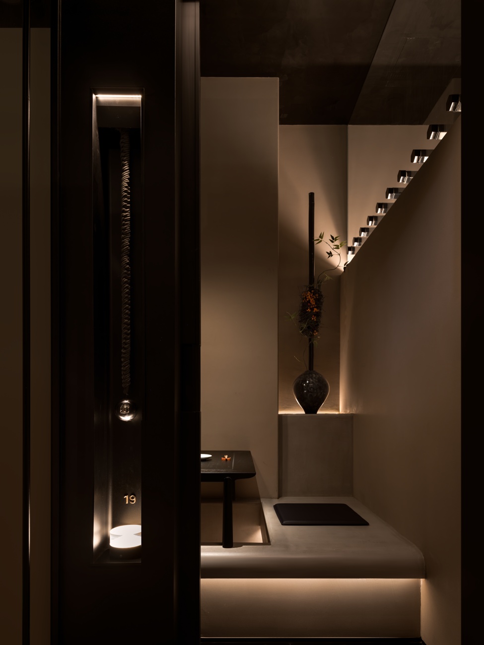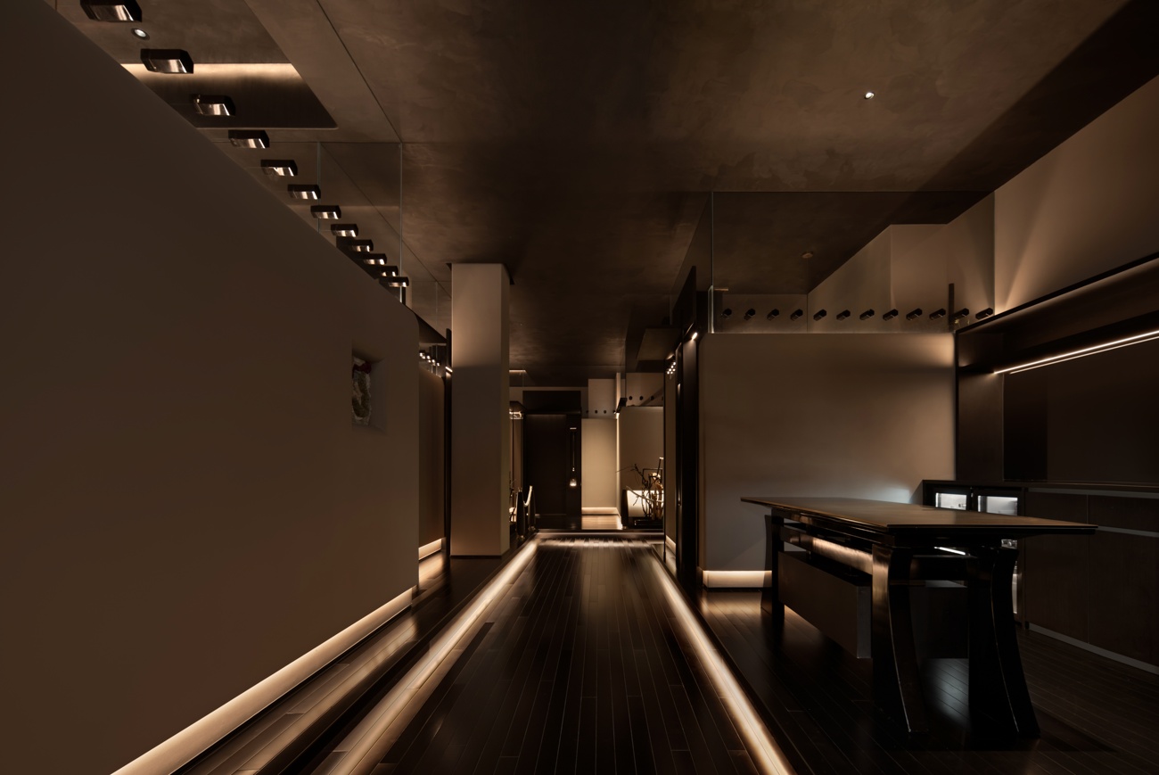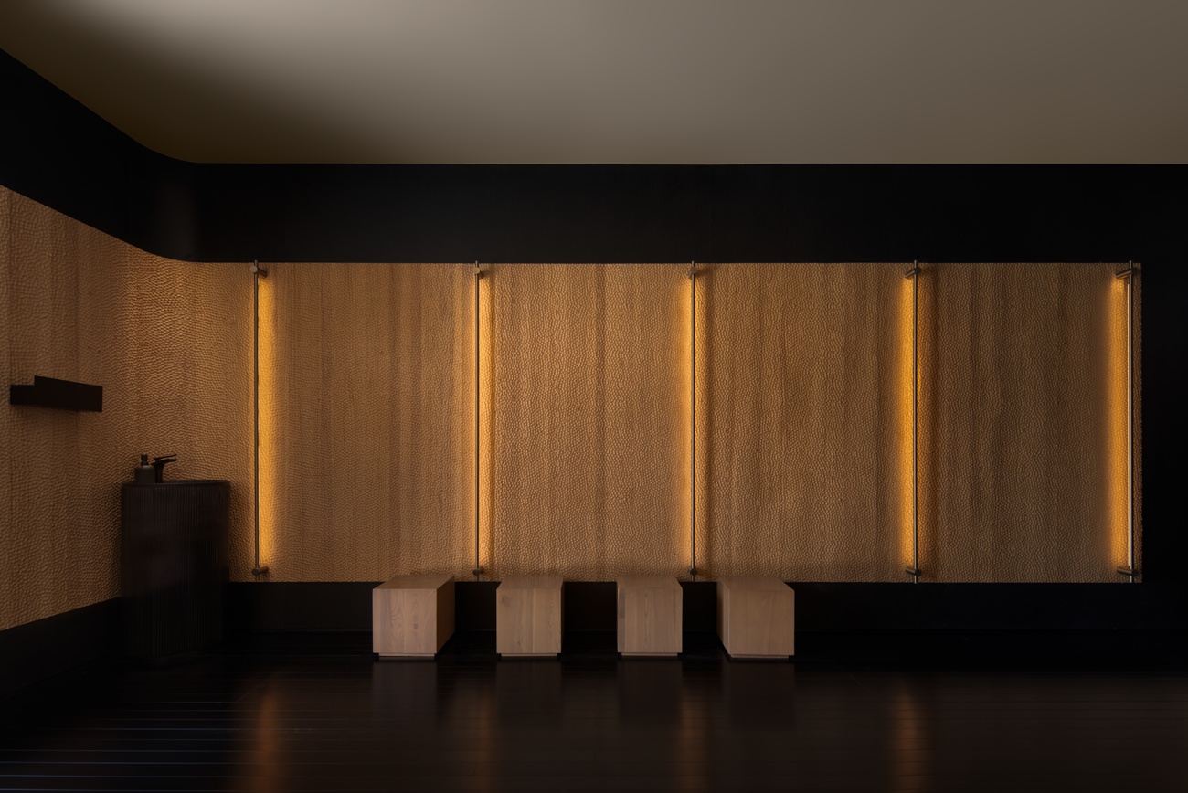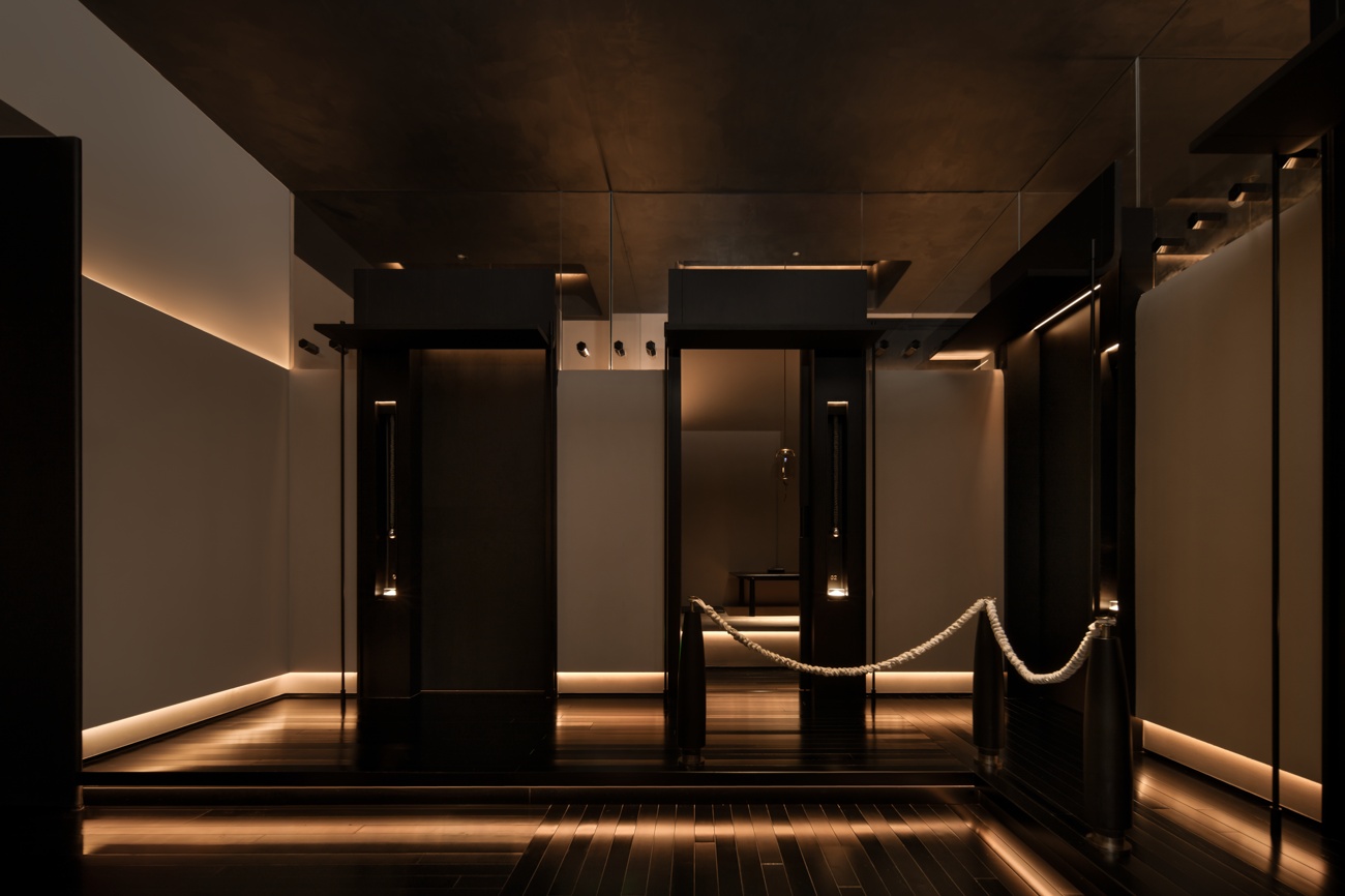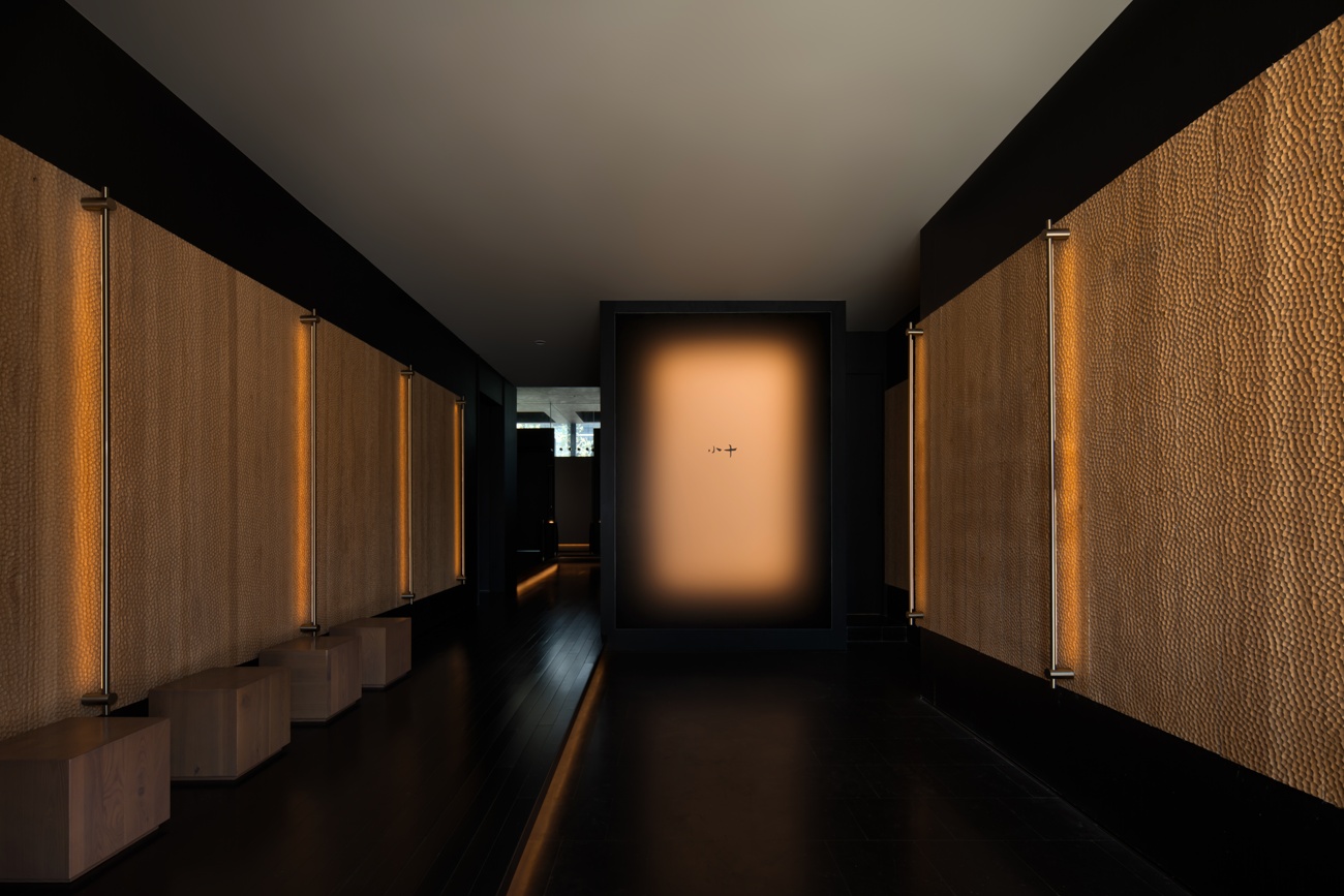 空间布局:入口长廊在波光粼粼,宛如夕照下金光跳跃出接待区,不同于以往的开放式日料空间设计,此项目希望呈现极致的私密属性,摒弃了公共用餐区,采用全包厢制设计。于是设计师将传统中式庭院民居的空间哲学引入布局,包厢不再仅仅是独立房间,而是演变为掩映在“游廊”与“庭院”意象中的静谧单元。客人循着游园般的路径深入,空间序列如徐徐展开的画轴,富有探索意趣的同时,营造出“庭院深深深几许”的东方含蓄韵味。厨房被设置于空间的核心区域,所有包厢围绕其外缘布局,形成最高效的辐射状服务动线。这不仅源于商业运营对效率的精算,更确保每一道餐食料理能以最新鲜的状态,第一时间呈于食客面前,无声提升着用餐的仪式感与价值感。