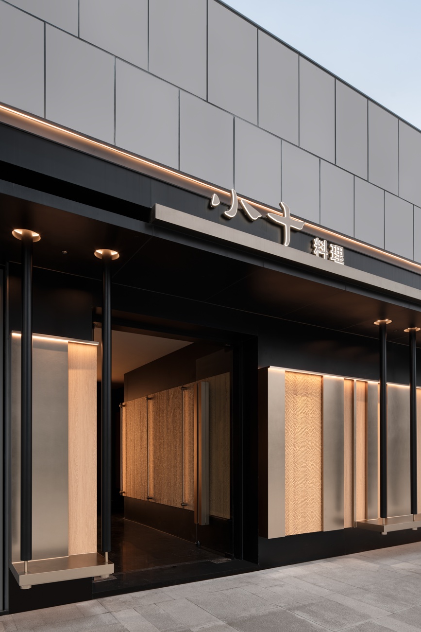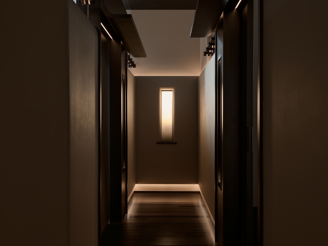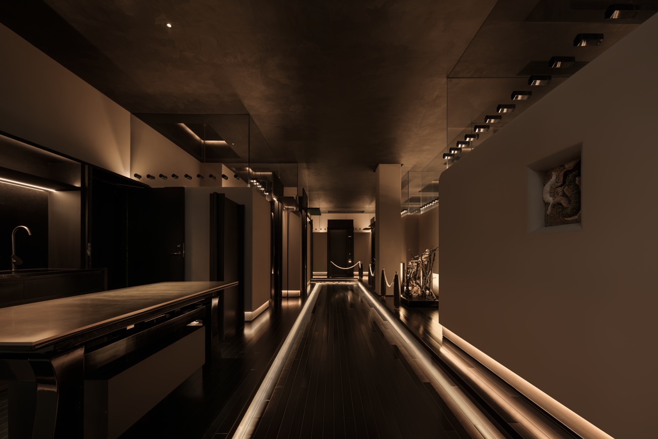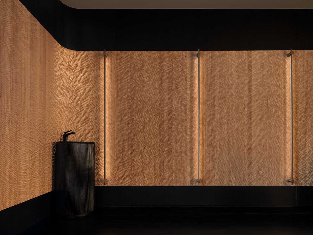 空间布局:入口长廊在波光粼粼,宛如夕照下金光跳跃出接待区,不同于以往的开放式日料空间设计,此项目希望呈现极致的私密属性,摒弃了公共用餐区,采用全包厢制设计。于是设计师将传统中式庭院民居的空间哲学引入布局,包厢不再仅仅是独立房间,而是演变为掩映在“游廊”与“庭院”意象中的静谧单元。客人循着游园般的路径深入,空间序列如徐徐展开的画轴,富有探索意趣的同时,营造出“庭院深深深几许”的东方含蓄韵味。厨房被设置于空间的核心区域,所有包厢围绕其外缘布局,形成最高效的辐射状服务动线。这不仅源于商业运营对效率的精算,更确保每一道餐食料理能以最新鲜的状态,第一时间呈于食客面前,无声提升着用餐的仪式感与价值感。