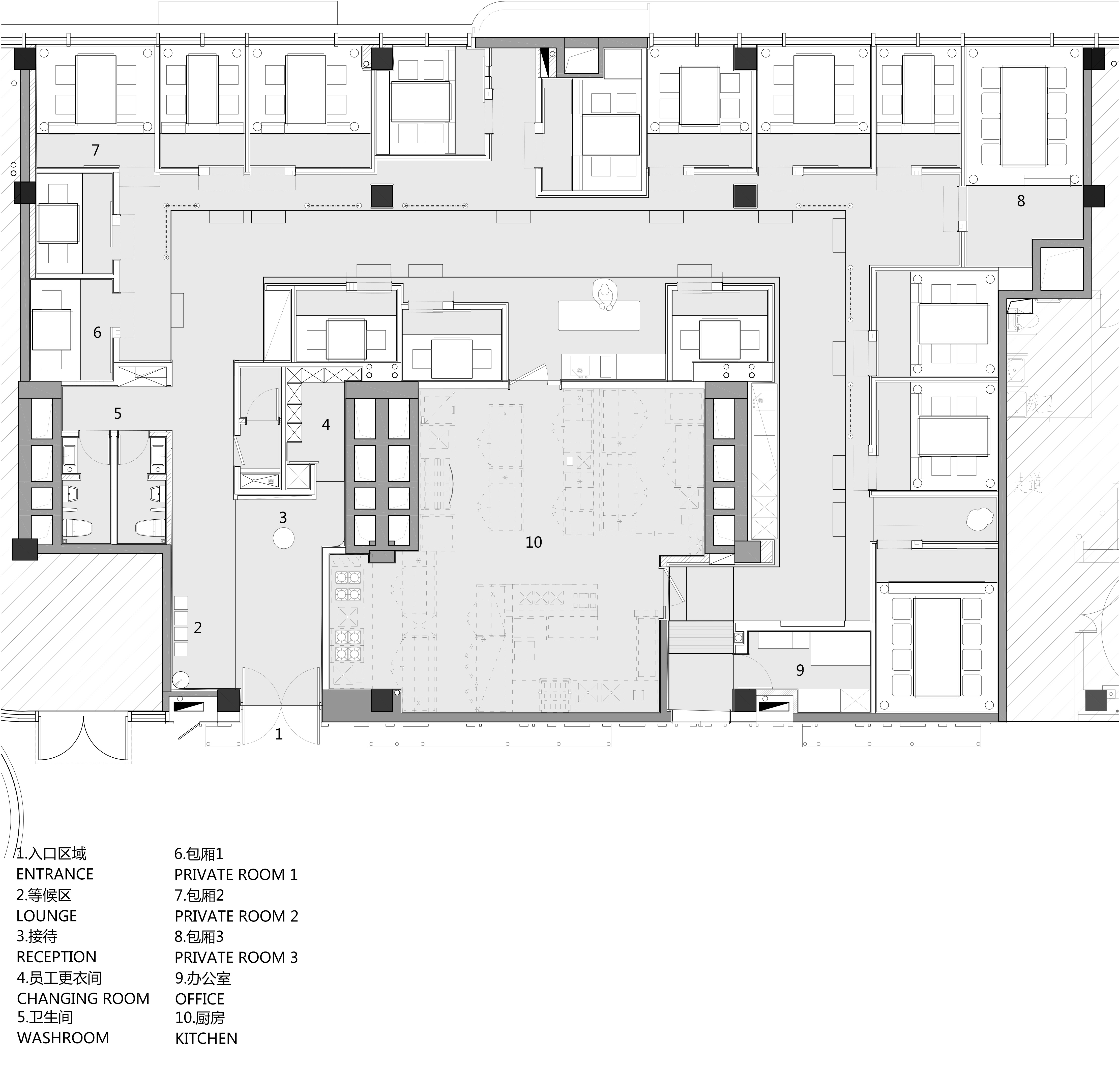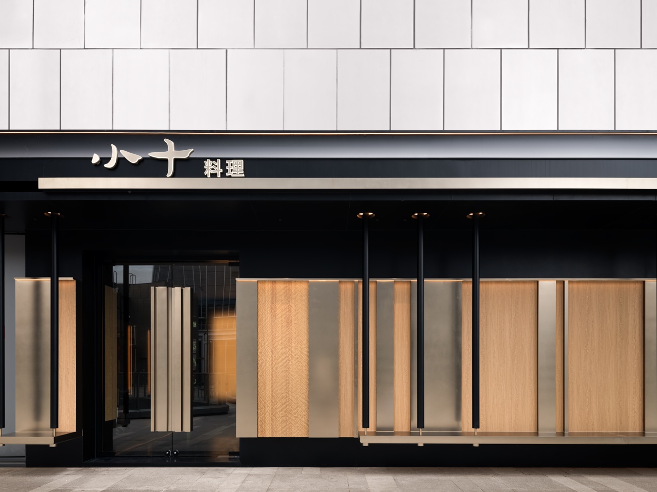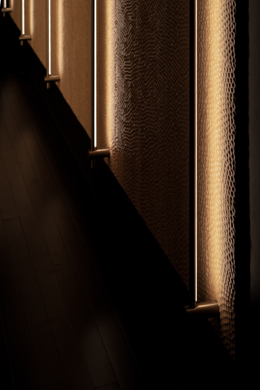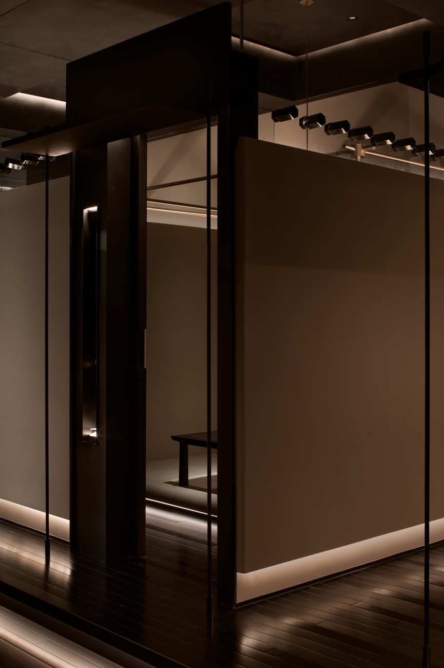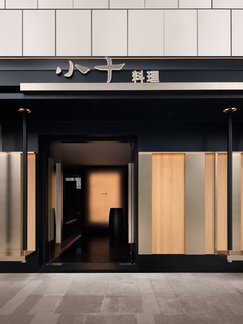 空间布局:入口长廊在波光粼粼,宛如夕照下金光跳跃出接待区,不同于以往的开放式日料空间设计,此项目希望呈现极致的私密属性,摒弃了公共用餐区,采用全包厢制设计。于是设计师将传统中式庭院民居的空间哲学引入布局,包厢不再仅仅是独立房间,而是演变为掩映在“游廊”与“庭院”意象中的静谧单元。客人循着游园般的路径深入,空间序列如徐徐展开的画轴,富有探索意趣的同时,营造出“庭院深深深几许”的东方含蓄韵味。厨房被设置于空间的核心区域,所有包厢围绕其外缘布局,形成最高效的辐射状服务动线。这不仅源于商业运营对效率的精算,更确保每一道餐食料理能以最新鲜的状态,第一时间呈于食客面前,无声提升着用餐的仪式感与价值感。