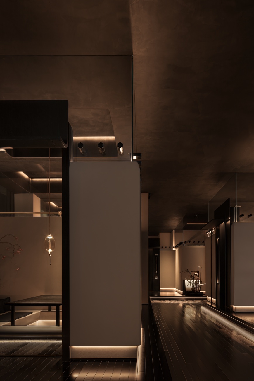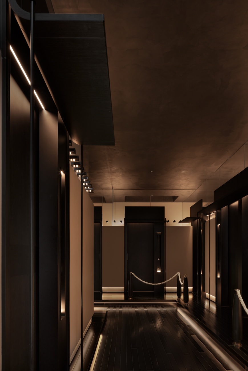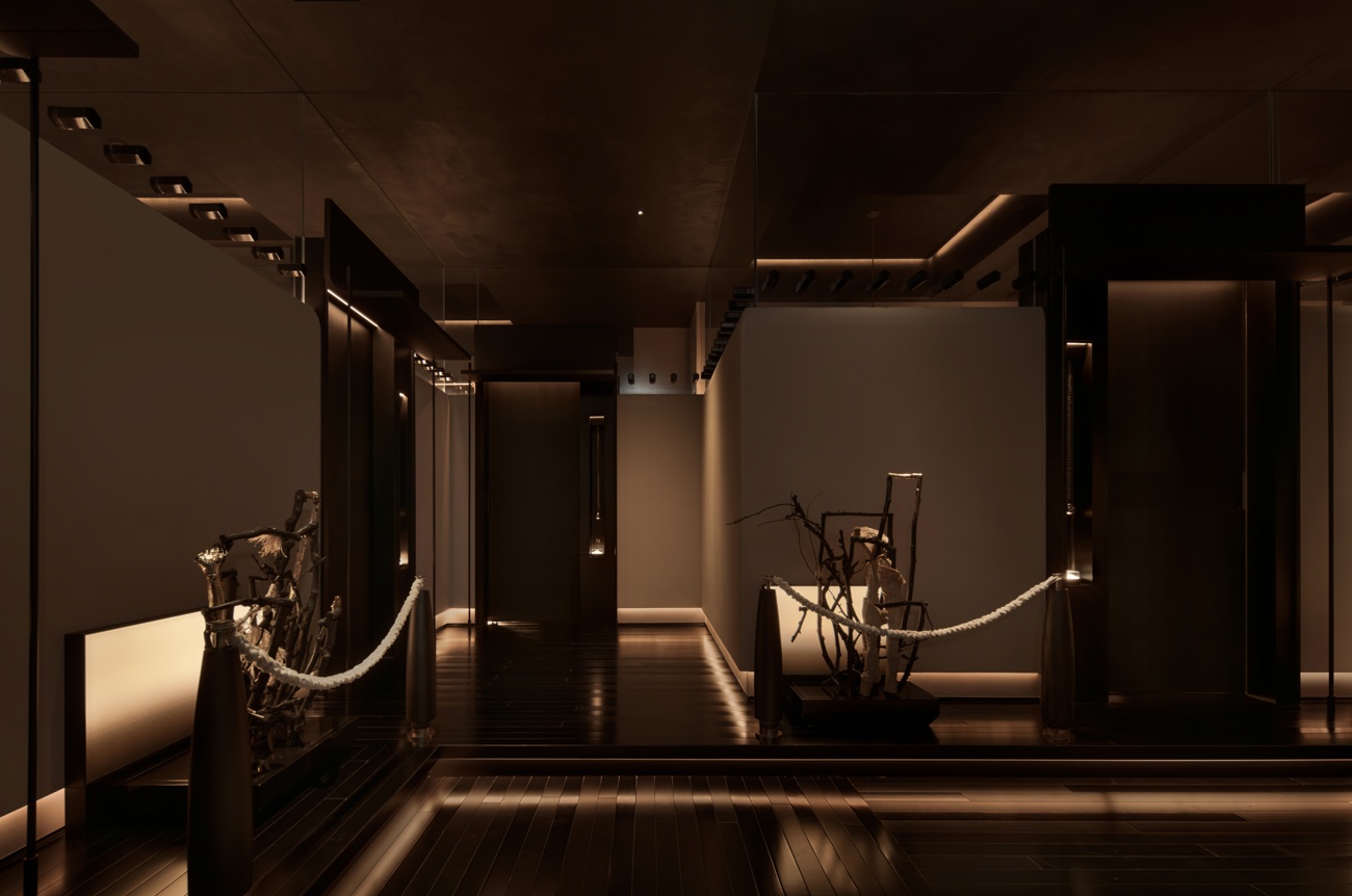 向左延伸的等候长廊,延续了这幕波光之戏,在此停驻的时间,如沐江畔的暮色里,静观日落月升,光影流转不息。两侧过道边,粗粝质感的缆绳元素与枯木陈设为“游江船”基因再次点题,循着光的指引深入,两侧包厢如舟行江面时擦肩而过的船舱,静默排列。全包厢布局最大的挑战在于公区易陷入封闭与单调,为此,设计师将所有包厢隔墙的顶部预留出舒展的通透空隙,出于隔音需求,再以玻璃填充。