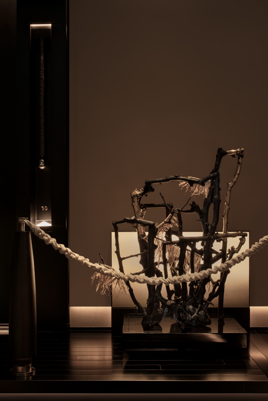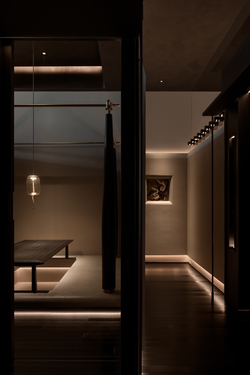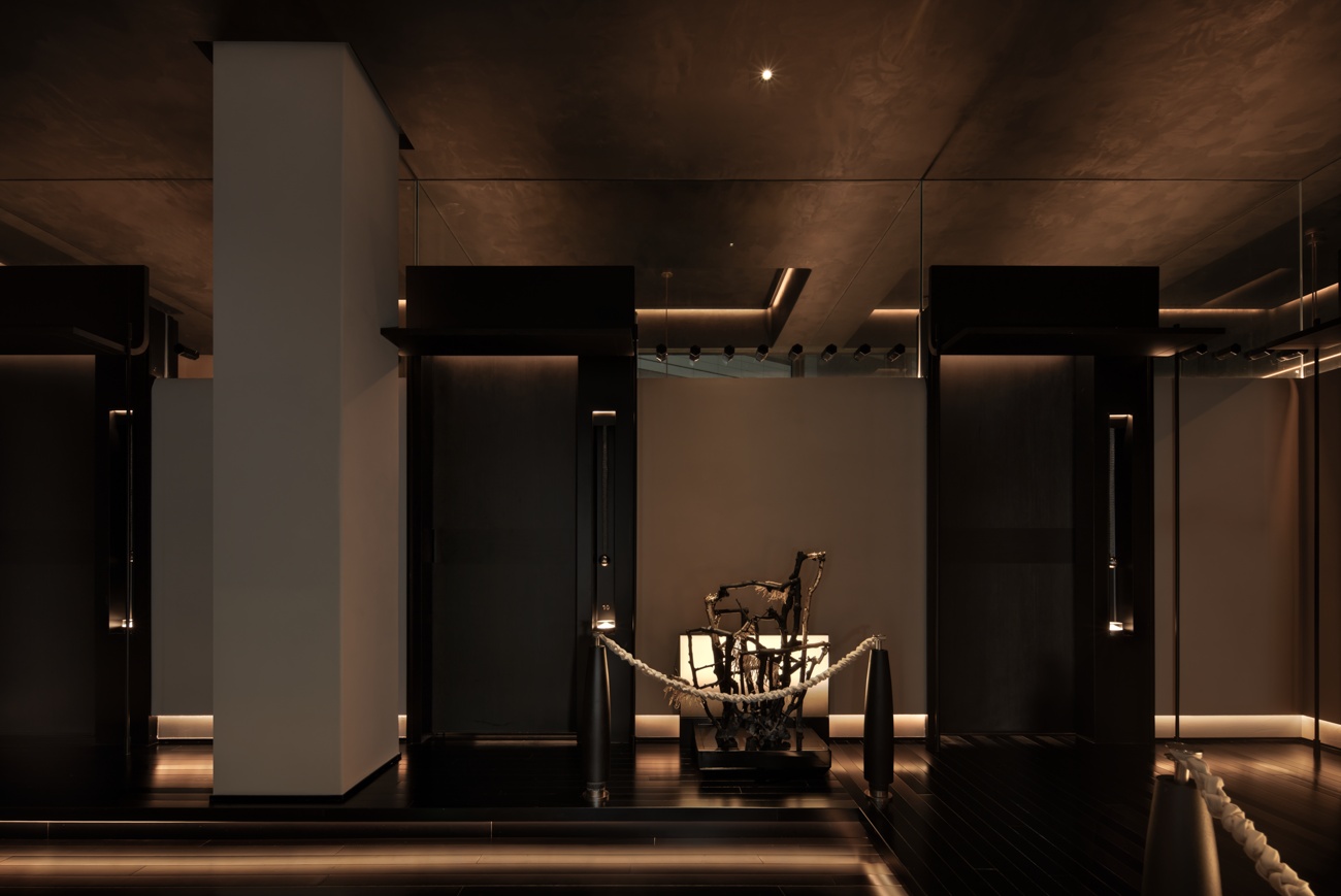 向左延伸的等候长廊,延续了这幕波光之戏,在此停驻的时间,如沐江畔的暮色里,静观日落月升,光影流转不息。两侧过道边,粗粝质感的缆绳元素与枯木陈设为“游江船”基因再次点题,循着光的指引深入,两侧包厢如舟行江面时擦肩而过的船舱,静默排列。全包厢布局最大的挑战在于公区易陷入封闭与单调,为此,设计师将所有包厢隔墙的顶部预留出舒展的通透空隙,出于隔音需求,再以玻璃填充。