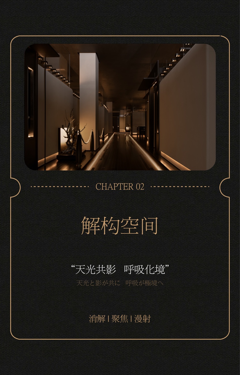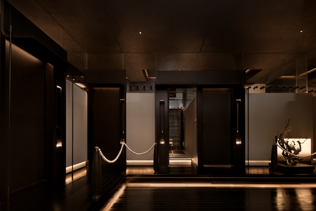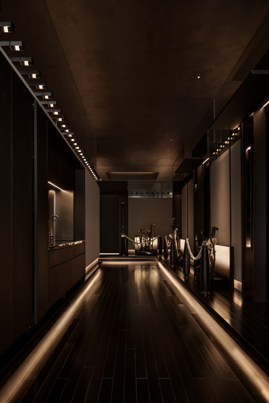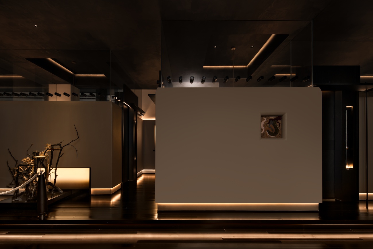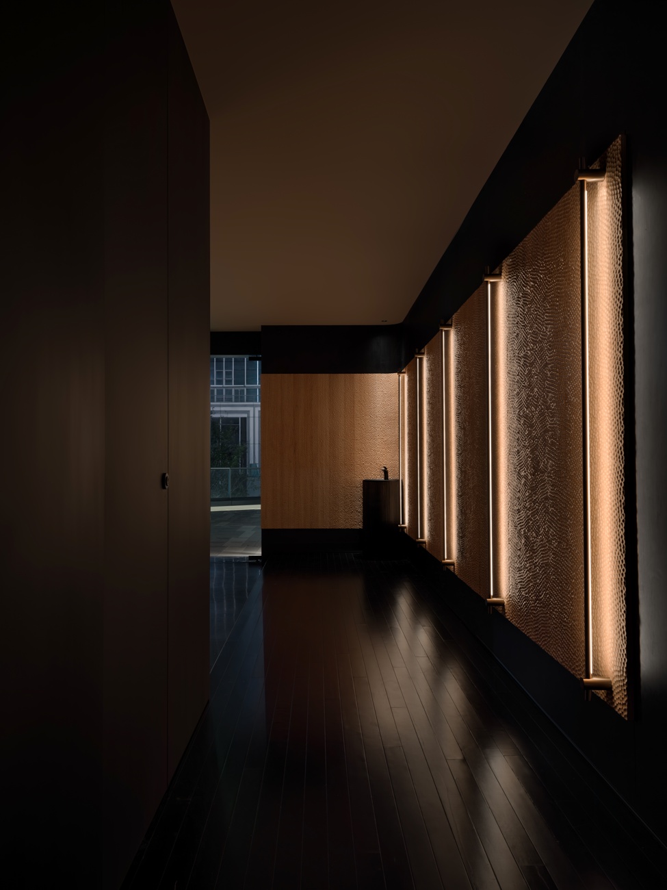 空间意境:通体深邃的黑色基调,并非压抑,而是为光预留的盛大舞台。入口长廊两侧,金属锤纹在暖光的映照下,波光粼粼,宛如夕照下金光跳跃的水面。接待区背景墙在黑暗中泛着柔和的光晕,如熔金落日沉入江心,或似泠泠清月洒落寒璧,静影悄然浮现。