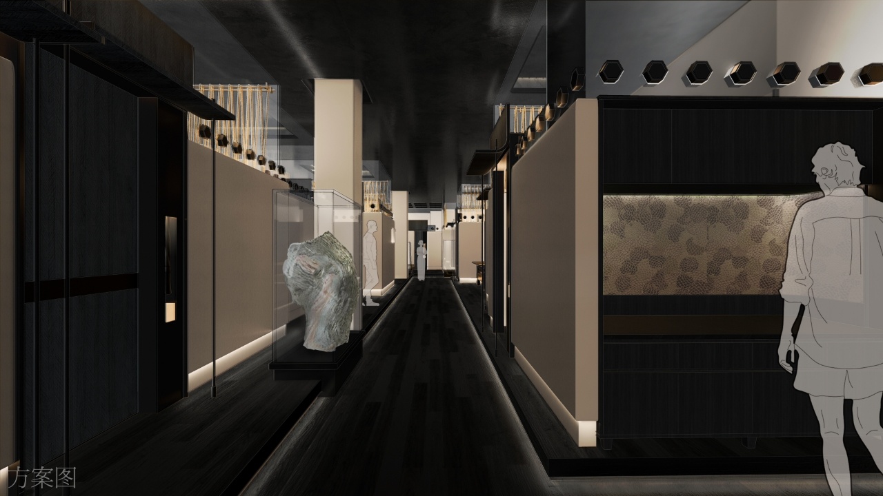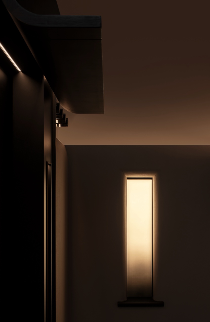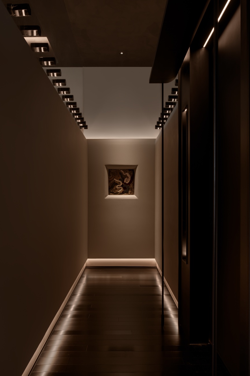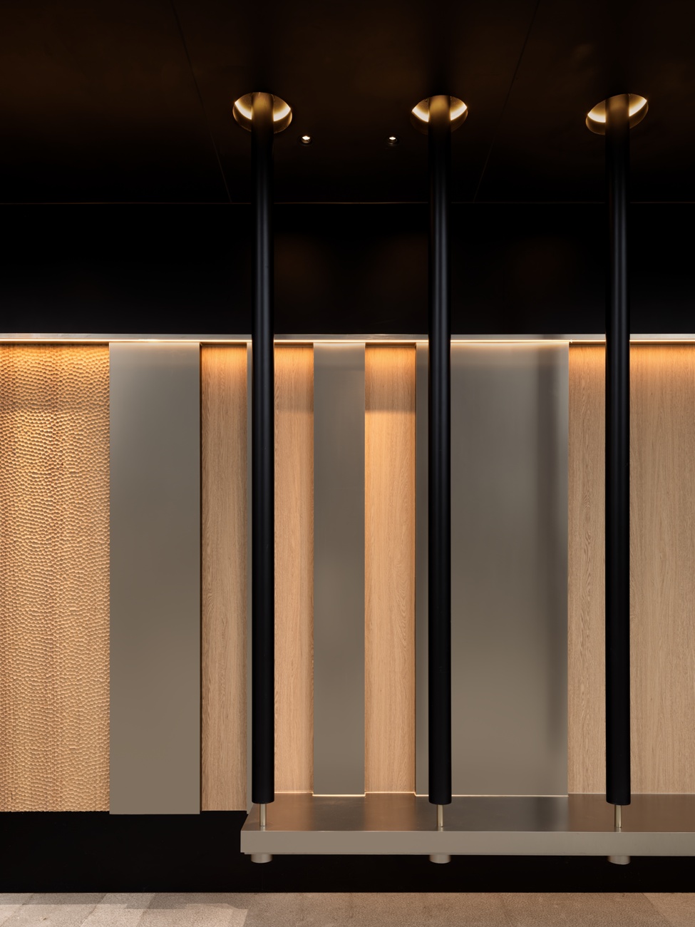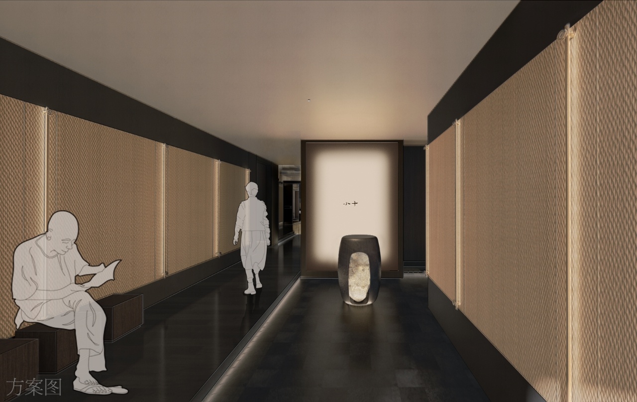 空间意境:通体深邃的黑色基调,并非压抑,而是为光预留的盛大舞台。入口长廊两侧,金属锤纹在暖光的映照下,波光粼粼,宛如夕照下金光跳跃的水面。接待区背景墙在黑暗中泛着柔和的光晕,如熔金落日沉入江心,或似泠泠清月洒落寒璧,静影悄然浮现。
