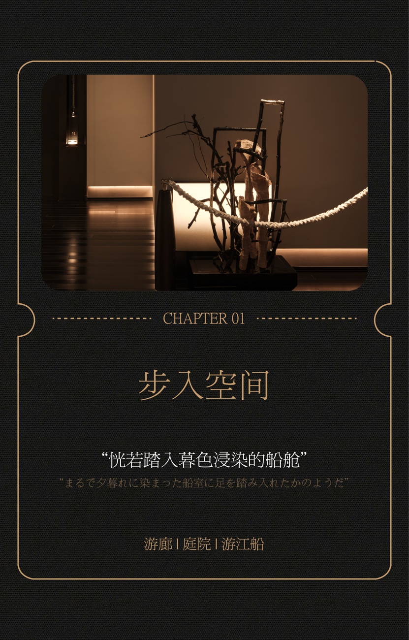 设计选材:金属锤纹在暖光的映照下,波光粼粼,宛如夕照下金光跳跃的水面。接待区背景墙在黑暗中泛着柔和的光晕,如熔金落日沉入江心,或似泠泠清月洒落寒璧,静影悄然浮现。粗粝质感的缆绳元素与枯木陈设为“游江船”基因再次点题,循着光的指引深入