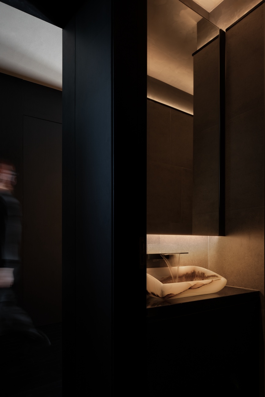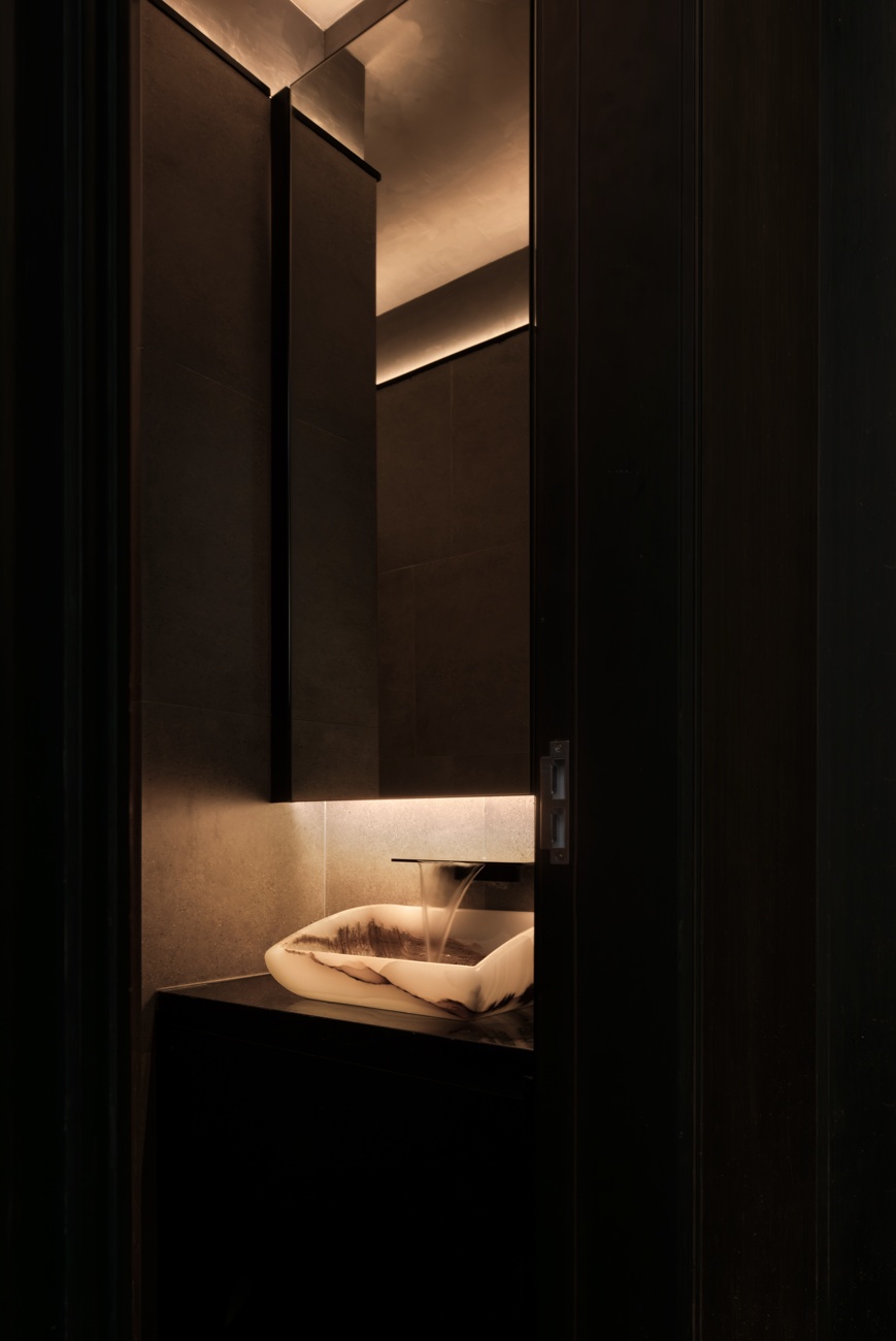包厢内部,设计回归极致的凝练与克制,摒弃多余的装饰,地面通过有意抬高形成一步台阶,让步入的过程如同登临船舷进入船舱,消解了空间面积有限带来的局促感,至此,完成了空间情绪的转换。