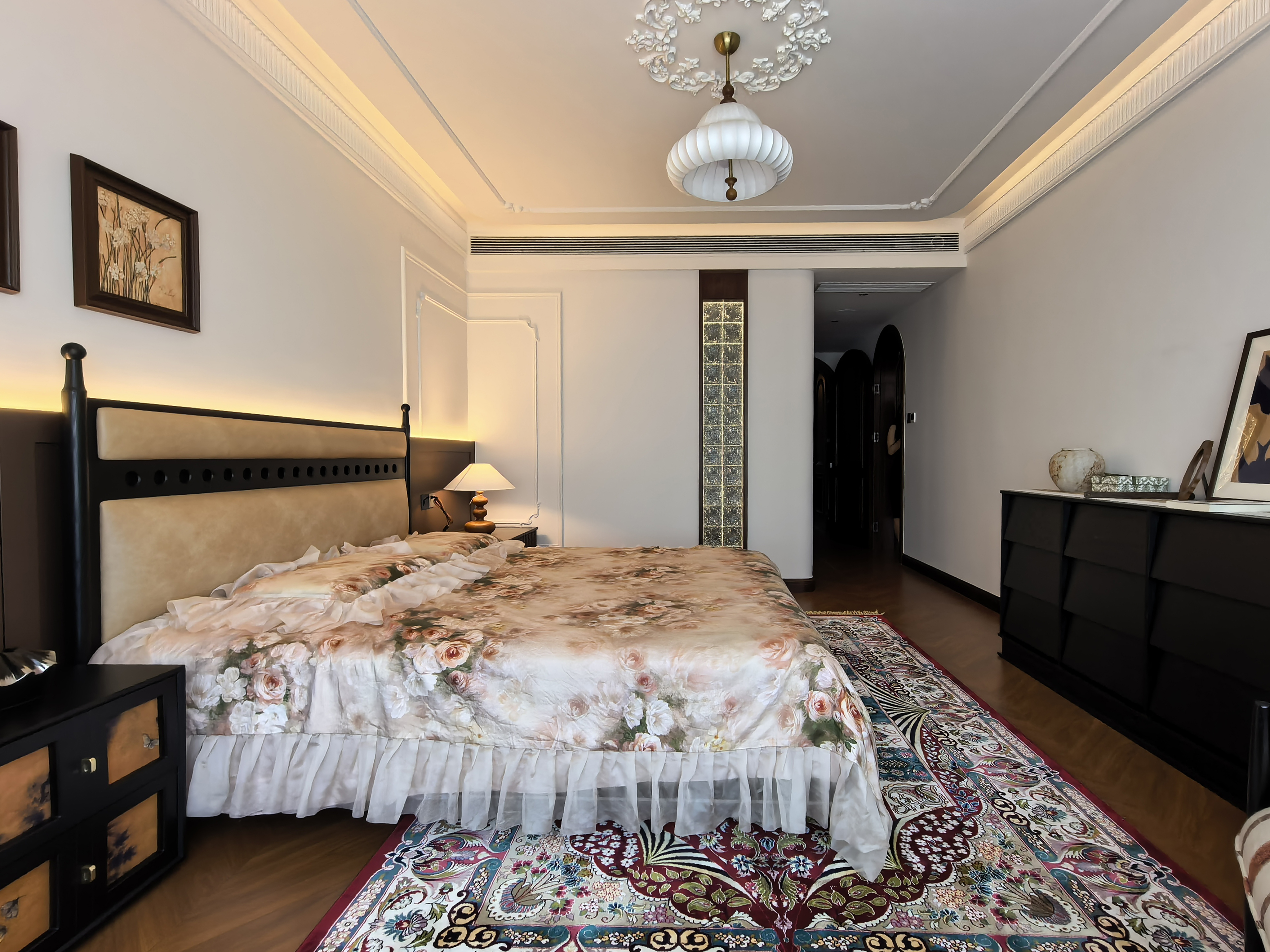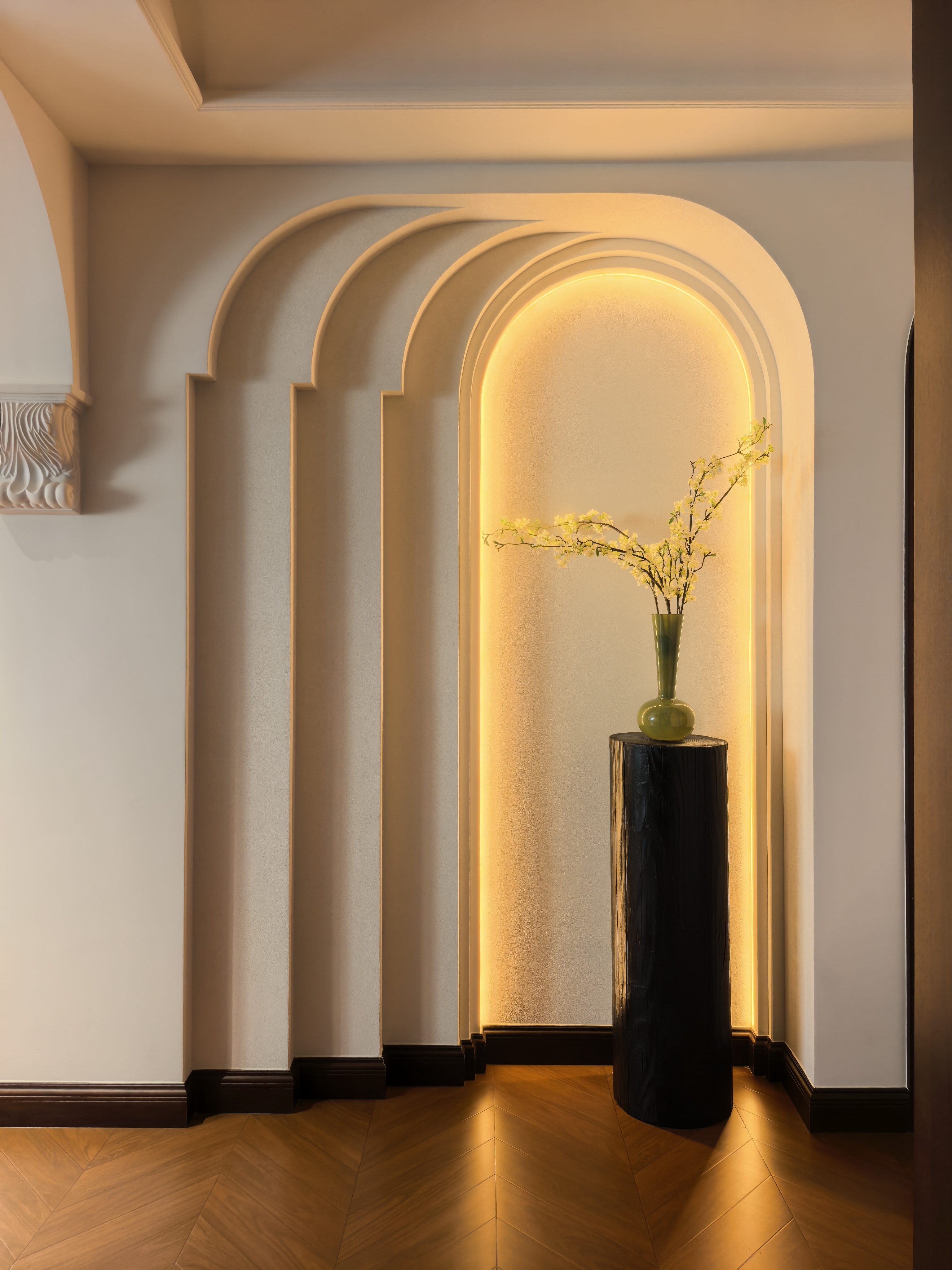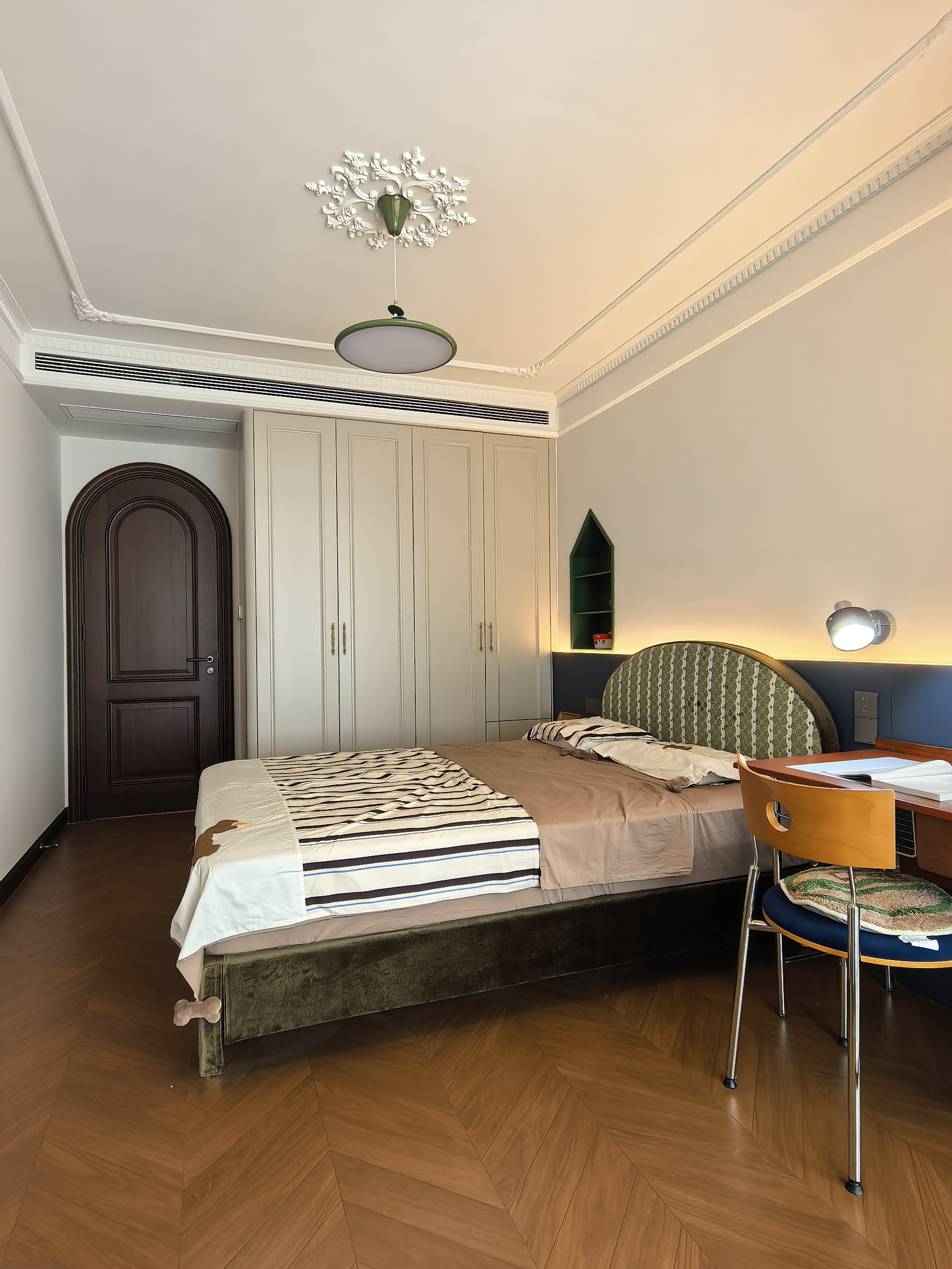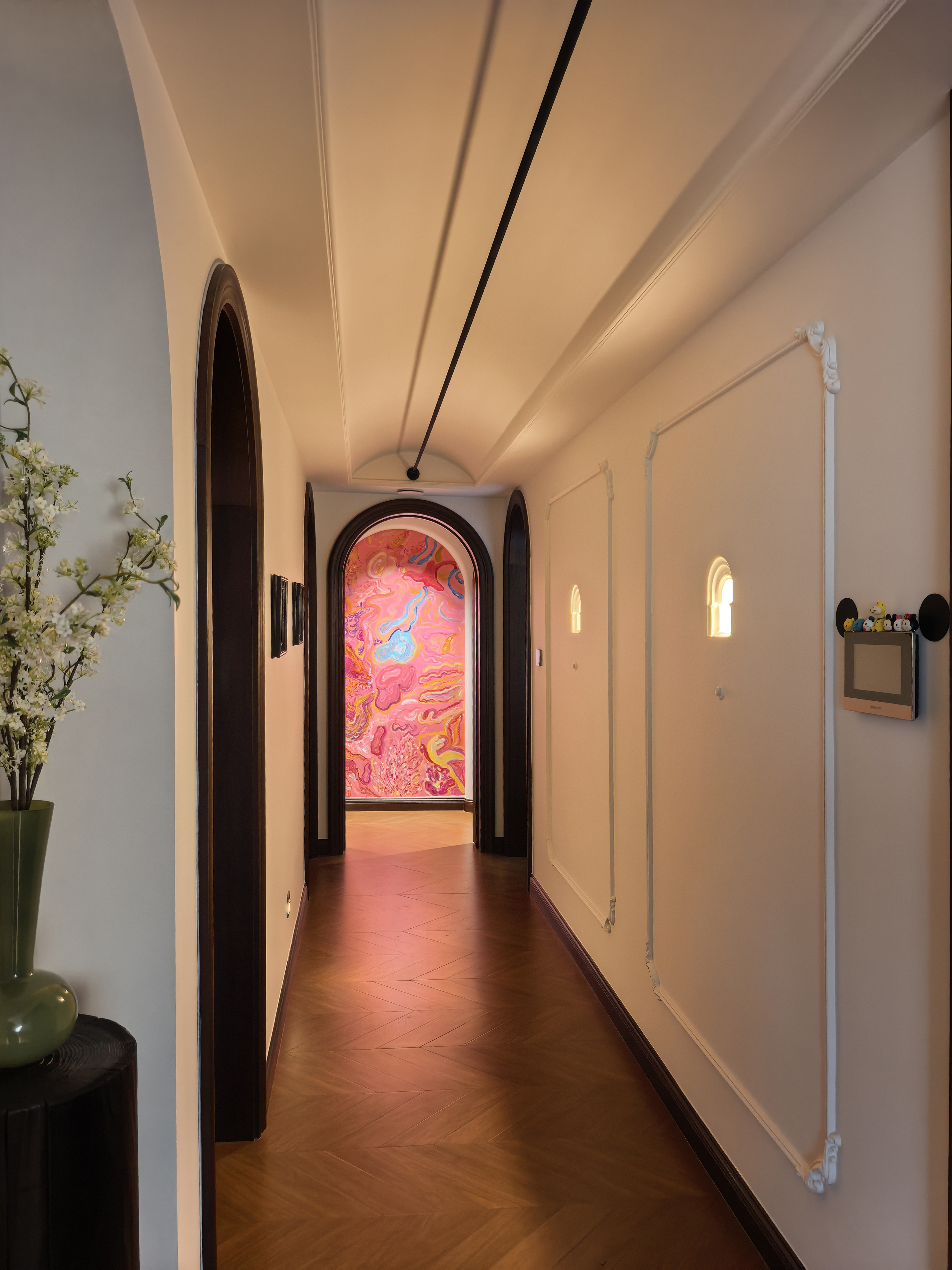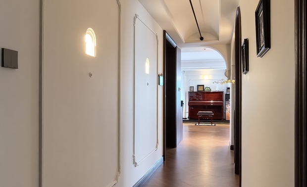 空间意境:风格定位复古,室内装饰上也借鉴了很多法式古典建筑中的经典元素,例如拱券门长廊、拱形顶、梁拖、灯盘、角花、线条等。在满足客户的功能和审美需求的同时,也增加了很多趣味点,玄关的拱券门延伸造型(内嵌氛围灯带),走廊和女孩房的宫殿式内嵌壁灯,男孩房小木屋等,配合上智能家居控制,为空间增加了更多仪式感。