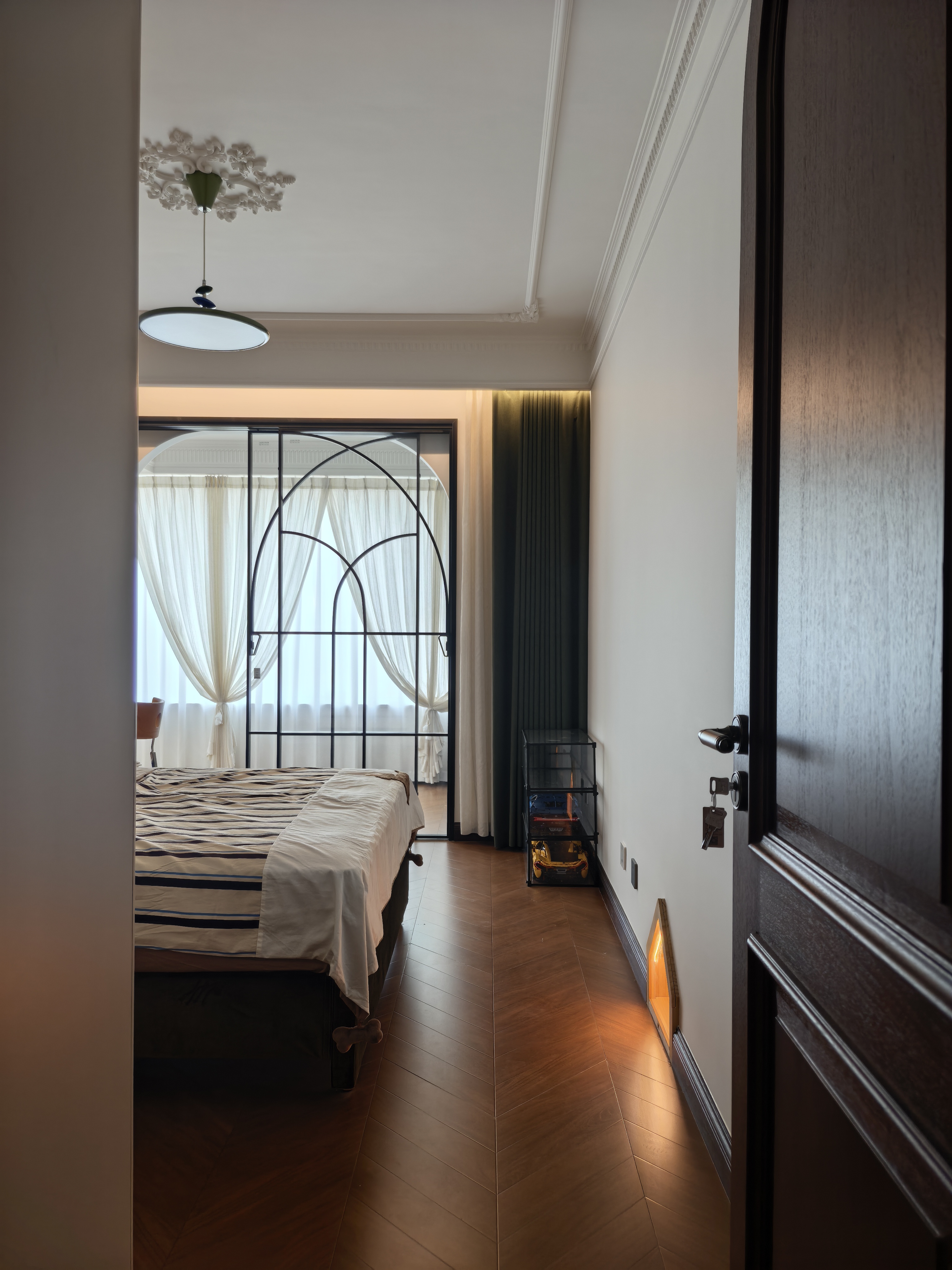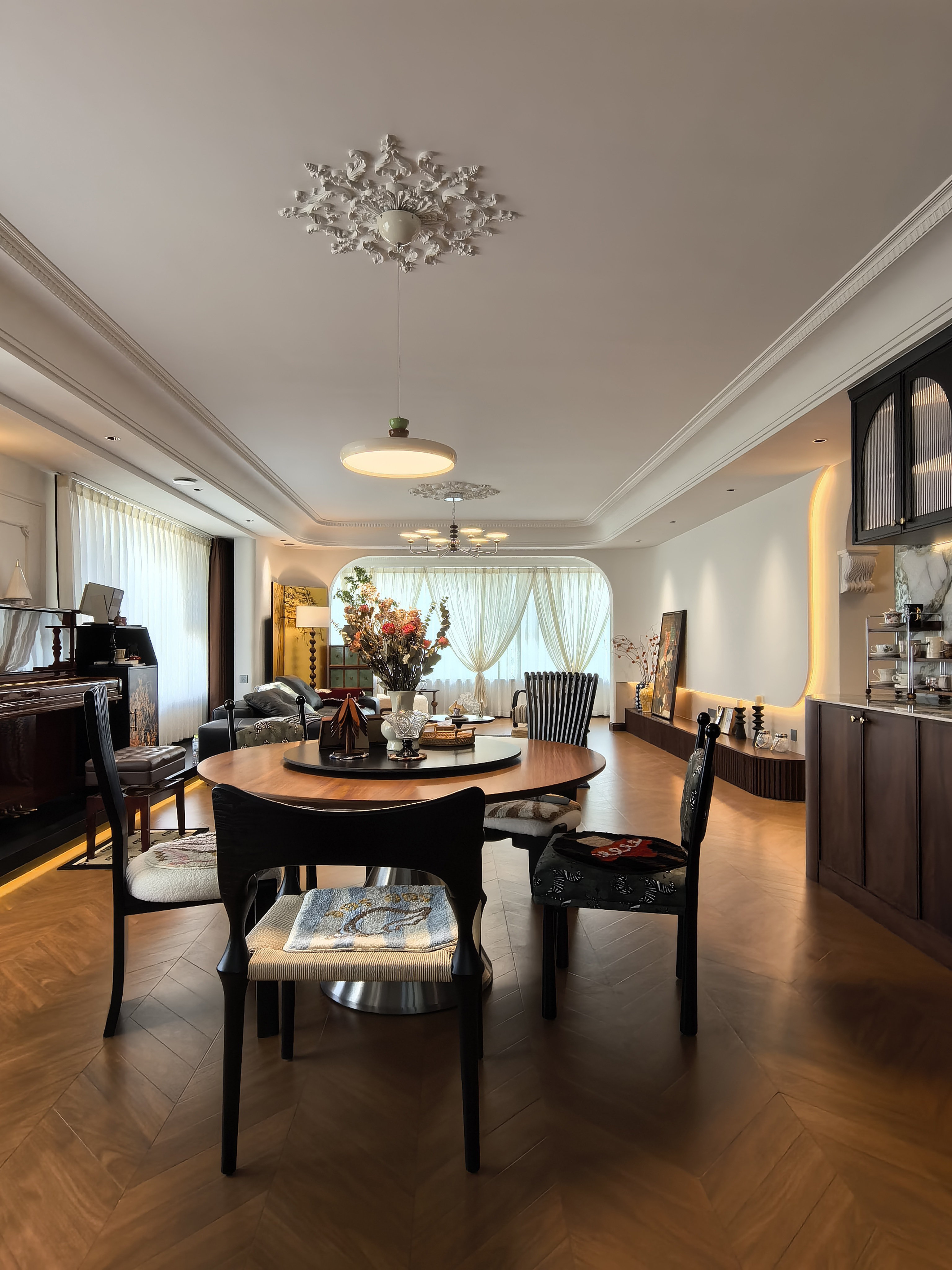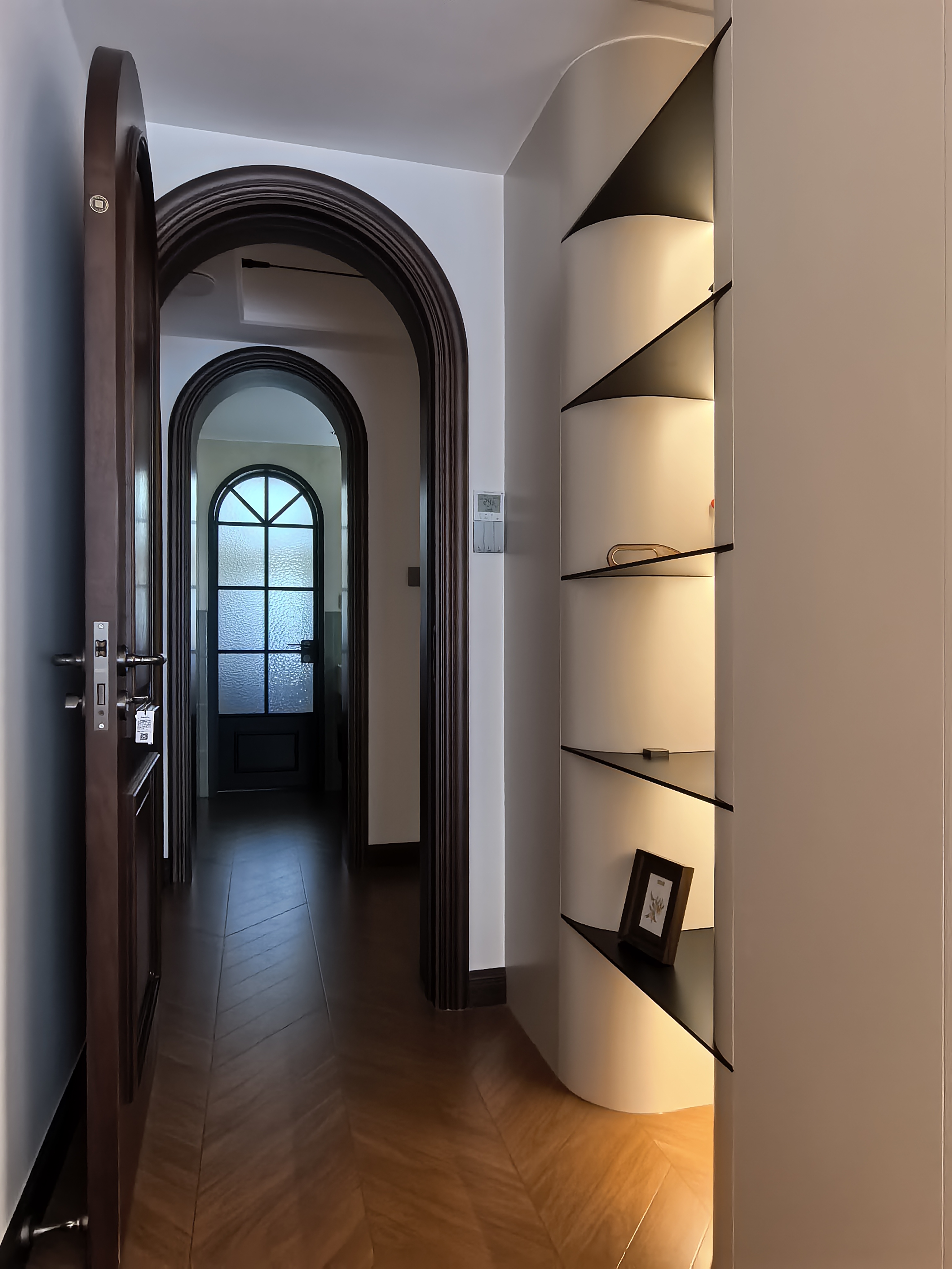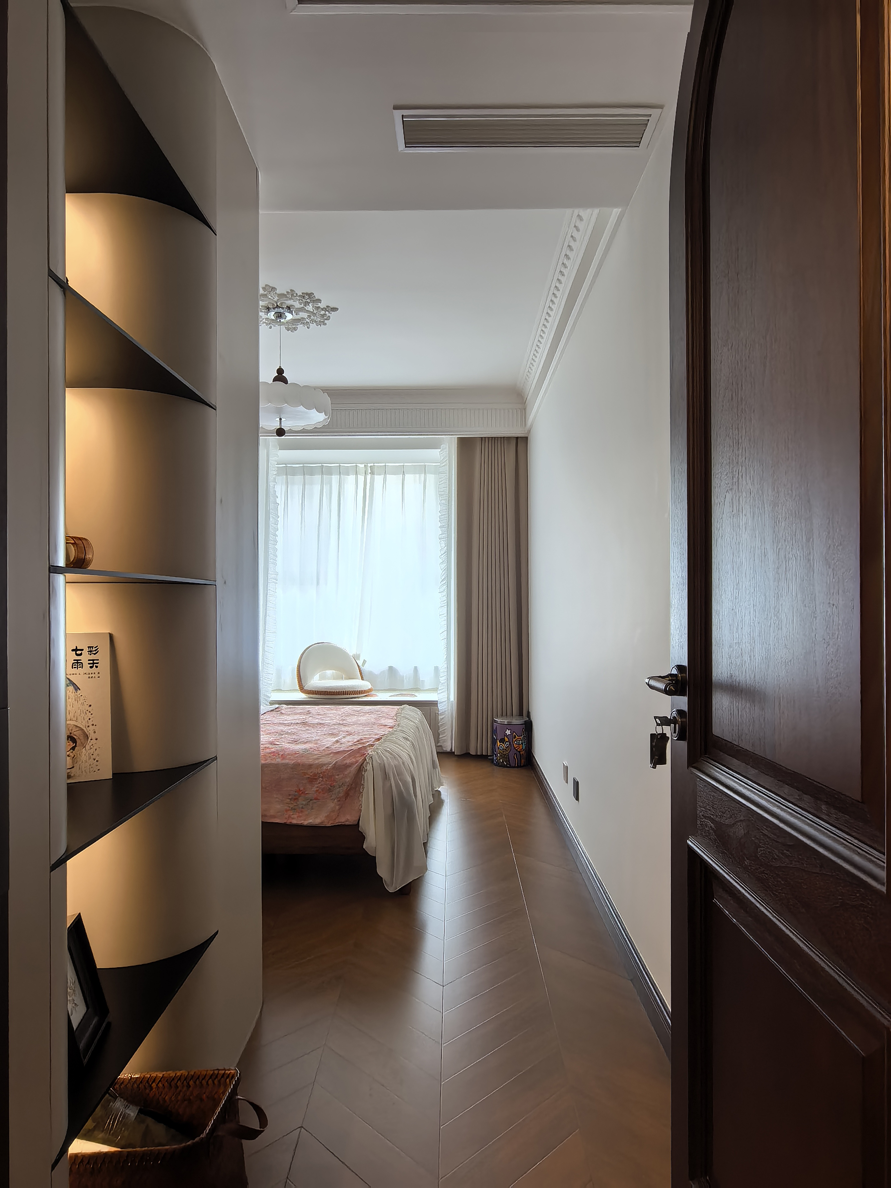 空间意境:风格定位复古,室内装饰上也借鉴了很多法式古典建筑中的经典元素,例如拱券门长廊、拱形顶、梁拖、灯盘、角花、线条等。在满足客户的功能和审美需求的同时,也增加了很多趣味点,玄关的拱券门延伸造型(内嵌氛围灯带),走廊和女孩房的宫殿式内嵌壁灯,男孩房小木屋等,配合上智能家居控制,为空间增加了更多仪式感。