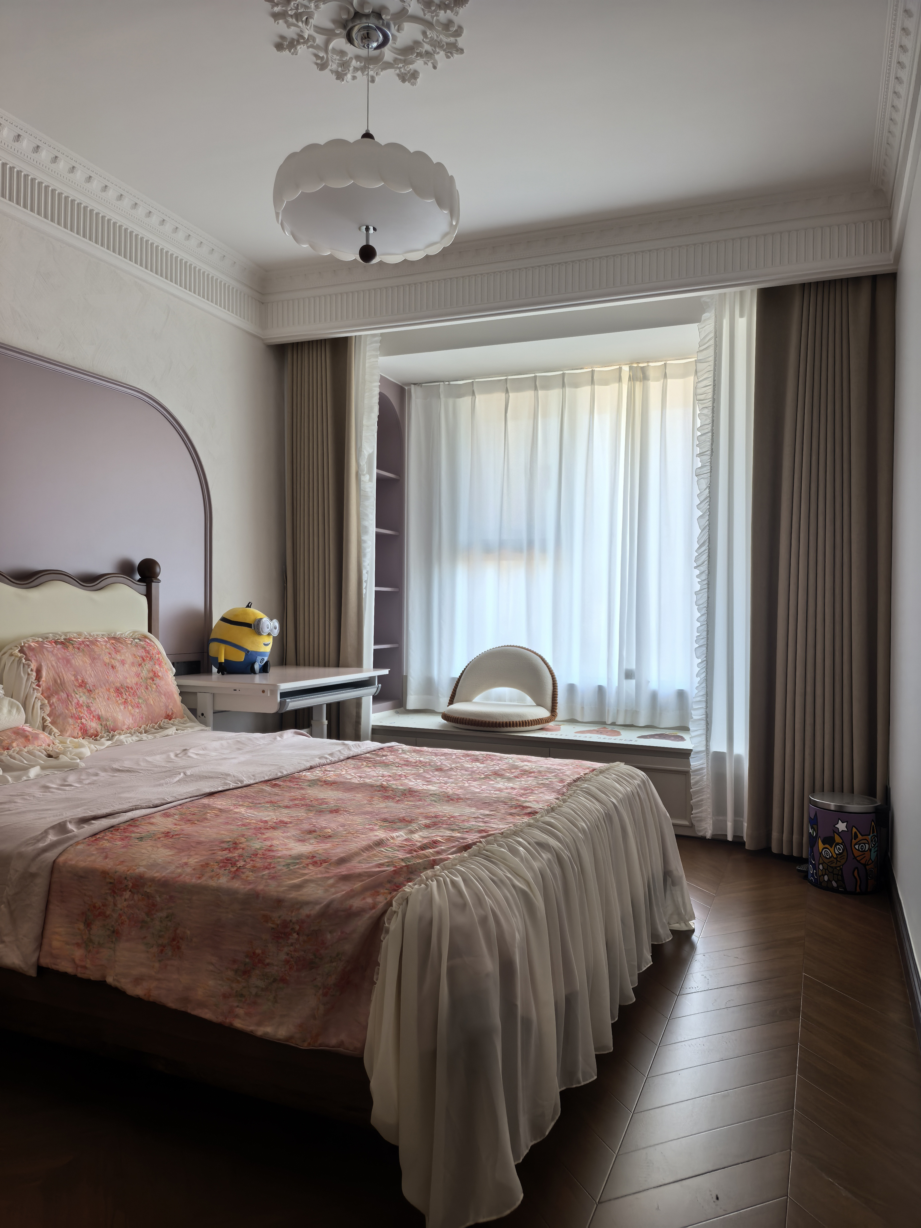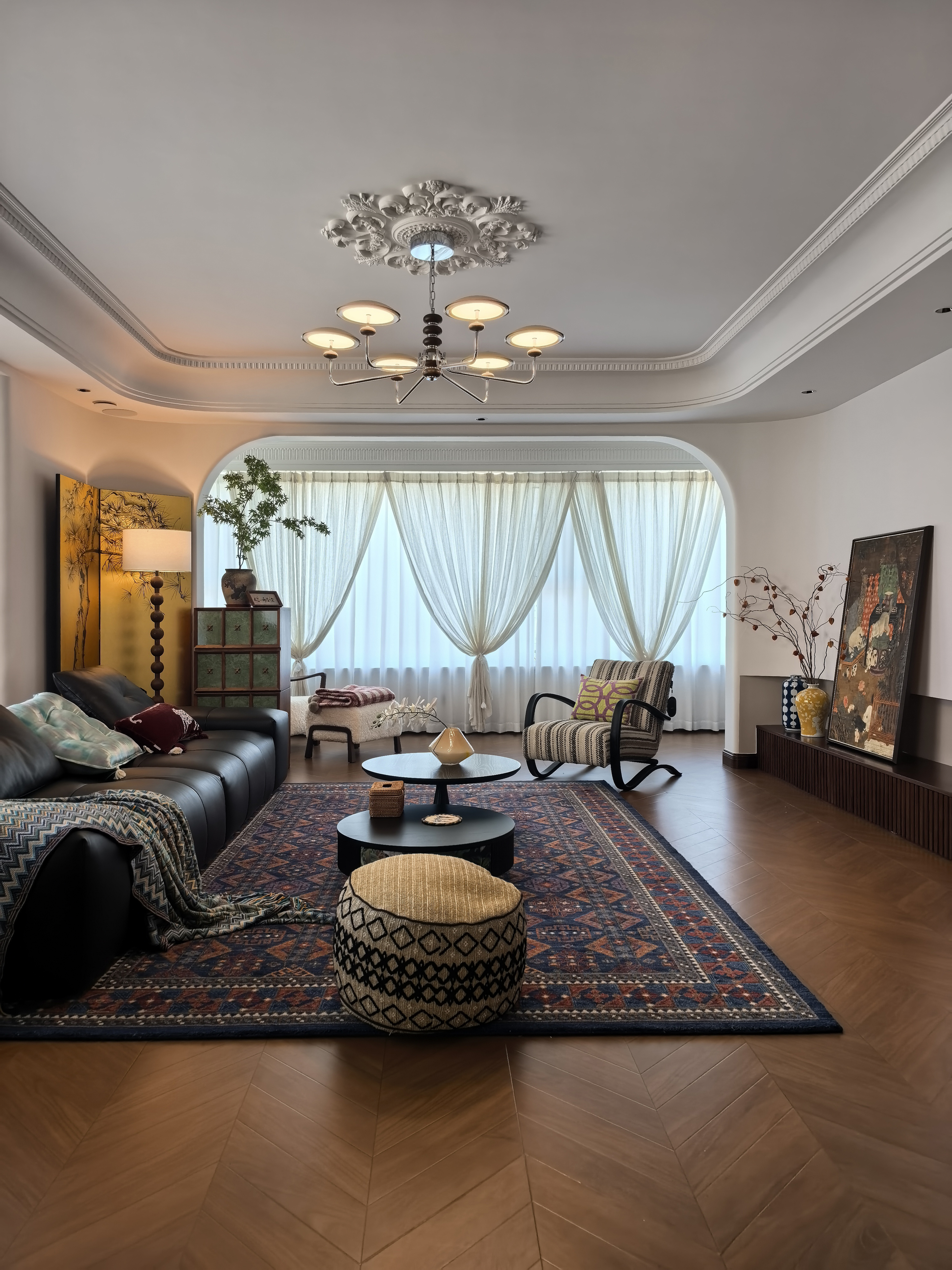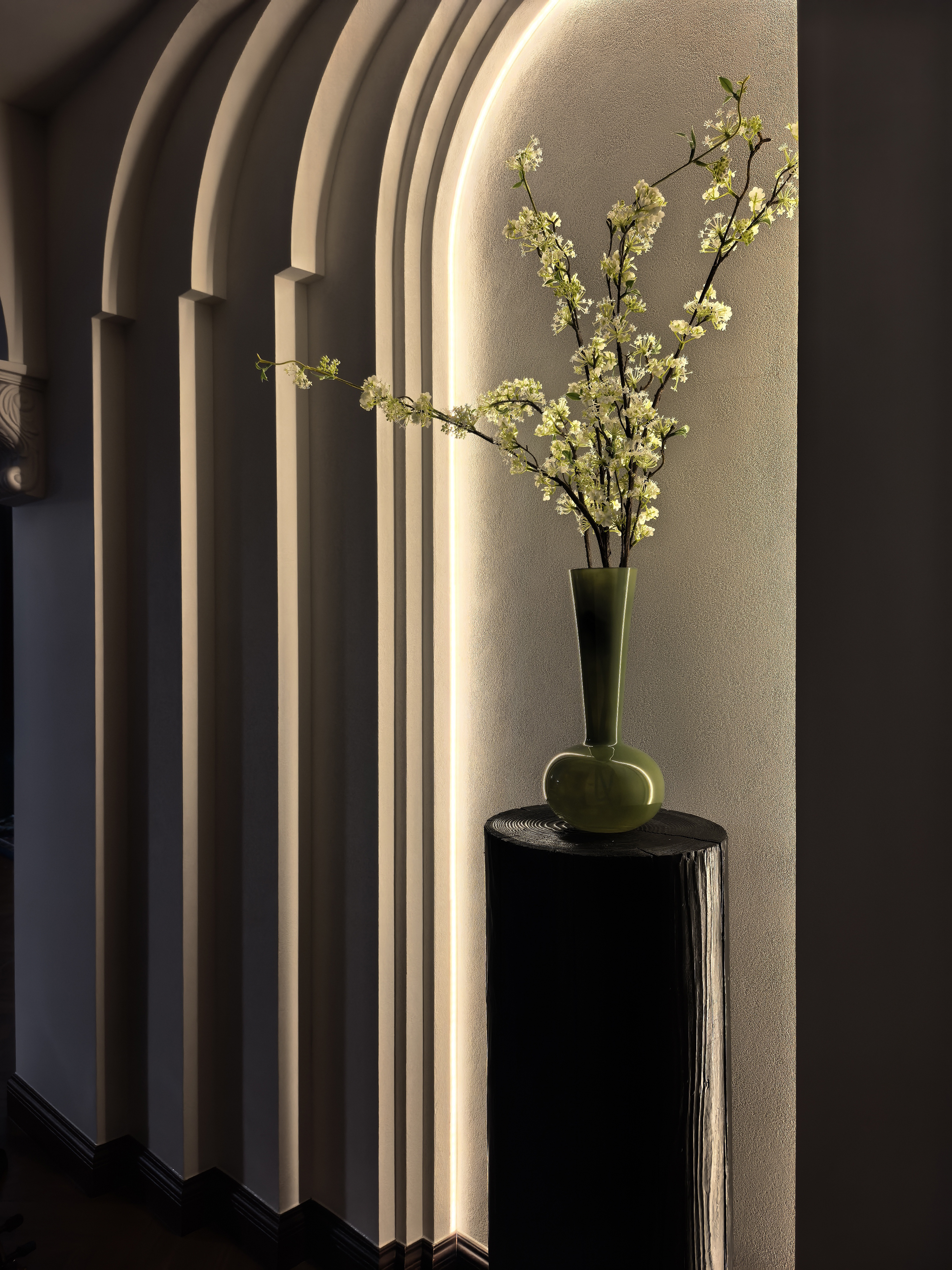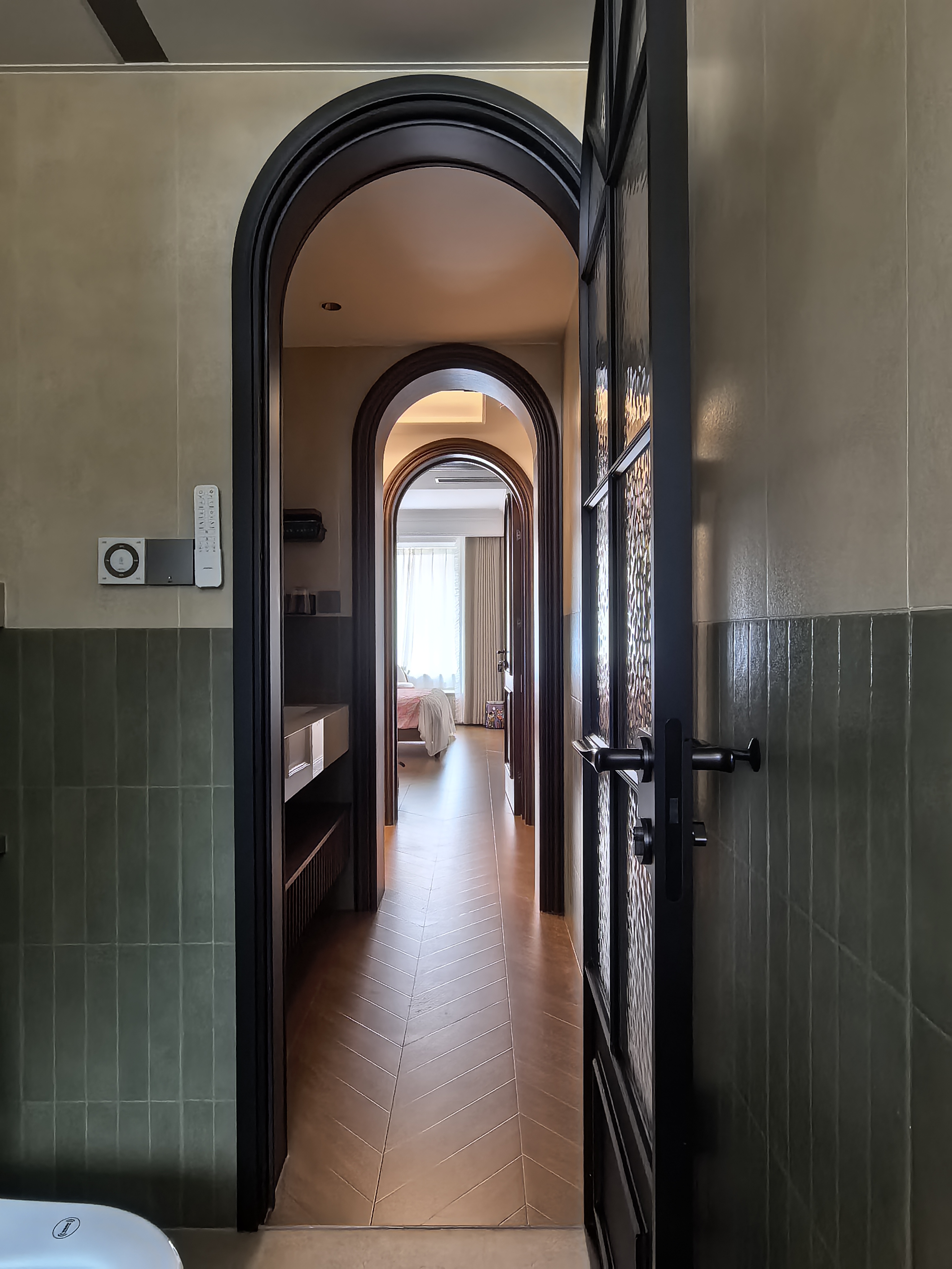 空间意境:风格定位复古,室内装饰上也借鉴了很多法式古典建筑中的经典元素,例如拱券门长廊、拱形顶、梁拖、灯盘、角花、线条等。在满足客户的功能和审美需求的同时,也增加了很多趣味点,玄关的拱券门延伸造型(内嵌氛围灯带),走廊和女孩房的宫殿式内嵌壁灯,男孩房小木屋等,配合上智能家居控制,为空间增加了更多仪式感。