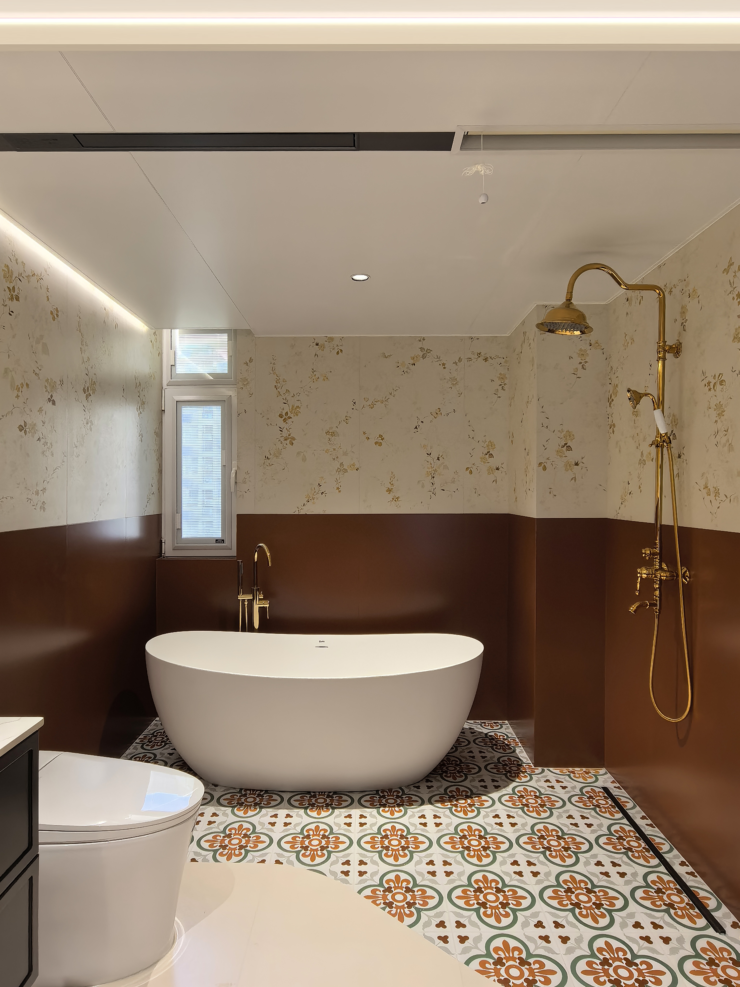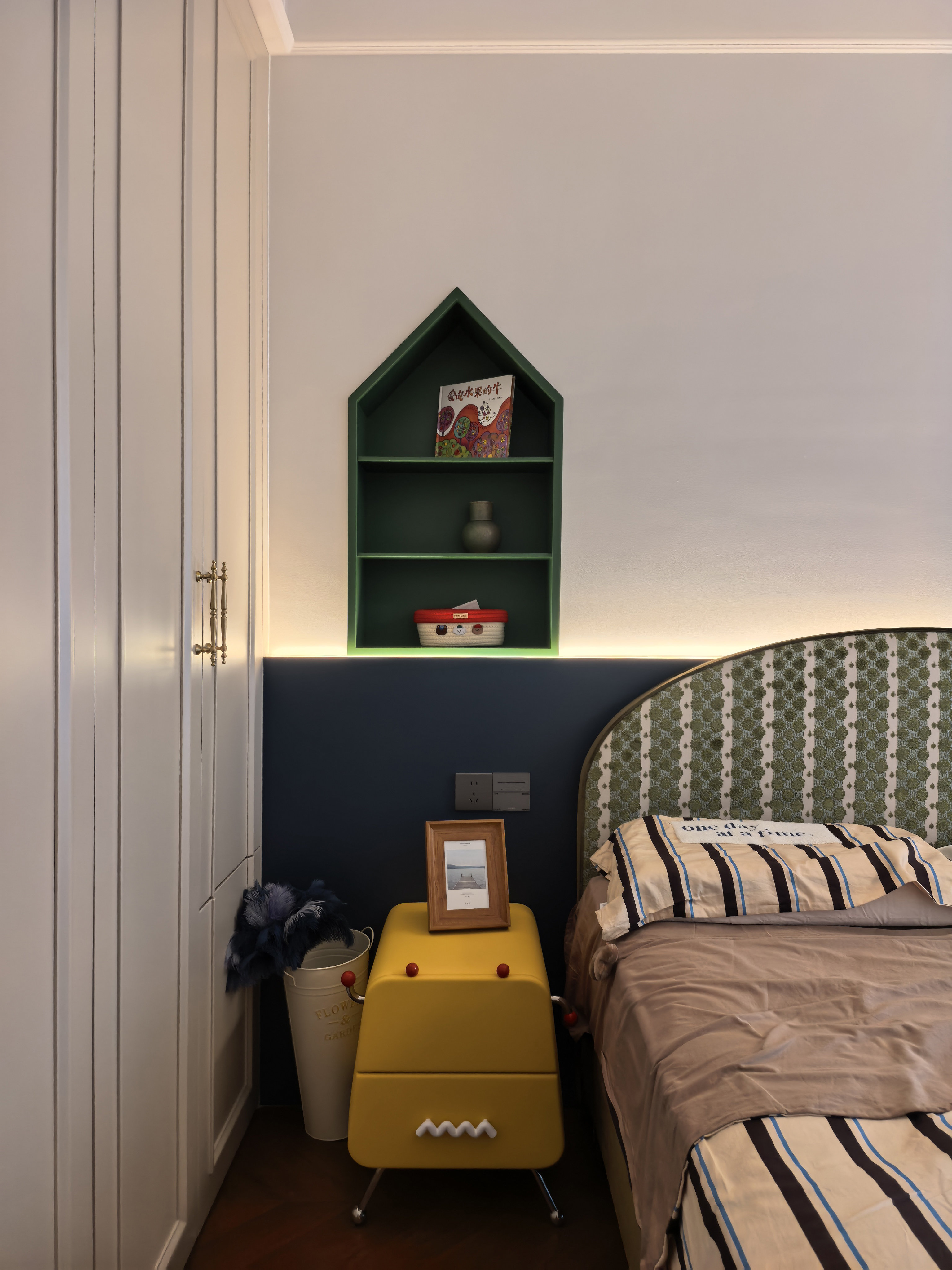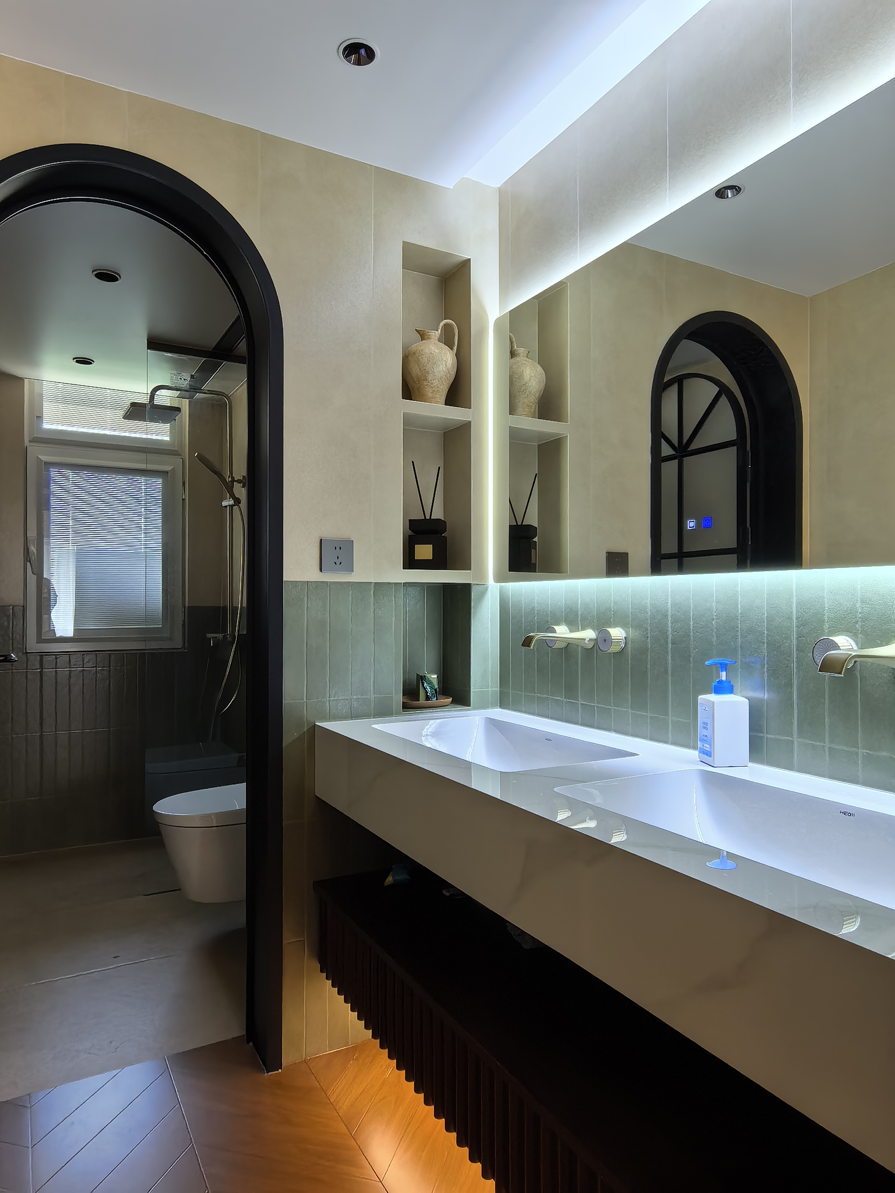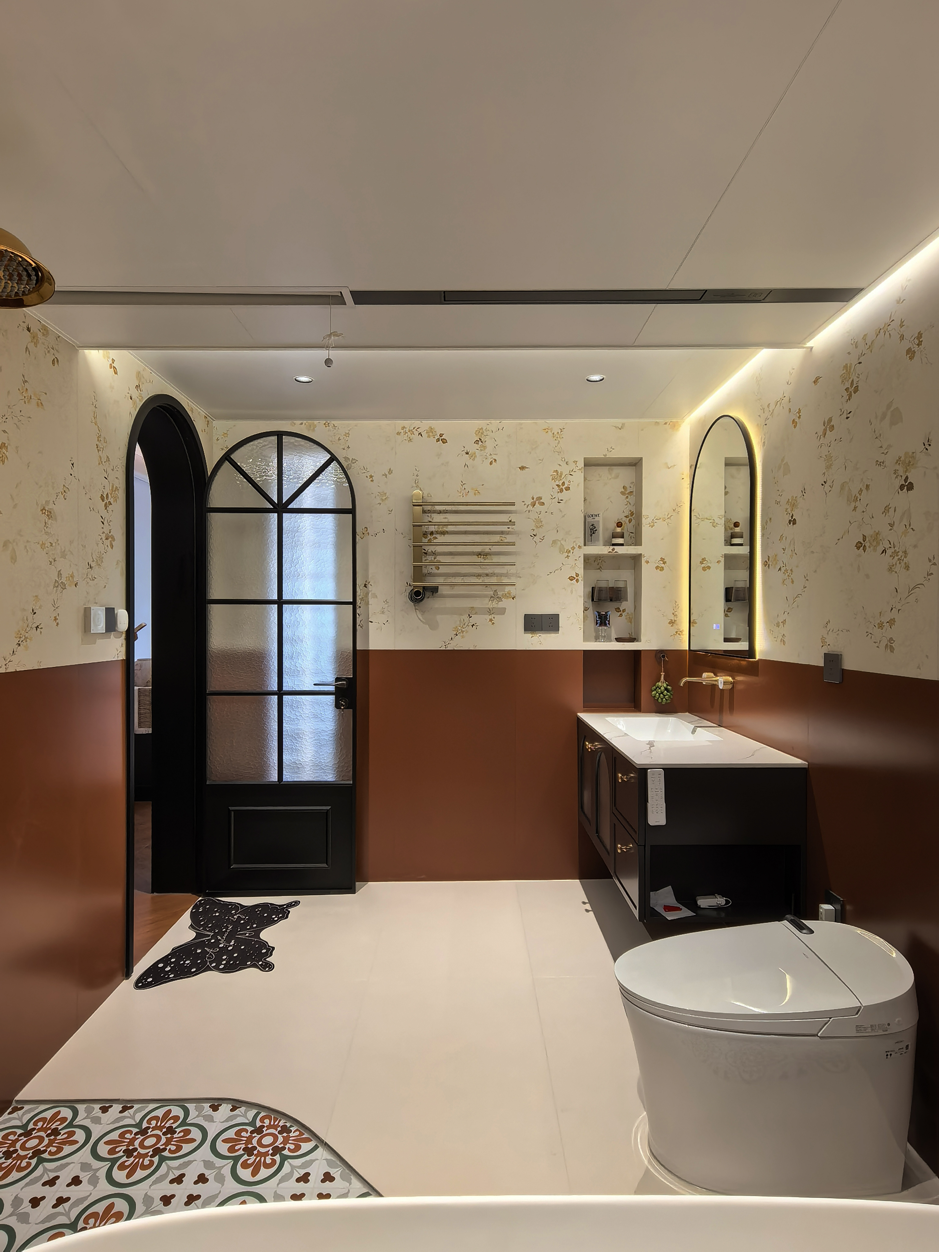 空间意境:风格定位复古,室内装饰上也借鉴了很多法式古典建筑中的经典元素,例如拱券门长廊、拱形顶、梁拖、灯盘、角花、线条等。在满足客户的功能和审美需求的同时,也增加了很多趣味点,玄关的拱券门延伸造型(内嵌氛围灯带),走廊和女孩房的宫殿式内嵌壁灯,男孩房小木屋等,配合上智能家居控制,为空间增加了更多仪式感。