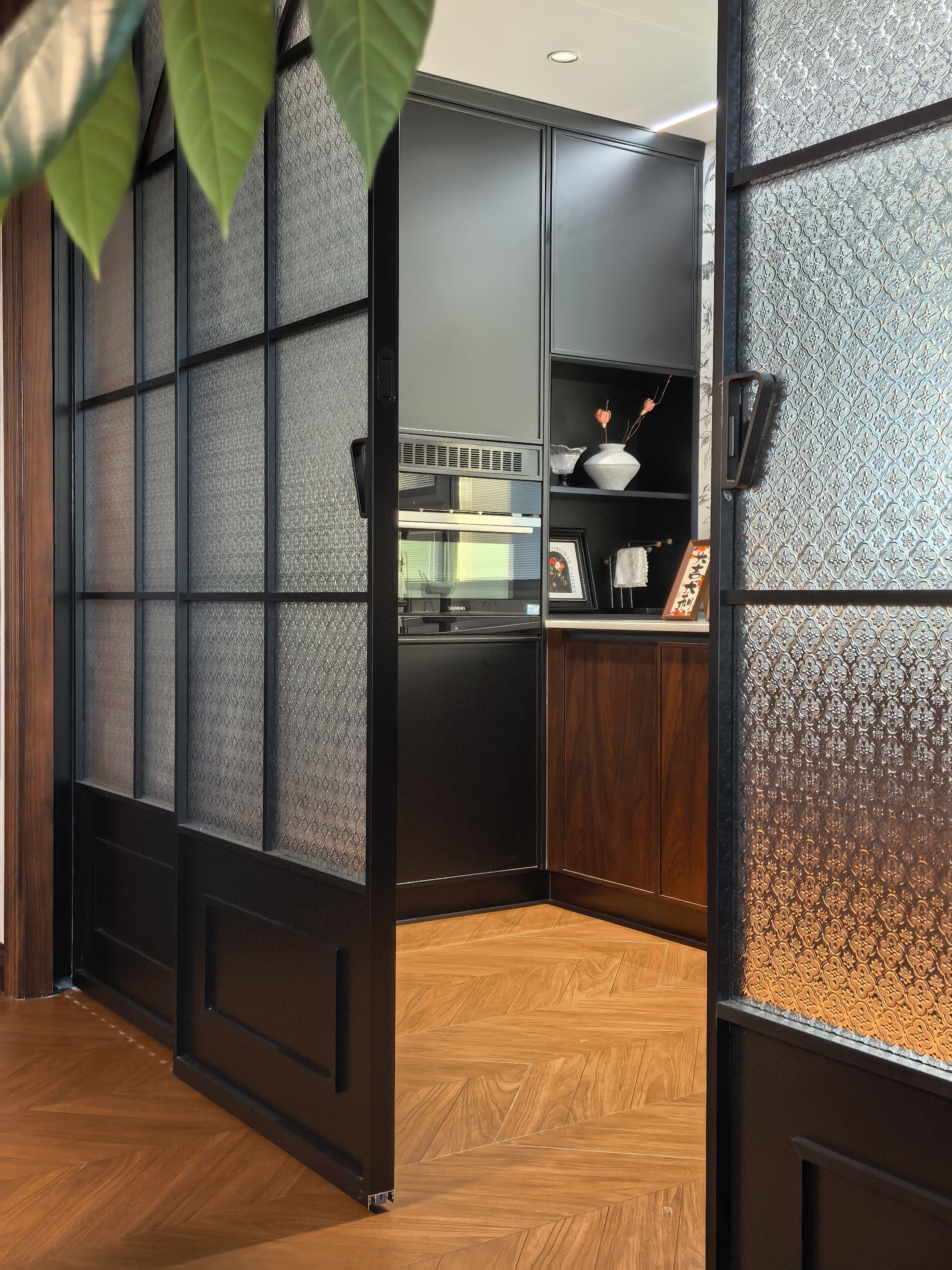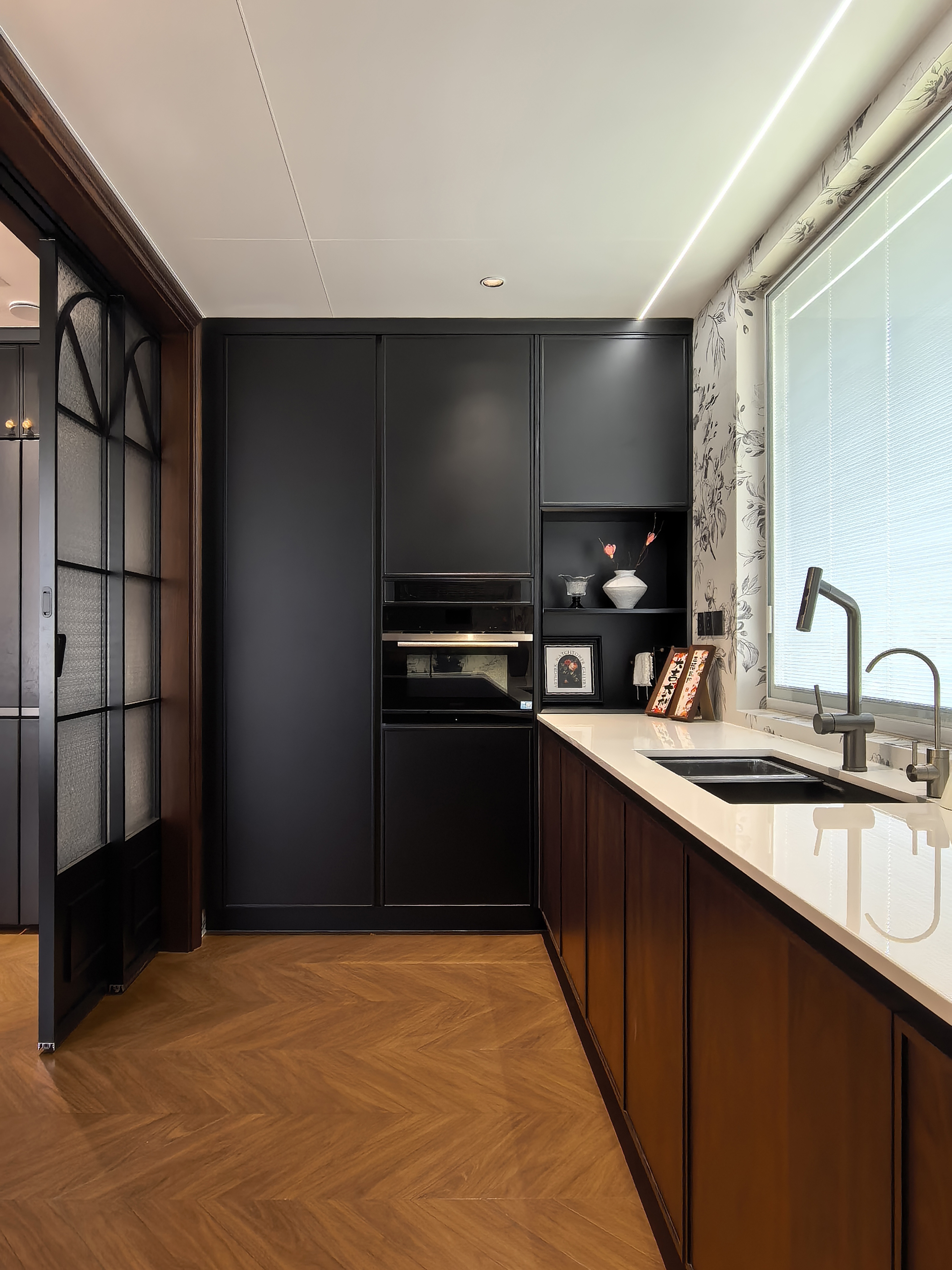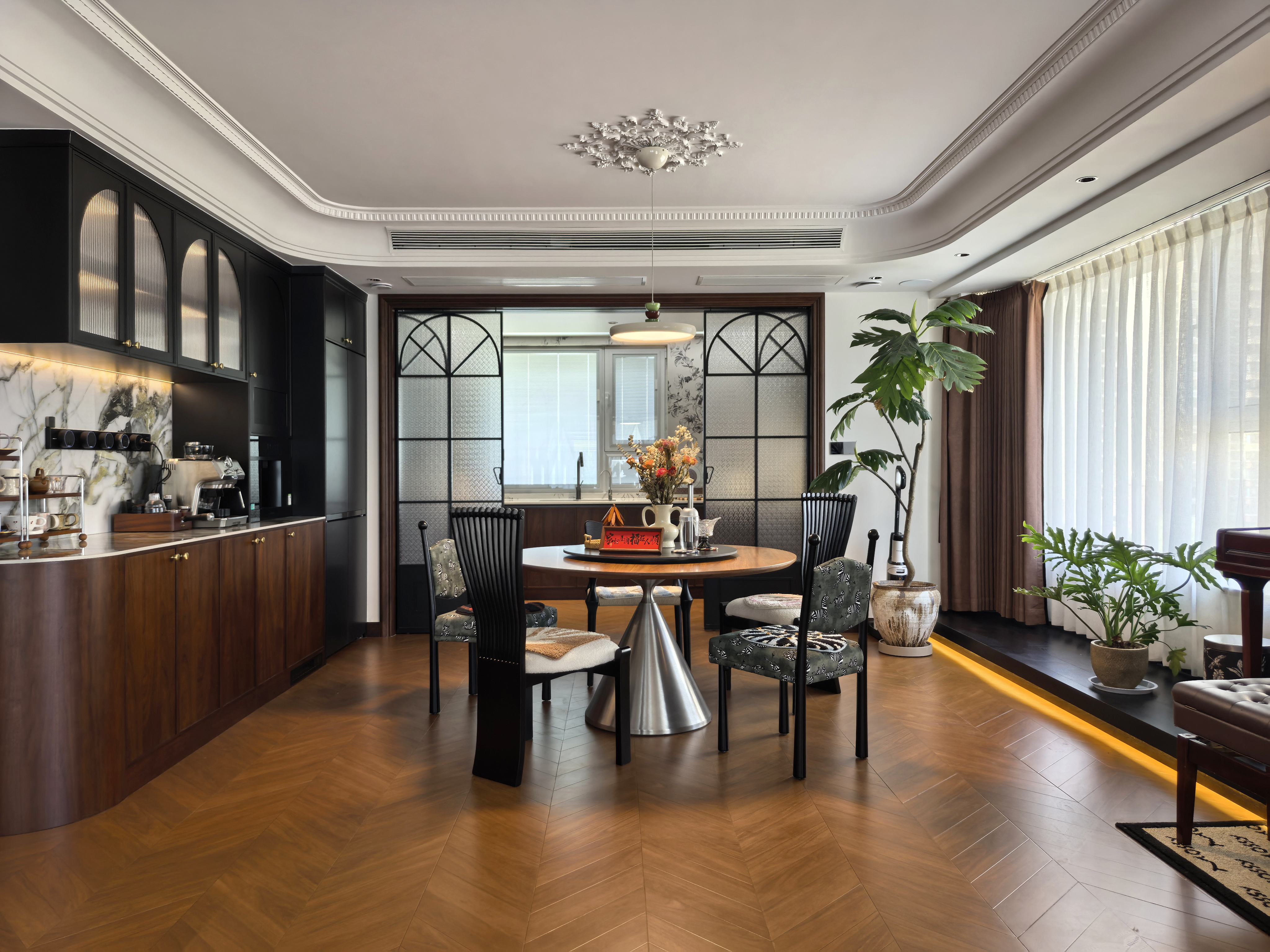 空间布局:空间布局上,采用空间开放公用的布局思路。客餐厅作为连通空间,同时连通里阳台和厨房(口袋门打开后形成开放式格局),配合上客厅和阳台的大面积采光窗,增加了空间的开阔感。客厅大飘窗拆除后,发现下面有承重地梁,因地制宜的做了暗藏灯带的木质地台,黑色橡木纹的地板配上暖色灯带极具质感。采用大主卧布局方式,凸显主人地位,主卧室配有衣帽间、卫生间。