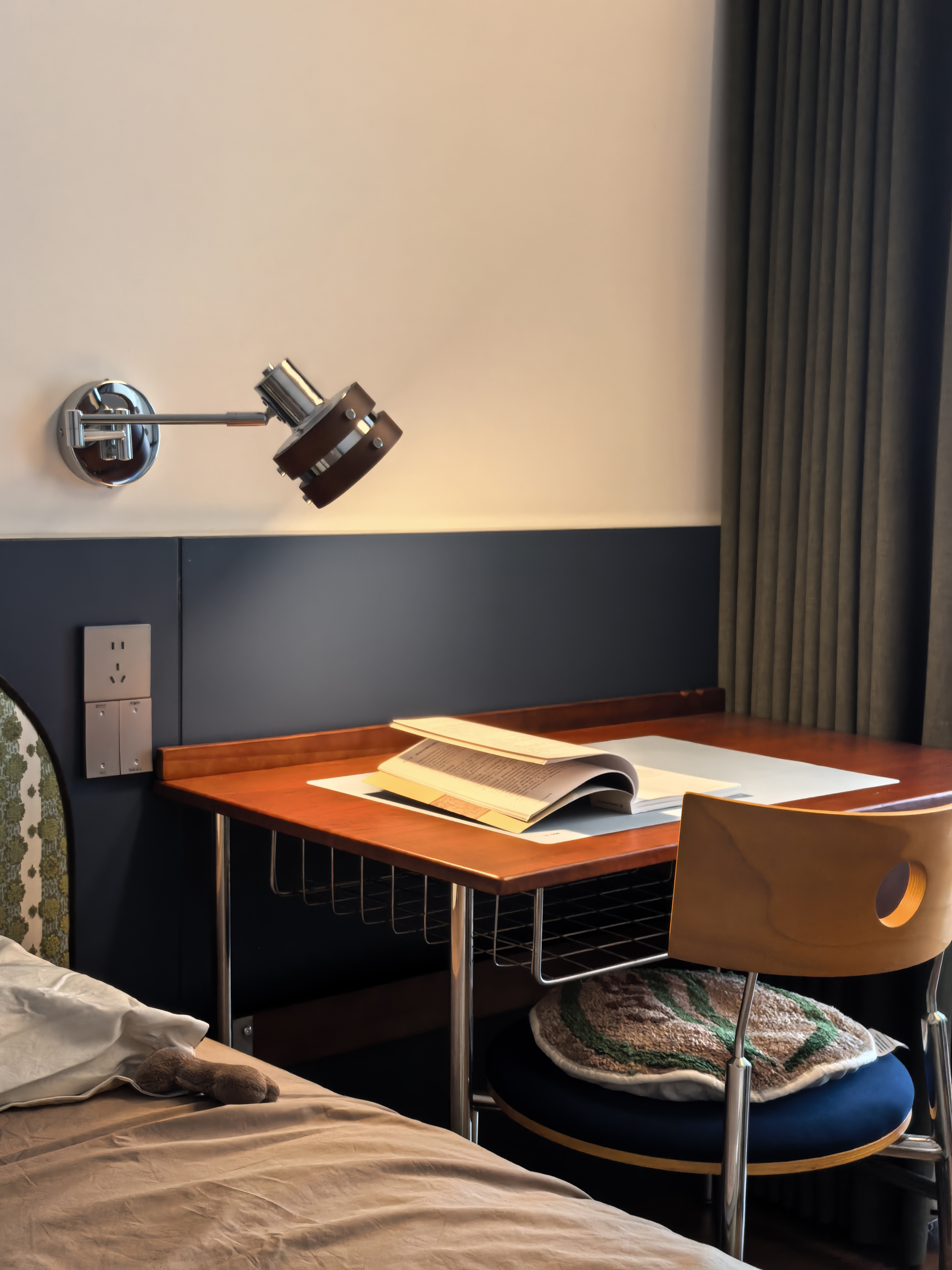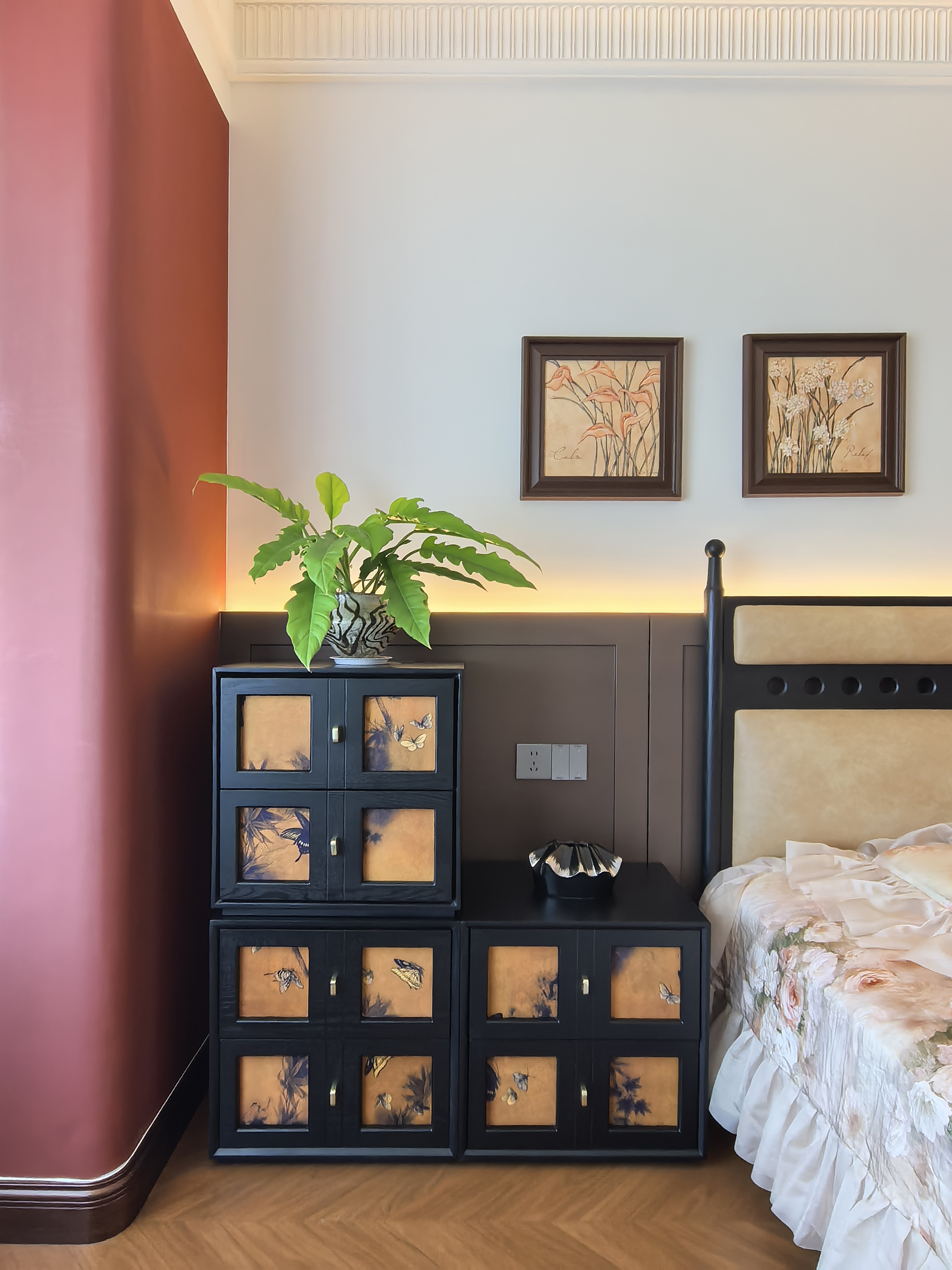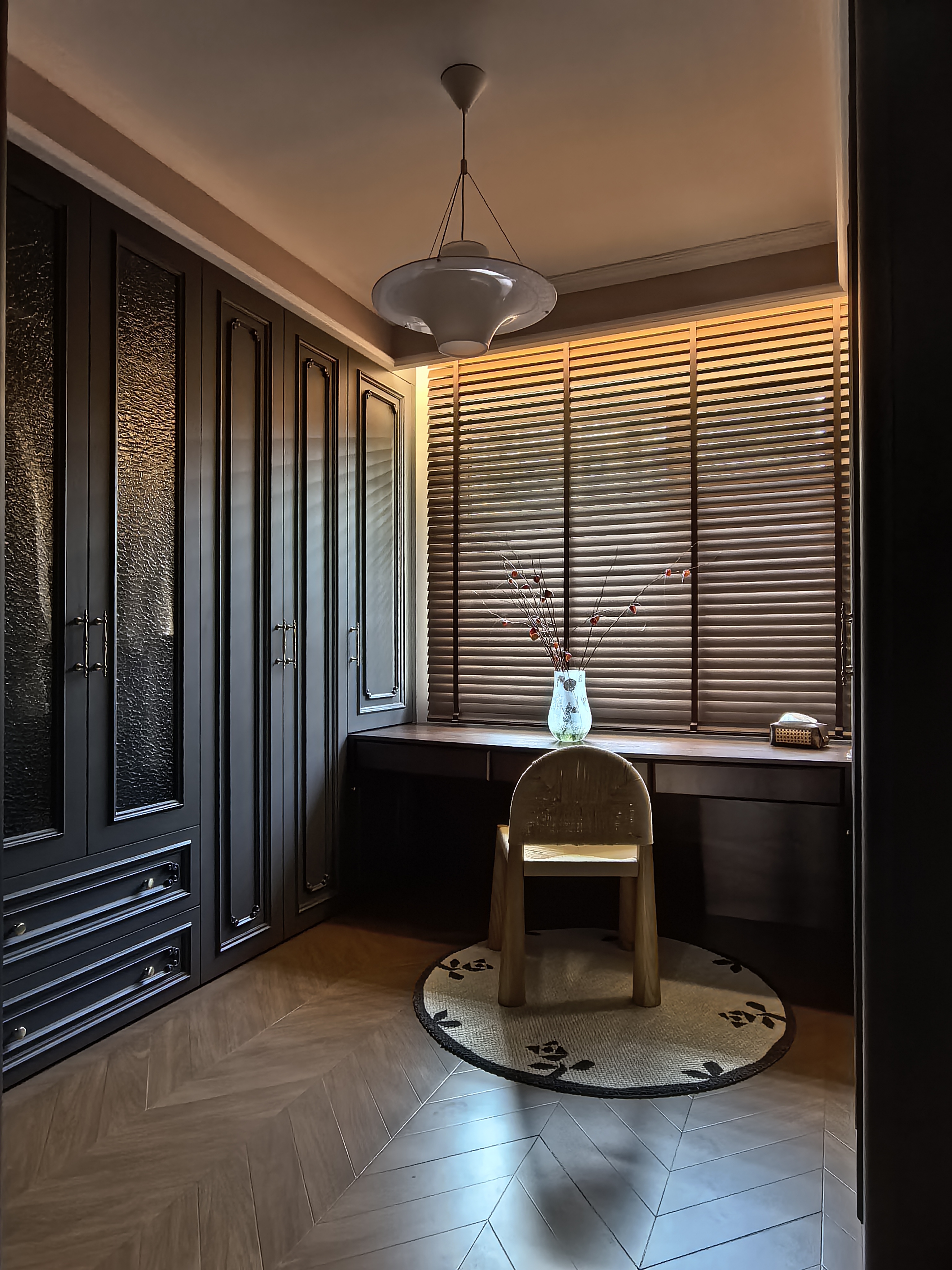 设计选材:定制上采用板油结合,兼顾质感及性价比,地面用复古瓷砖加工仿鱼骨拼木地板,确保了使用的便利性耐用性。全屋艺术漆使环保得到保障。