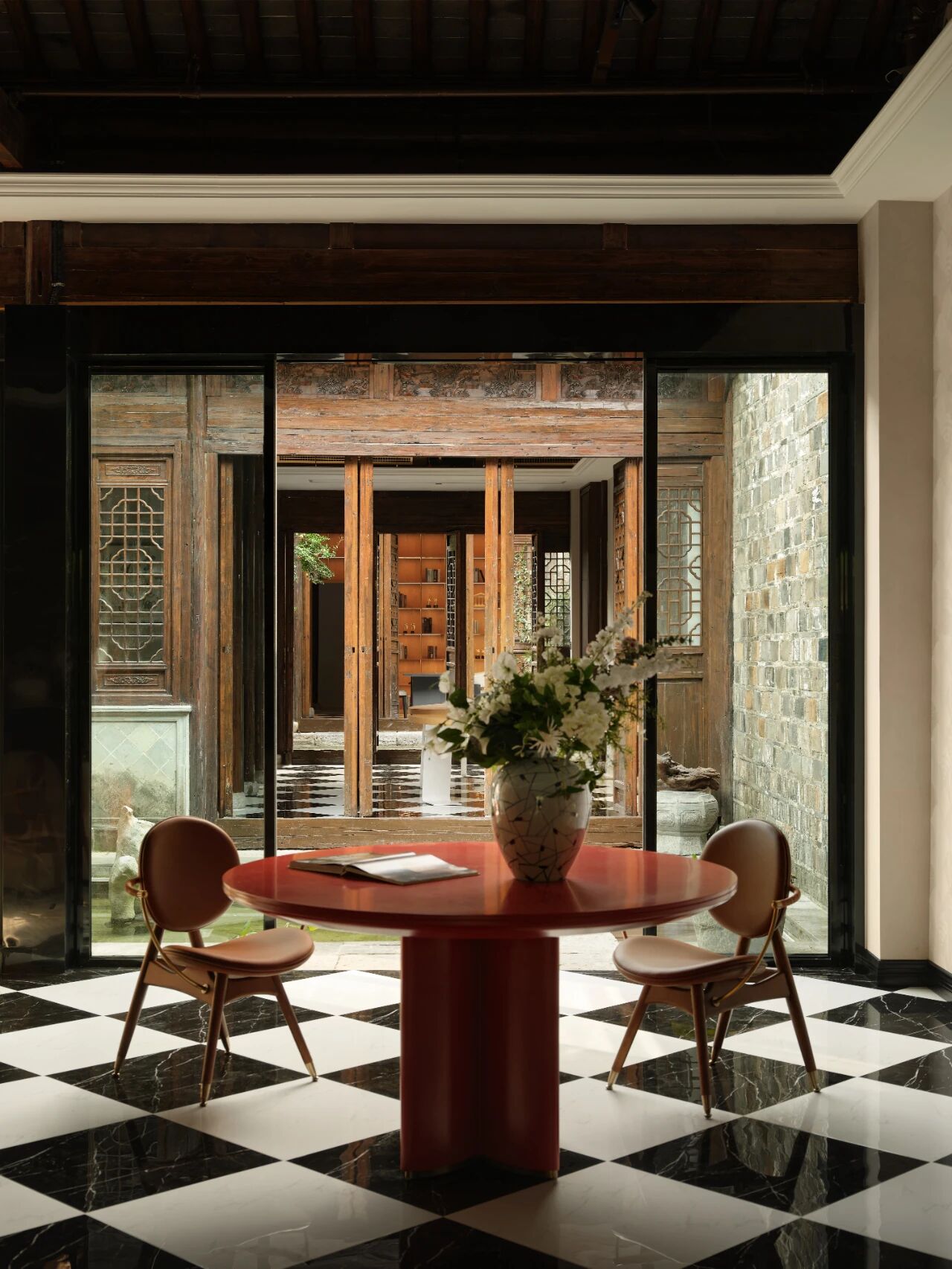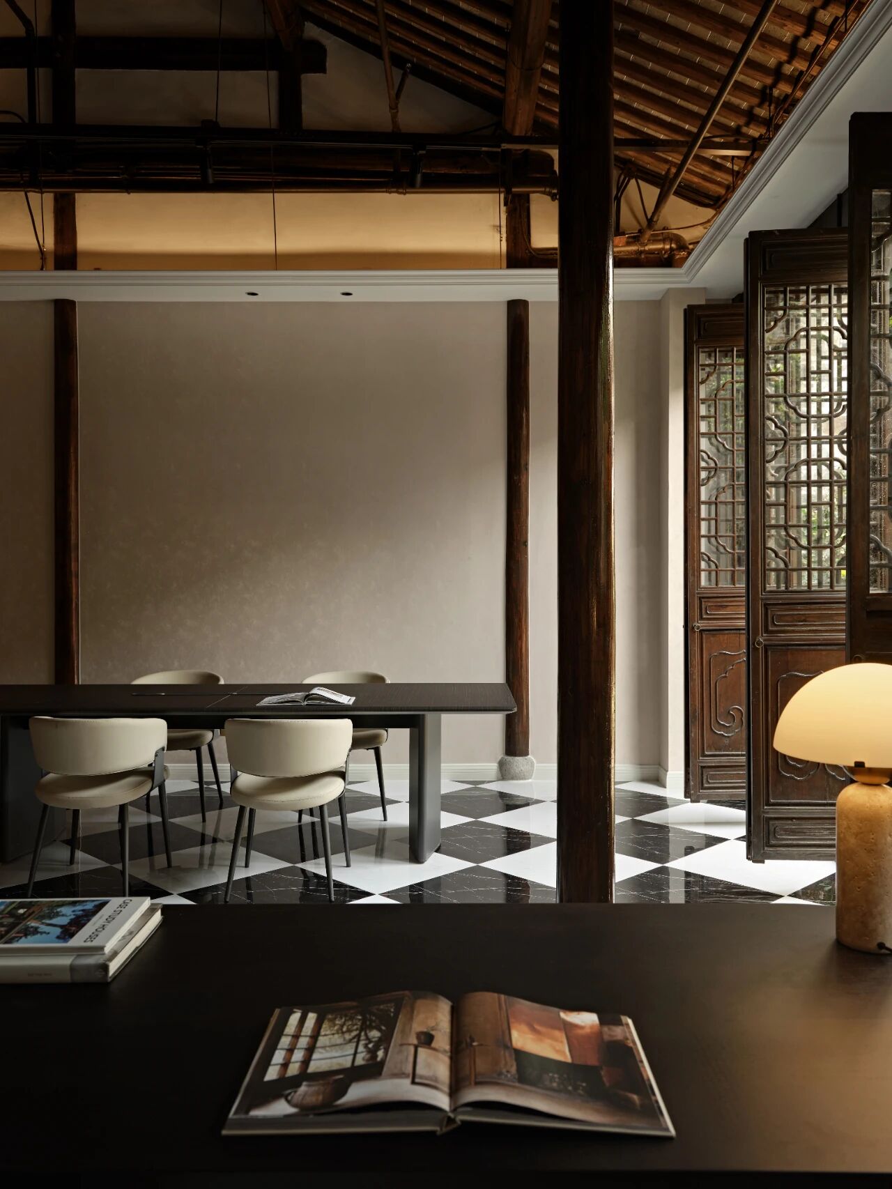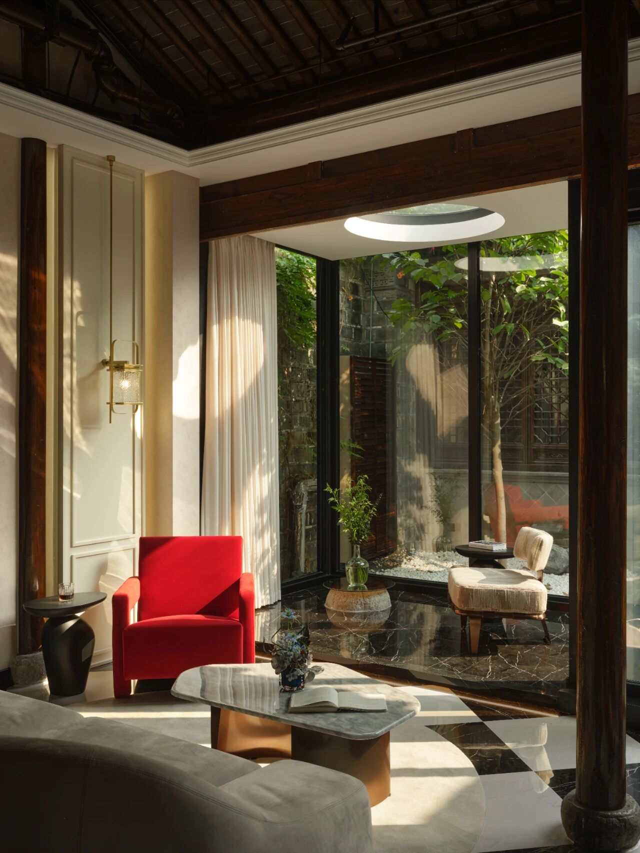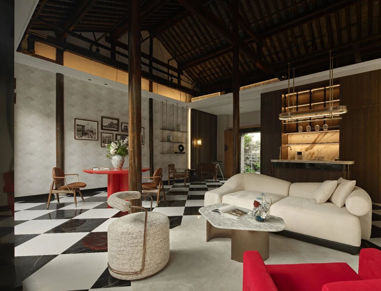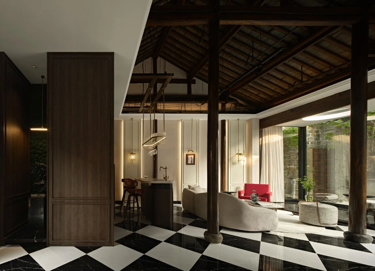 项目定位:本案坐落于南京地标位置老门东,建筑本身是个传统中式民居三进院的形制,因为商业属性,我们商定做成海派复古的内装风格,于是就有了中西合璧的海派复古风,在中式建筑的框架里边做一个西洋调性的空间氛围。我们在做内装设计的时候想尽量保留原建筑的梁柱结构,所以除了设备和氛围灯光,其他都是原建筑结构