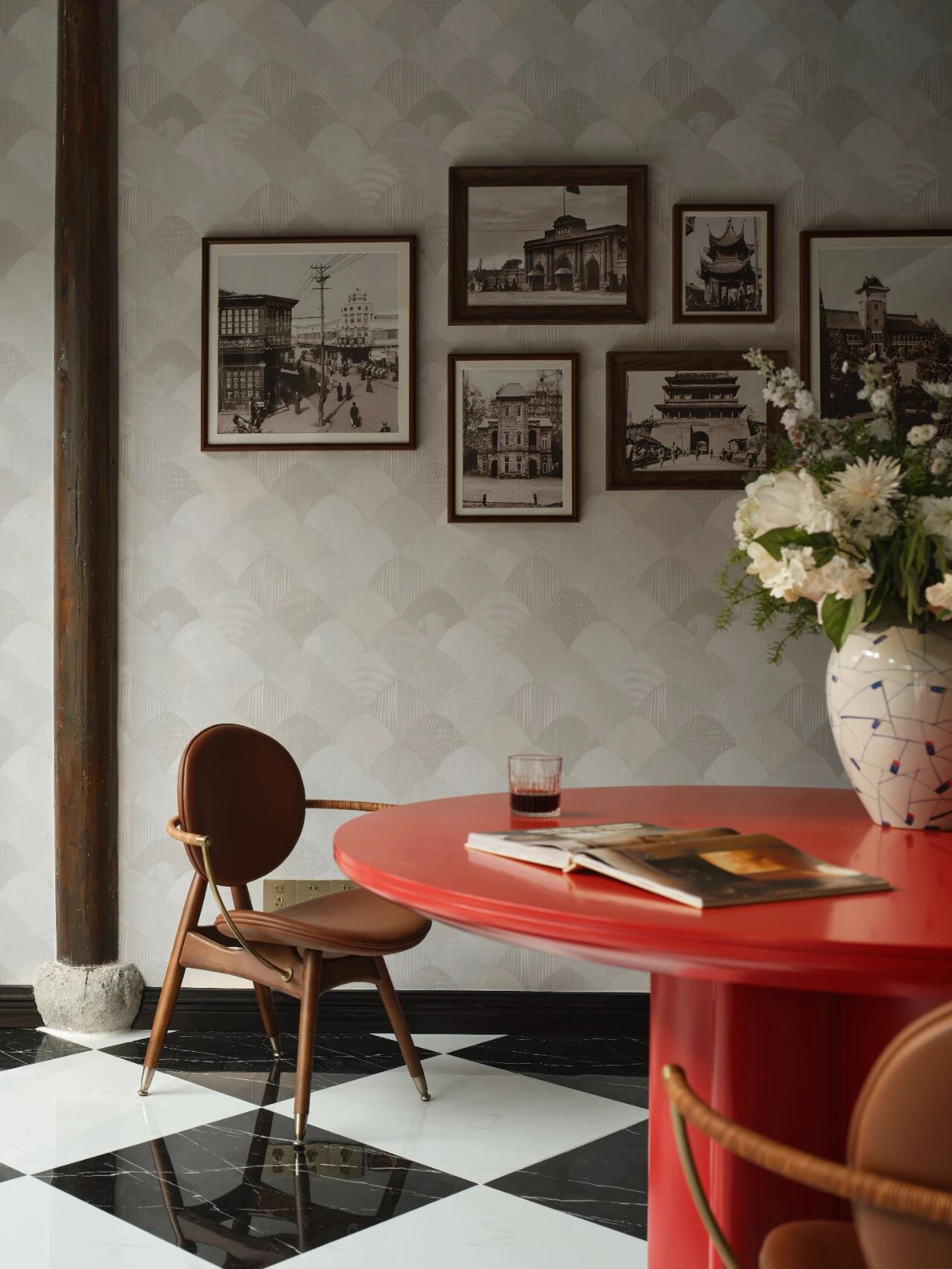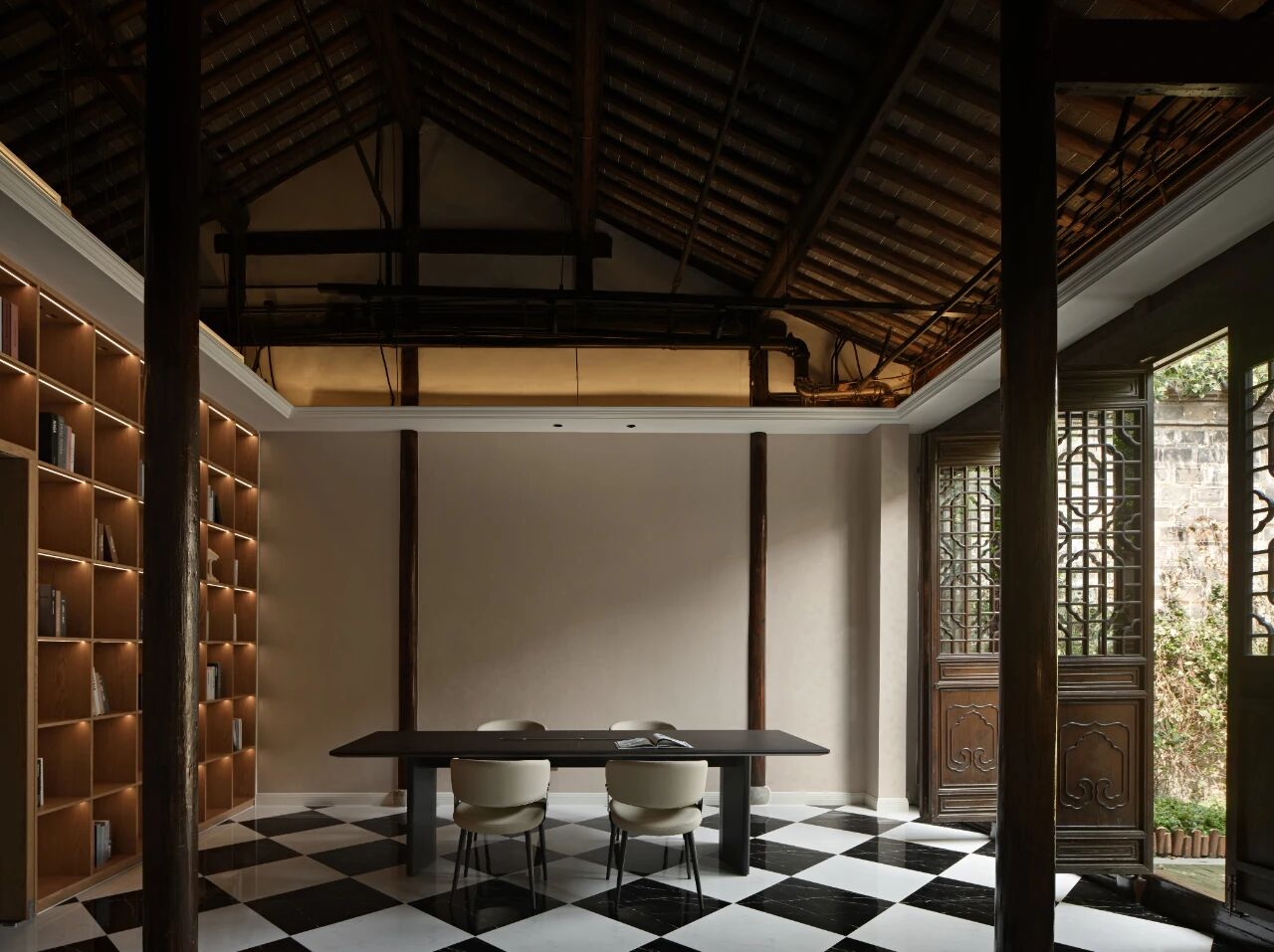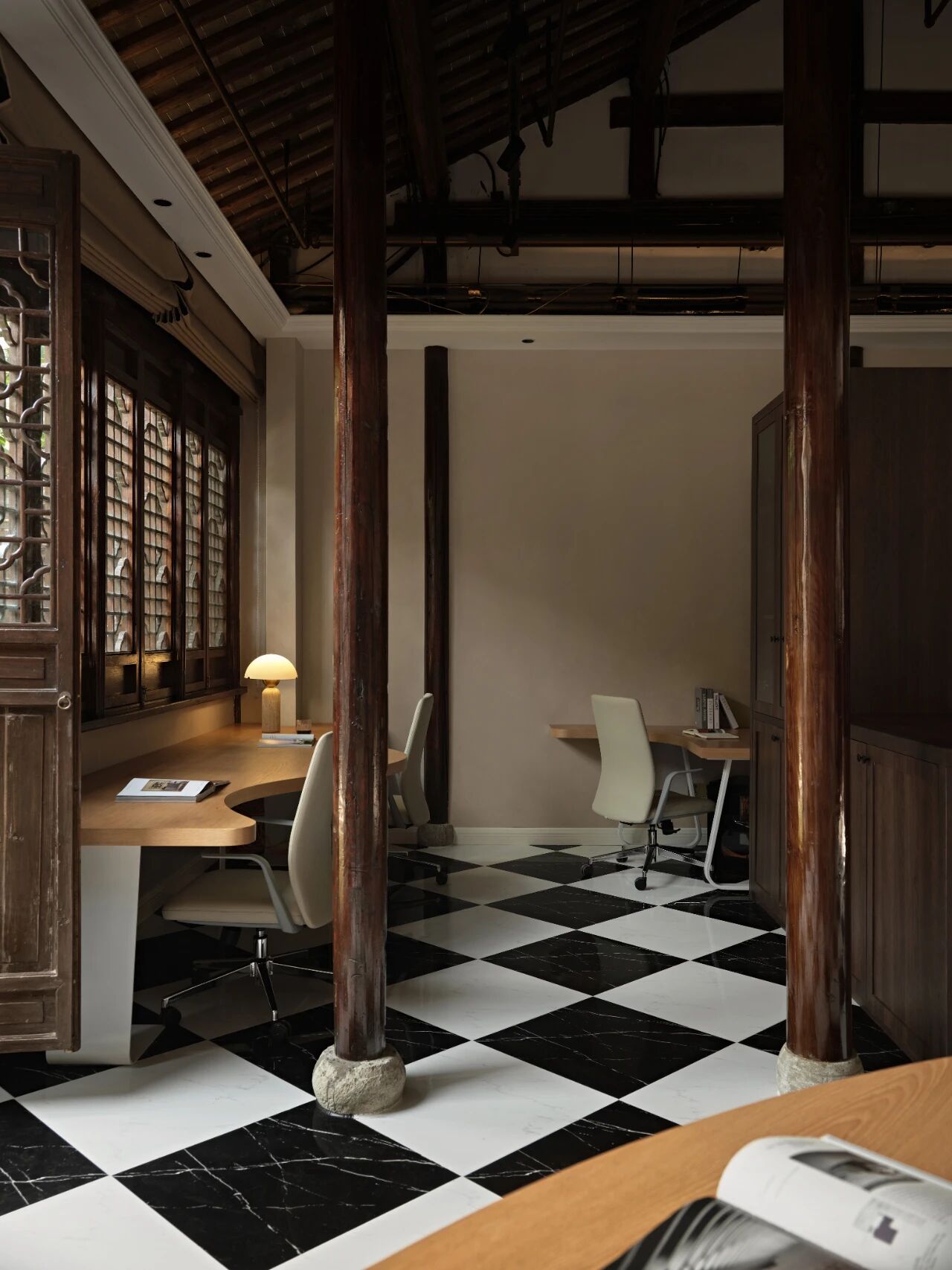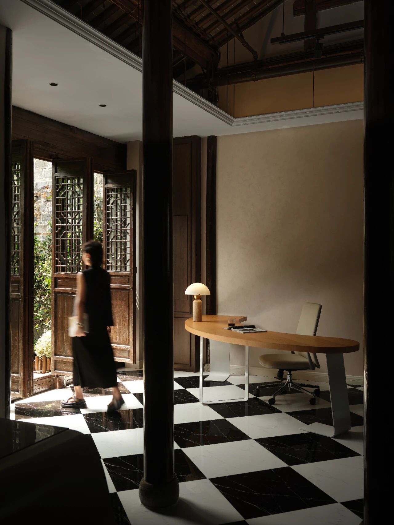 项目定位:本案坐落于南京地标位置老门东,建筑本身是个传统中式民居三进院的形制,因为商业属性,我们商定做成海派复古的内装风格,于是就有了中西合璧的海派复古风,在中式建筑的框架里边做一个西洋调性的空间氛围。我们在做内装设计的时候想尽量保留原建筑的梁柱结构,所以除了设备和氛围灯光,其他都是原建筑结构