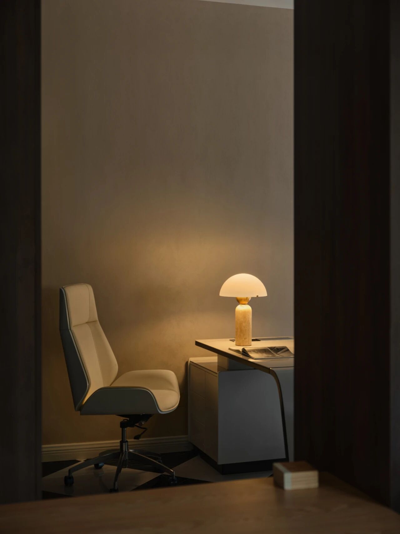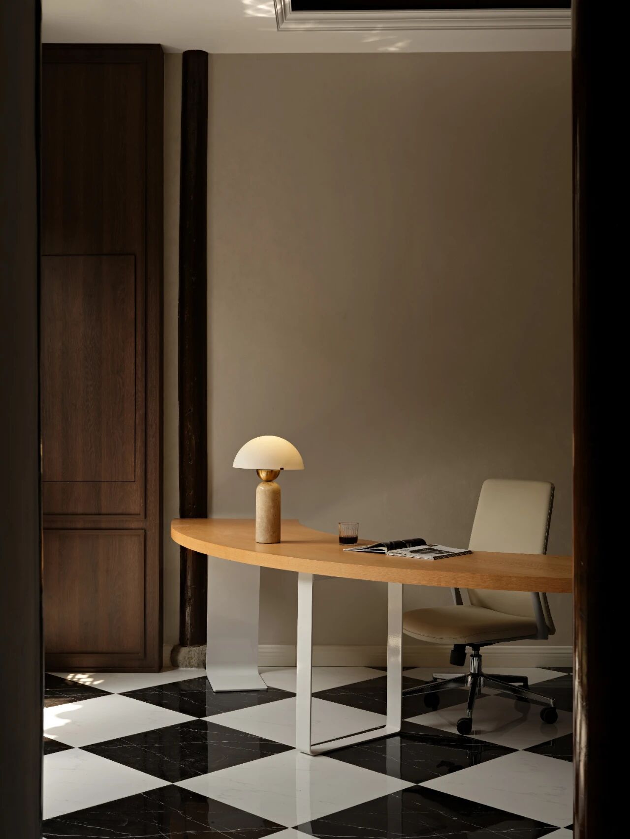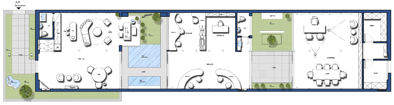 空间意境:一进院作为接待厅,进门利用旁边的卫生间和水吧柜的进深做成进门的玄关区,用深色的木饰面做出空间的场景区分,再加上上下通顶的壁灯,进门左手边的绿植墙,进门的仪式感做足。其次,进门我用中国红的圆桌作为进门的视线落脚点,既是热烈的海派风格的点睛之笔,也是进门的对景。二进院是办公区,打破传统的格子办公桌,改成流线型的办公空间,主要为了打破通直的过道的感觉。三进院是总经理办公室,用一整面到顶的书柜,定调有人文素养的空间。