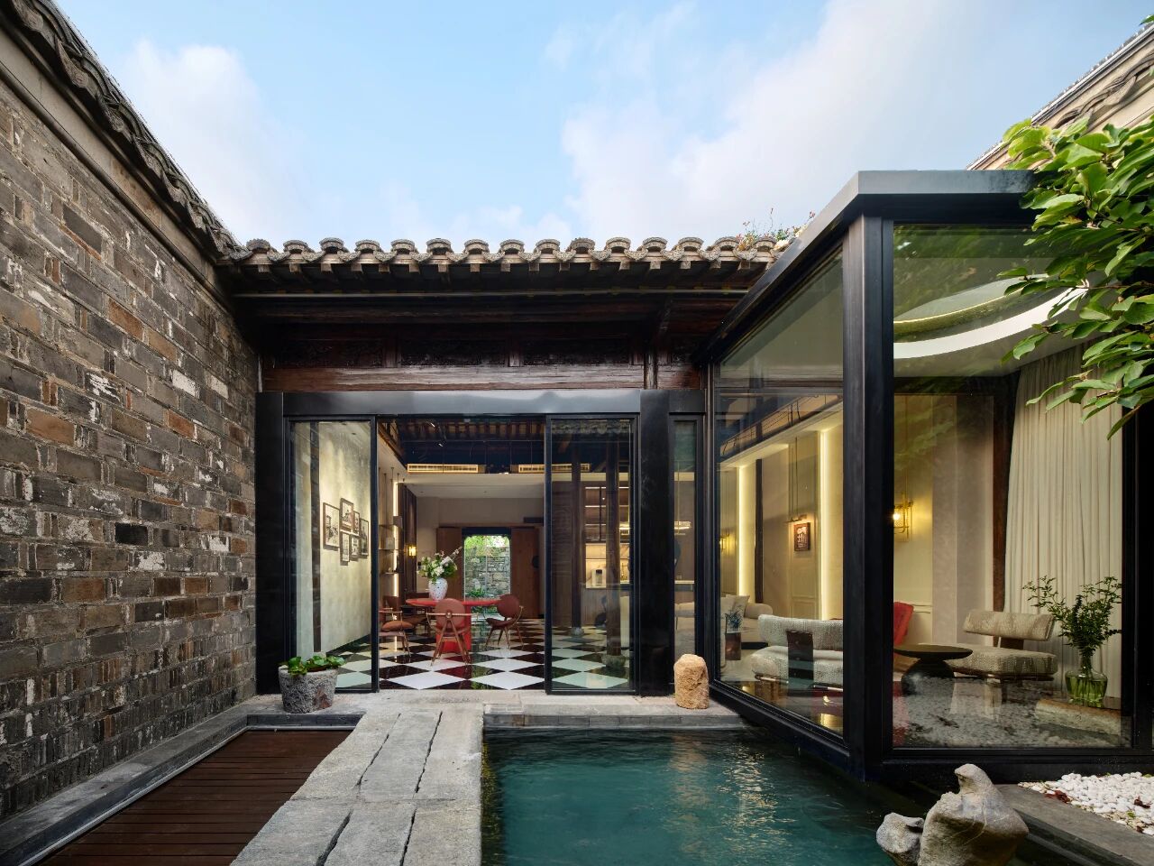 空间布局:在第一进院,也就是我们的接待厅,里边原来有个古井,我们把这个古井在上面加了一块玻璃,做成了边几,第二进院里边有水池,我们用玻璃房子把建筑架到了水池里,就形成了像悬浮于水上的亭子的感觉。