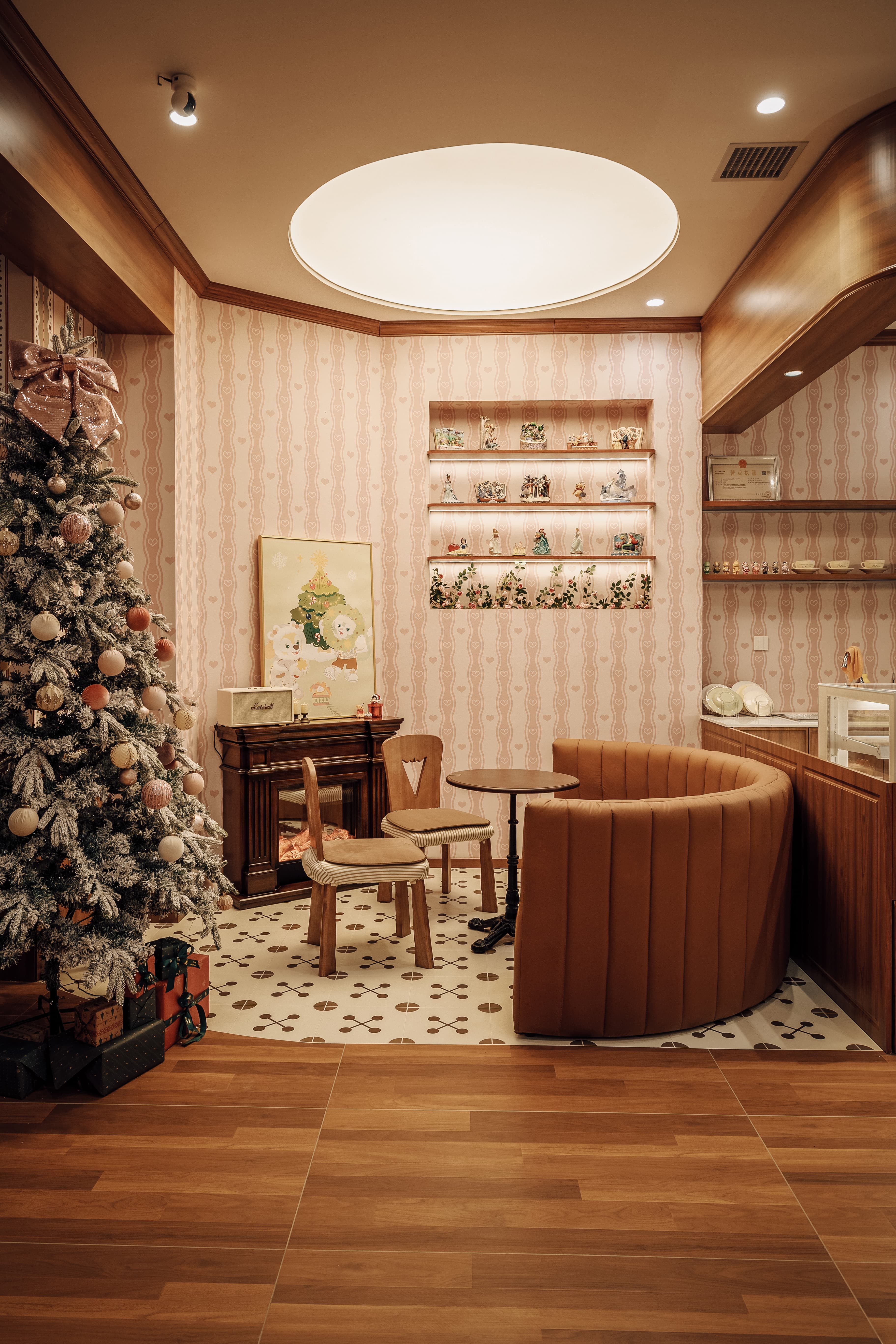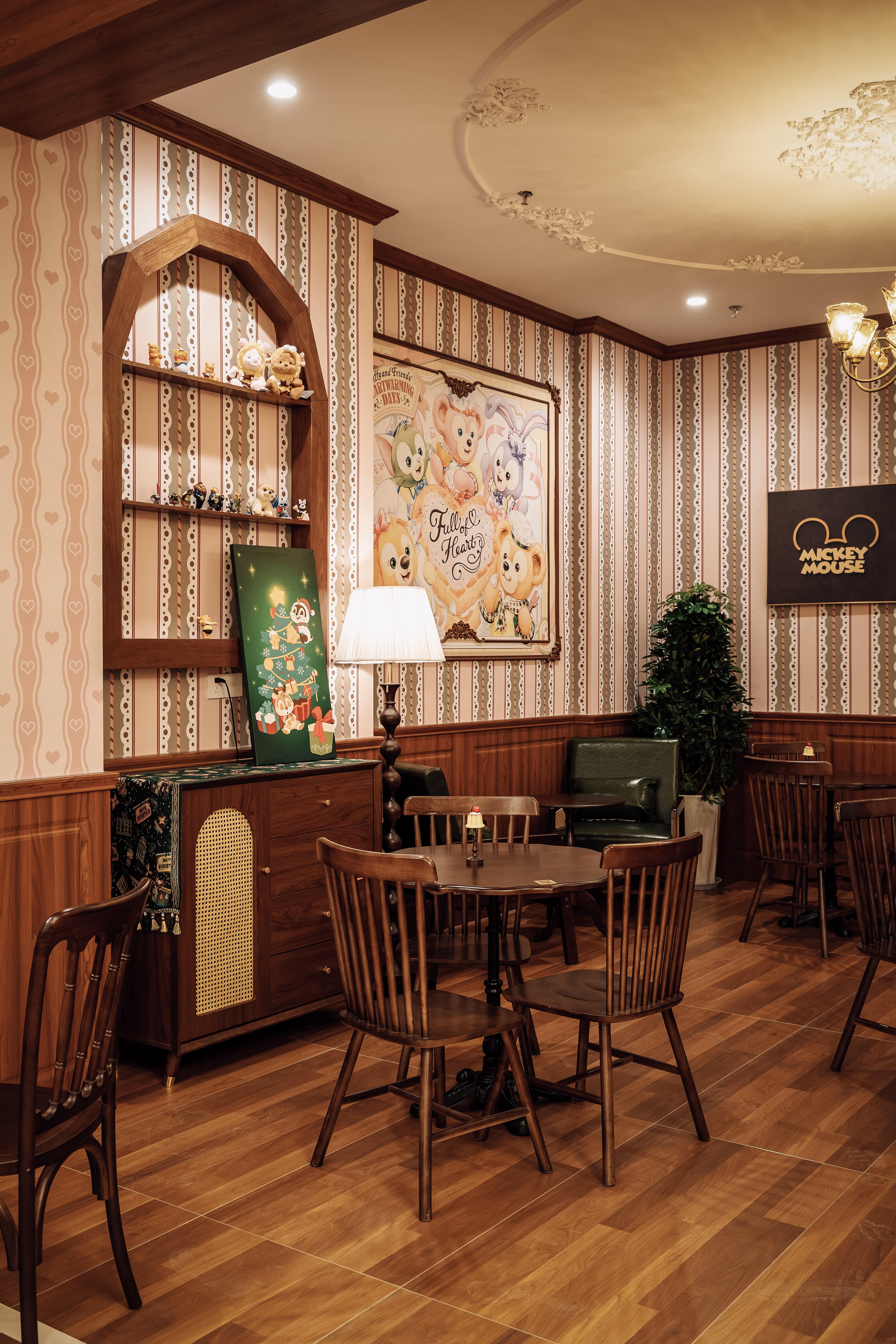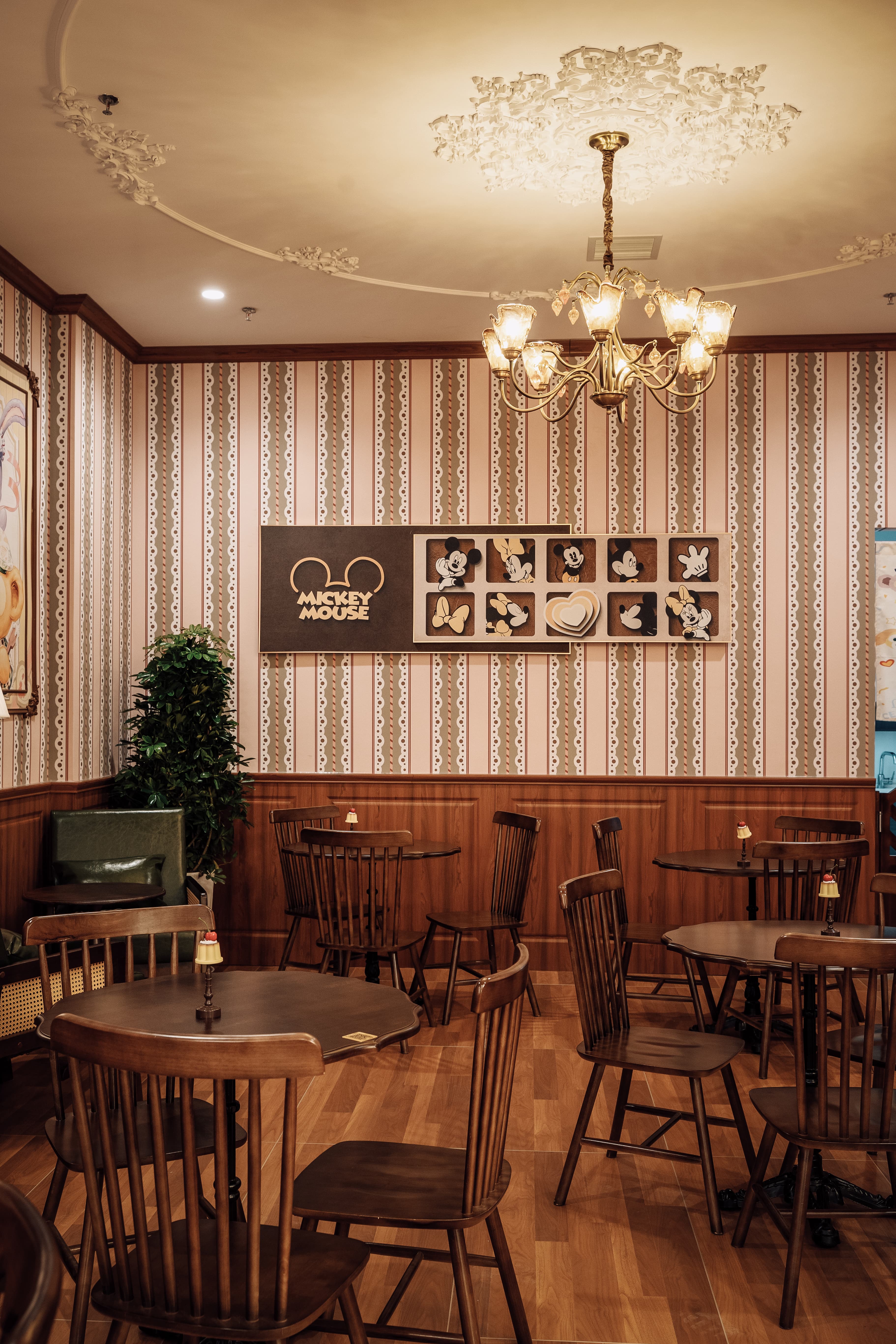 2. 做变墙面做木框线条与拱门形木框装饰架放装饰摆件,作为造景区域,造景前放置大型玩偶摆件凸显店面主题。 3. 左墙做木质法式线条框架中间做定制迪士尼壁画。