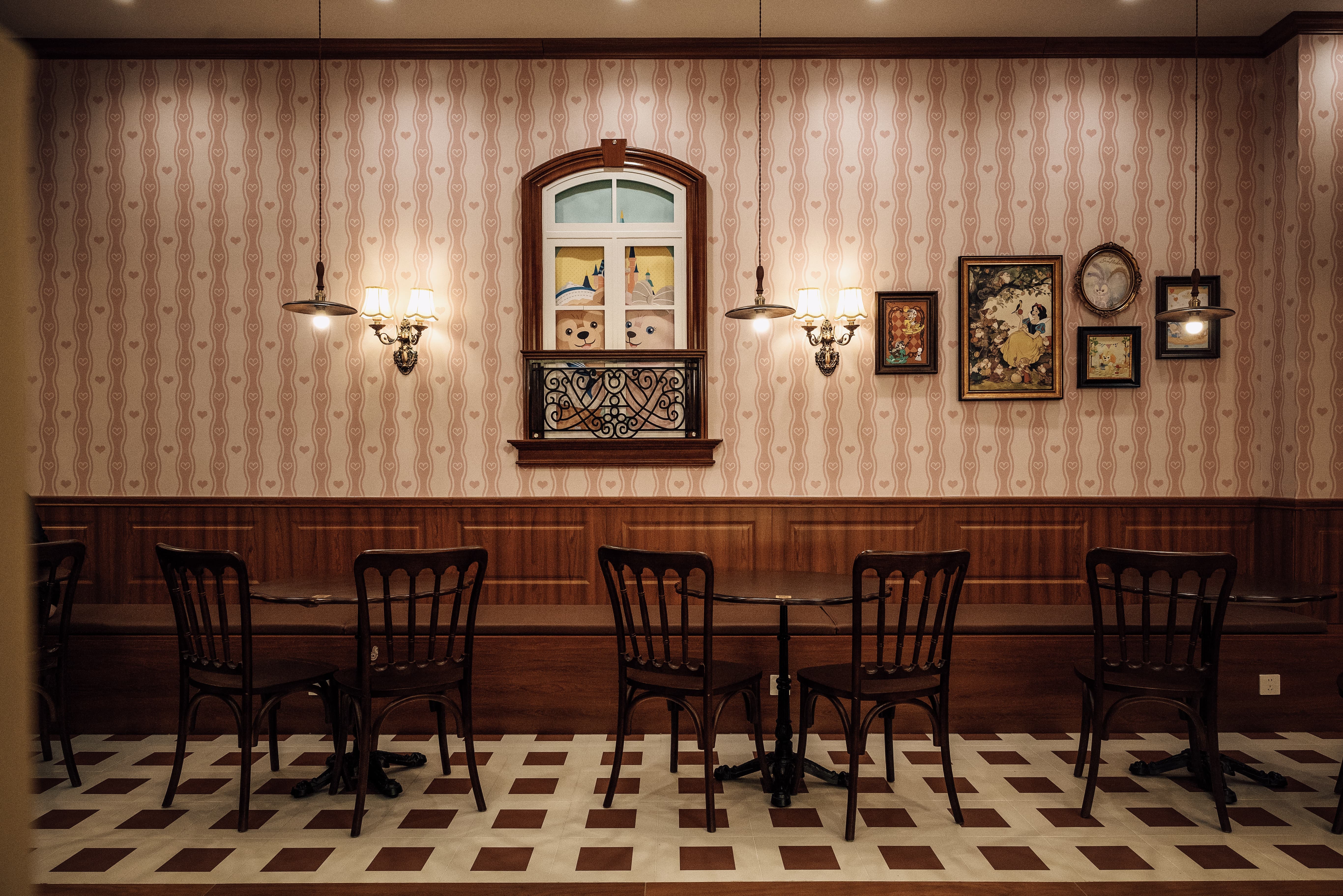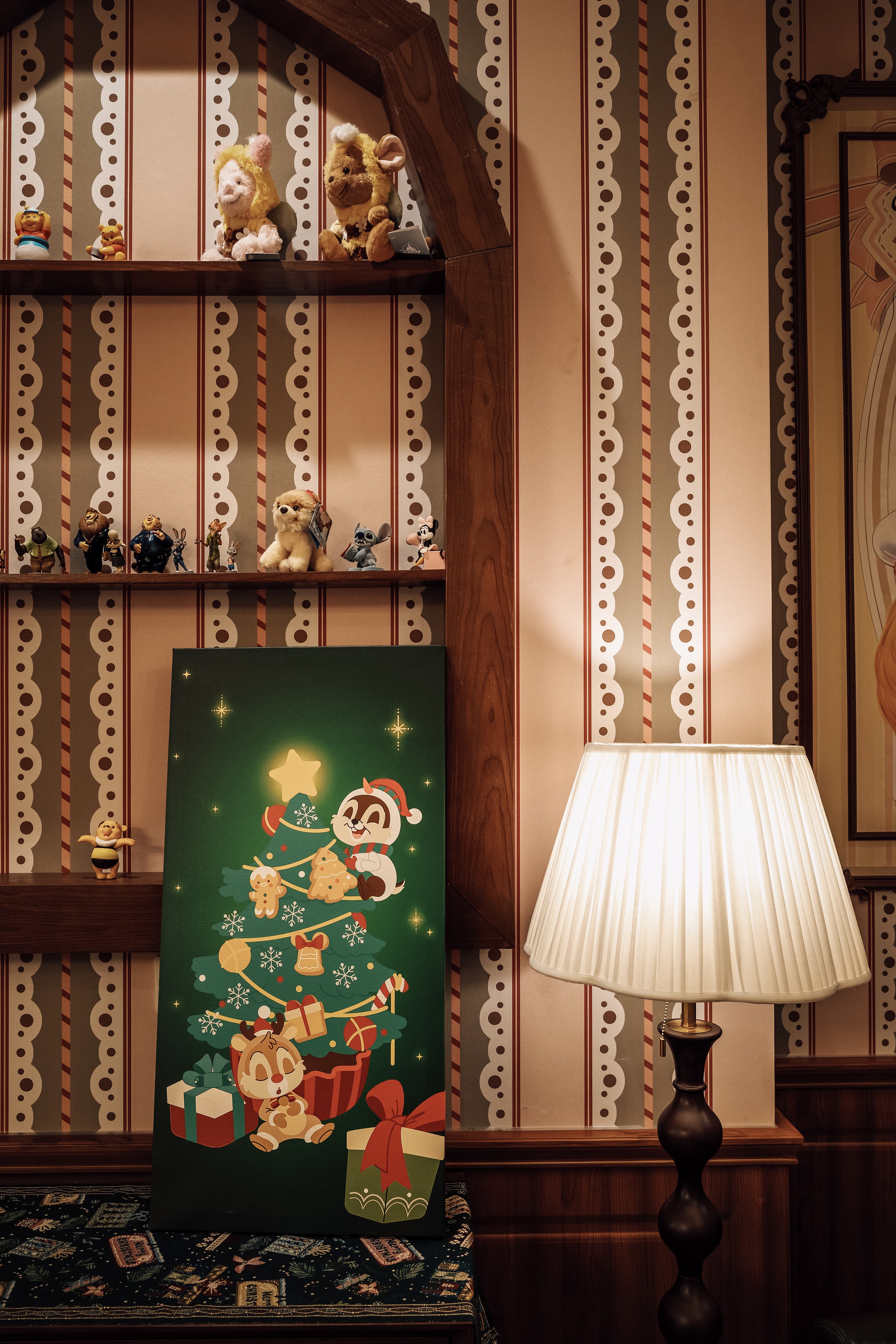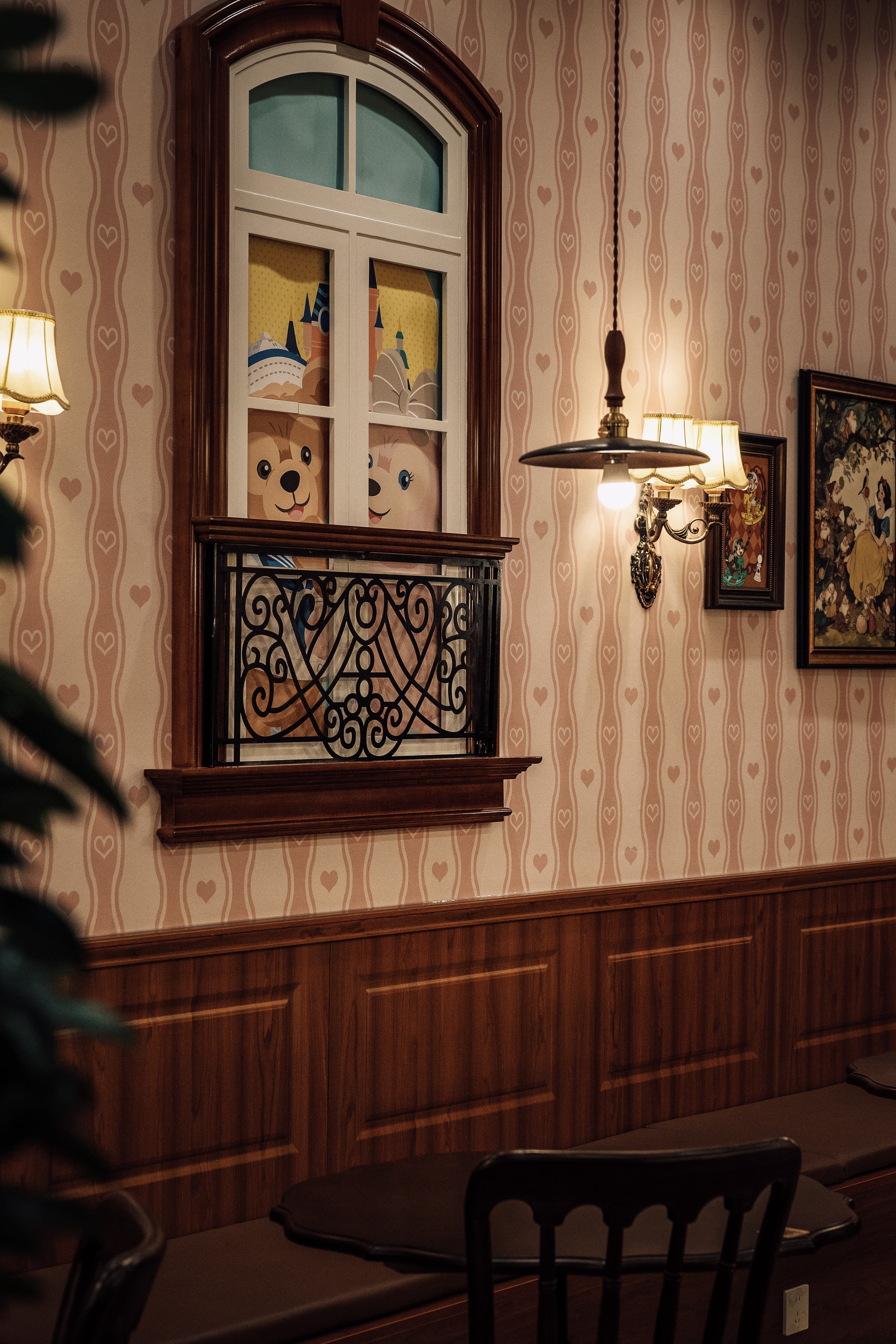 2. 做变墙面做木框线条与拱门形木框装饰架放装饰摆件,作为造景区域,造景前放置大型玩偶摆件凸显店面主题。 3. 左墙做木质法式线条框架中间做定制迪士尼壁画。