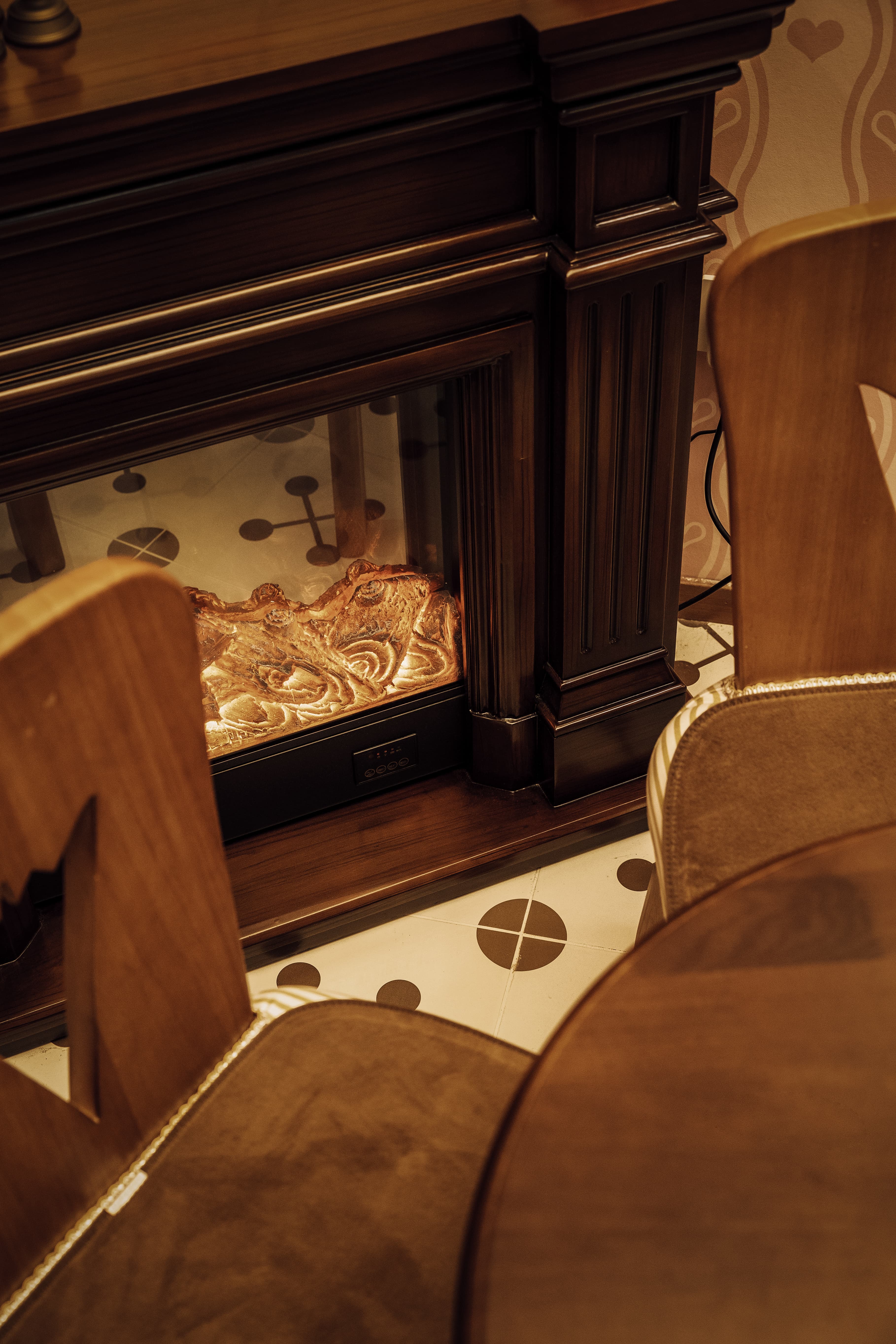 4. 吧台右侧做下沉圆形卡座区域,供多人顾客娱乐,斜墙位置做定制法式壁炉,内凹钢结构主体包裹墙纸做三层置物板放装饰摆件。 5. 吧台地面做分色花砖。