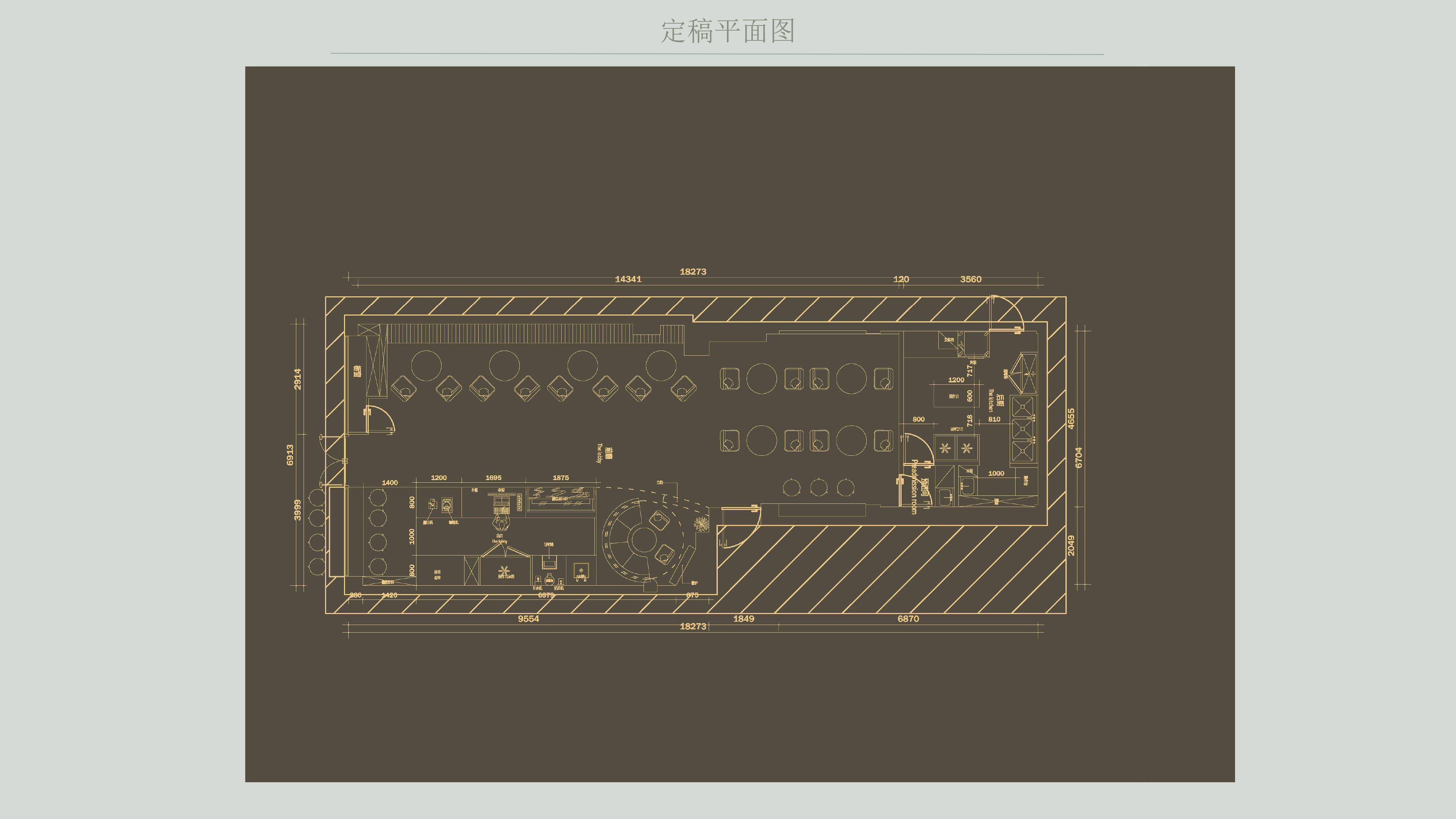 1. 散客区吊顶前口做假梁木饰面包裹做为空间分区,中空区域做法式灯盘周边做PU线条弧形穹顶铺贴装饰画。