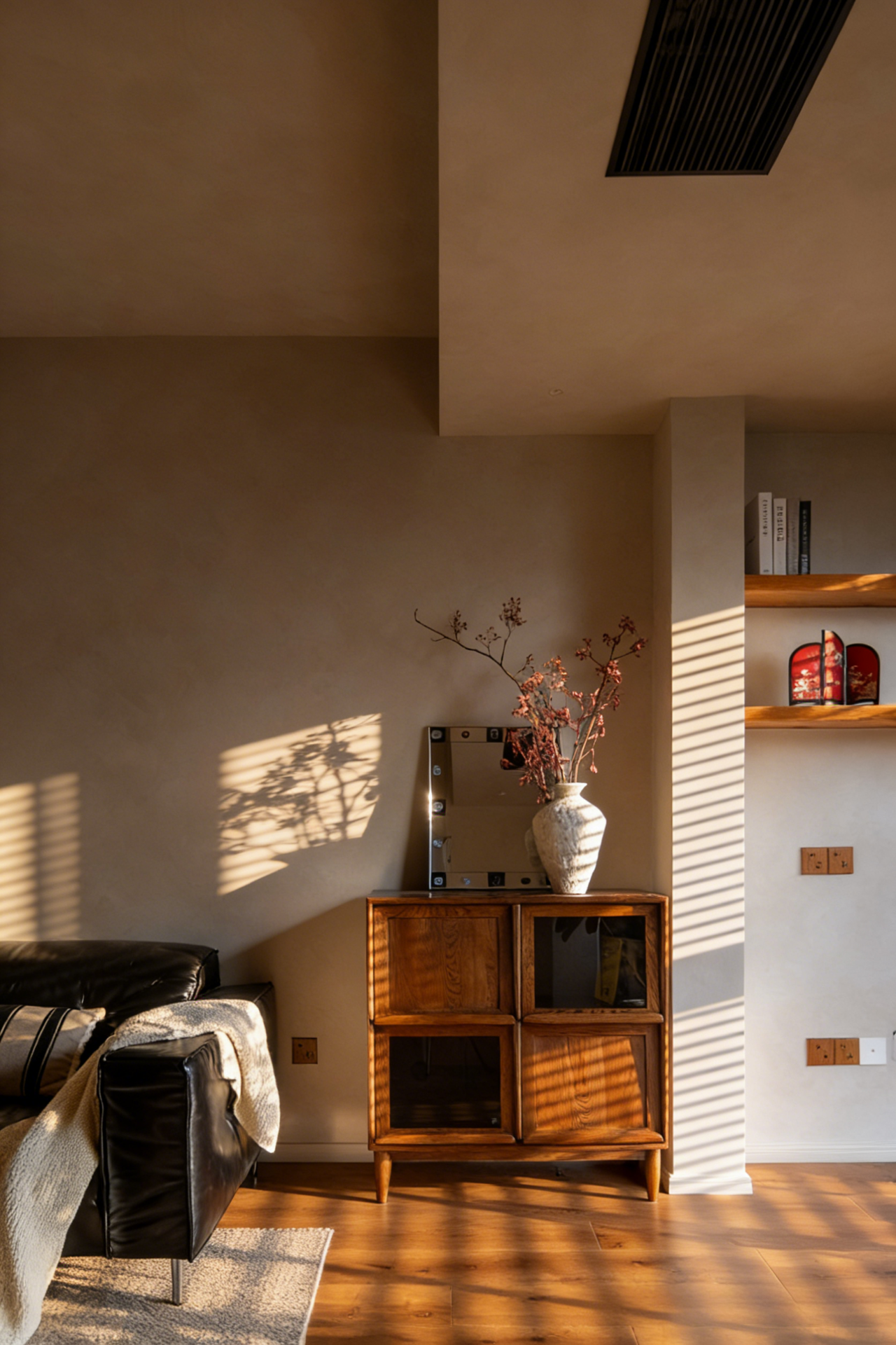 空间意境:创新点1:时间性场景:空间不再是固定场景,而是随日光推移变化的“光影剧场”。木百叶成为“光的画笔”,在艺术漆墙面与深色地板上绘制从清晨到日暮的连续光斑动画。