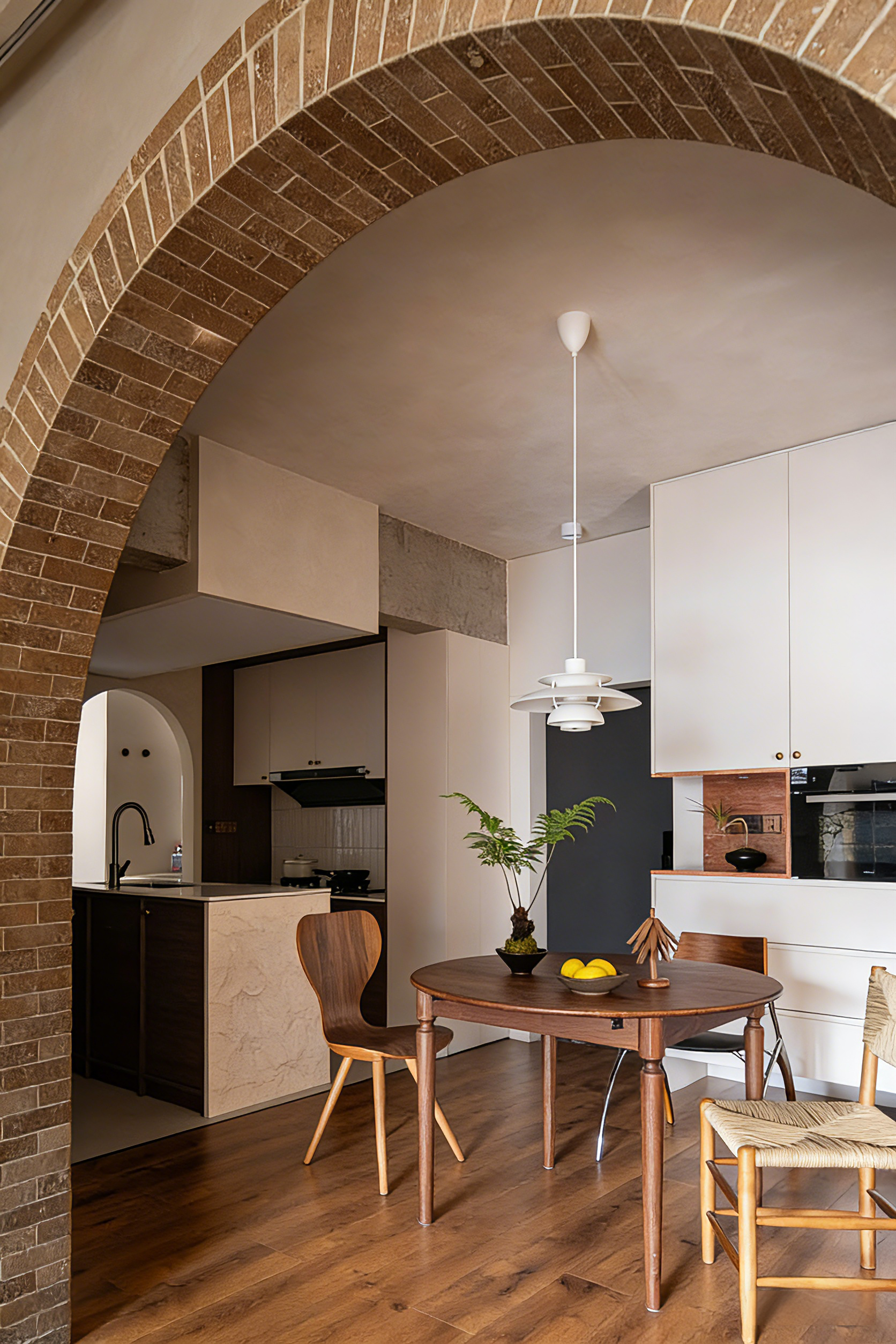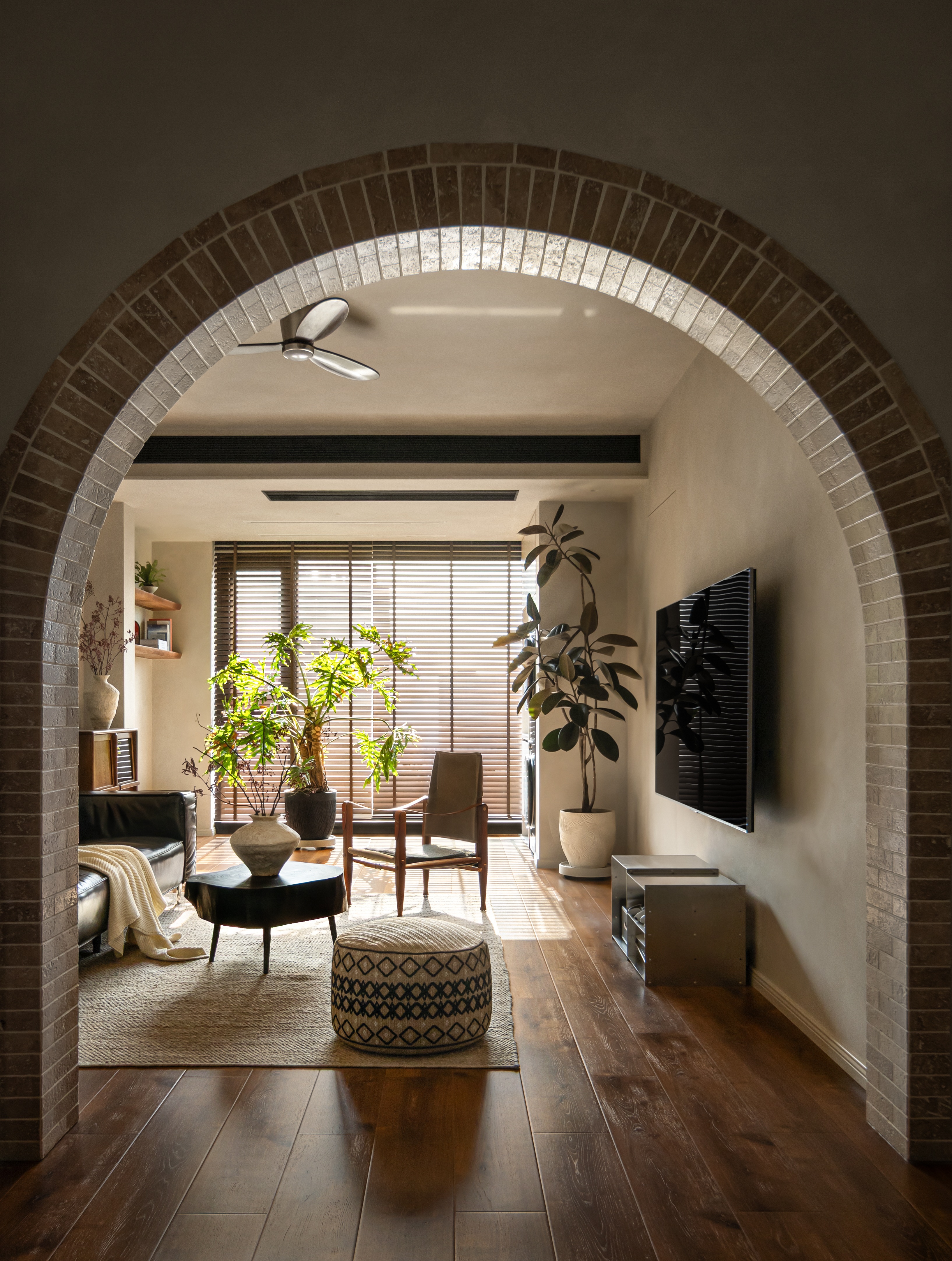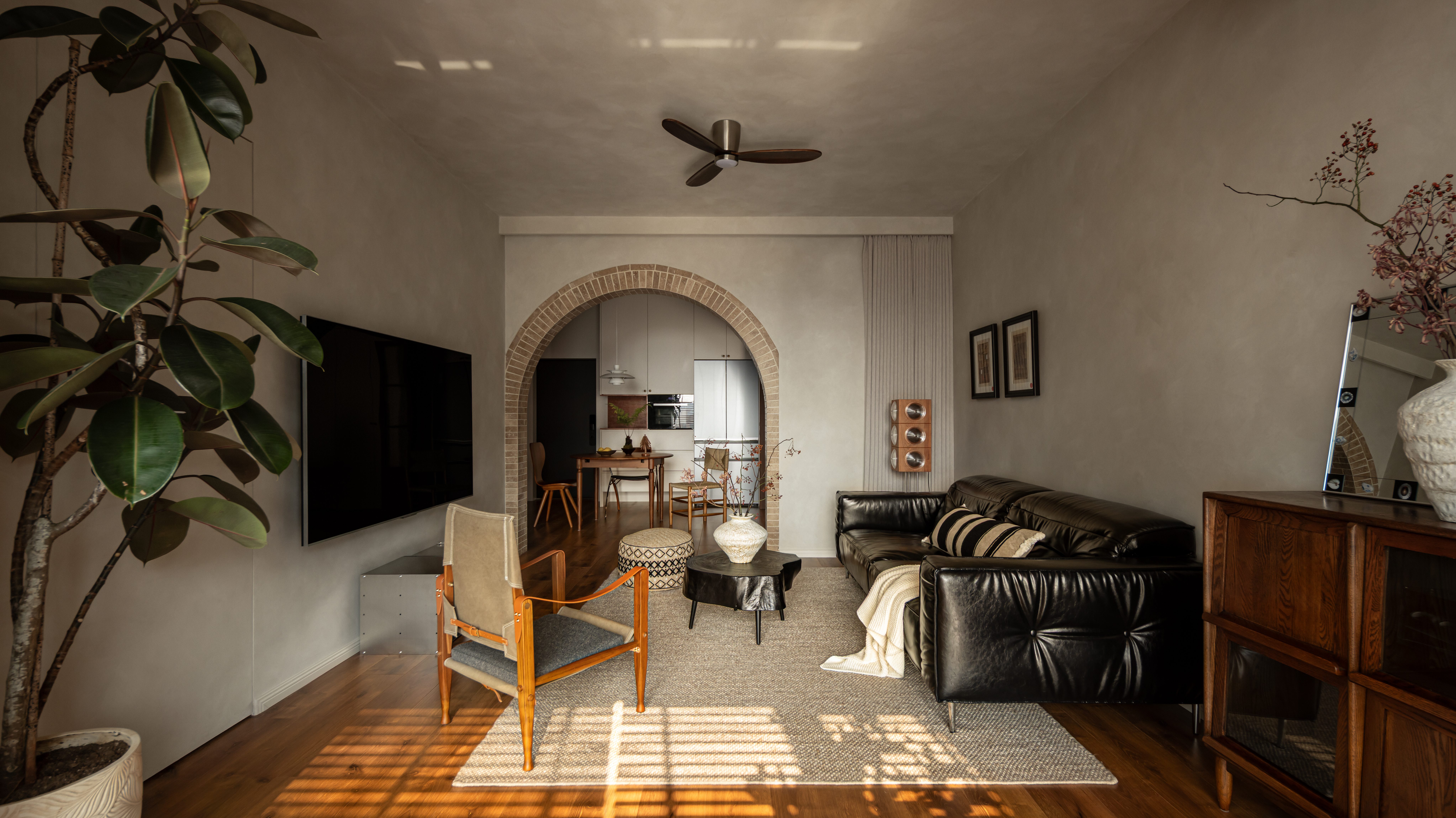 走过玄关,便进入了客厅区域,一道砖砌圆形垭口巧妙分隔区域,柔和曲线打破了直线的单调,也为空间增添了仪式感。