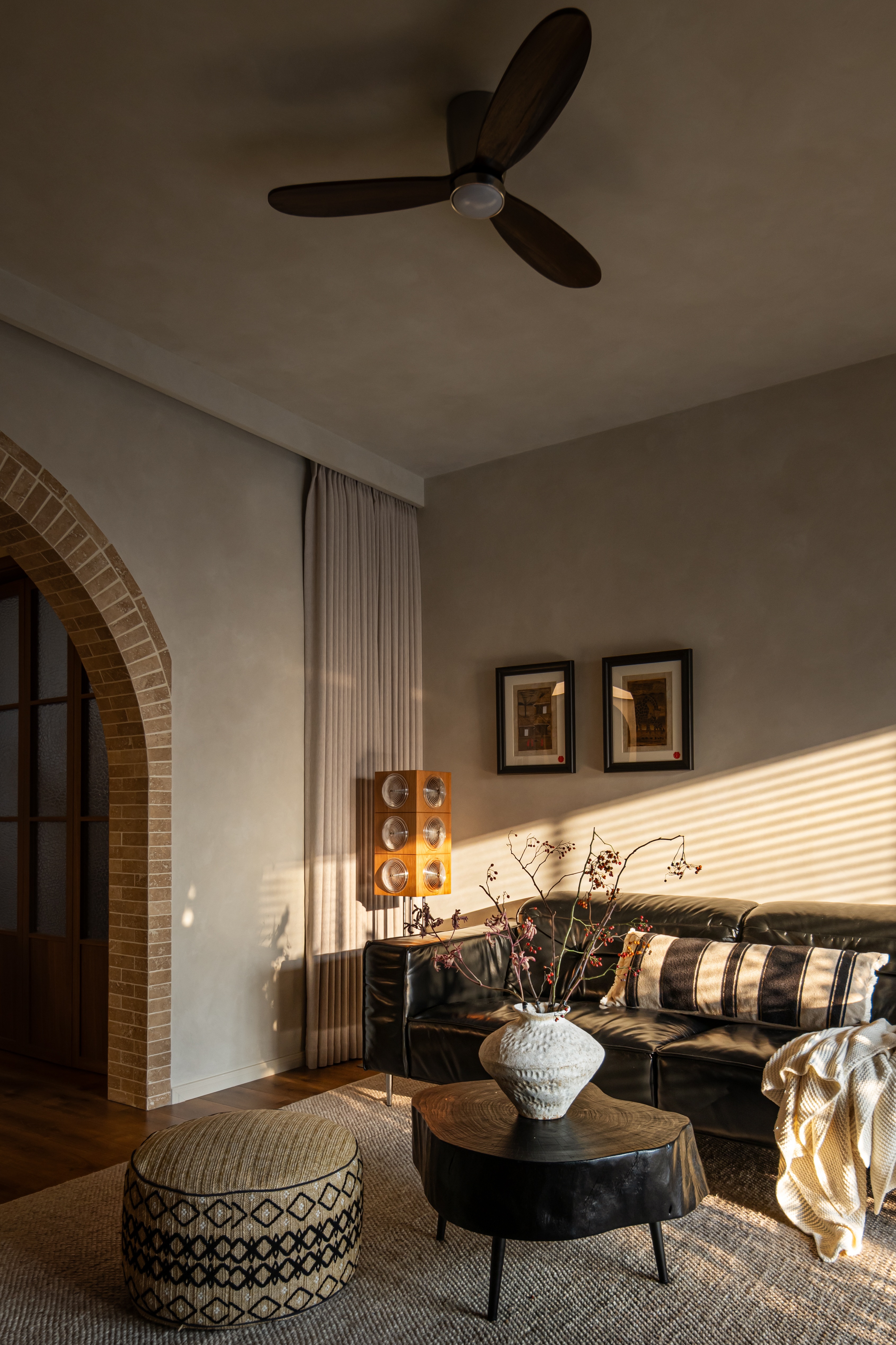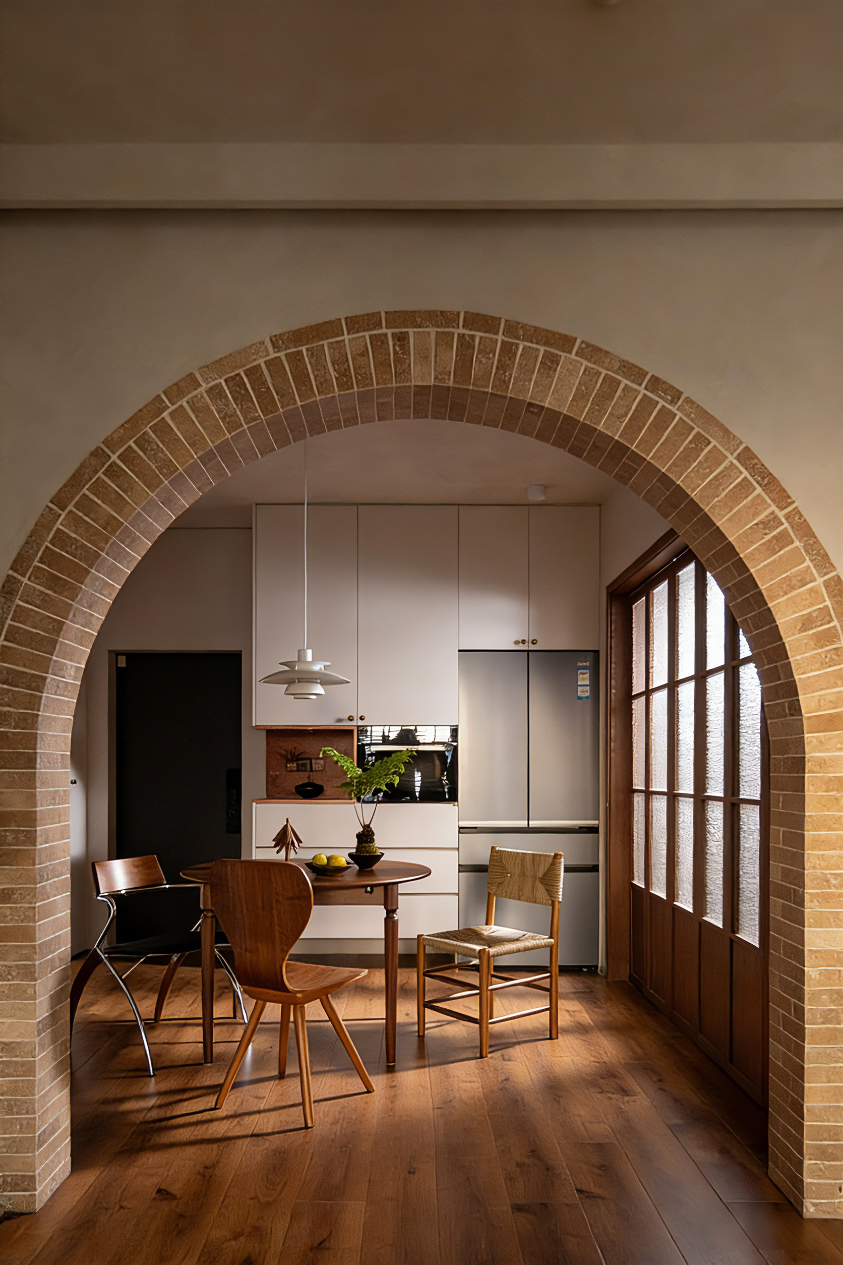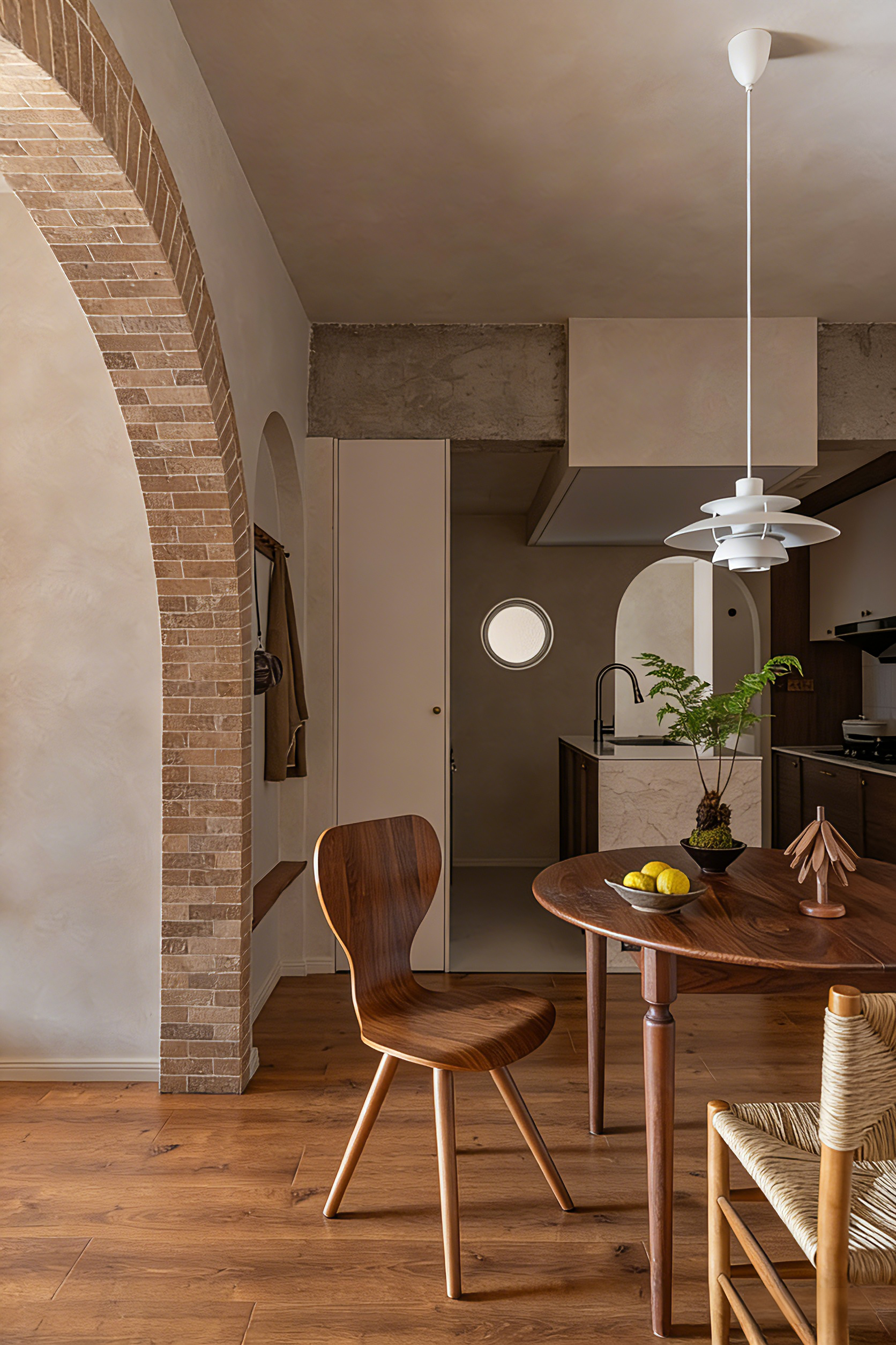 走过玄关,便进入了客厅区域,一道砖砌圆形垭口巧妙分隔区域,柔和曲线打破了直线的单调,也为空间增添了仪式感。
