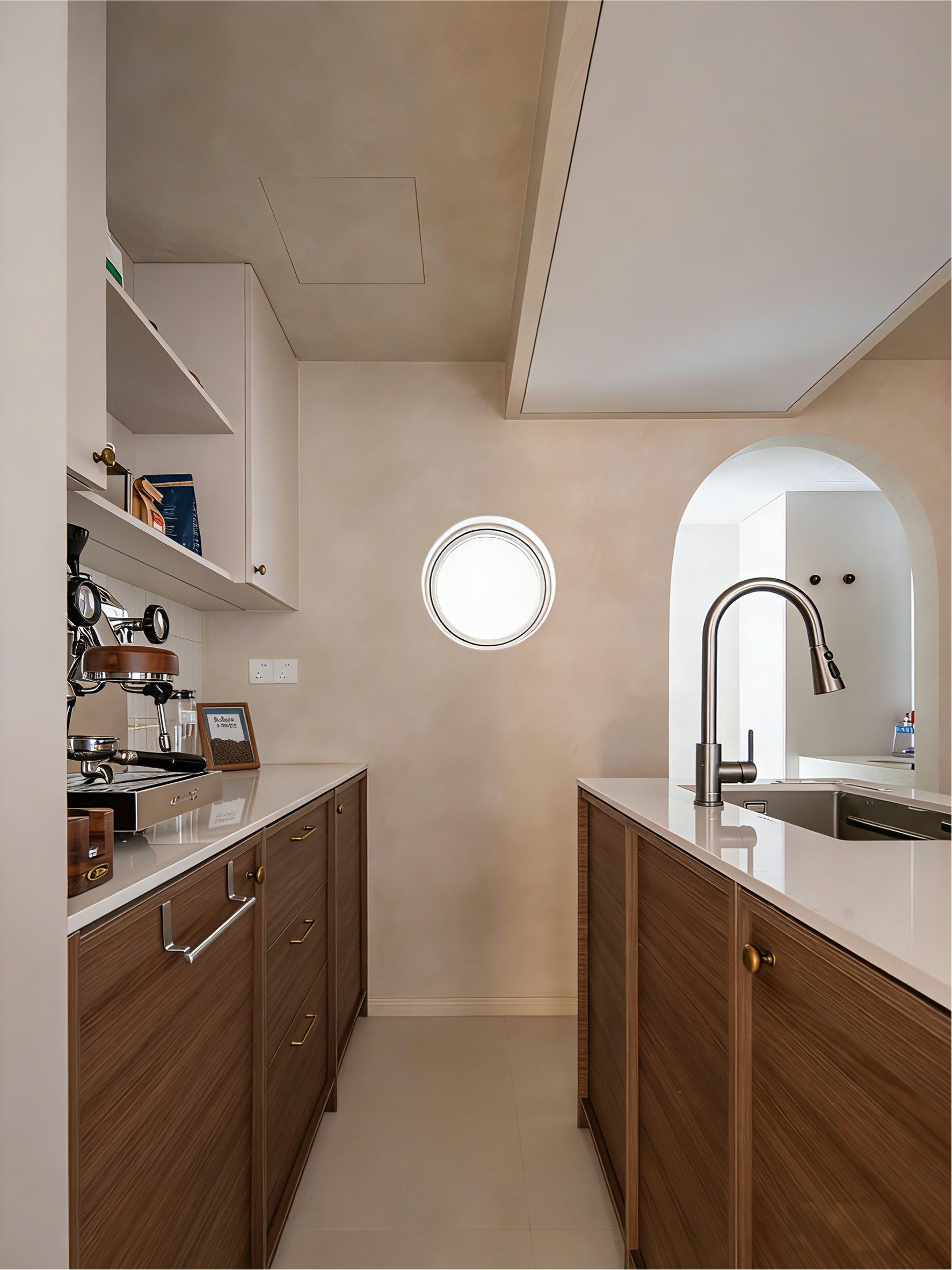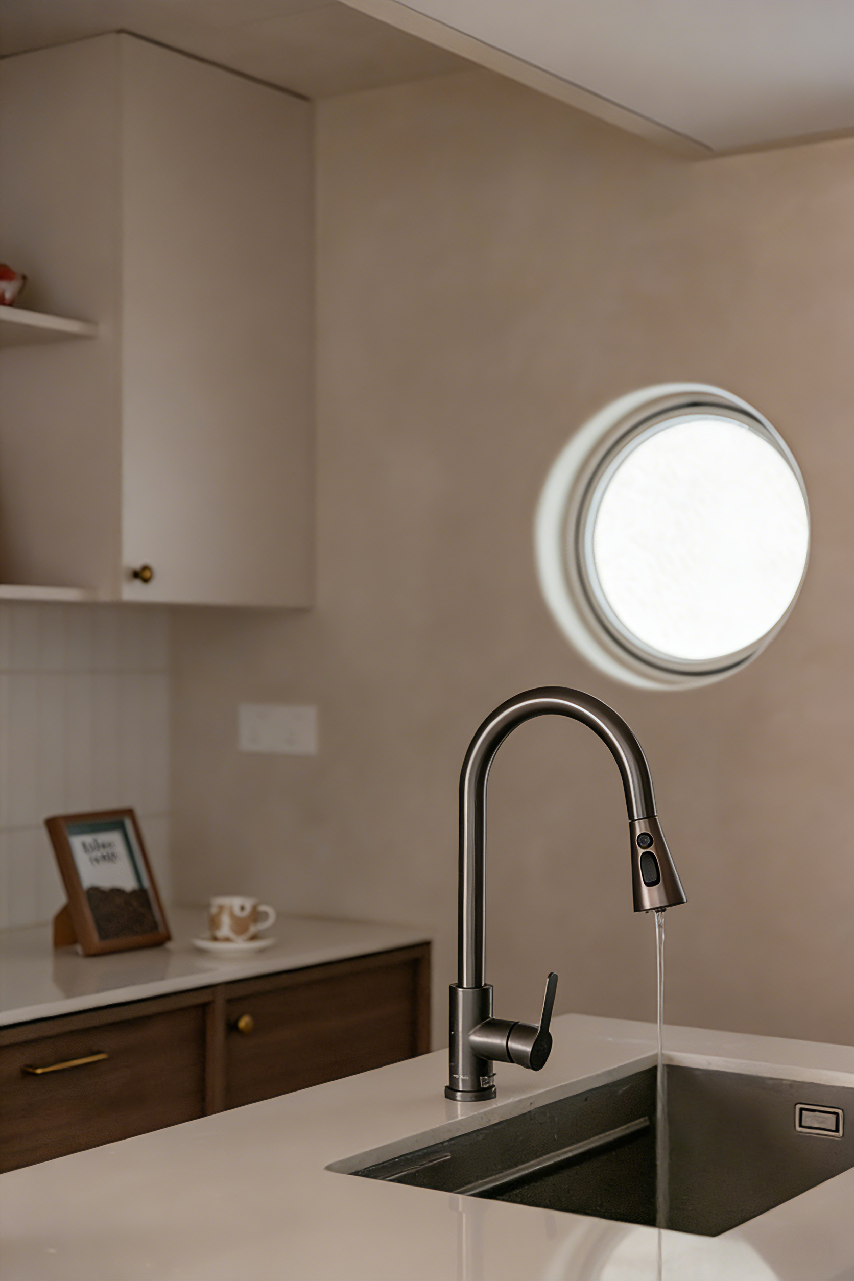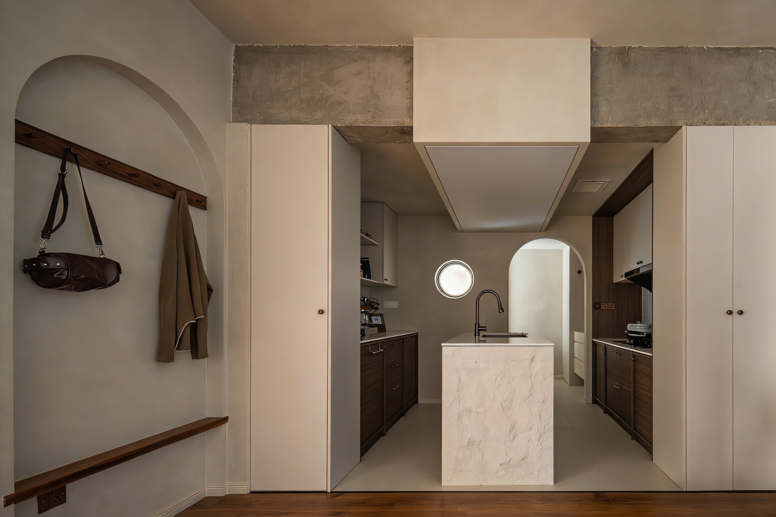 湿区与厨房之间的墙体上,开了一个小巧的圆窗,打破了墙面的沉闷,也引入了更多自然光线。这一设计不仅实用,更增添了空间的趣味性与通透感。