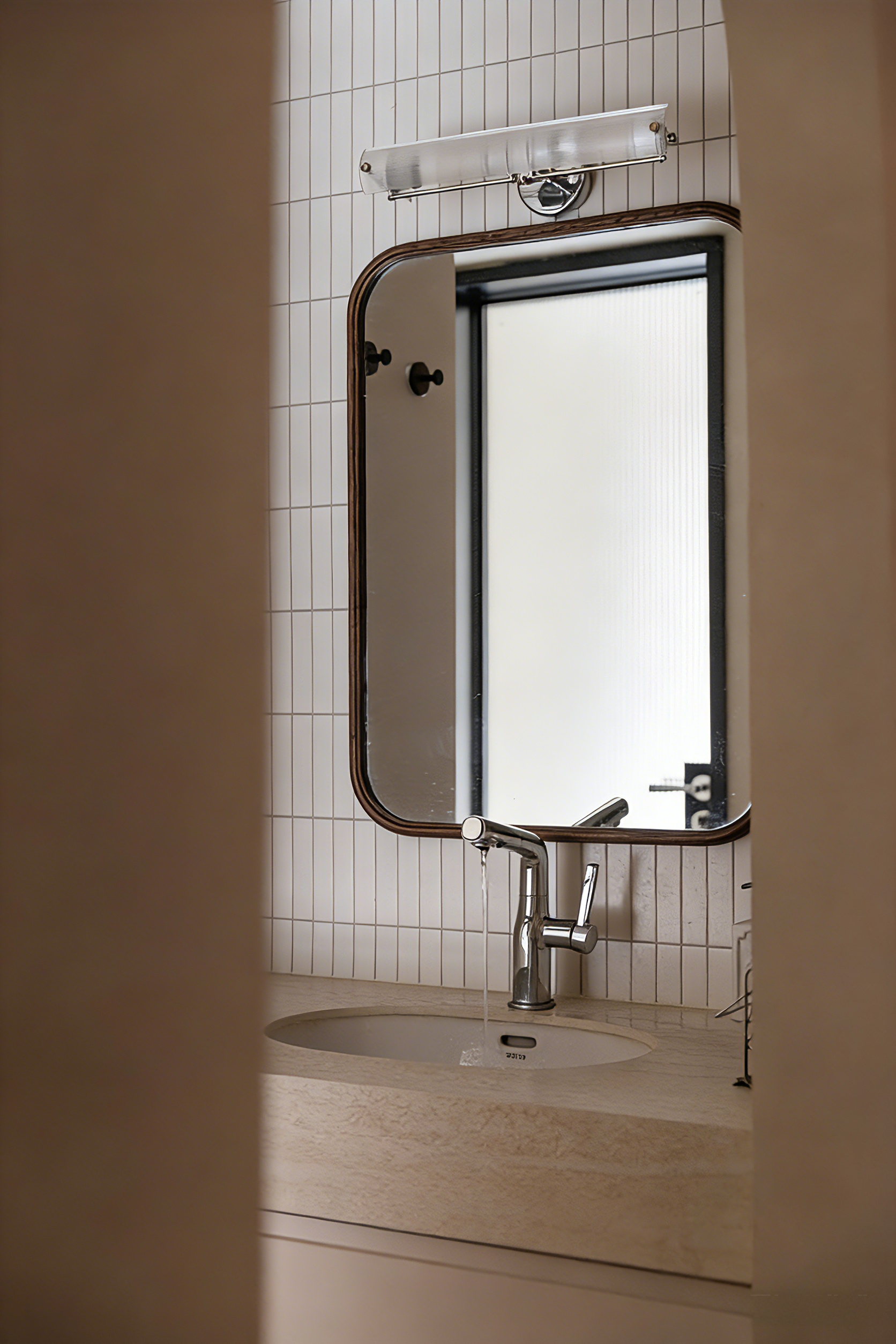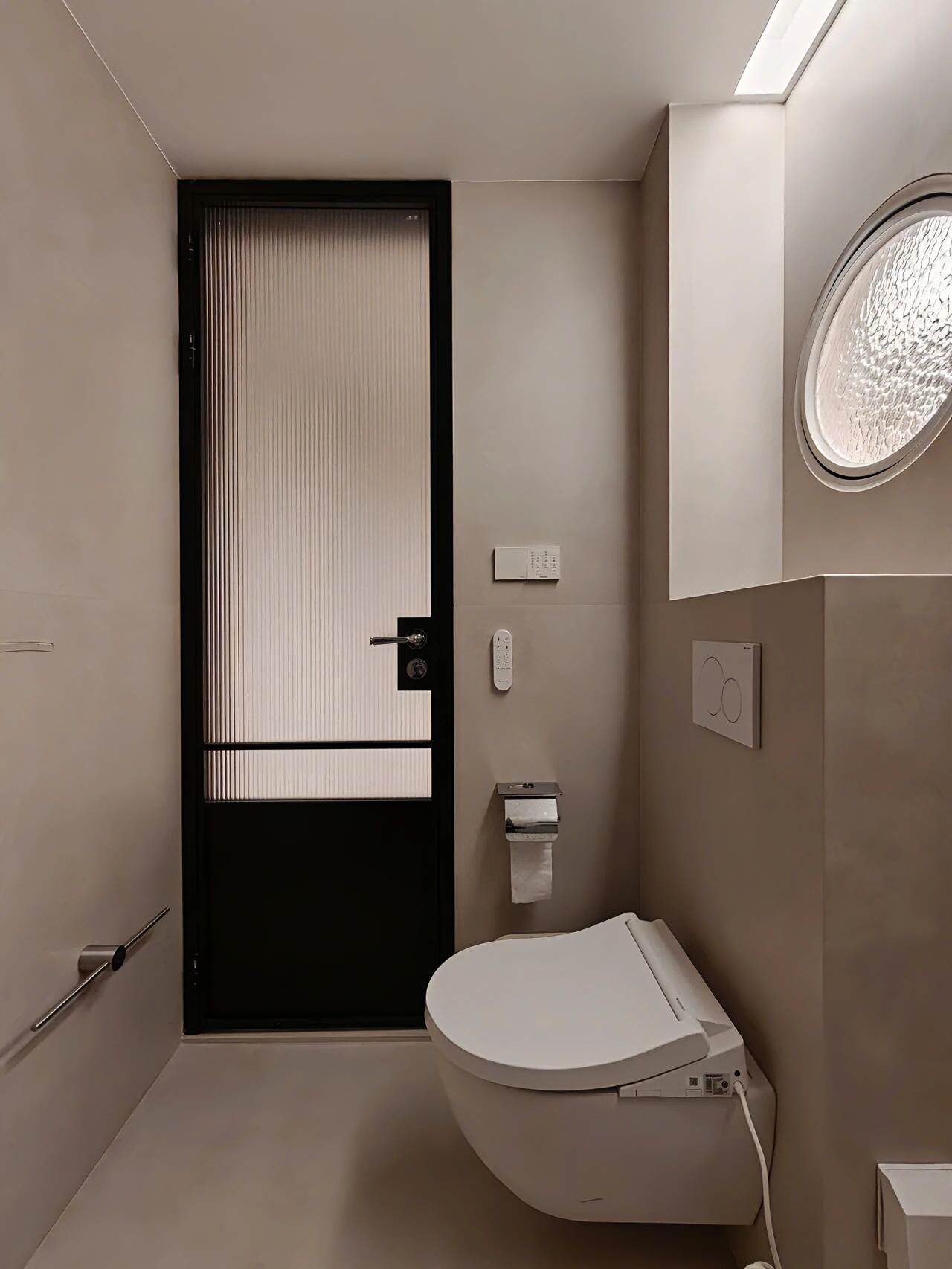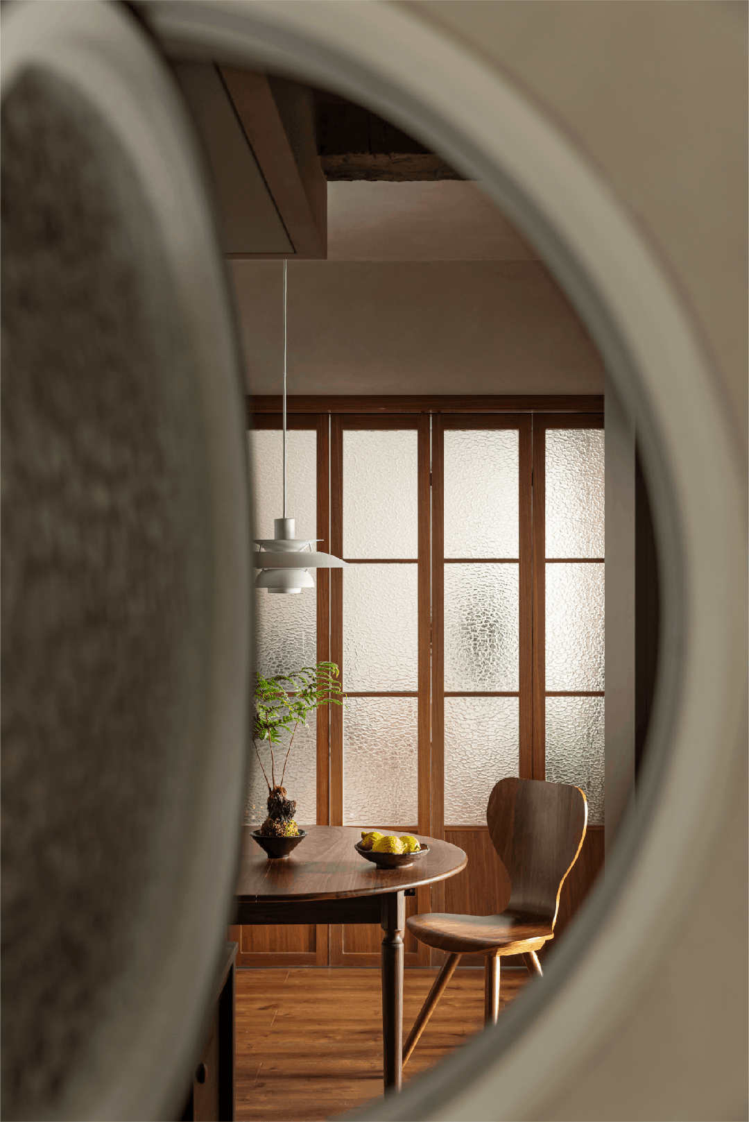 湿区与厨房之间的墙体上,开了一个小巧的圆窗,打破了墙面的沉闷,也引入了更多自然光线。这一设计不仅实用,更增添了空间的趣味性与通透感。
