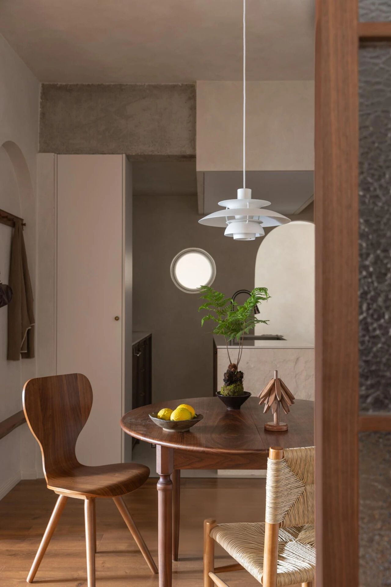 一张圆形餐桌周围环绕着几把形态各异的中古餐椅,以柔和的线条引导着流畅的生活动线。