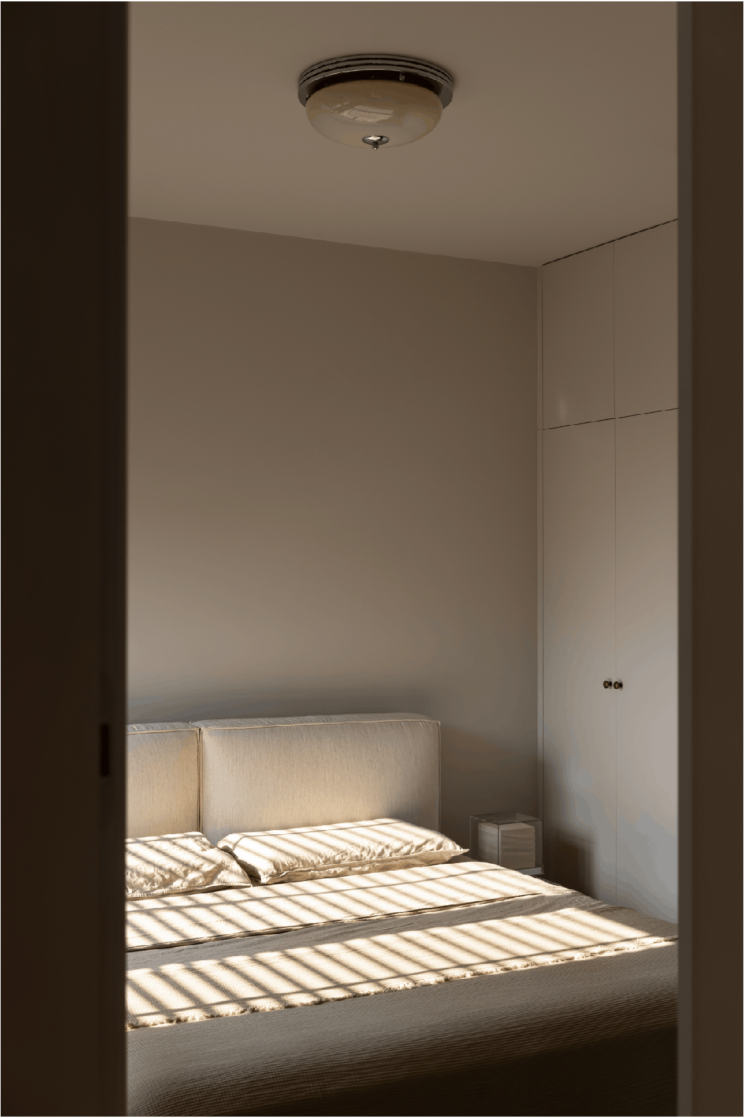 白色调床品与衣柜营造出宁静氛围。床头一盏氛围台灯与天花板上的吊灯相呼应,在夜晚提供恰到好处的照明。