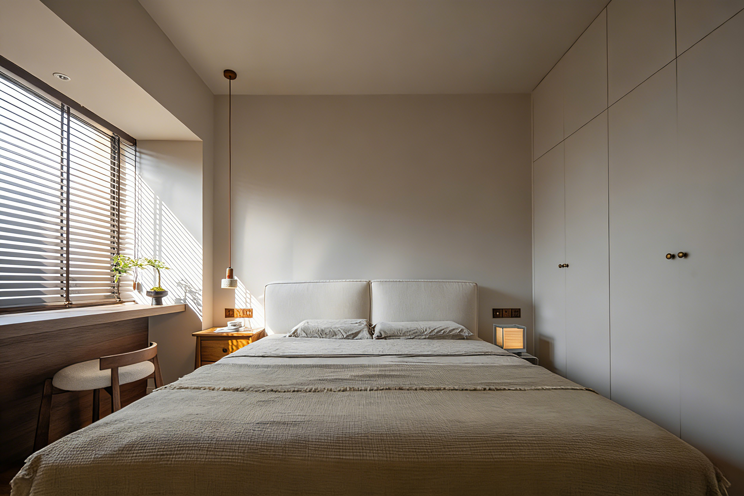 拆除了原始飘窗,取而代之的是一张简洁的梳妆台。阳光透过木百叶窗洒入,在白色床品和衣柜上投下温柔光影。